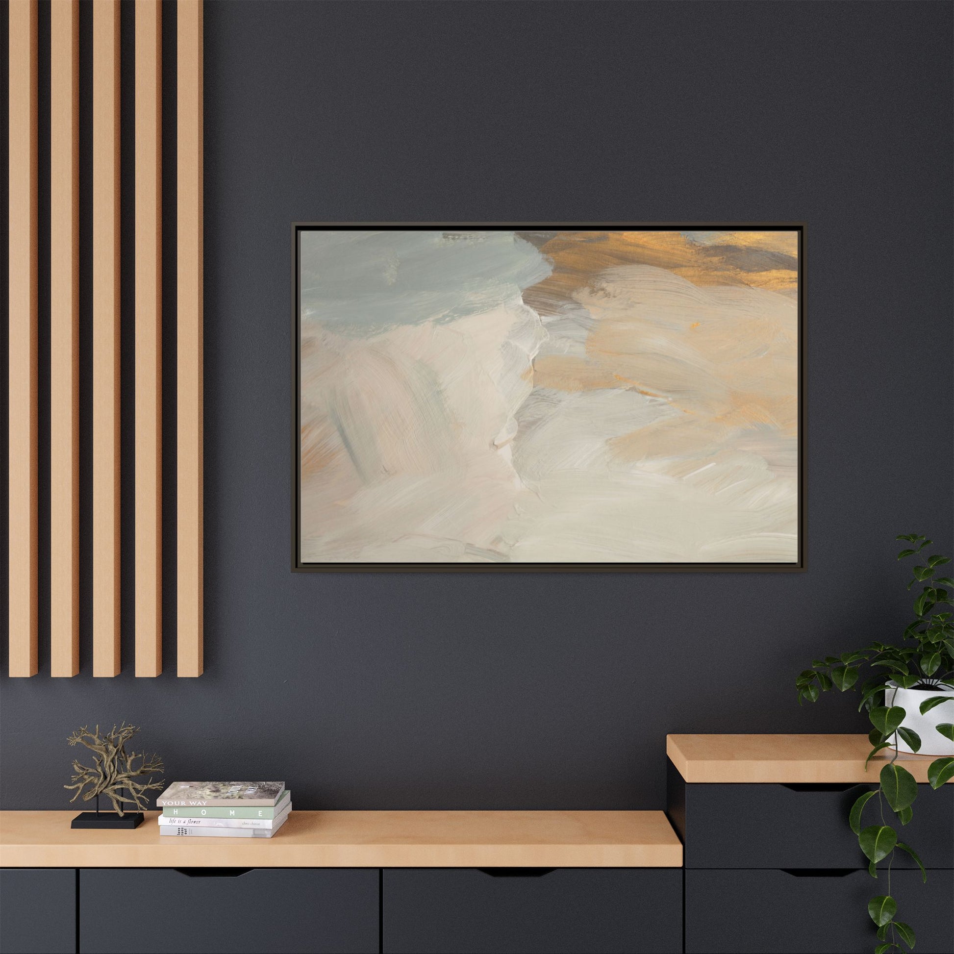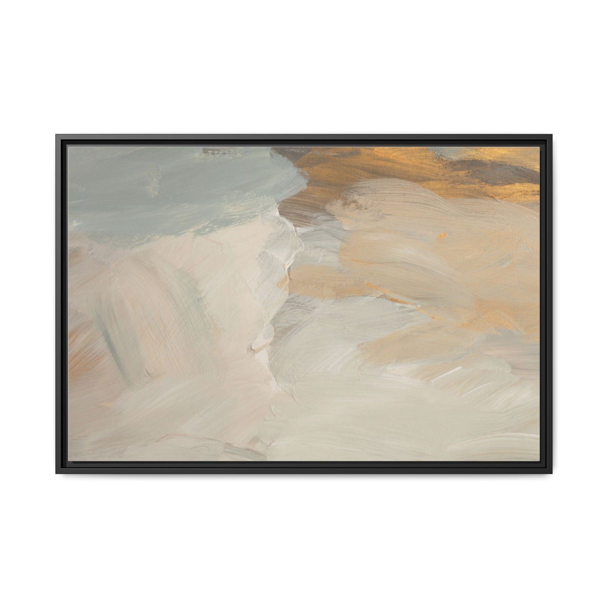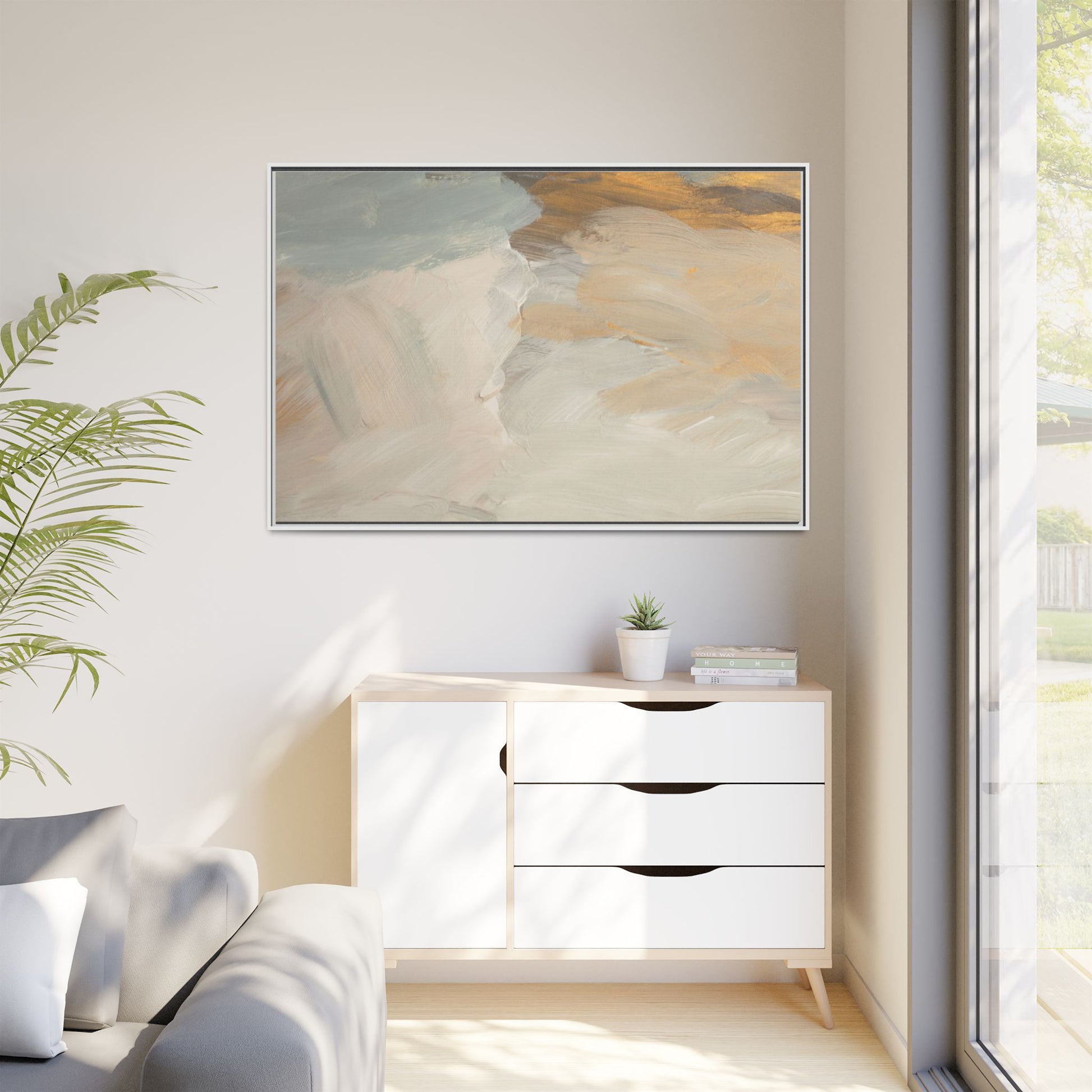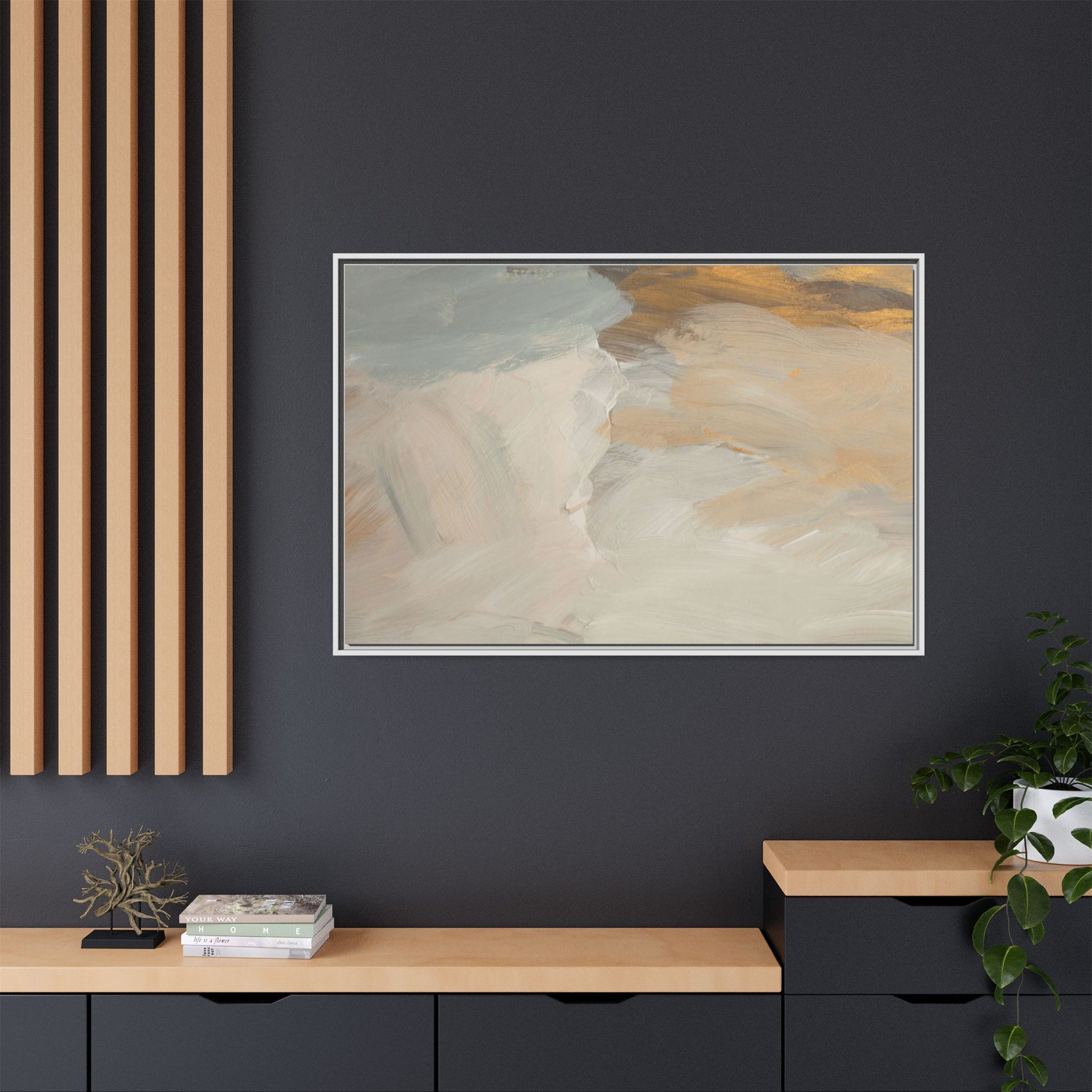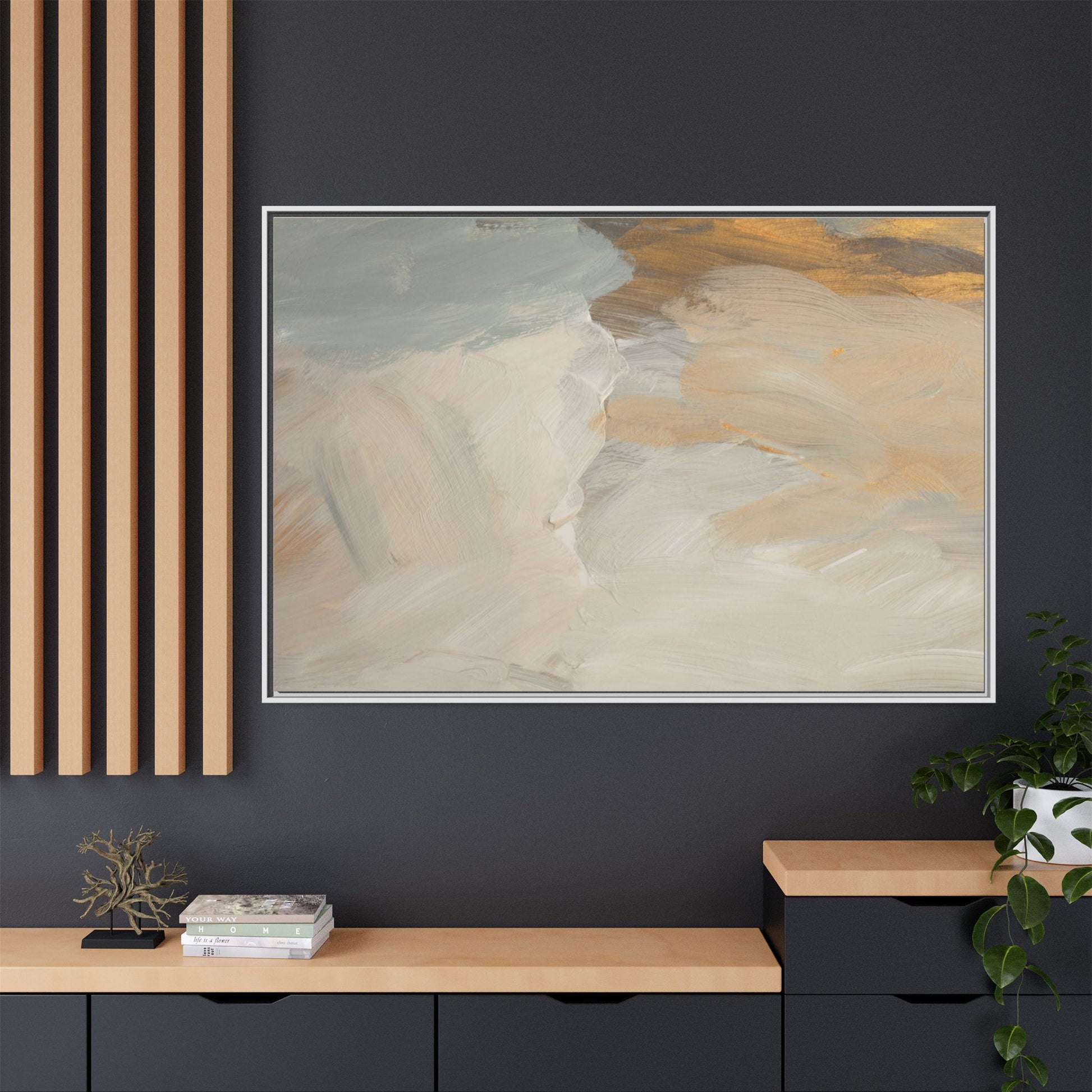 This abstract painting captures a serene landscape with soft, sweeping brushstrokes in muted tones of white, beige, pale blue, and golden ochre. The composition evokes a sense of natural terrain, with layered textures suggesting rolling hills, rocky formations, or coastal landscapes viewed from an aerial perspective. Delicate blending techniques create a sense of depth and movement, with gentle curves and undulating lines that guide the viewer's eye across the canvas. The color palette is subdued and harmonious, featuring gentle transitions between light and warm hues that create a tranquil, ethereal atmosphere. The painting's style appears to be a contemporary interpretation of landscape, blending impressionistic techniques with a more minimalist, abstract approach.