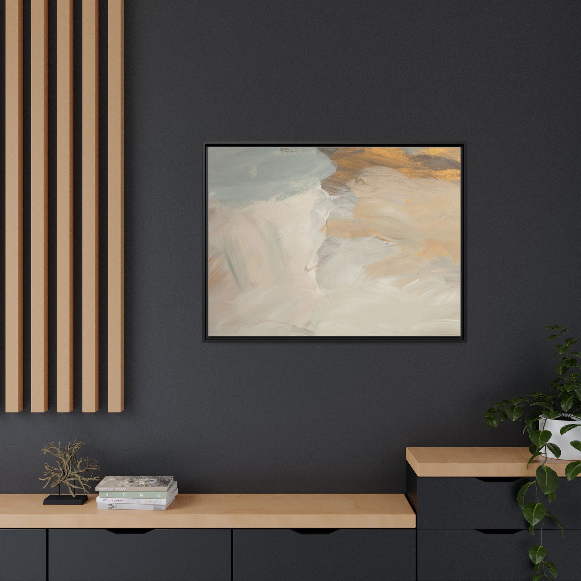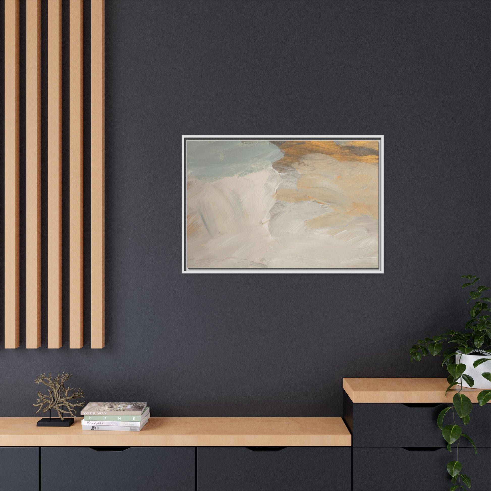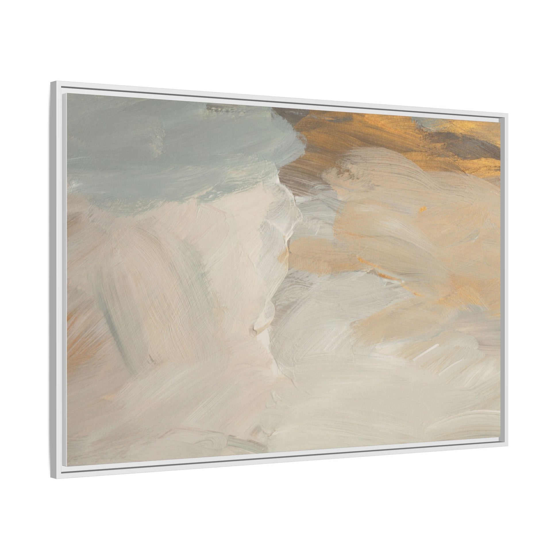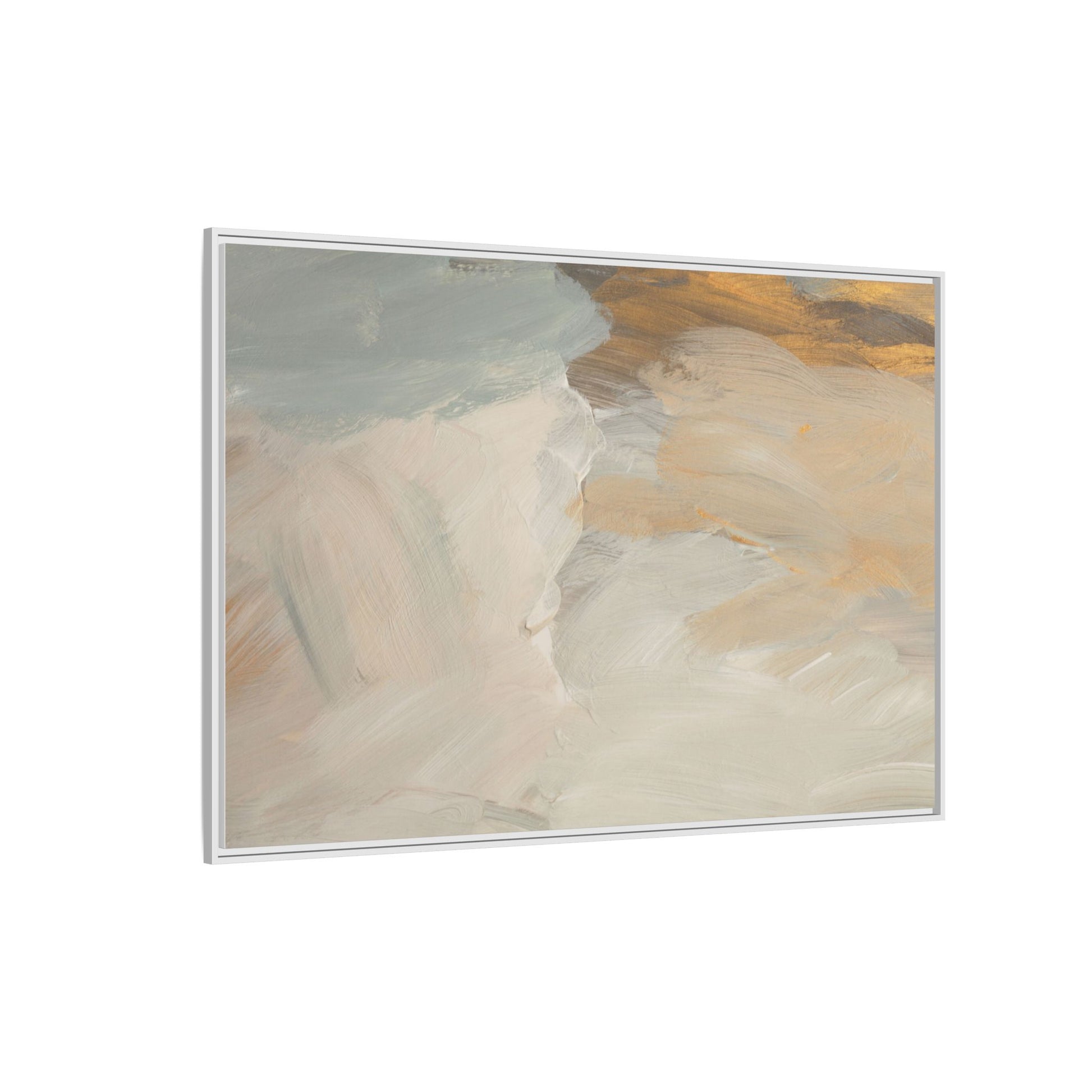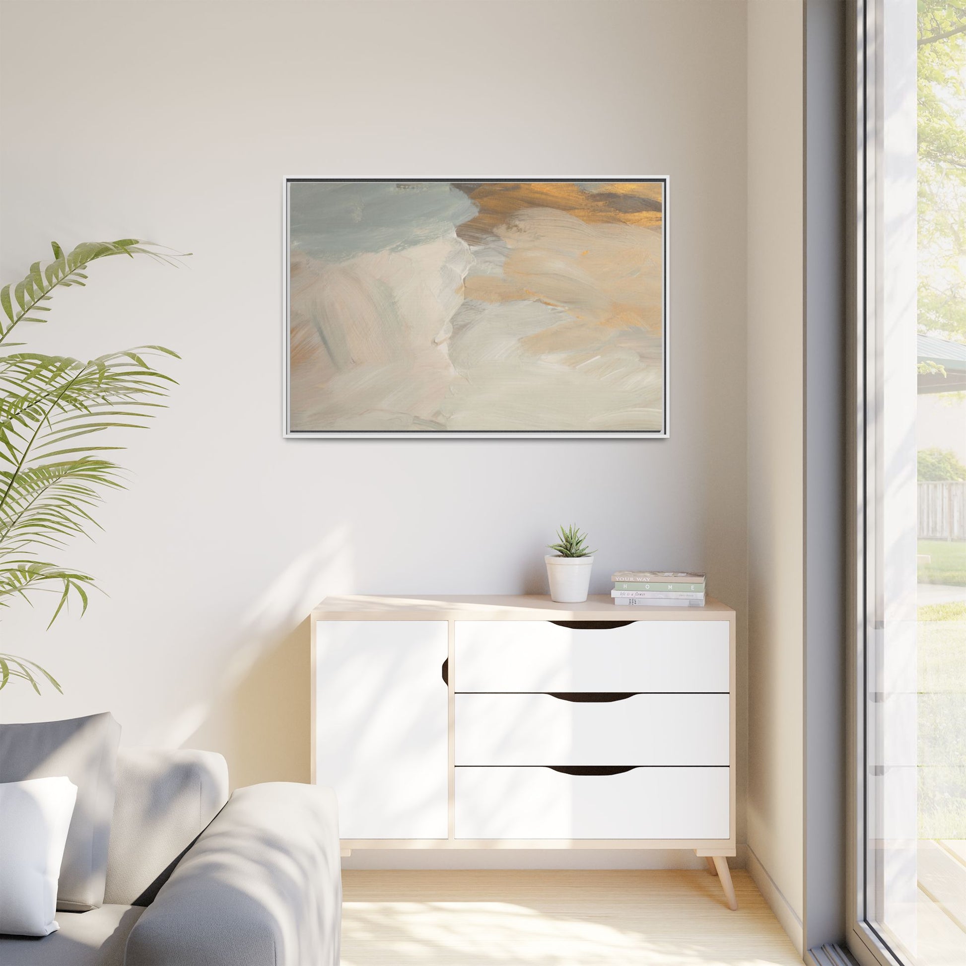 This abstract painting captures a serene landscape with soft, sweeping brushstrokes in muted tones of white, beige, pale blue, and golden ochre. The composition evokes a sense of natural terrain, with layered textures suggesting rolling hills, rocky formations, or coastal landscapes viewed from an aerial perspective. Delicate blending techniques create a sense of depth and movement, with gentle curves and undulating lines that guide the viewer's eye across the canvas. The color palette is subdued and harmonious, featuring gentle transitions between light and warm hues that create a tranquil, ethereal atmosphere. The painting's style appears to be a contemporary interpretation of landscape, blending impressionistic techniques with a more minimalist, abstract approach.