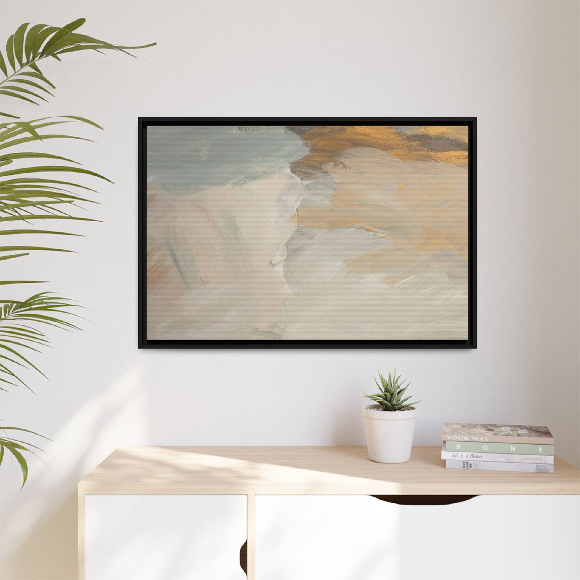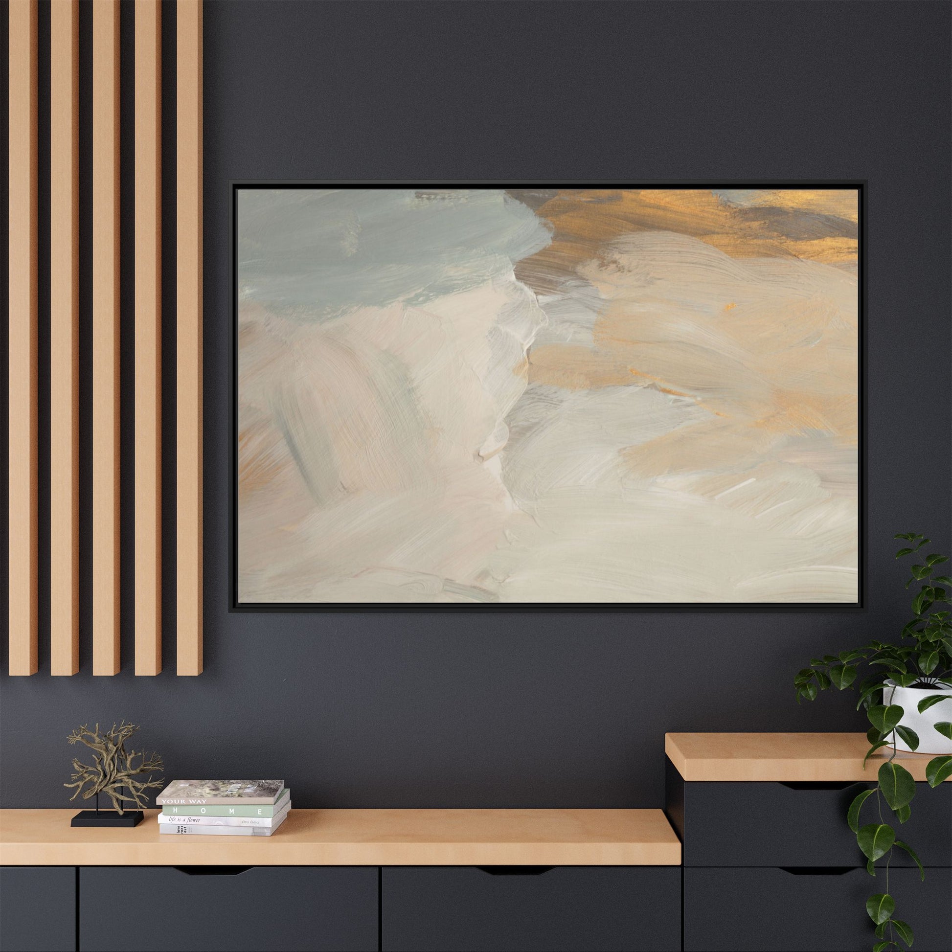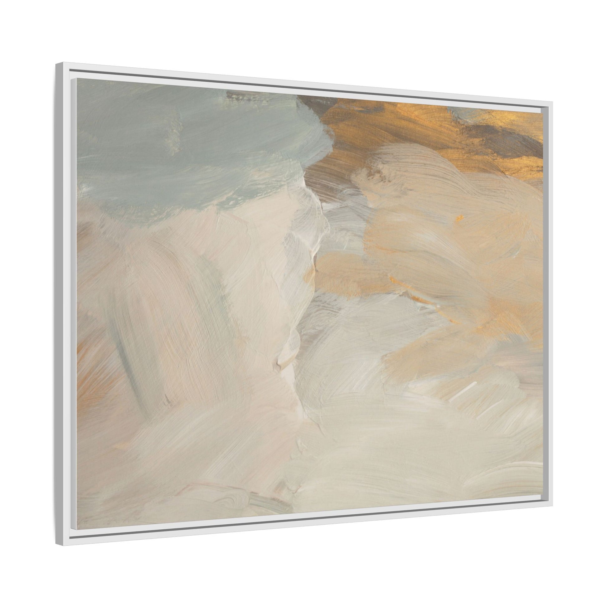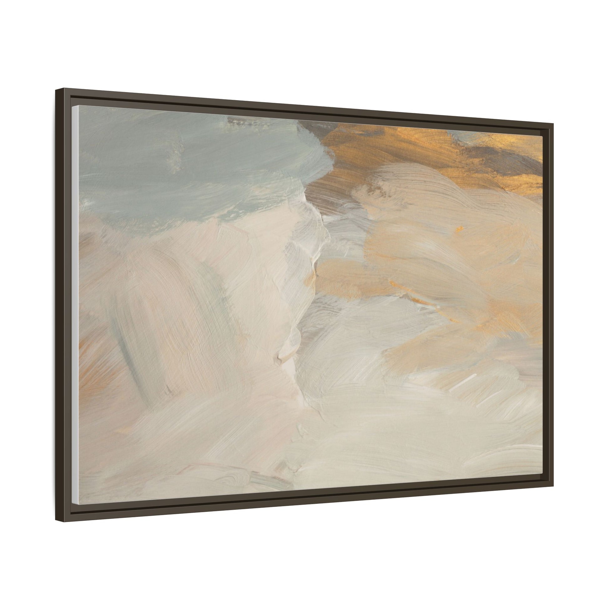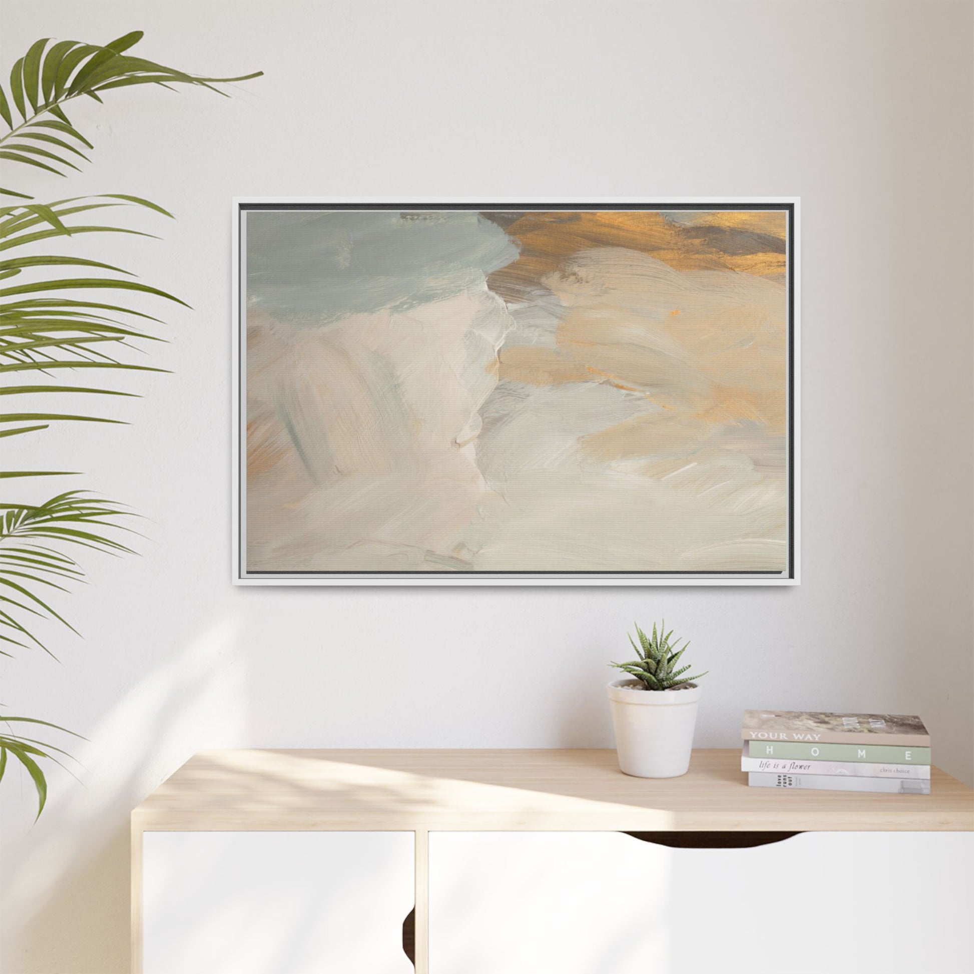 This abstract painting captures a serene landscape with soft, sweeping brushstrokes in muted tones of white, beige, pale blue, and golden ochre. The composition evokes a sense of natural terrain, with layered textures suggesting rolling hills, rocky formations, or coastal landscapes viewed from an aerial perspective. Delicate blending techniques create a sense of depth and movement, with gentle curves and undulating lines that guide the viewer's eye across the canvas. The color palette is subdued and harmonious, featuring gentle transitions between light and warm hues that create a tranquil, ethereal atmosphere. The painting's style appears to be a contemporary interpretation of landscape, blending impressionistic techniques with a more minimalist, abstract approach.