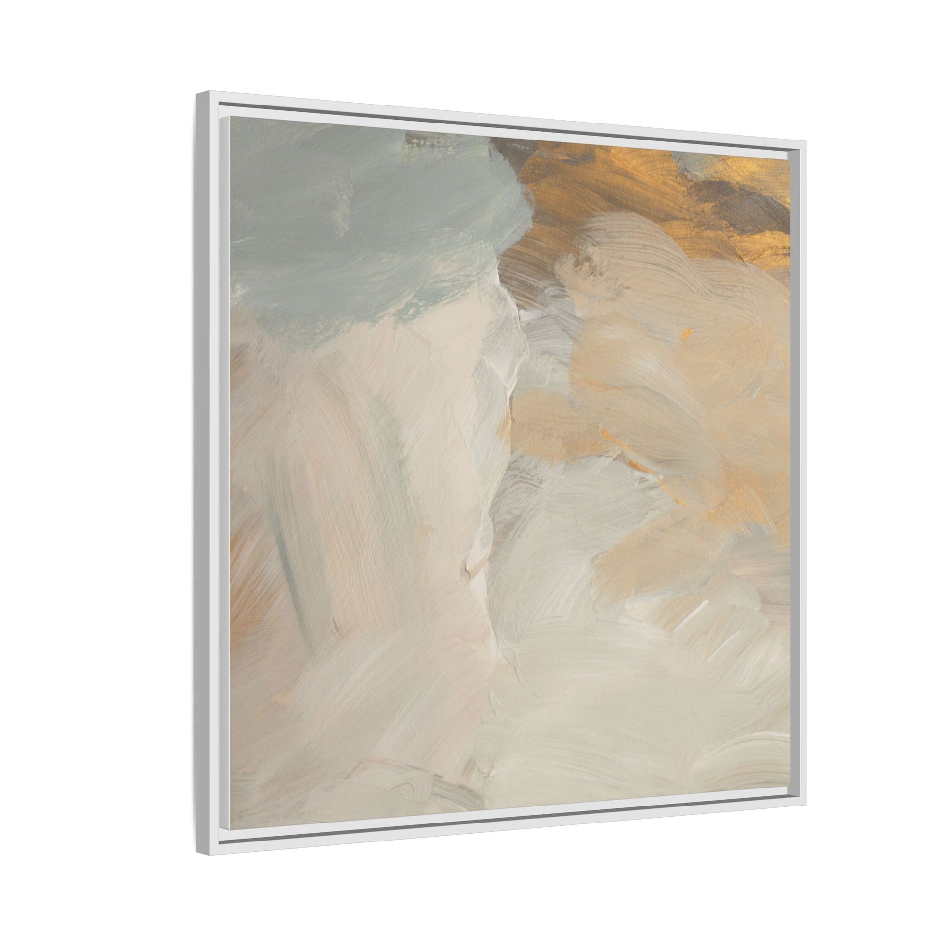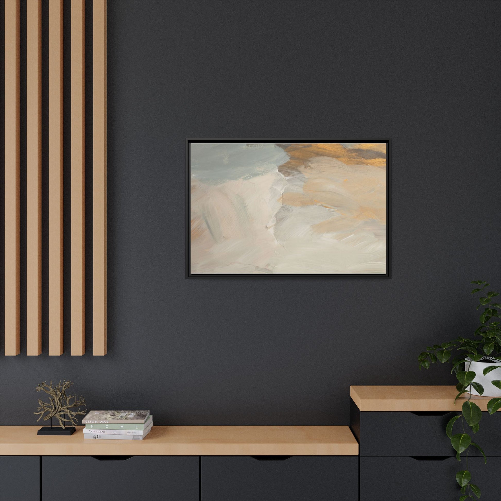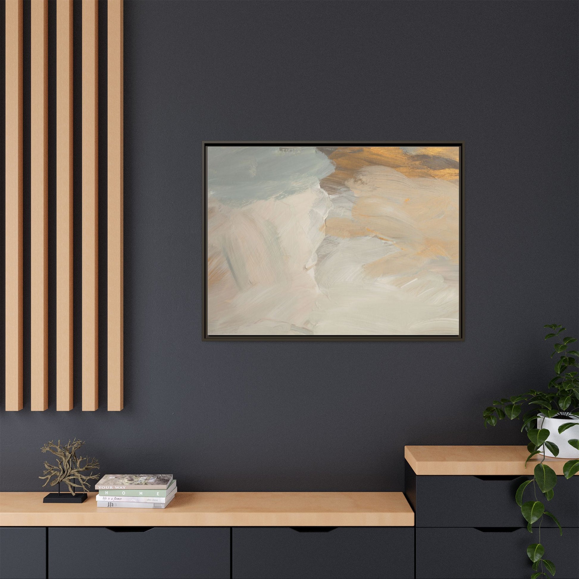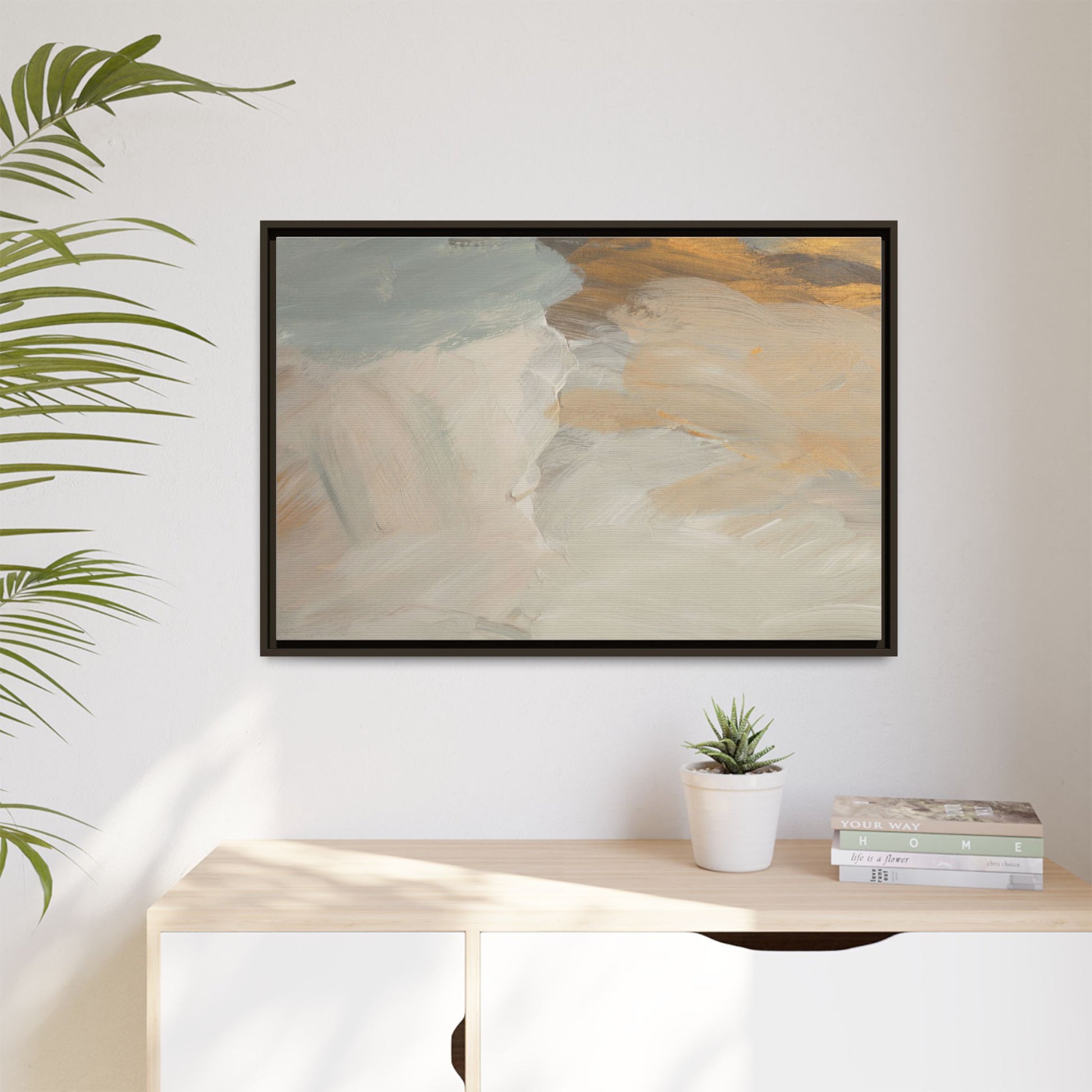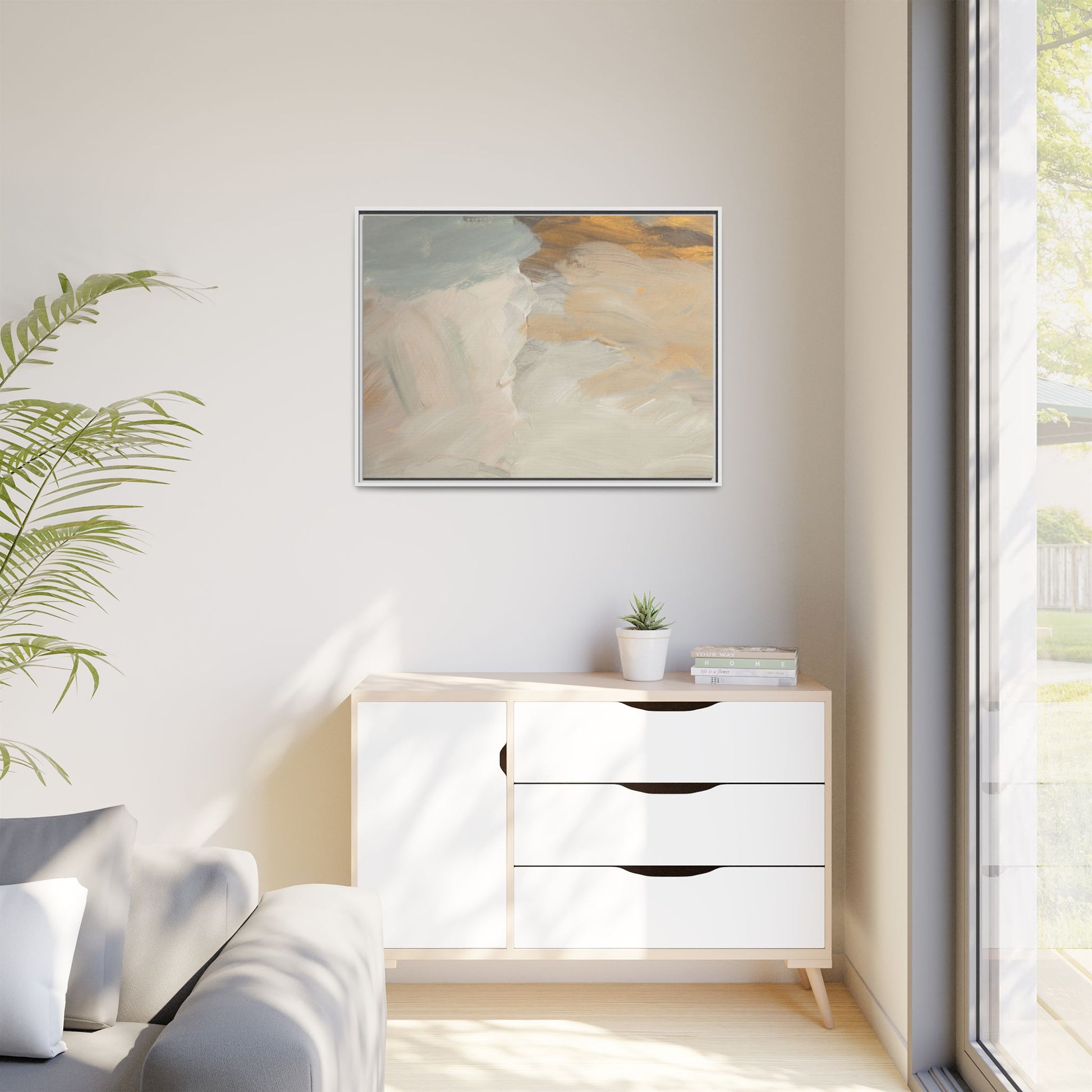 This abstract painting captures a serene landscape with soft, sweeping brushstrokes in muted tones of white, beige, pale blue, and golden ochre. The composition evokes a sense of natural terrain, with layered textures suggesting rolling hills, rocky formations, or coastal landscapes viewed from an aerial perspective. Delicate blending techniques create a sense of depth and movement, with gentle curves and undulating lines that guide the viewer's eye across the canvas. The color palette is subdued and harmonious, featuring gentle transitions between light and warm hues that create a tranquil, ethereal atmosphere. The painting's style appears to be a contemporary interpretation of landscape, blending impressionistic techniques with a more minimalist, abstract approach.