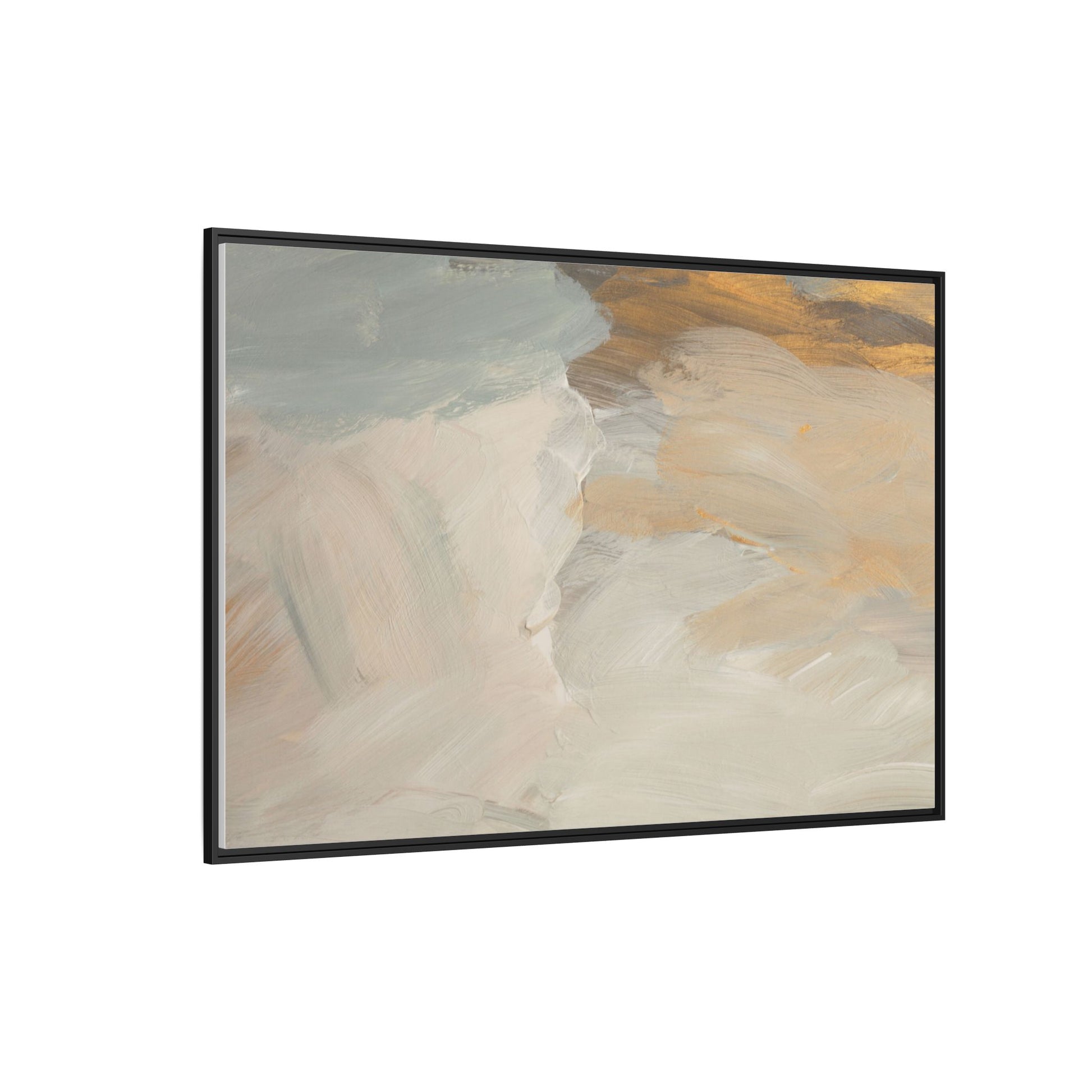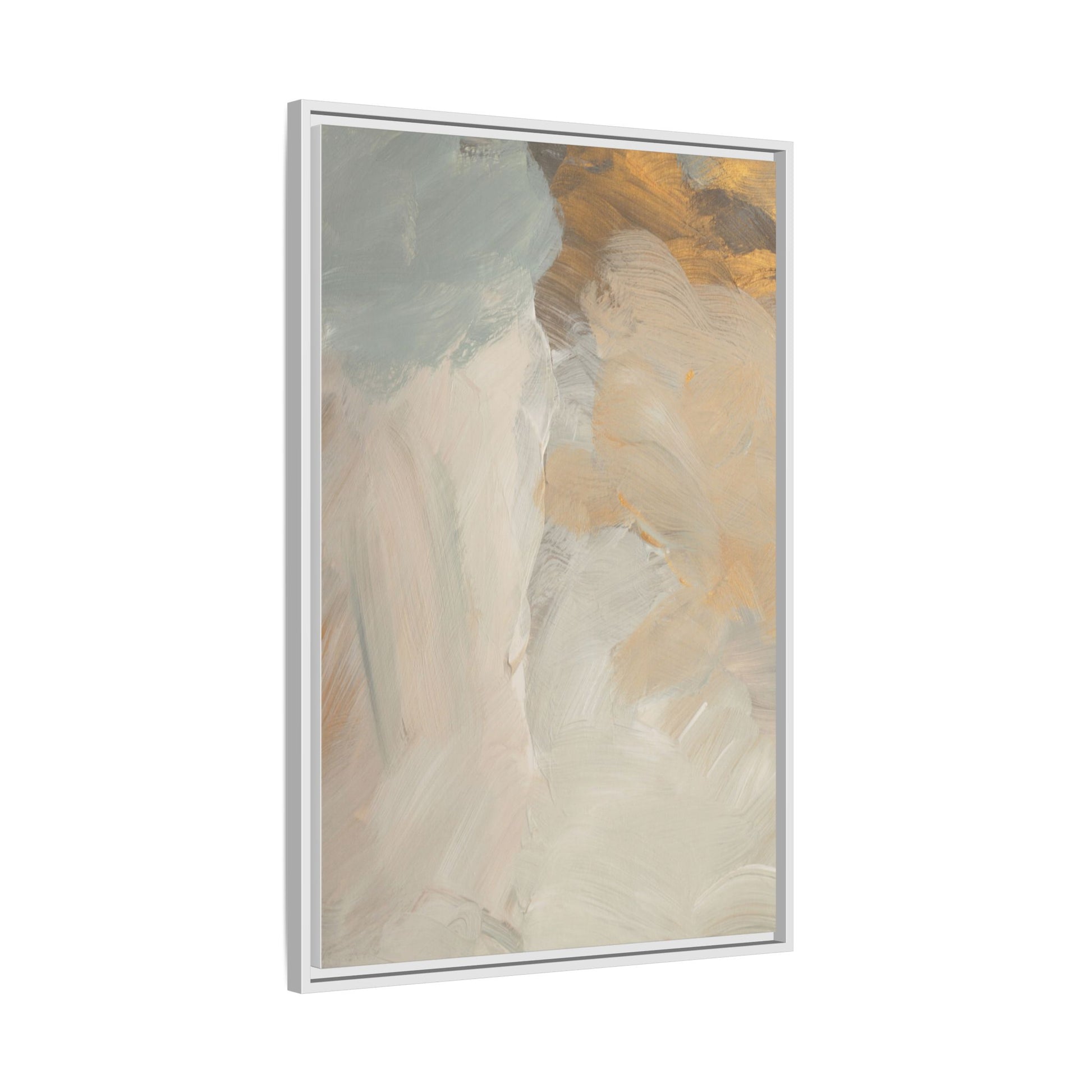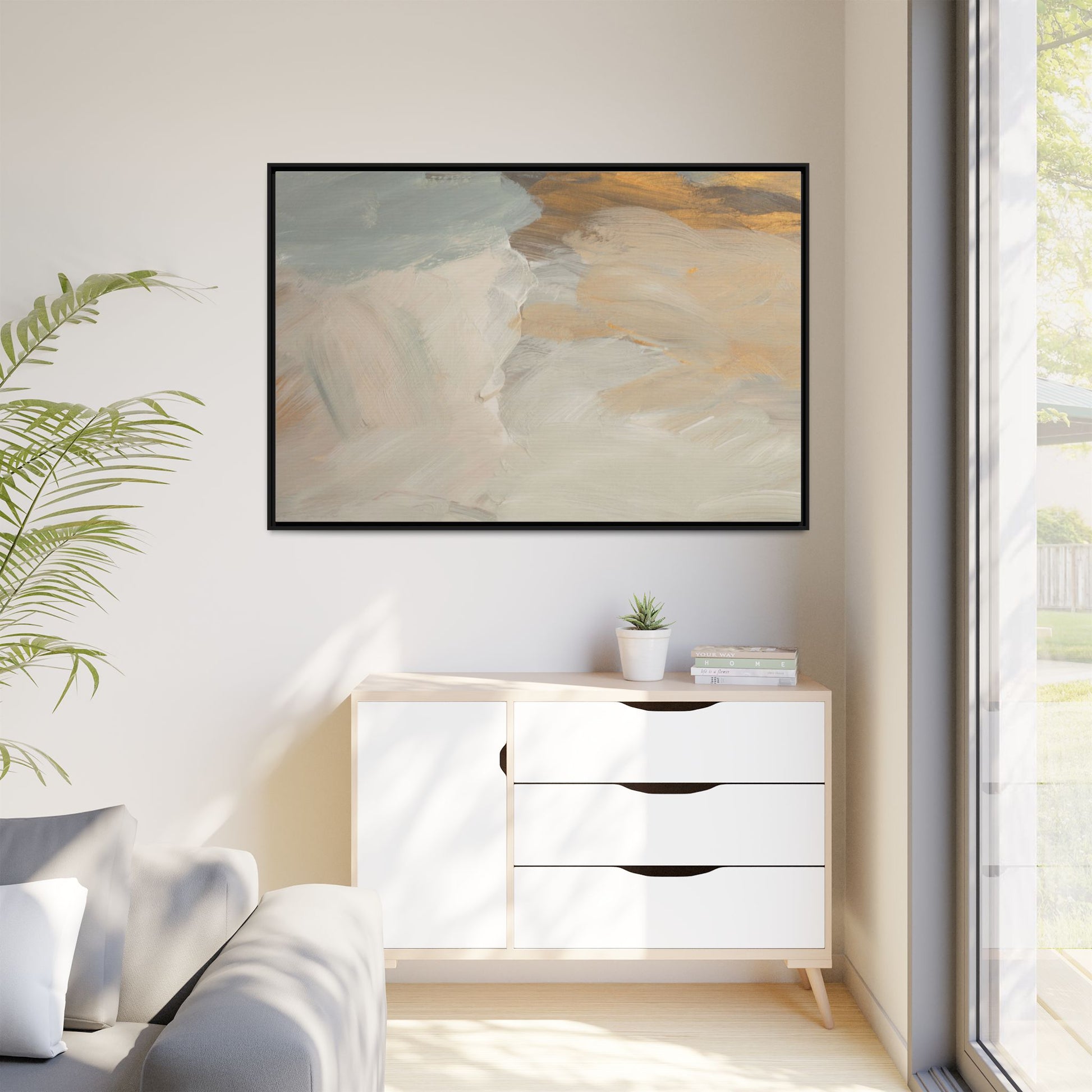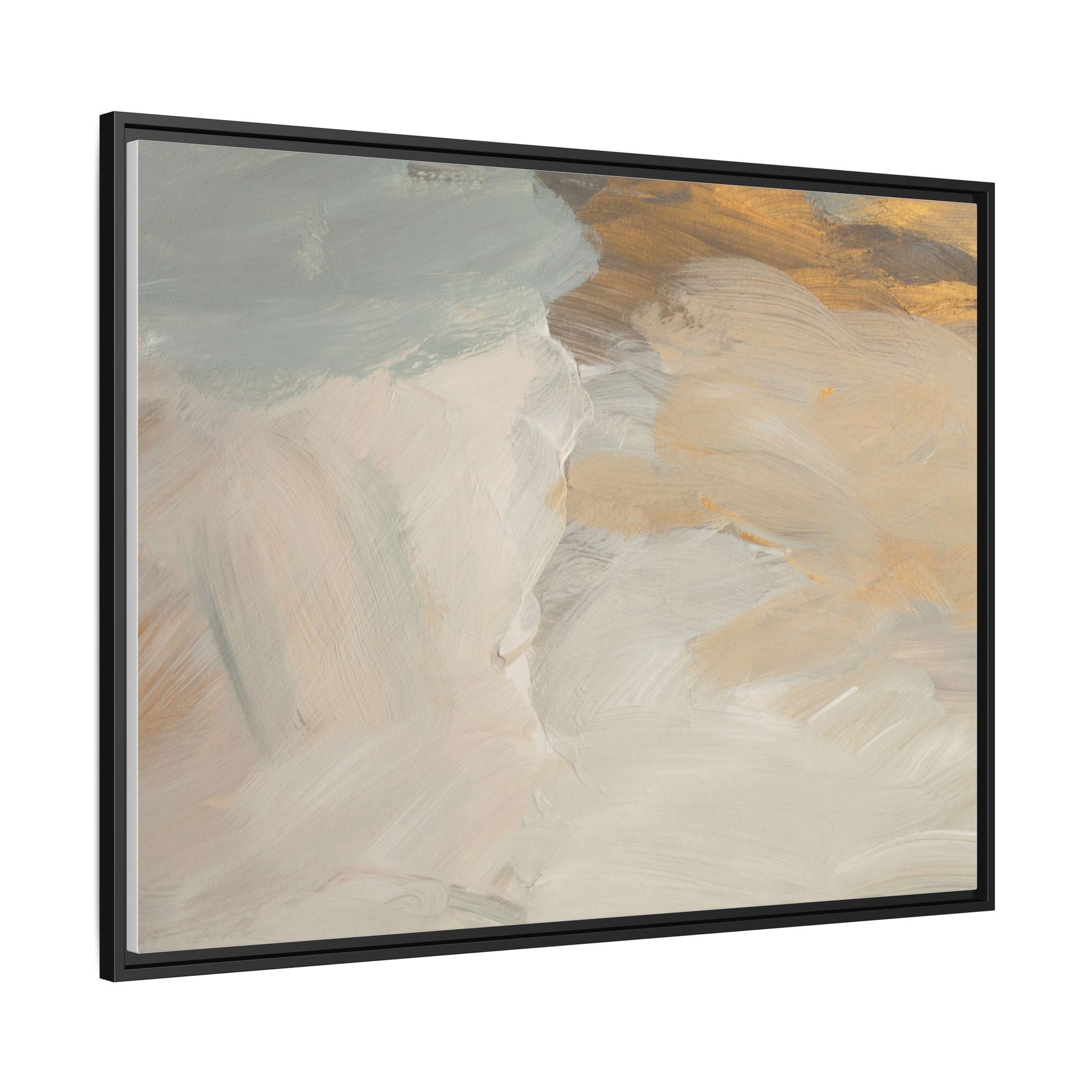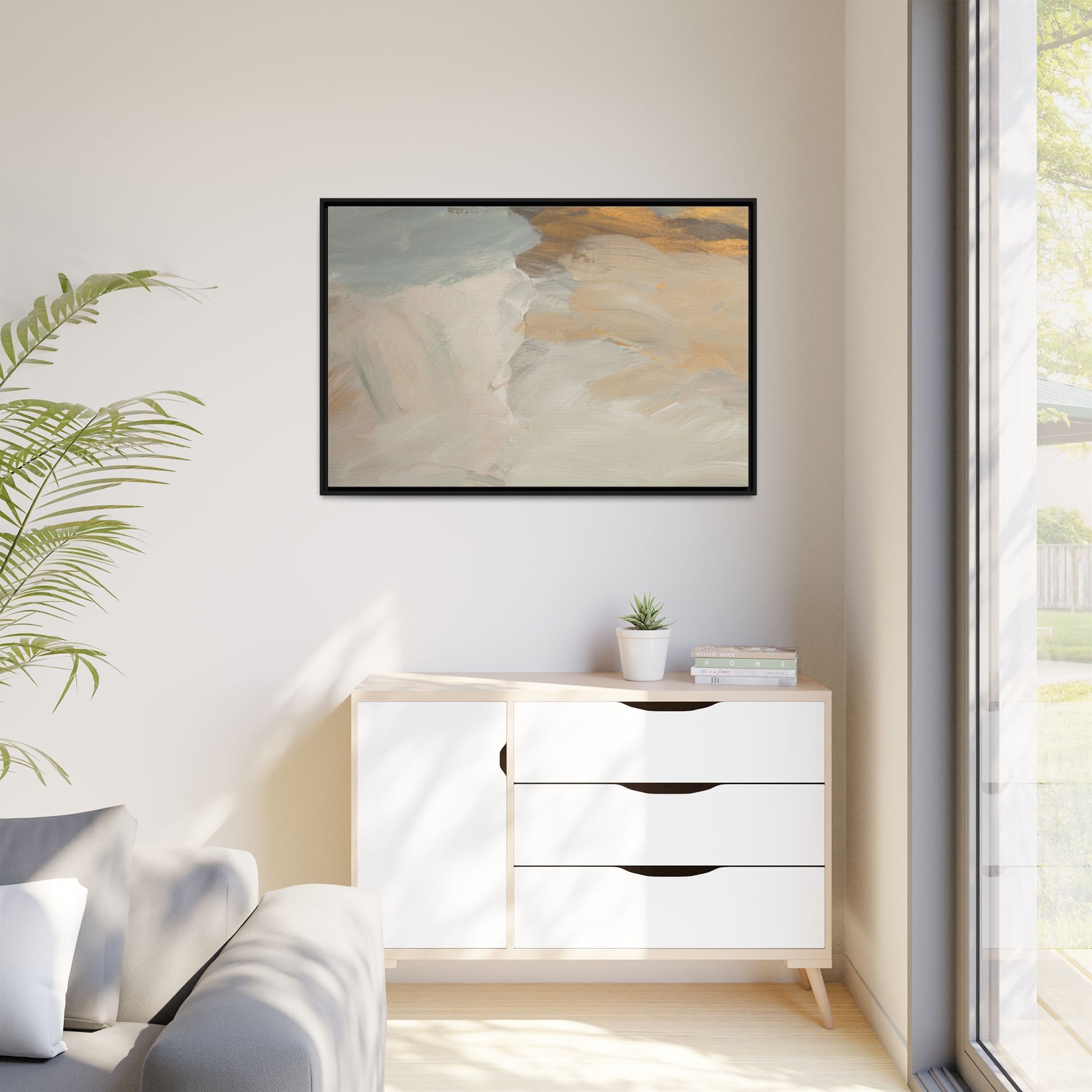 This abstract painting captures a serene landscape with soft, sweeping brushstrokes in muted tones of white, beige, pale blue, and golden ochre. The composition evokes a sense of natural terrain, with layered textures suggesting rolling hills, rocky formations, or coastal landscapes viewed from an aerial perspective. Delicate blending techniques create a sense of depth and movement, with gentle curves and undulating lines that guide the viewer's eye across the canvas. The color palette is subdued and harmonious, featuring gentle transitions between light and warm hues that create a tranquil, ethereal atmosphere. The painting's style appears to be a contemporary interpretation of landscape, blending impressionistic techniques with a more minimalist, abstract approach.