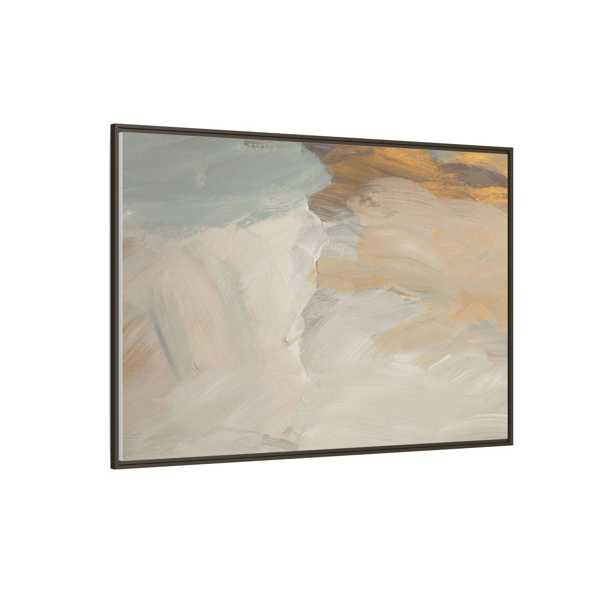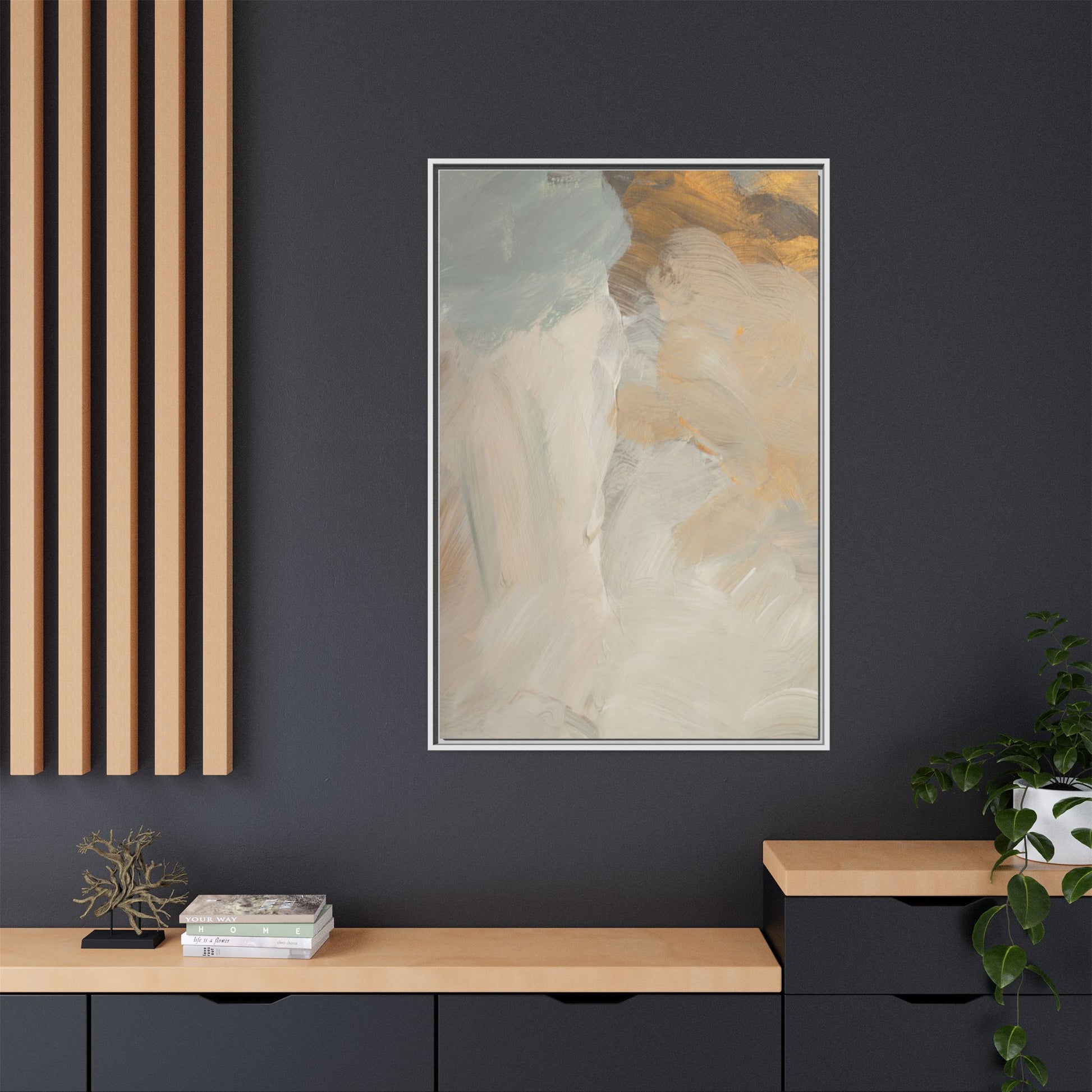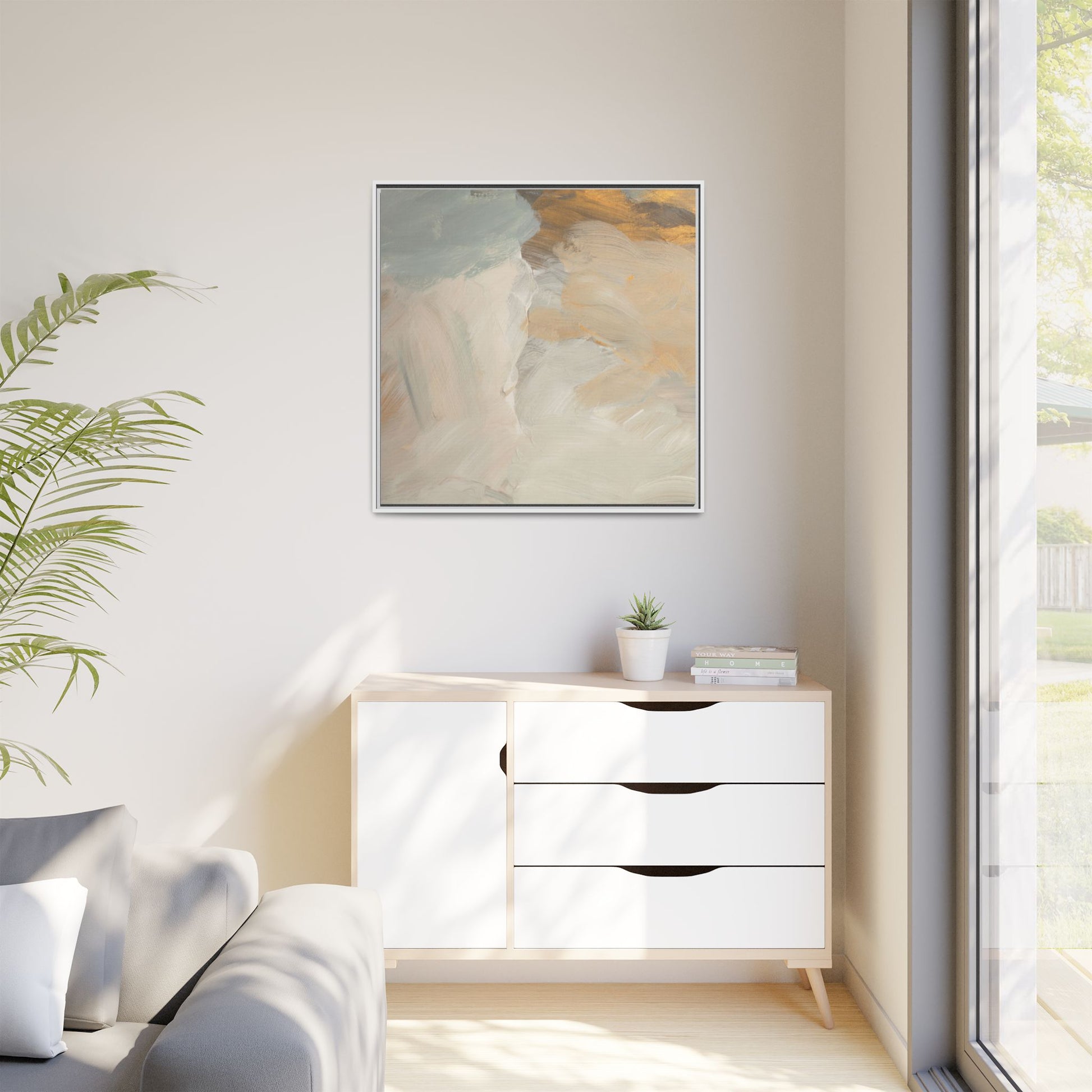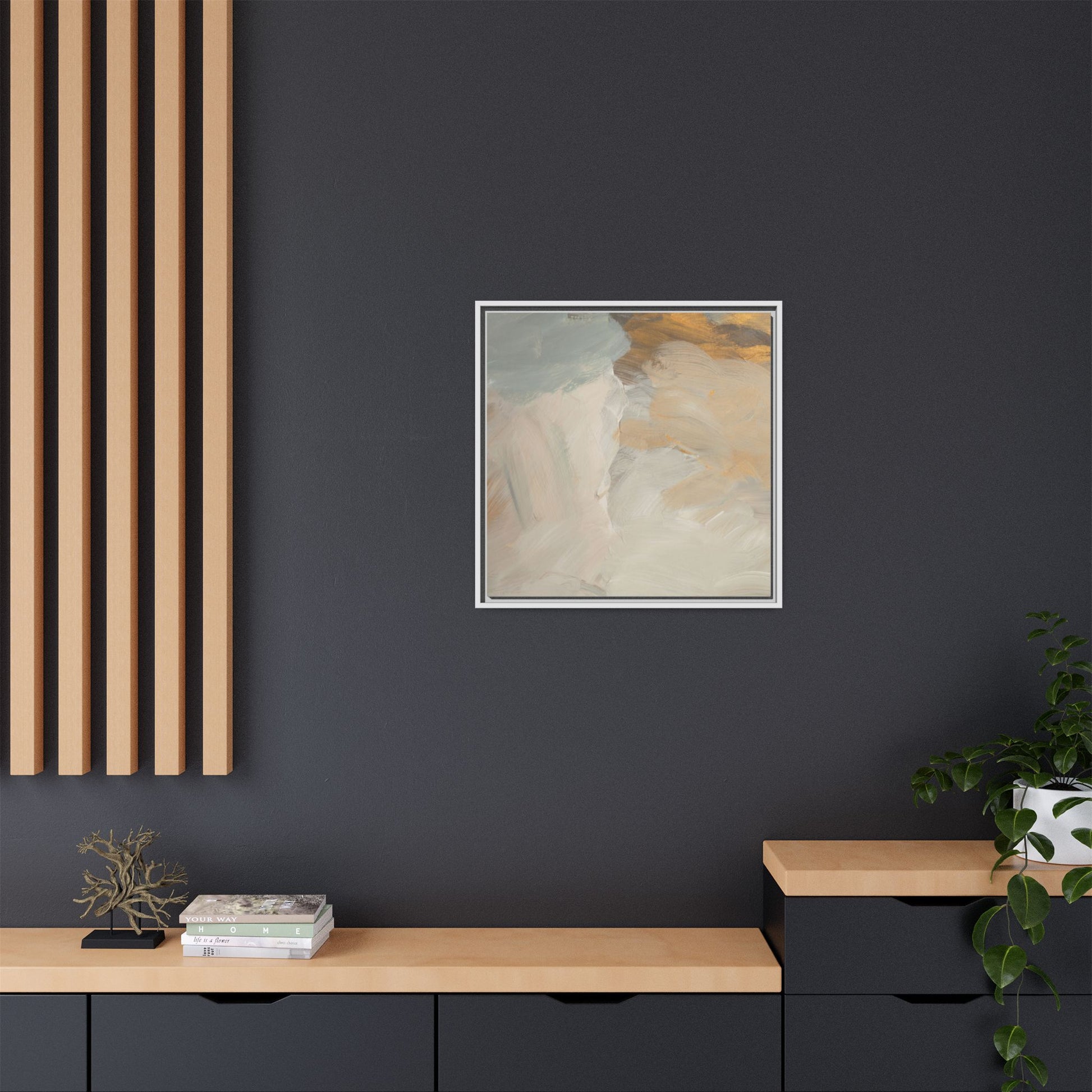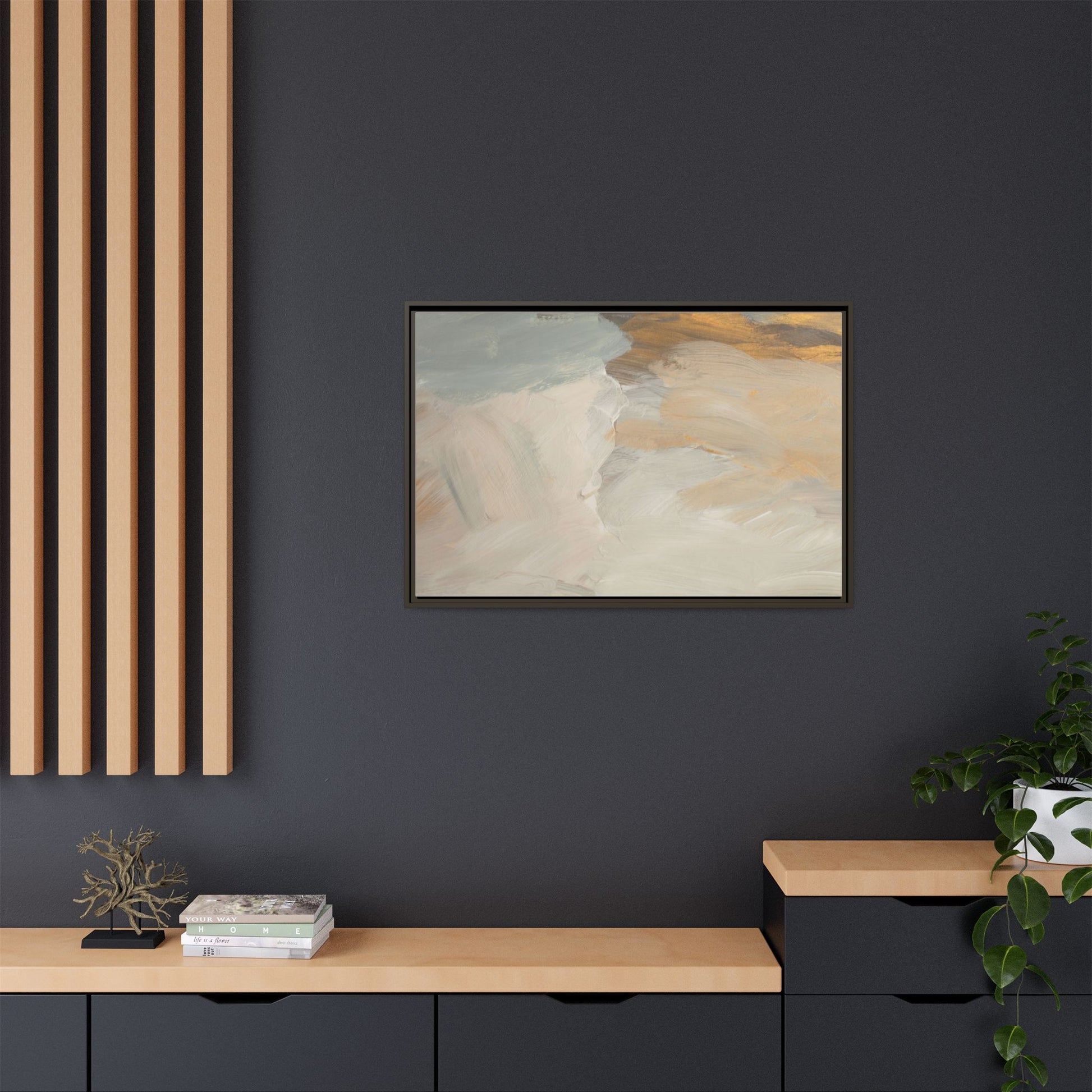 This abstract painting captures a serene landscape with soft, sweeping brushstrokes in muted tones of white, beige, pale blue, and golden ochre. The composition evokes a sense of natural terrain, with layered textures suggesting rolling hills, rocky formations, or coastal landscapes viewed from an aerial perspective. Delicate blending techniques create a sense of depth and movement, with gentle curves and undulating lines that guide the viewer's eye across the canvas. The color palette is subdued and harmonious, featuring gentle transitions between light and warm hues that create a tranquil, ethereal atmosphere. The painting's style appears to be a contemporary interpretation of landscape, blending impressionistic techniques with a more minimalist, abstract approach.