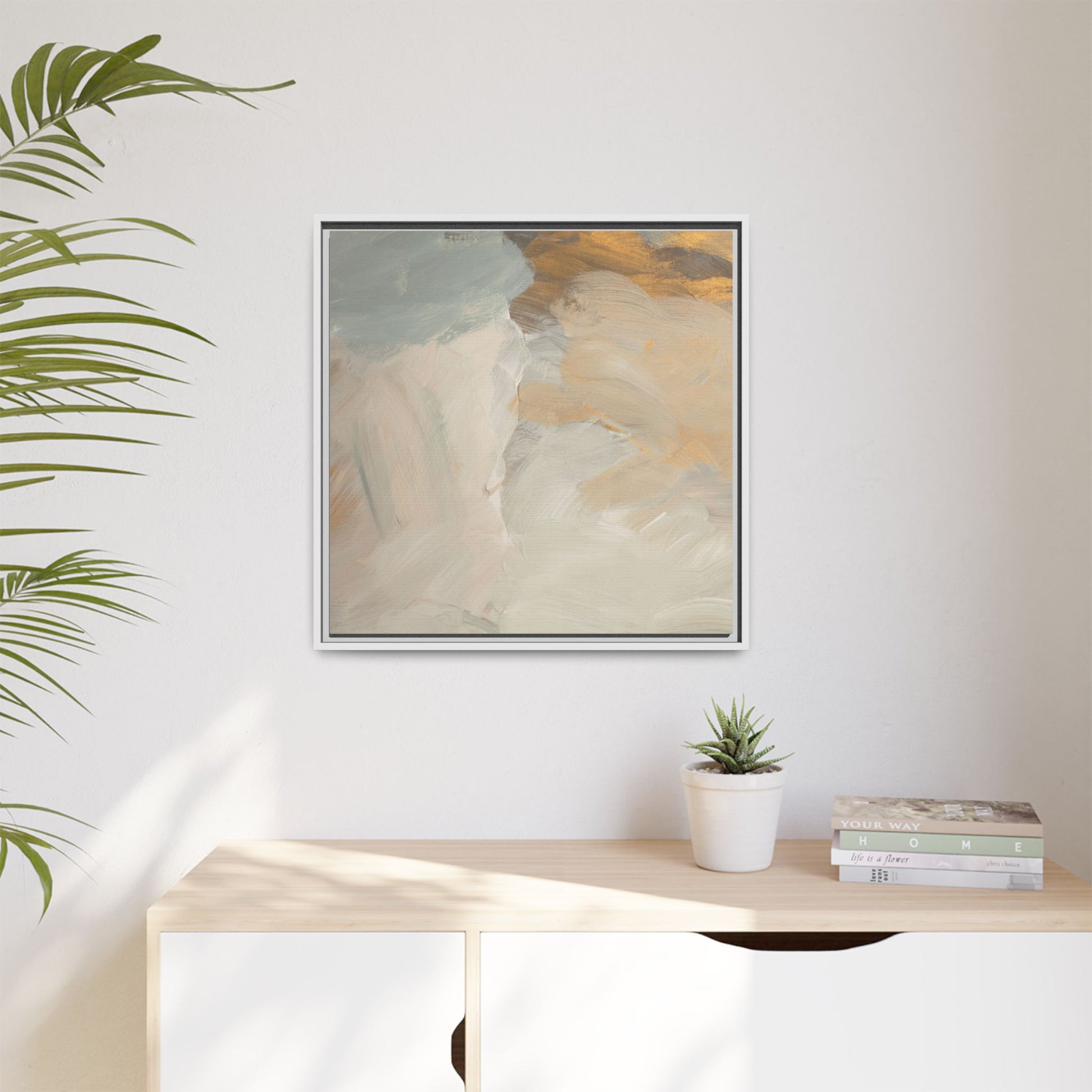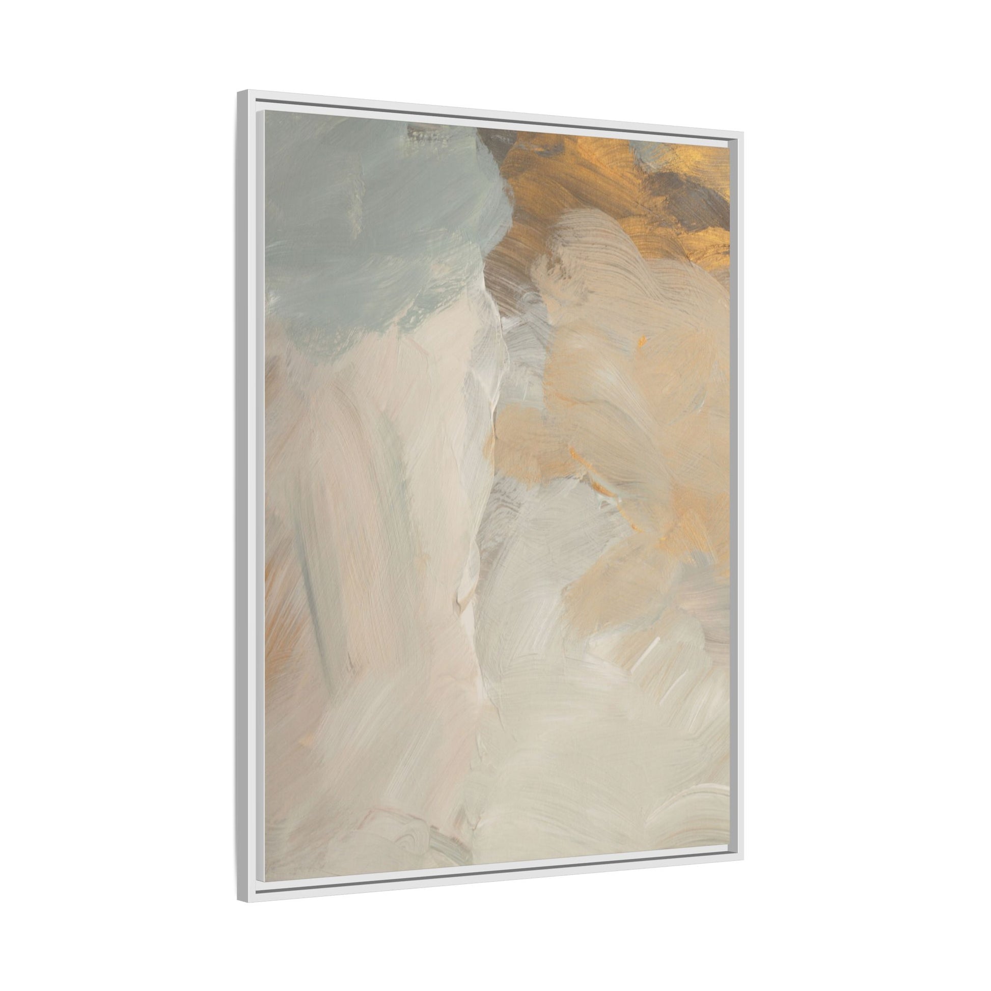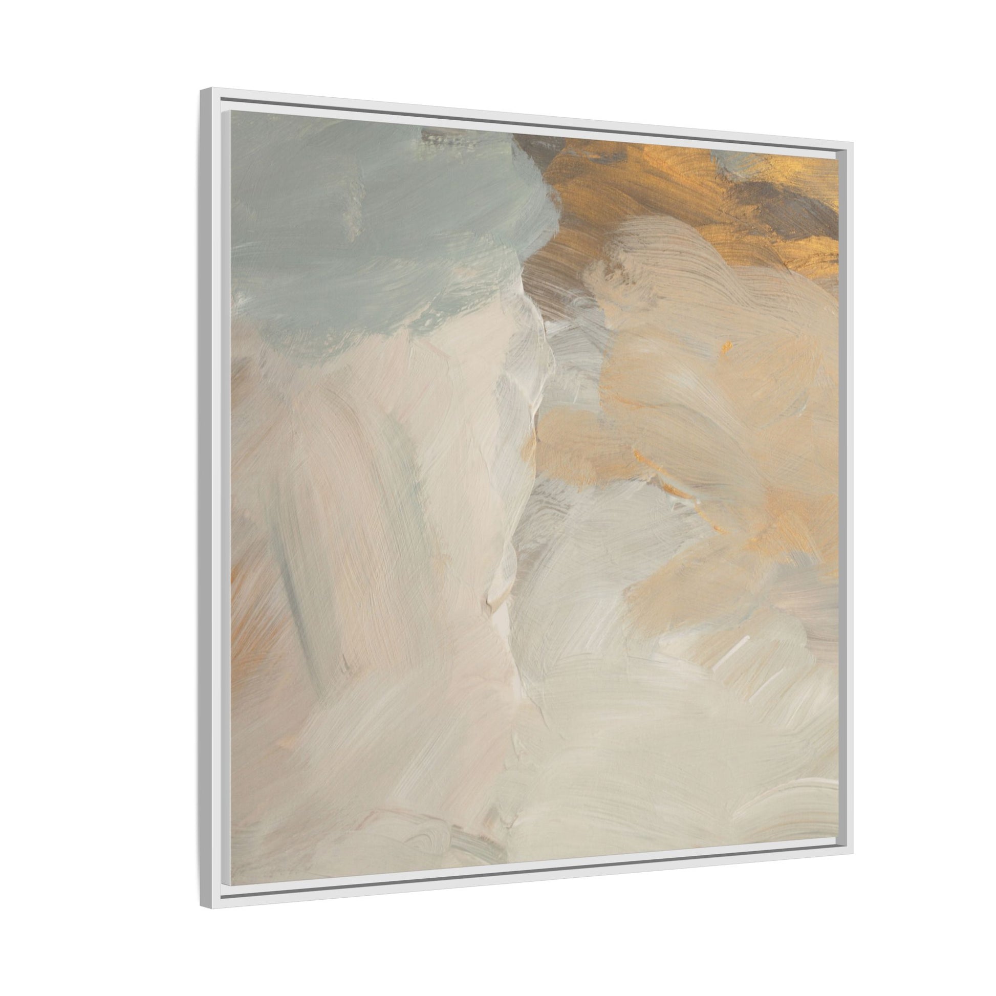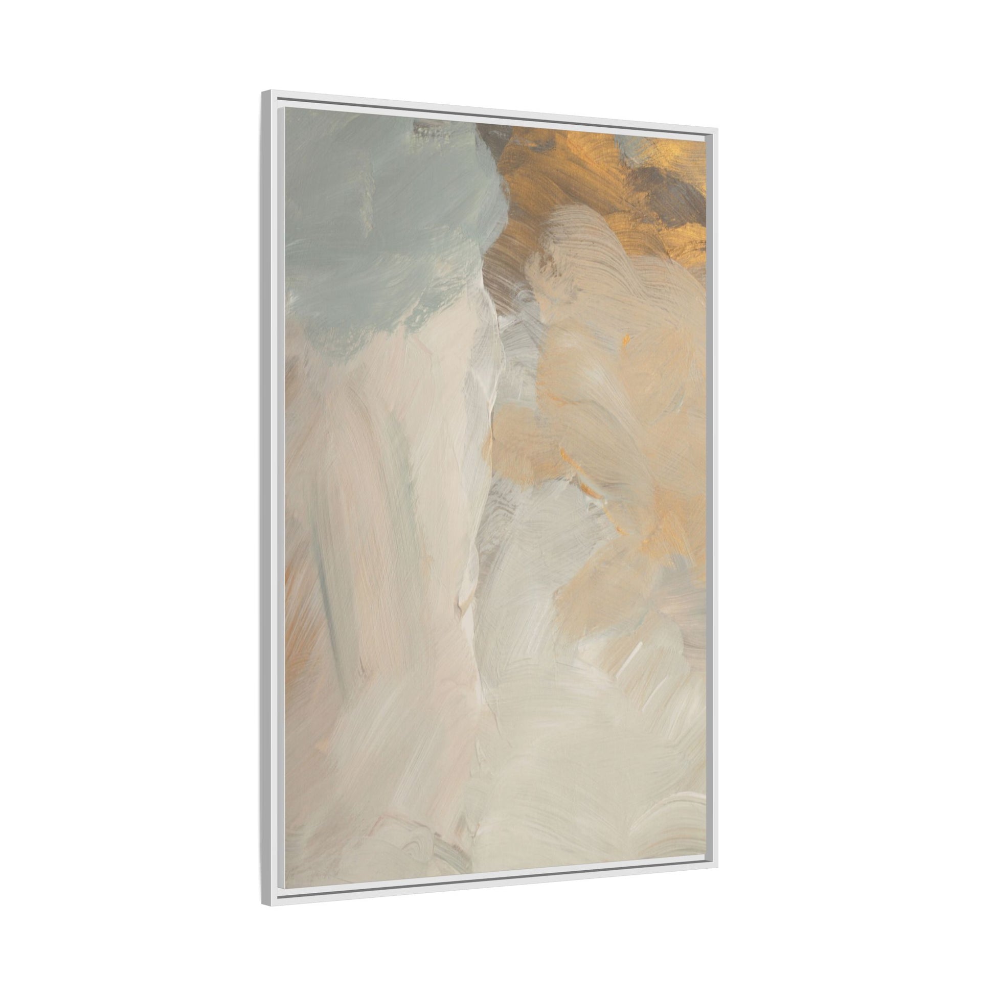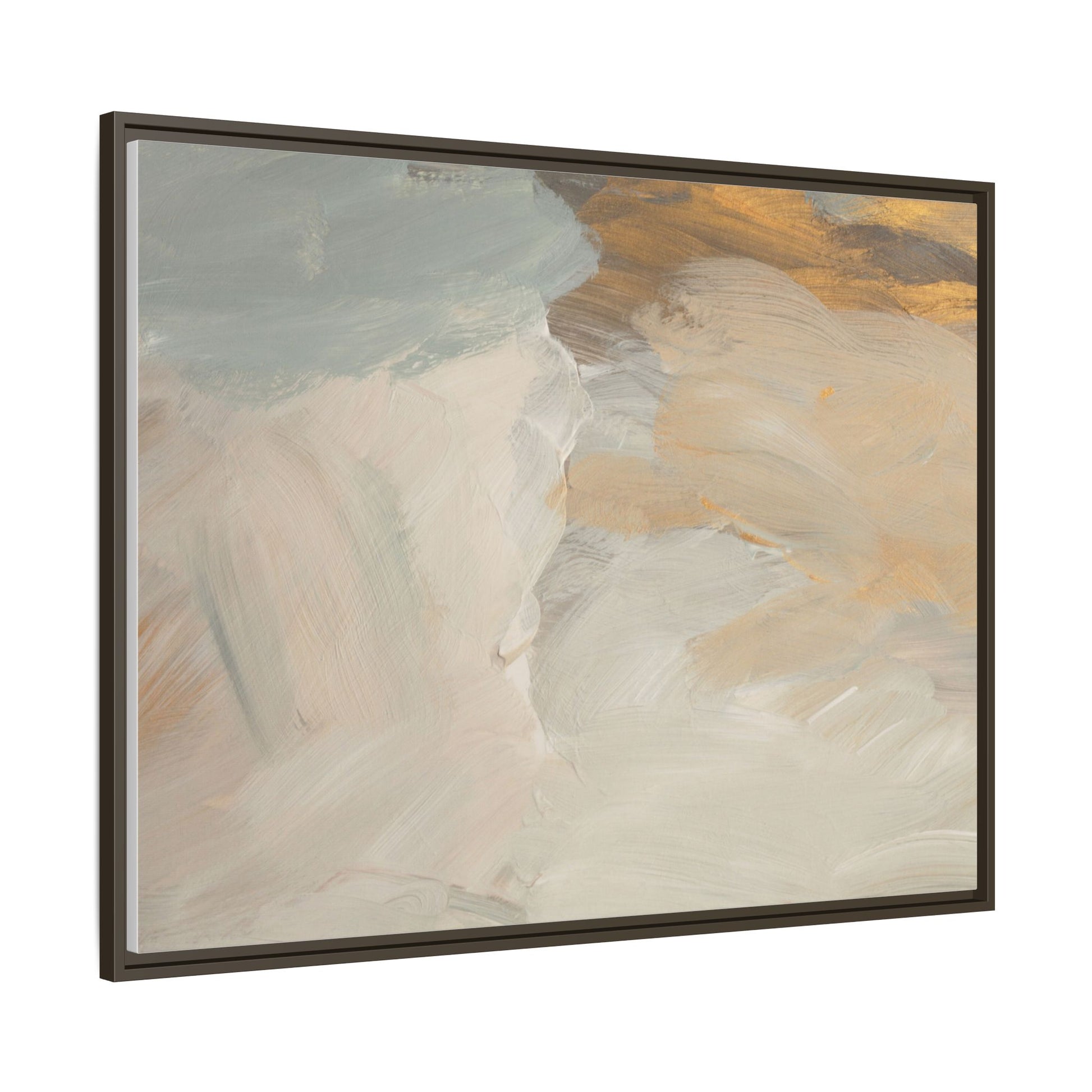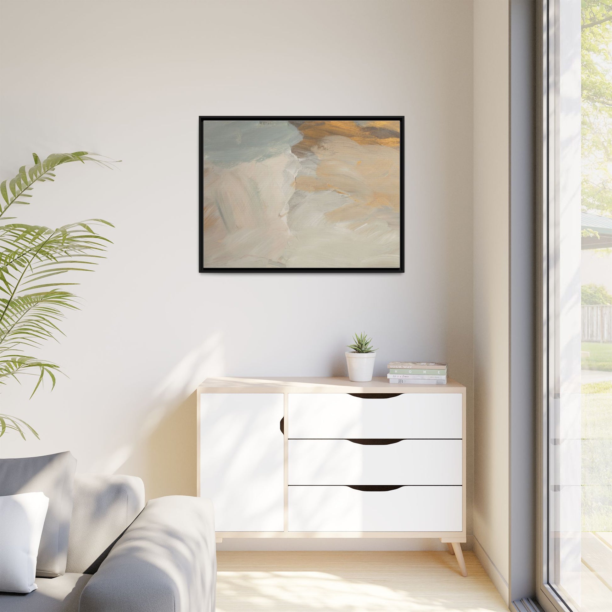 This abstract painting captures a serene landscape with soft, sweeping brushstrokes in muted tones of white, beige, pale blue, and golden ochre. The composition evokes a sense of natural terrain, with layered textures suggesting rolling hills, rocky formations, or coastal landscapes viewed from an aerial perspective. Delicate blending techniques create a sense of depth and movement, with gentle curves and undulating lines that guide the viewer's eye across the canvas. The color palette is subdued and harmonious, featuring gentle transitions between light and warm hues that create a tranquil, ethereal atmosphere. The painting's style appears to be a contemporary interpretation of landscape, blending impressionistic techniques with a more minimalist, abstract approach.