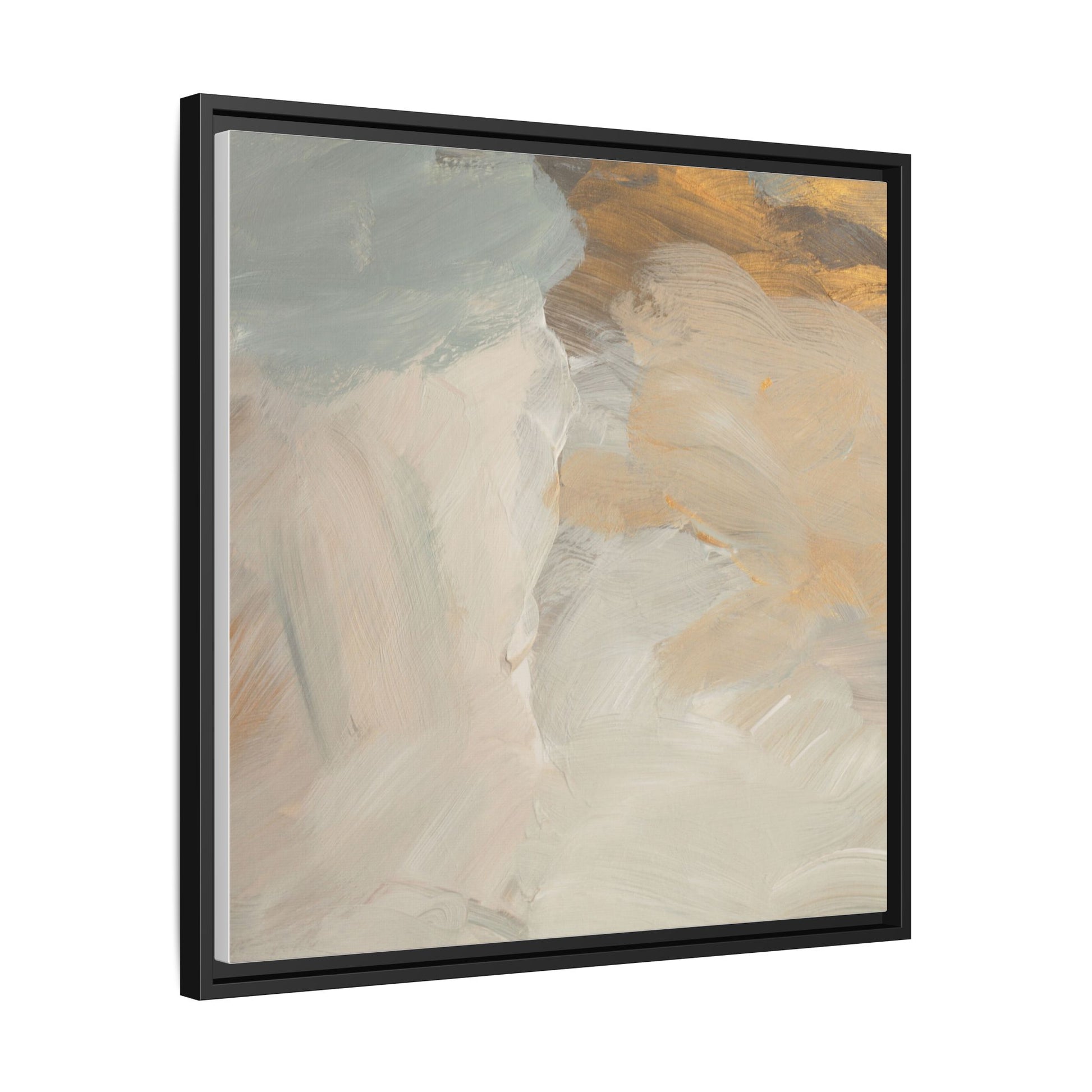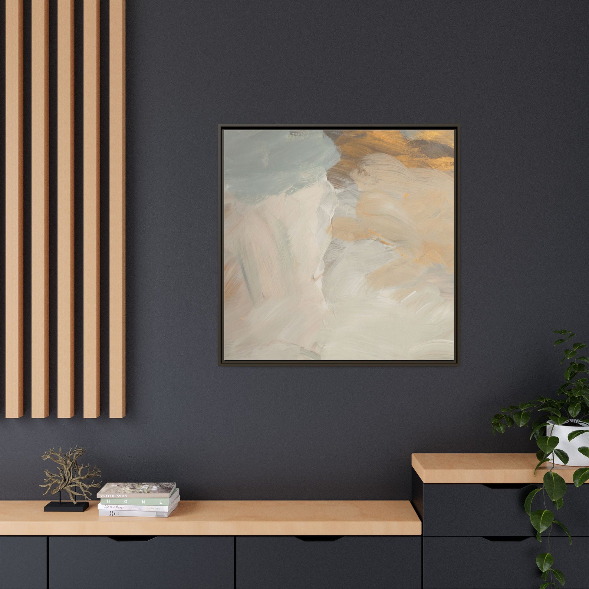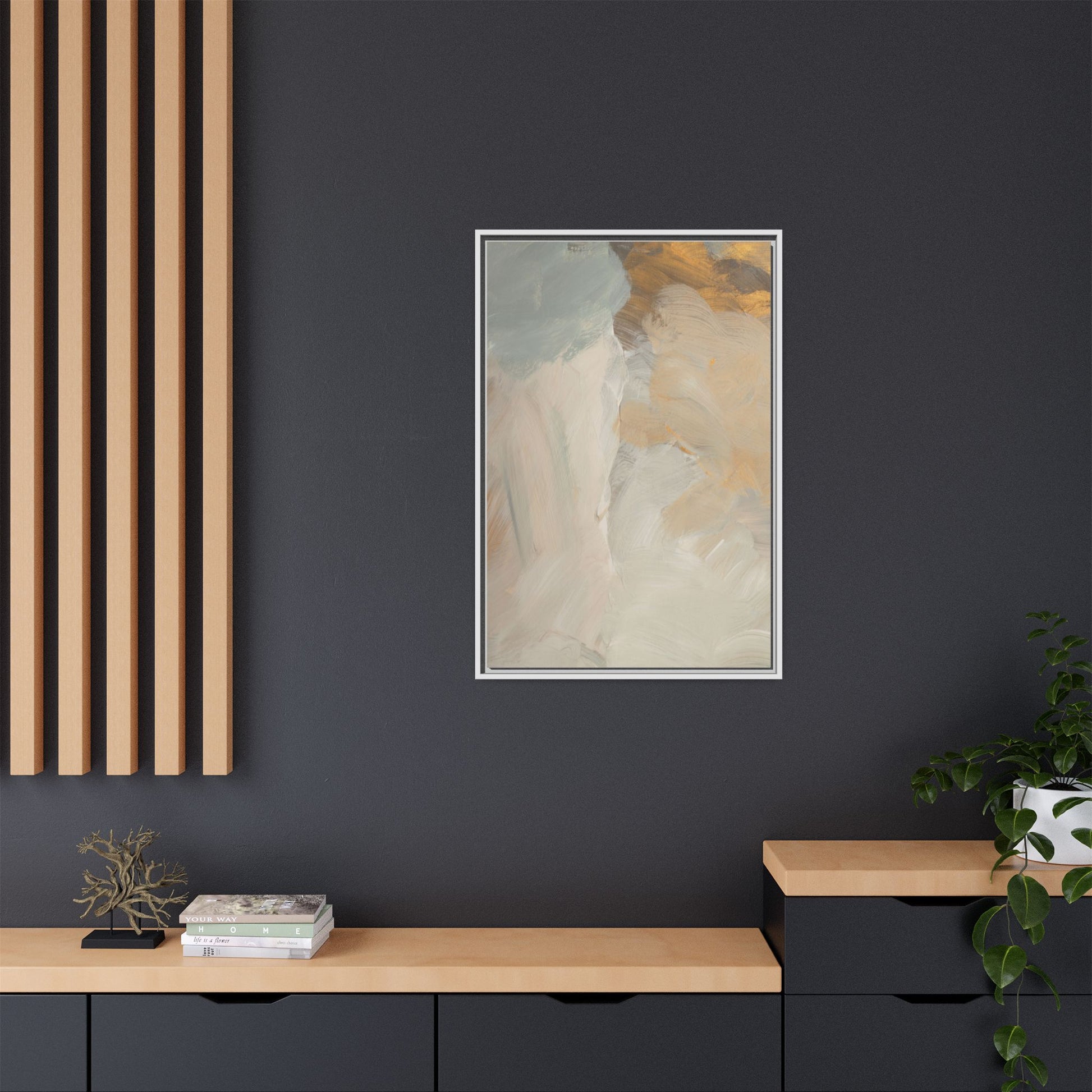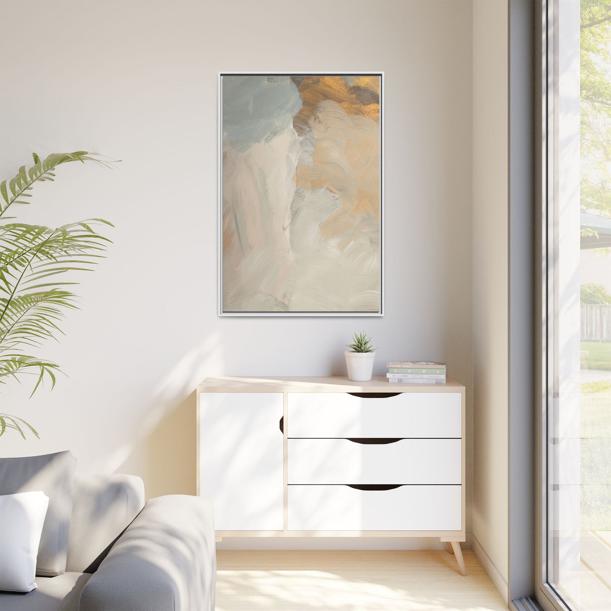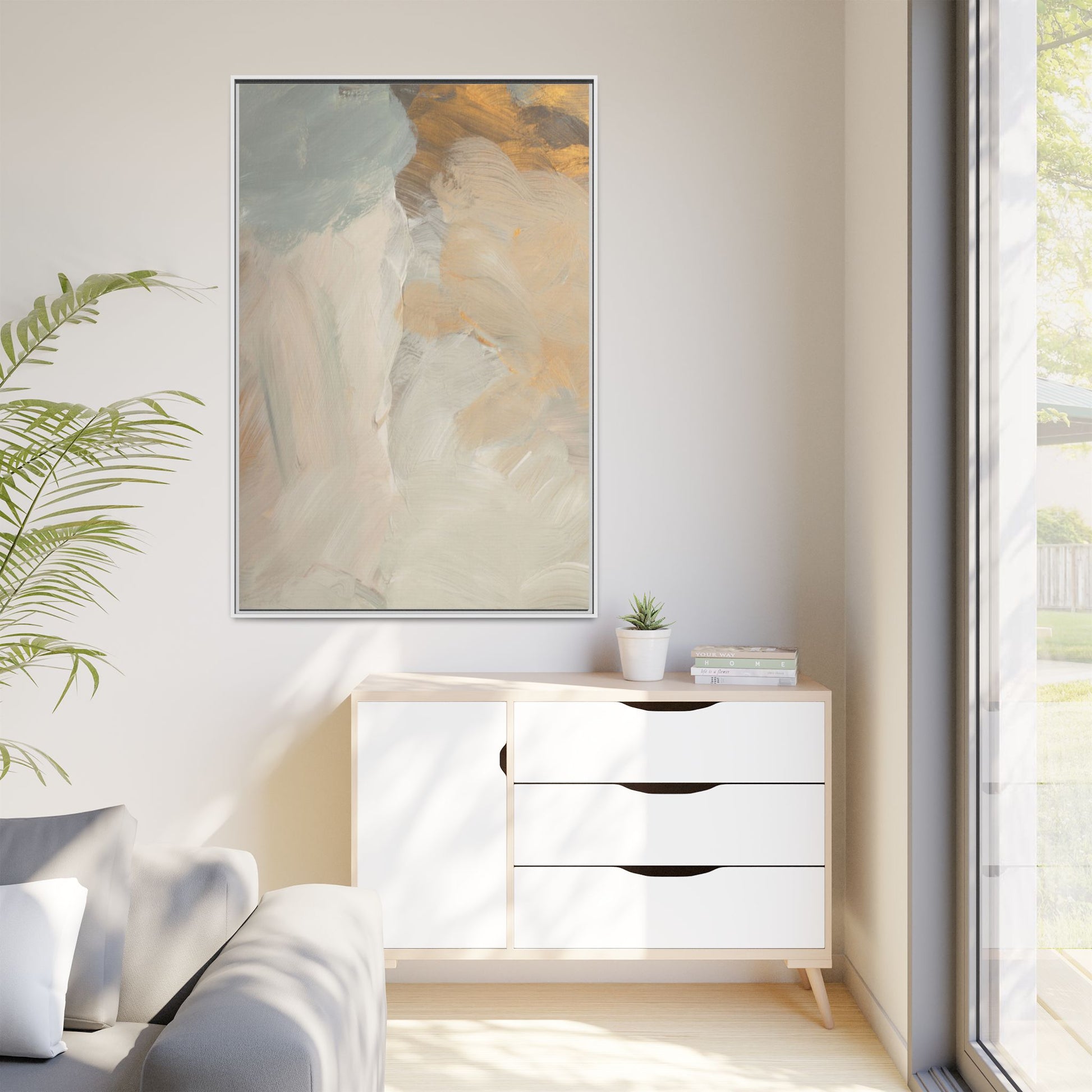 This abstract painting captures a serene landscape with soft, sweeping brushstrokes in muted tones of white, beige, pale blue, and golden ochre. The composition evokes a sense of natural terrain, with layered textures suggesting rolling hills, rocky formations, or coastal landscapes viewed from an aerial perspective. Delicate blending techniques create a sense of depth and movement, with gentle curves and undulating lines that guide the viewer's eye across the canvas. The color palette is subdued and harmonious, featuring gentle transitions between light and warm hues that create a tranquil, ethereal atmosphere. The painting's style appears to be a contemporary interpretation of landscape, blending impressionistic techniques with a more minimalist, abstract approach.