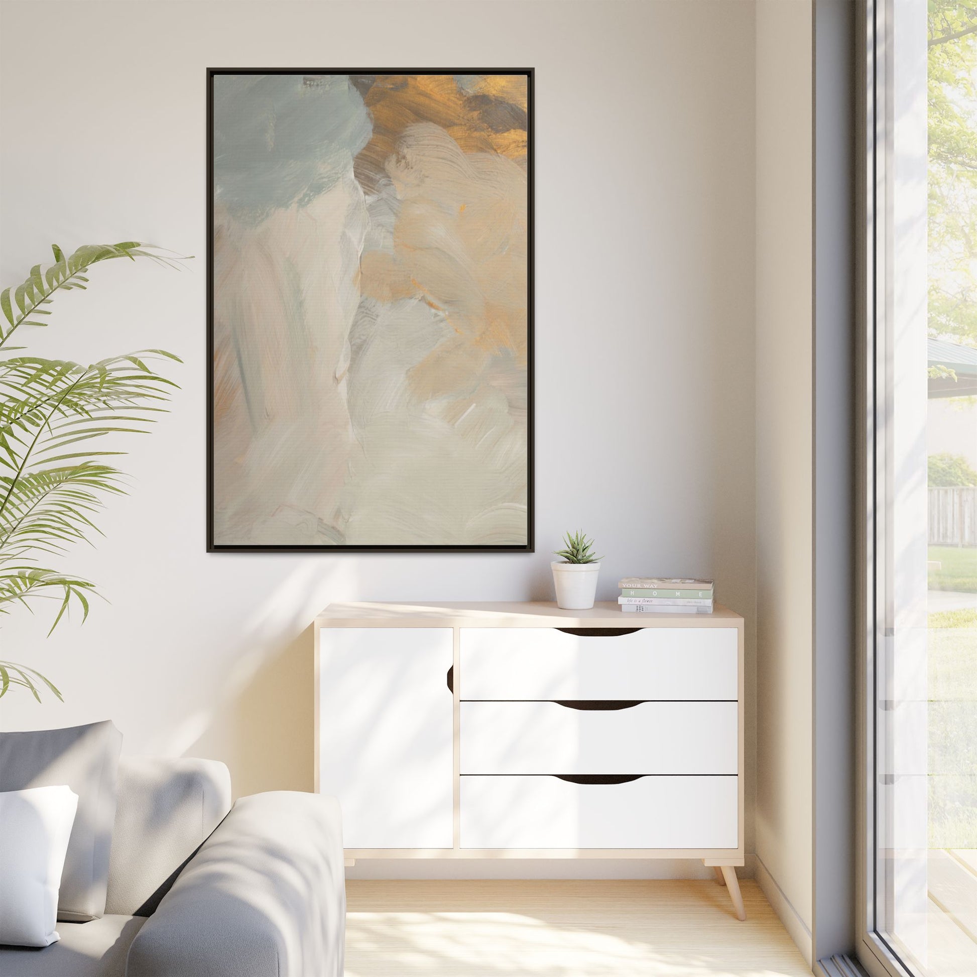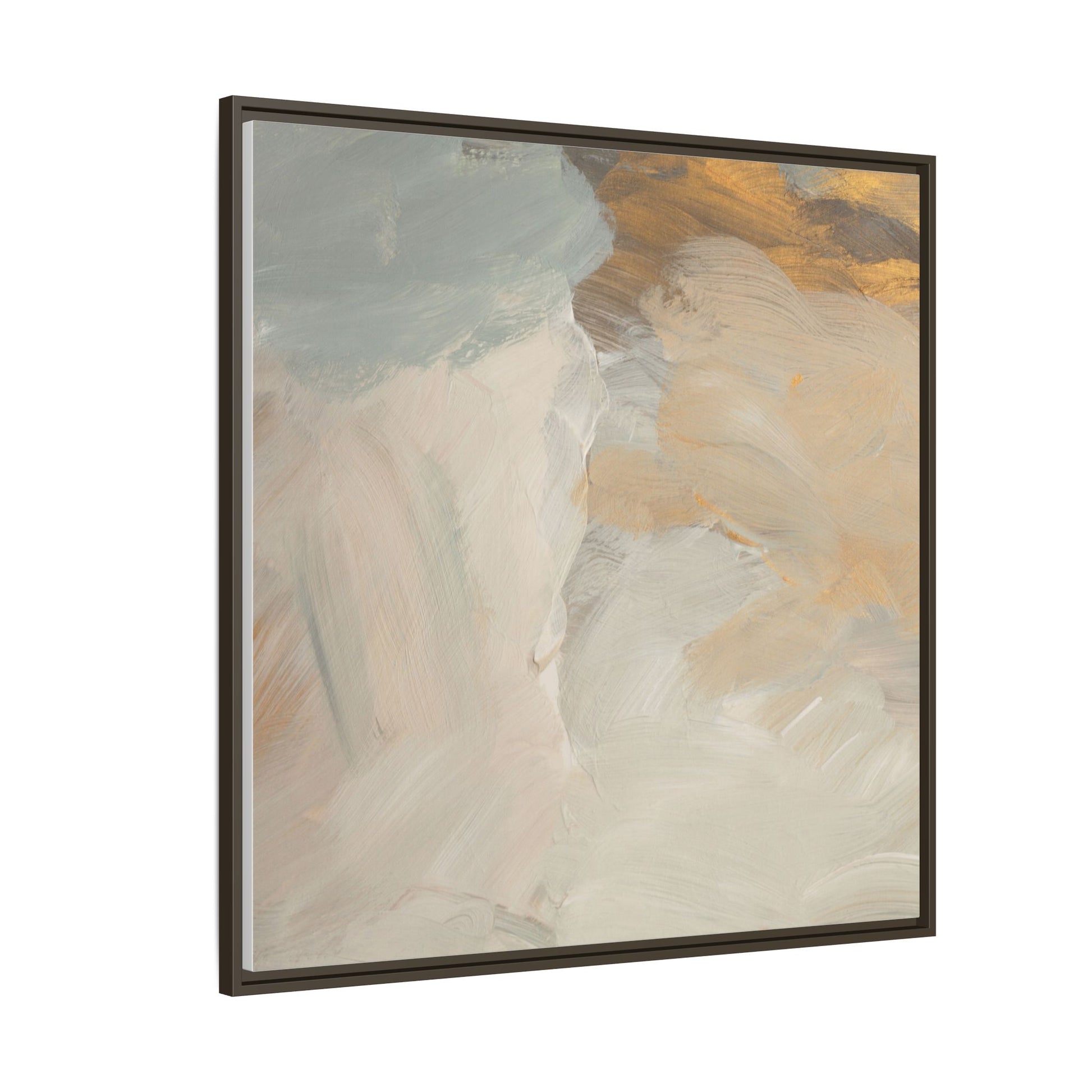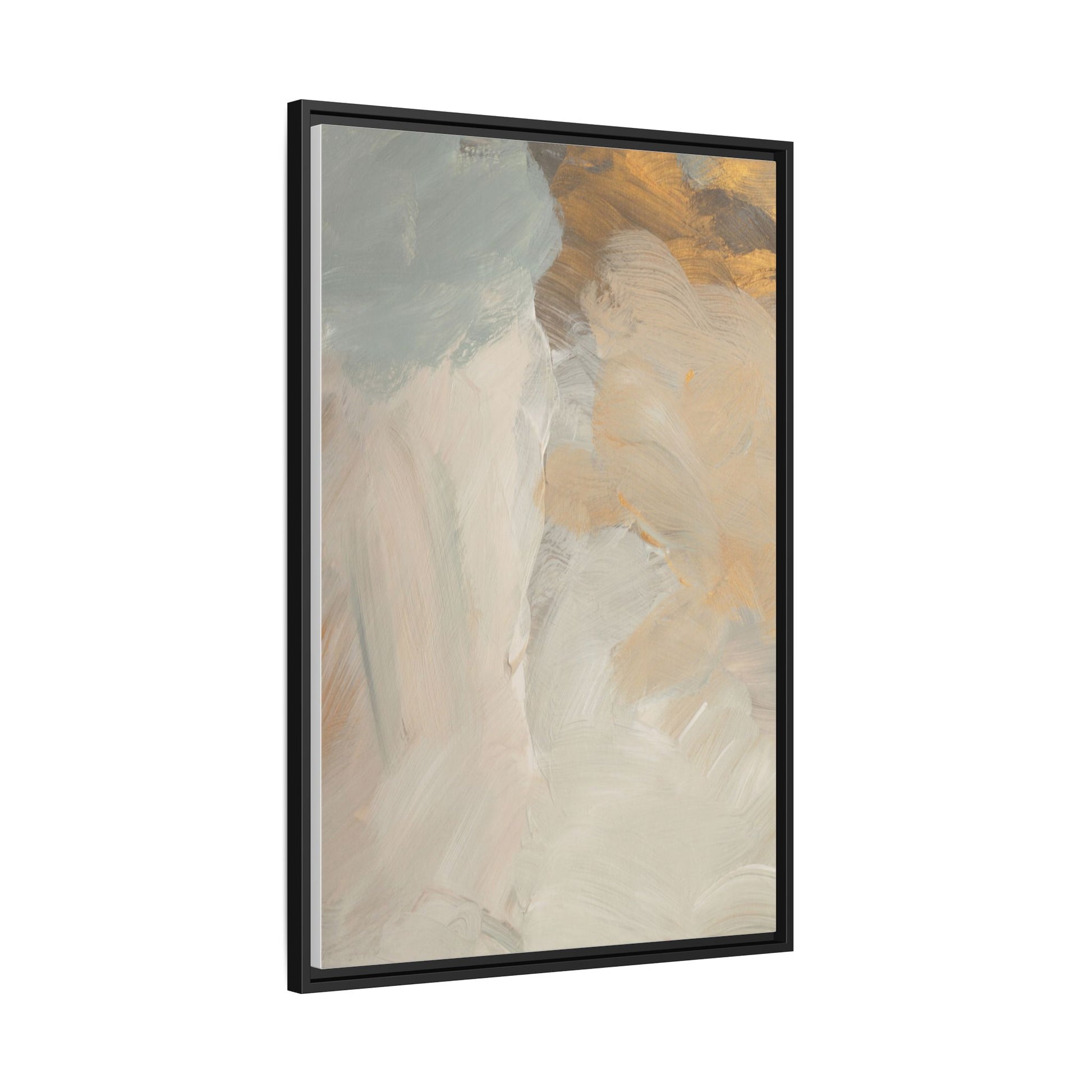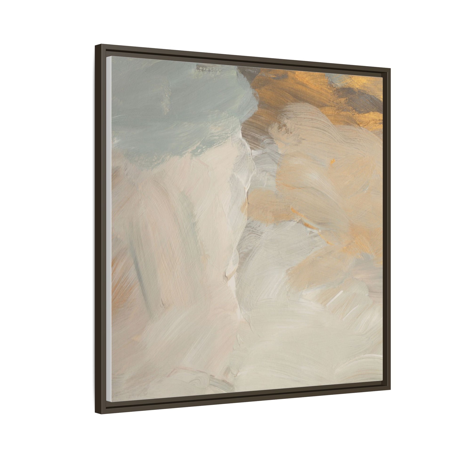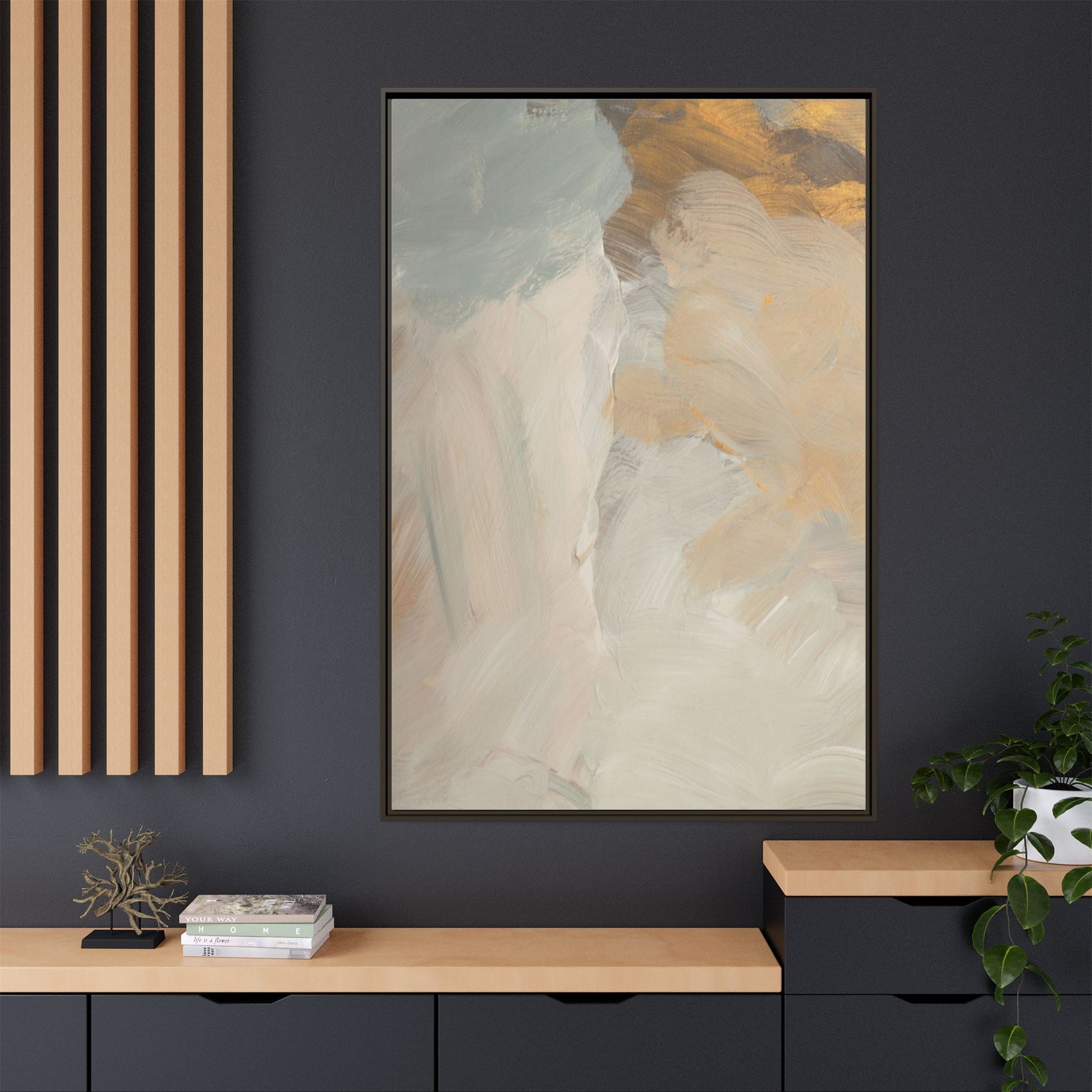 This abstract painting captures a serene landscape with soft, sweeping brushstrokes in muted tones of white, beige, pale blue, and golden ochre. The composition evokes a sense of natural terrain, with layered textures suggesting rolling hills, rocky formations, or coastal landscapes viewed from an aerial perspective. Delicate blending techniques create a sense of depth and movement, with gentle curves and undulating lines that guide the viewer's eye across the canvas. The color palette is subdued and harmonious, featuring gentle transitions between light and warm hues that create a tranquil, ethereal atmosphere. The painting's style appears to be a contemporary interpretation of landscape, blending impressionistic techniques with a more minimalist, abstract approach.