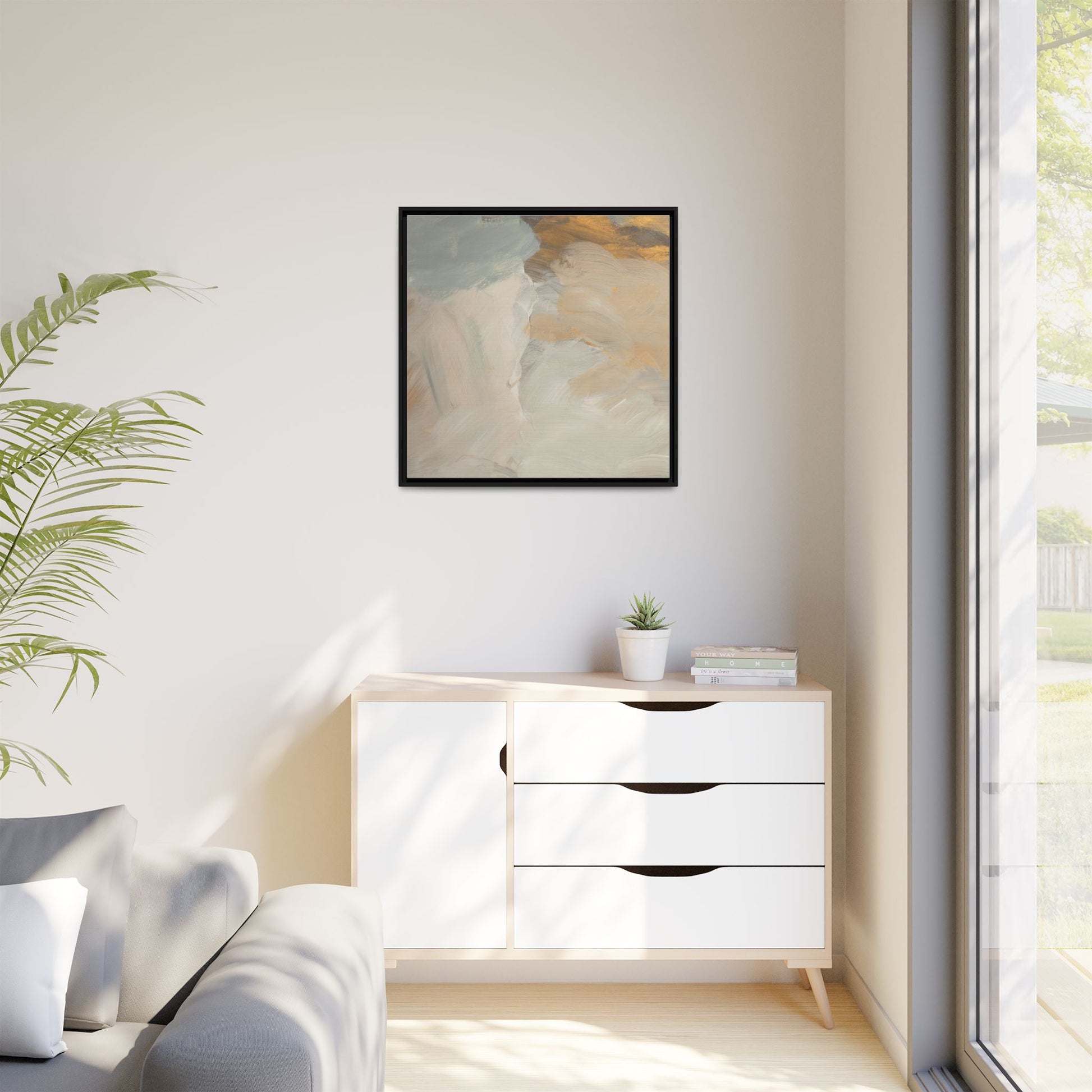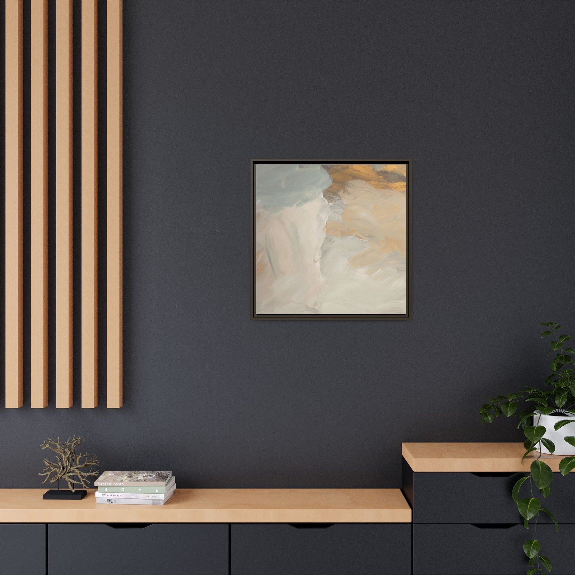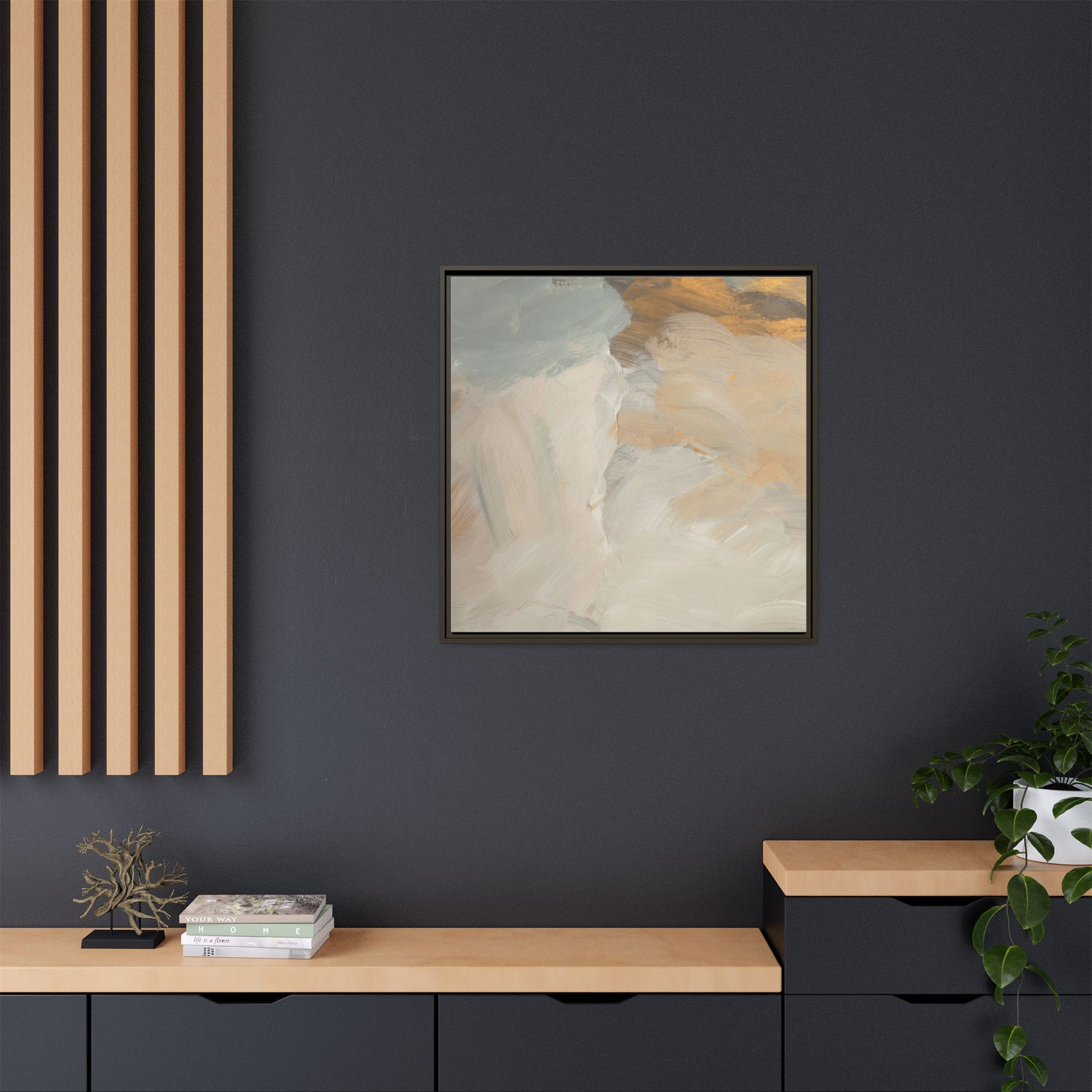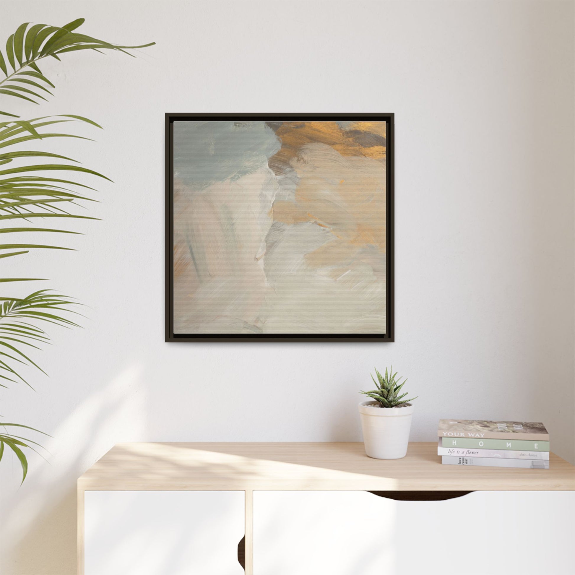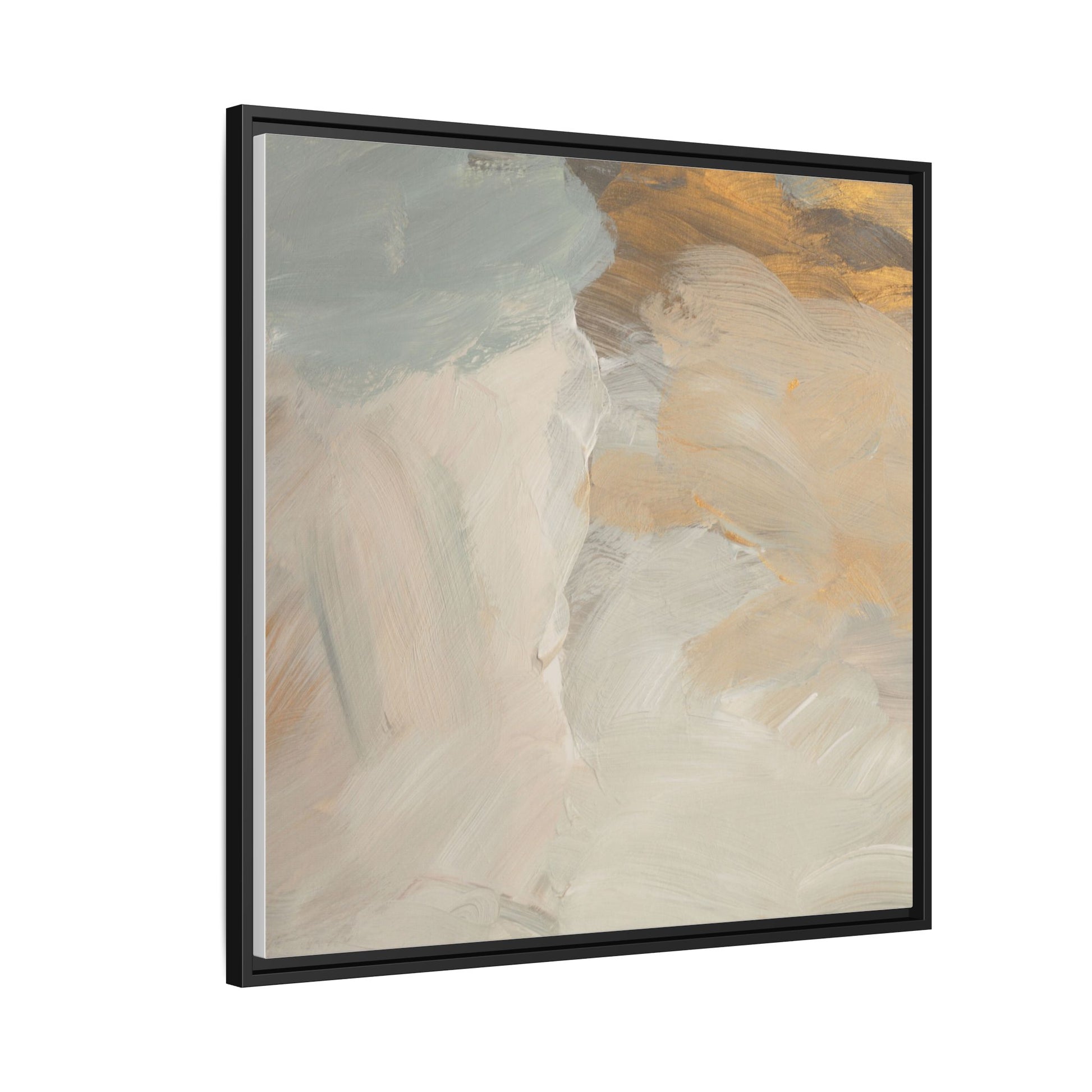 This abstract painting captures a serene landscape with soft, sweeping brushstrokes in muted tones of white, beige, pale blue, and golden ochre. The composition evokes a sense of natural terrain, with layered textures suggesting rolling hills, rocky formations, or coastal landscapes viewed from an aerial perspective. Delicate blending techniques create a sense of depth and movement, with gentle curves and undulating lines that guide the viewer's eye across the canvas. The color palette is subdued and harmonious, featuring gentle transitions between light and warm hues that create a tranquil, ethereal atmosphere. The painting's style appears to be a contemporary interpretation of landscape, blending impressionistic techniques with a more minimalist, abstract approach.