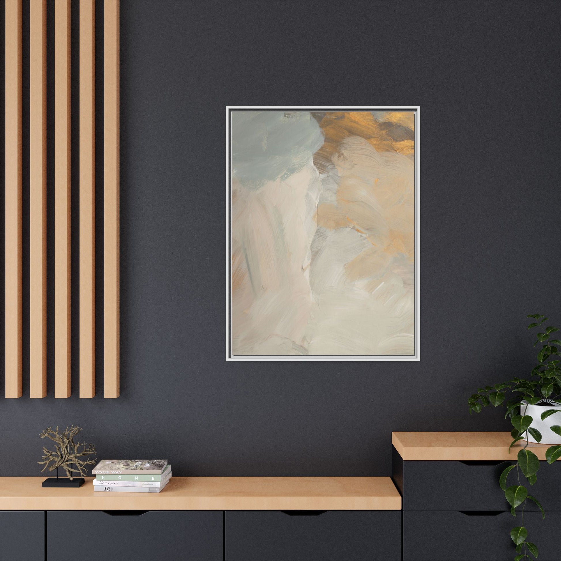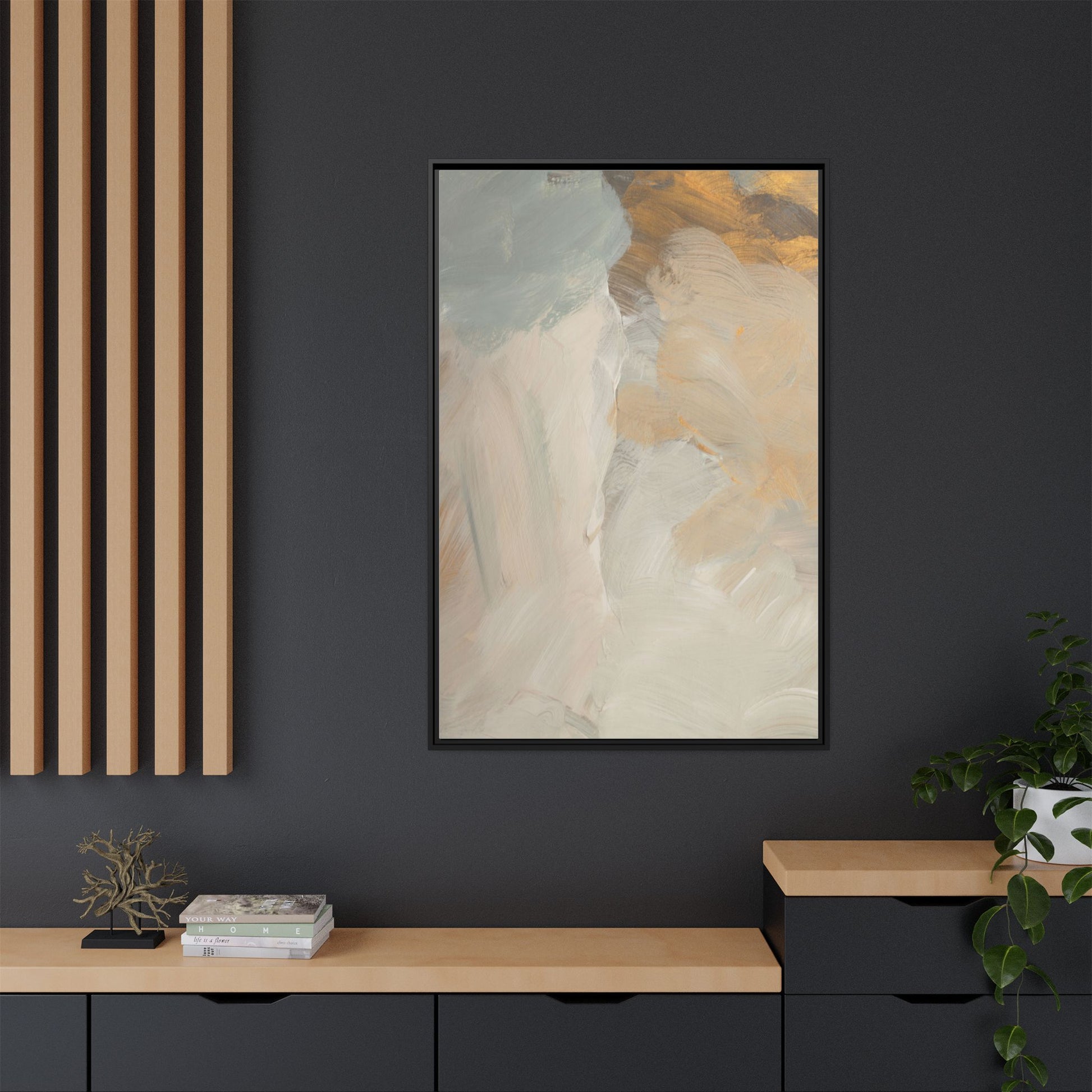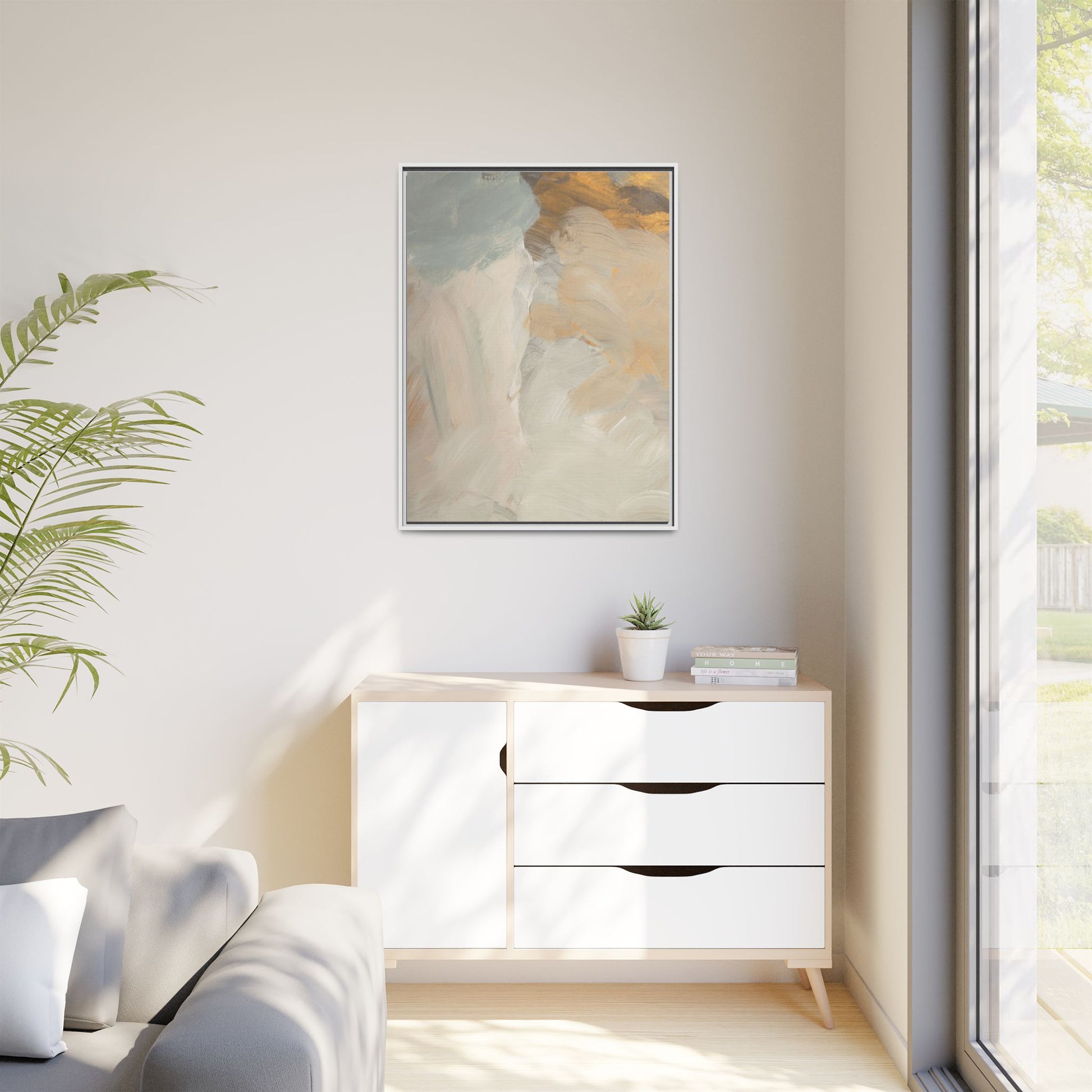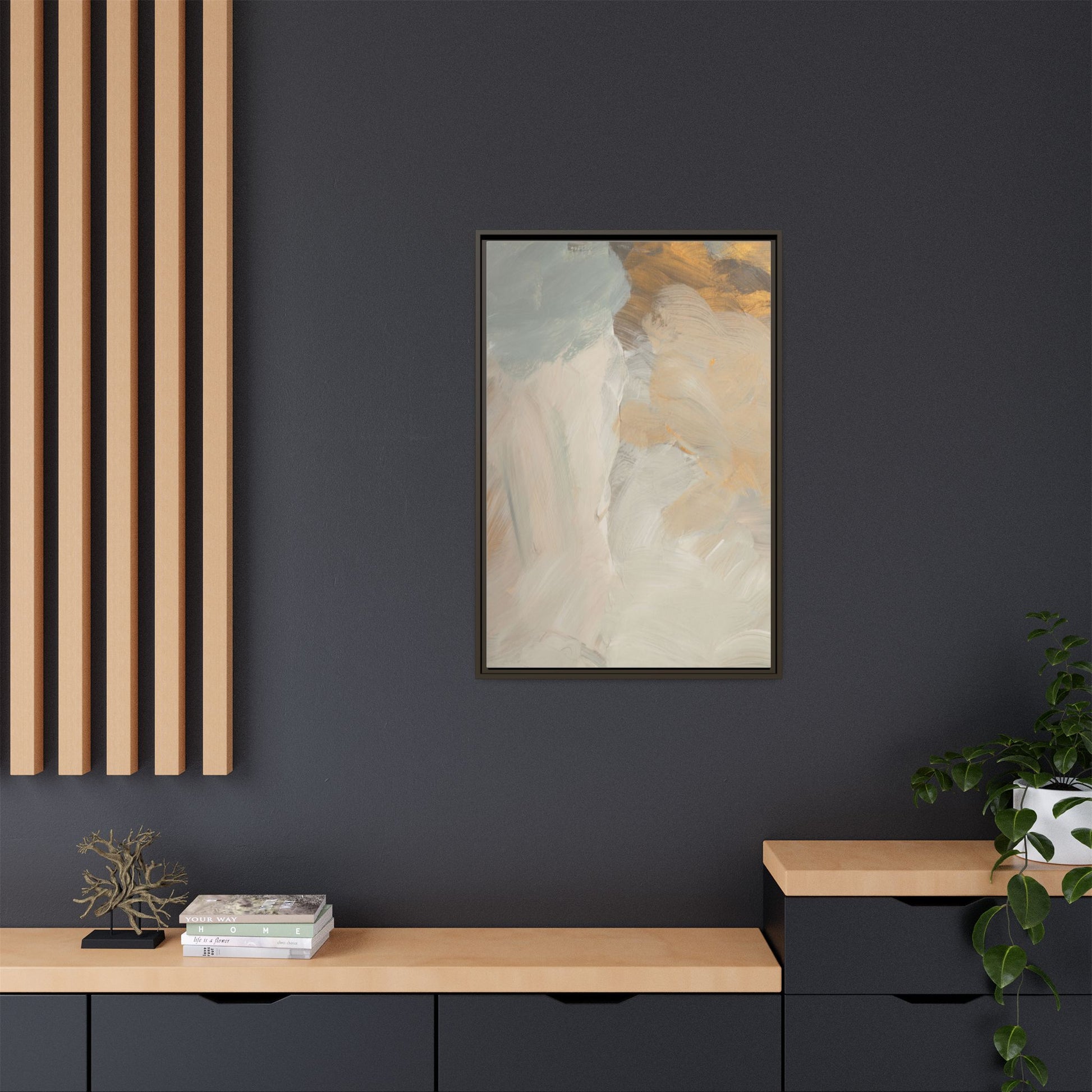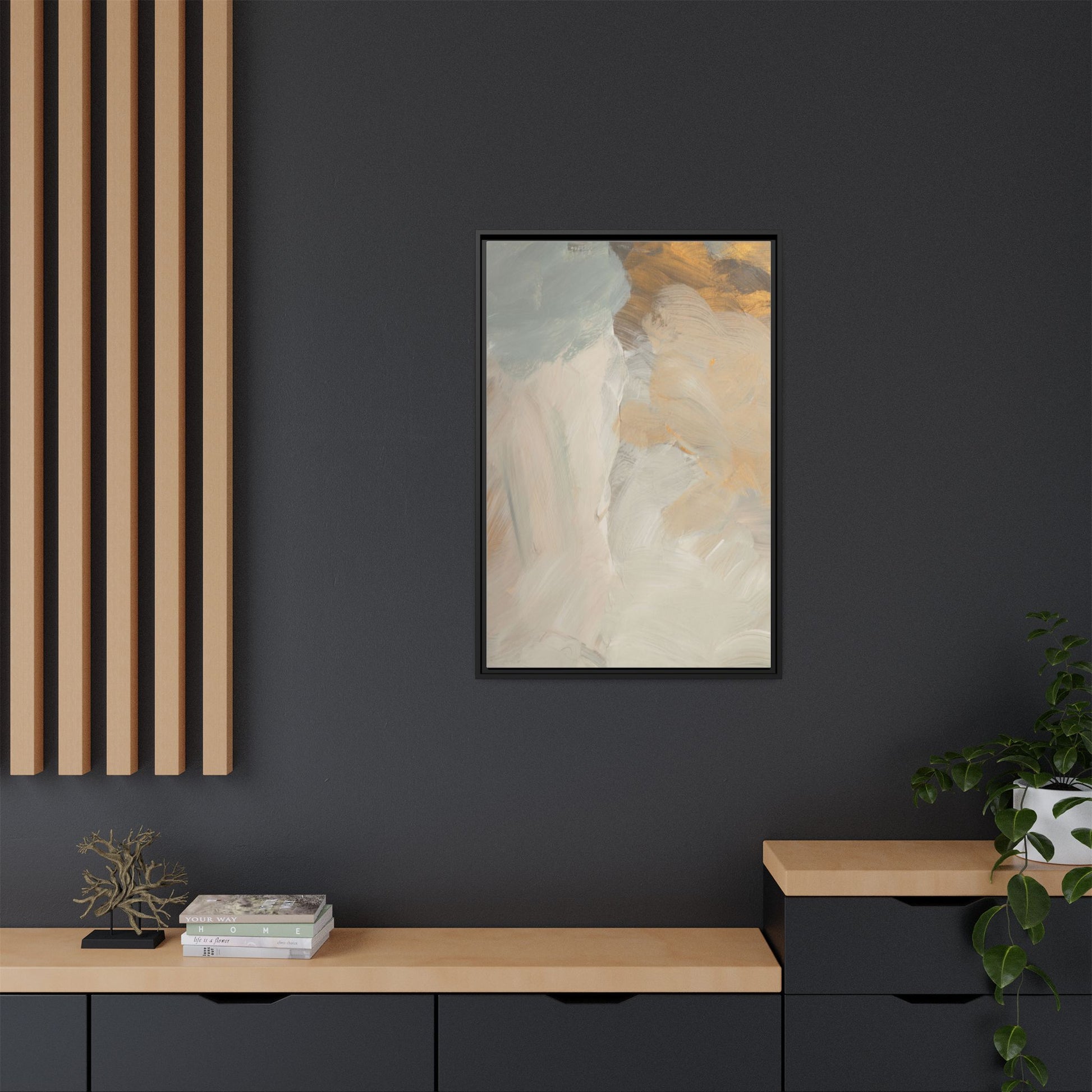 This abstract painting captures a serene landscape with soft, sweeping brushstrokes in muted tones of white, beige, pale blue, and golden ochre. The composition evokes a sense of natural terrain, with layered textures suggesting rolling hills, rocky formations, or coastal landscapes viewed from an aerial perspective. Delicate blending techniques create a sense of depth and movement, with gentle curves and undulating lines that guide the viewer's eye across the canvas. The color palette is subdued and harmonious, featuring gentle transitions between light and warm hues that create a tranquil, ethereal atmosphere. The painting's style appears to be a contemporary interpretation of landscape, blending impressionistic techniques with a more minimalist, abstract approach.