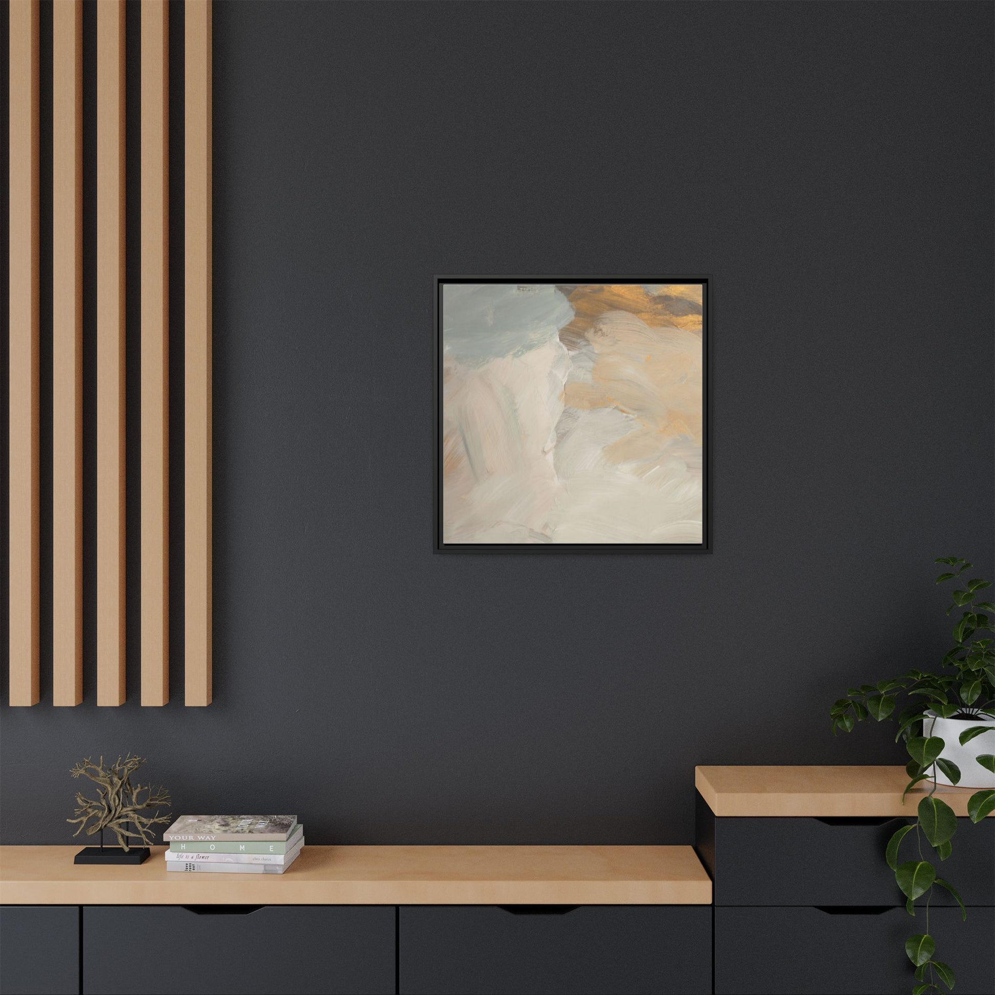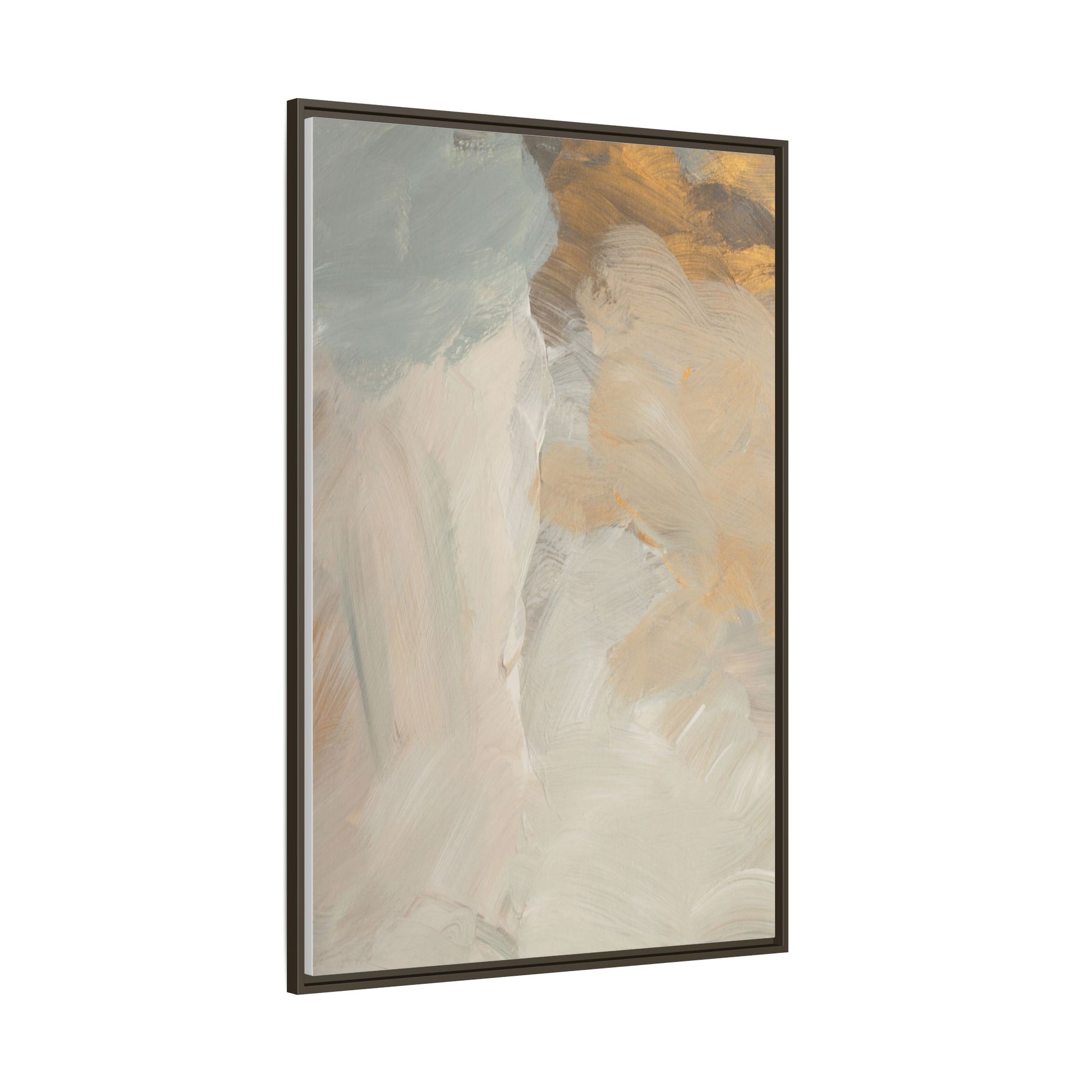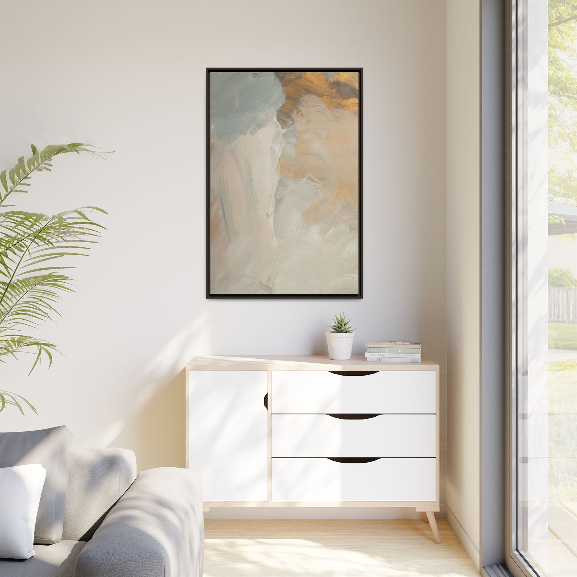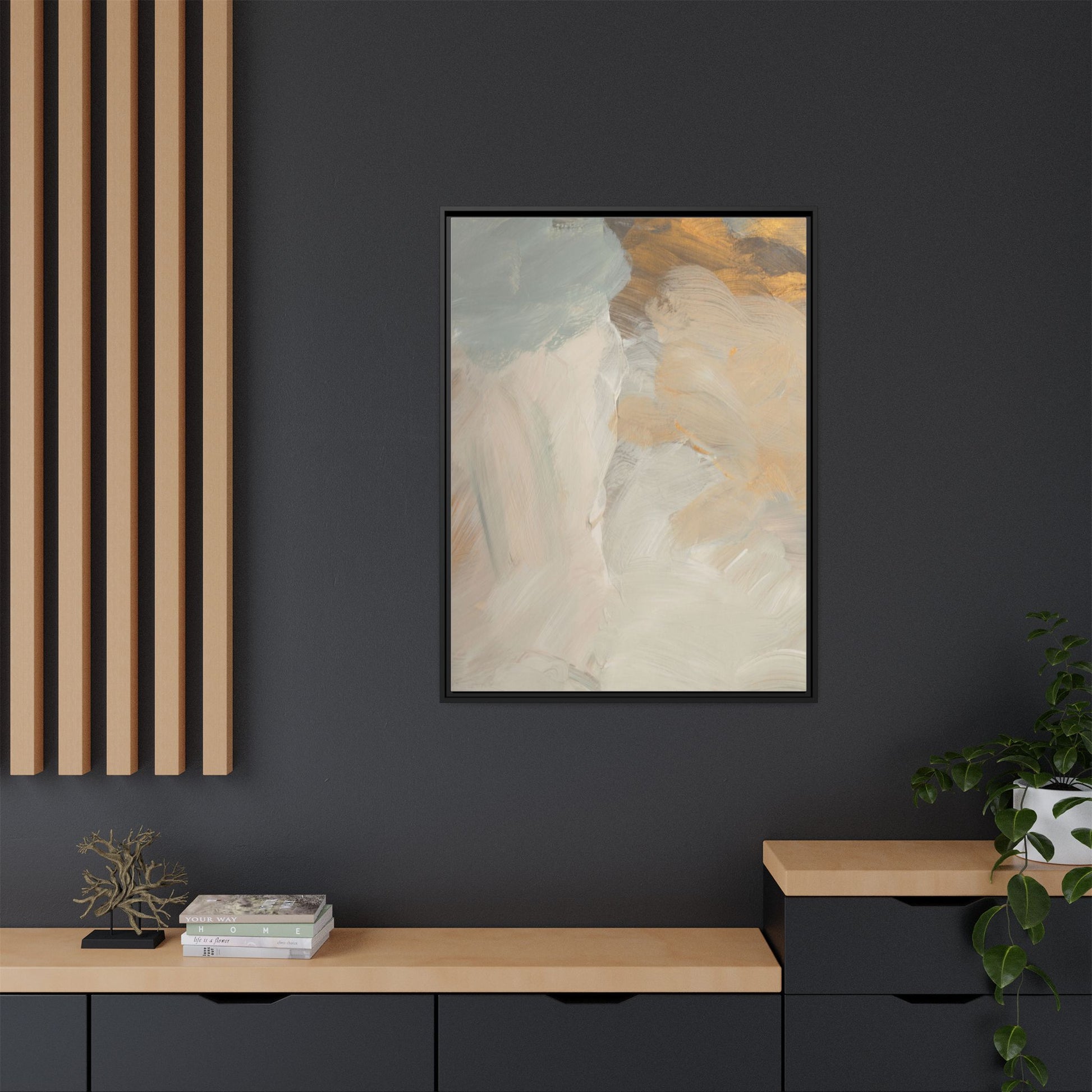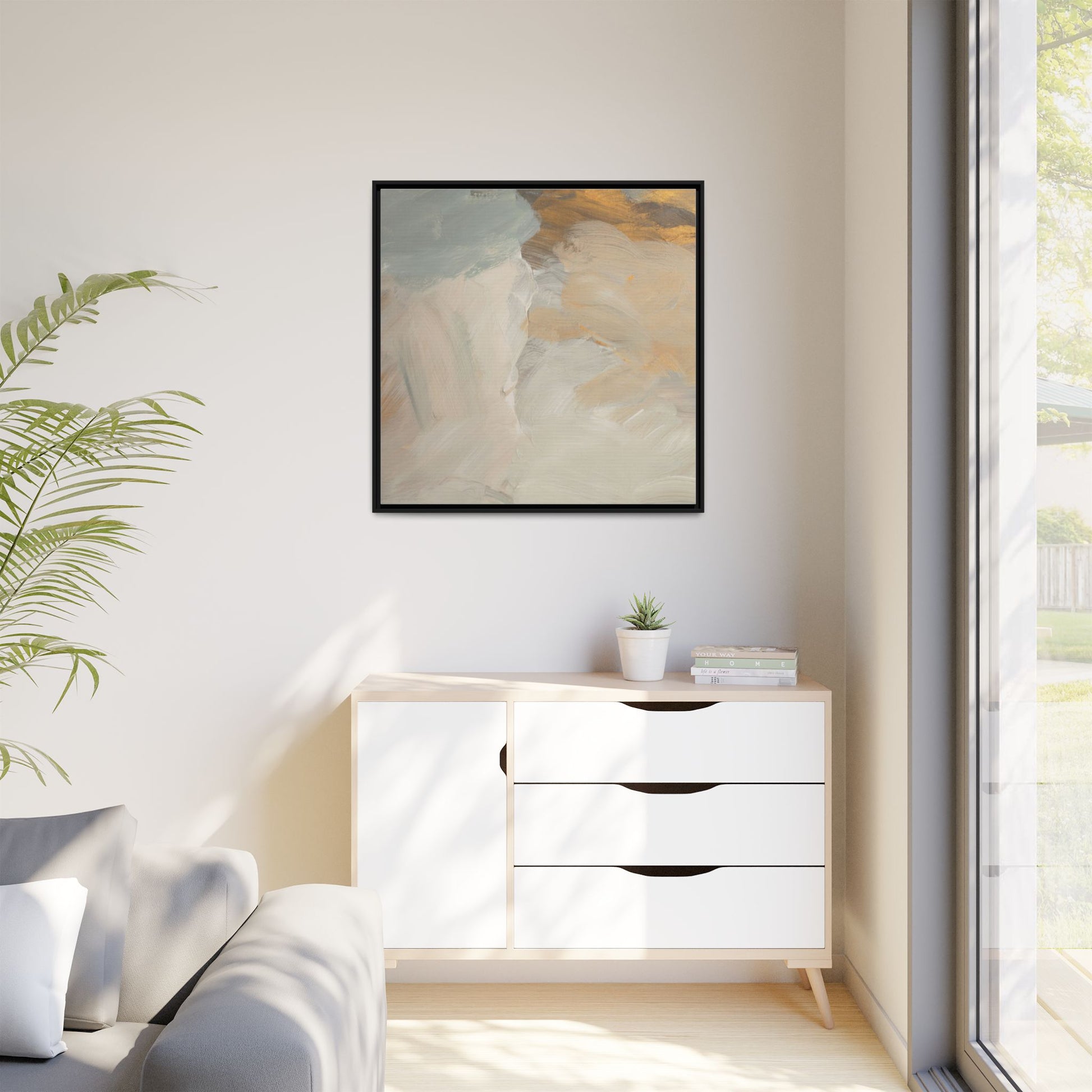 This abstract painting captures a serene landscape with soft, sweeping brushstrokes in muted tones of white, beige, pale blue, and golden ochre. The composition evokes a sense of natural terrain, with layered textures suggesting rolling hills, rocky formations, or coastal landscapes viewed from an aerial perspective. Delicate blending techniques create a sense of depth and movement, with gentle curves and undulating lines that guide the viewer's eye across the canvas. The color palette is subdued and harmonious, featuring gentle transitions between light and warm hues that create a tranquil, ethereal atmosphere. The painting's style appears to be a contemporary interpretation of landscape, blending impressionistic techniques with a more minimalist, abstract approach.