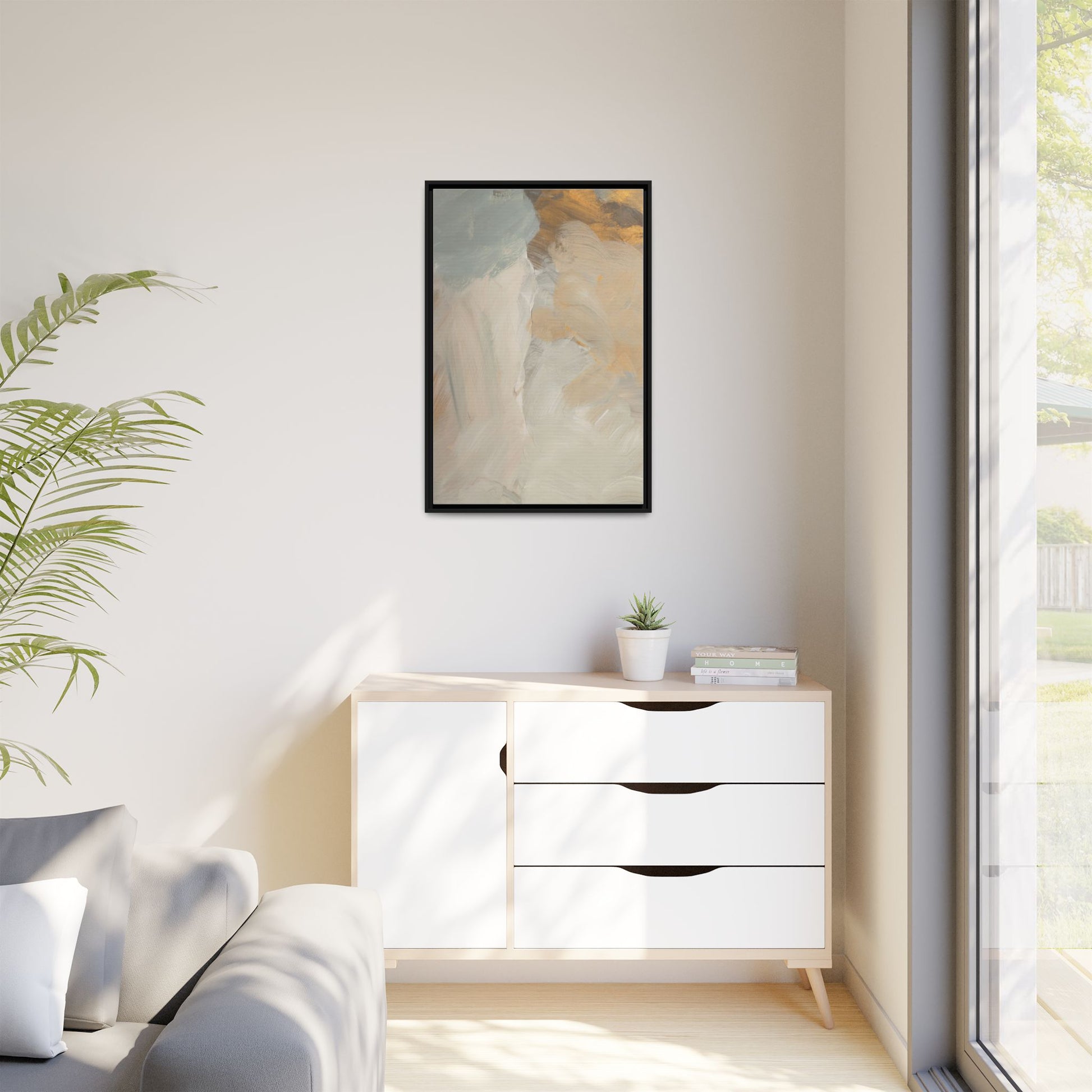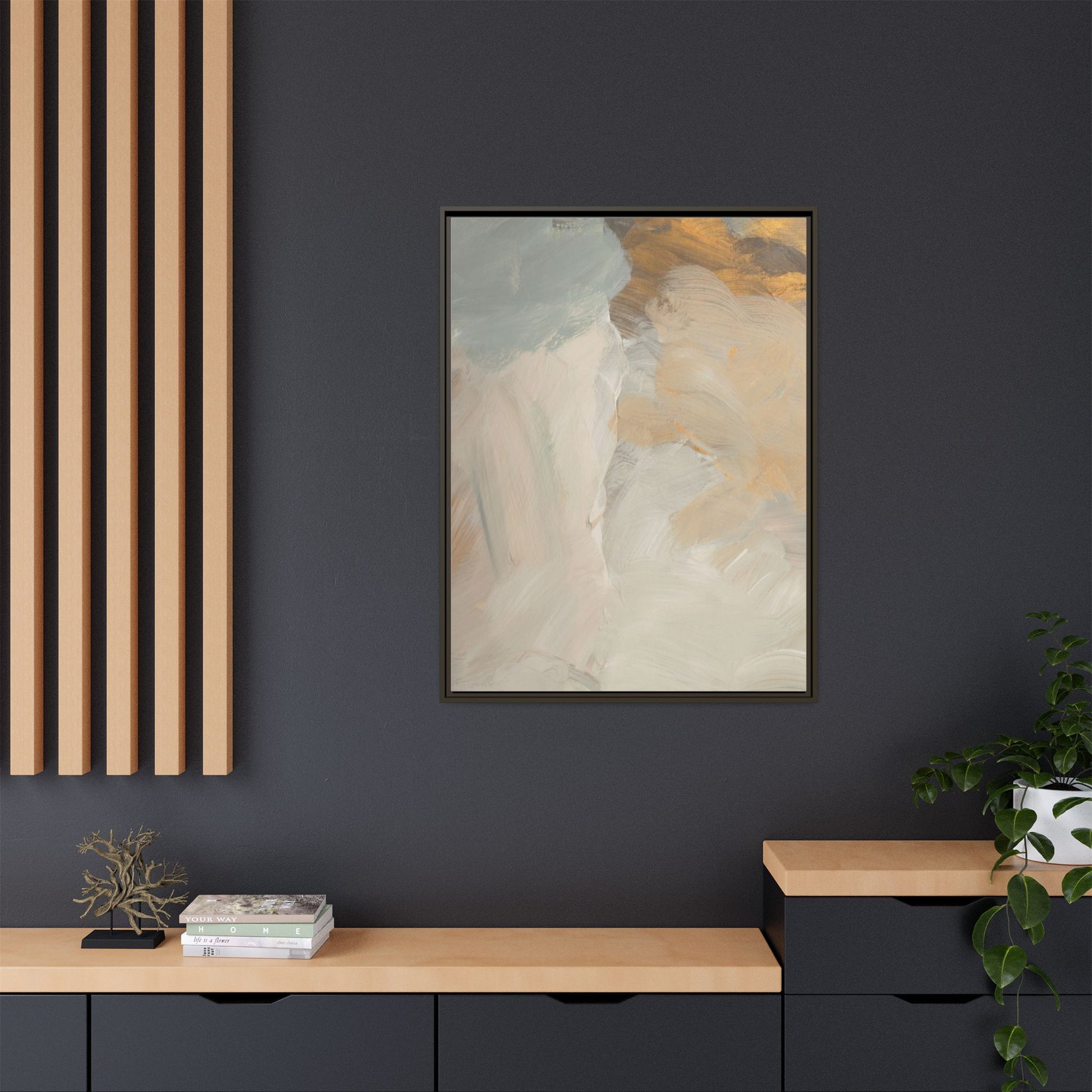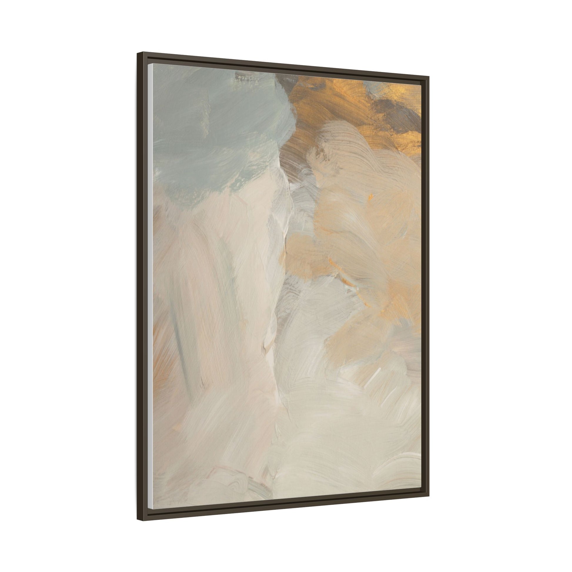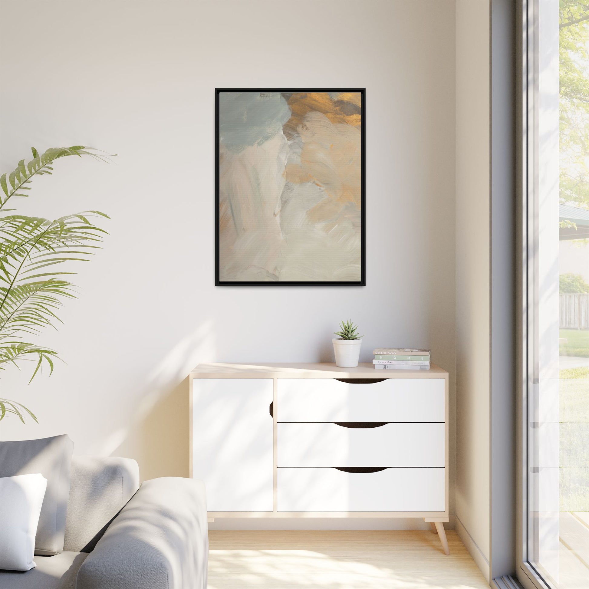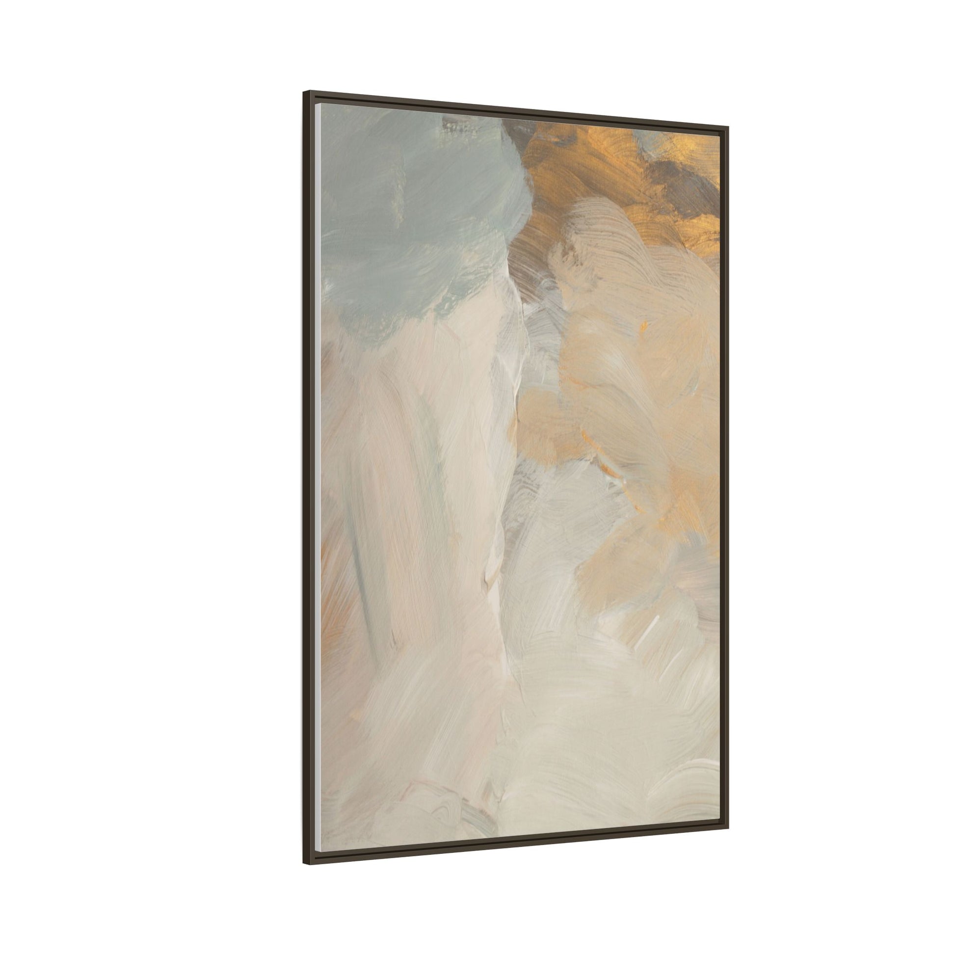 This abstract painting captures a serene landscape with soft, sweeping brushstrokes in muted tones of white, beige, pale blue, and golden ochre. The composition evokes a sense of natural terrain, with layered textures suggesting rolling hills, rocky formations, or coastal landscapes viewed from an aerial perspective. Delicate blending techniques create a sense of depth and movement, with gentle curves and undulating lines that guide the viewer's eye across the canvas. The color palette is subdued and harmonious, featuring gentle transitions between light and warm hues that create a tranquil, ethereal atmosphere. The painting's style appears to be a contemporary interpretation of landscape, blending impressionistic techniques with a more minimalist, abstract approach.