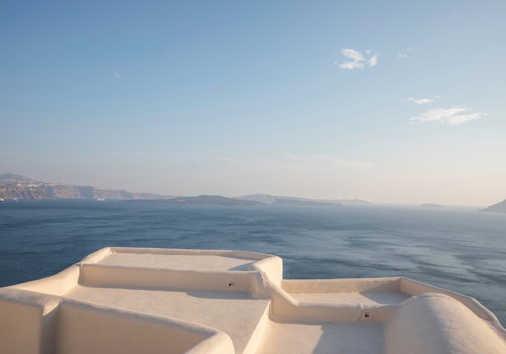 The horizon stretches endlessly, where geometric architecture kisses the boundless sea, under a tranquil sky.