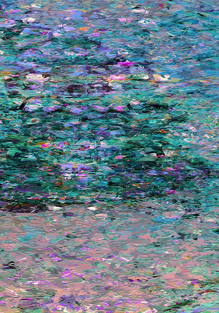 A vibrant dance of turquoise and lavender melds into a tapestry of reflected dreams, where colors ripple like a serene pond in a wild meadow.