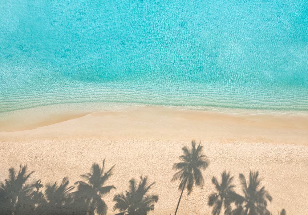 Gentle waves kiss the shore, casting shadows of palm trees over golden sands. An aerial dance between sea and land.