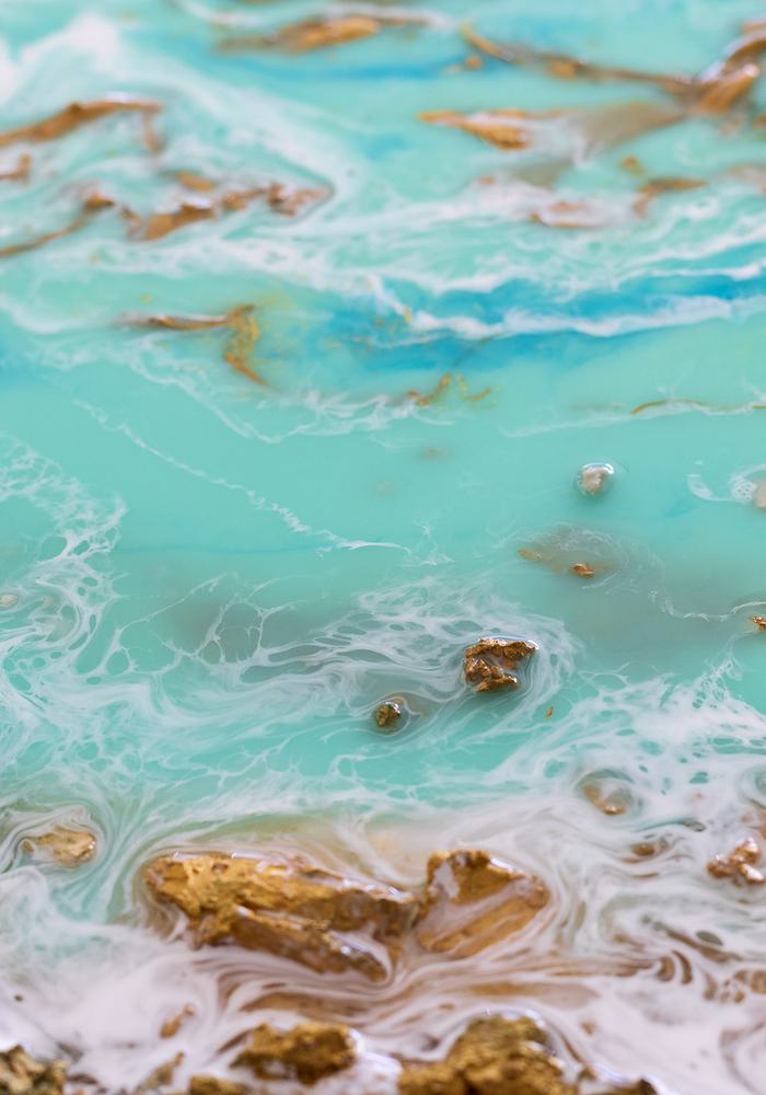A mesmerizing dance of turquoise and gold, where flowing textures mimic the ebb and flow of serene waters. Hints of white add a foamy elegance, capturing an ethereal marine landscape.