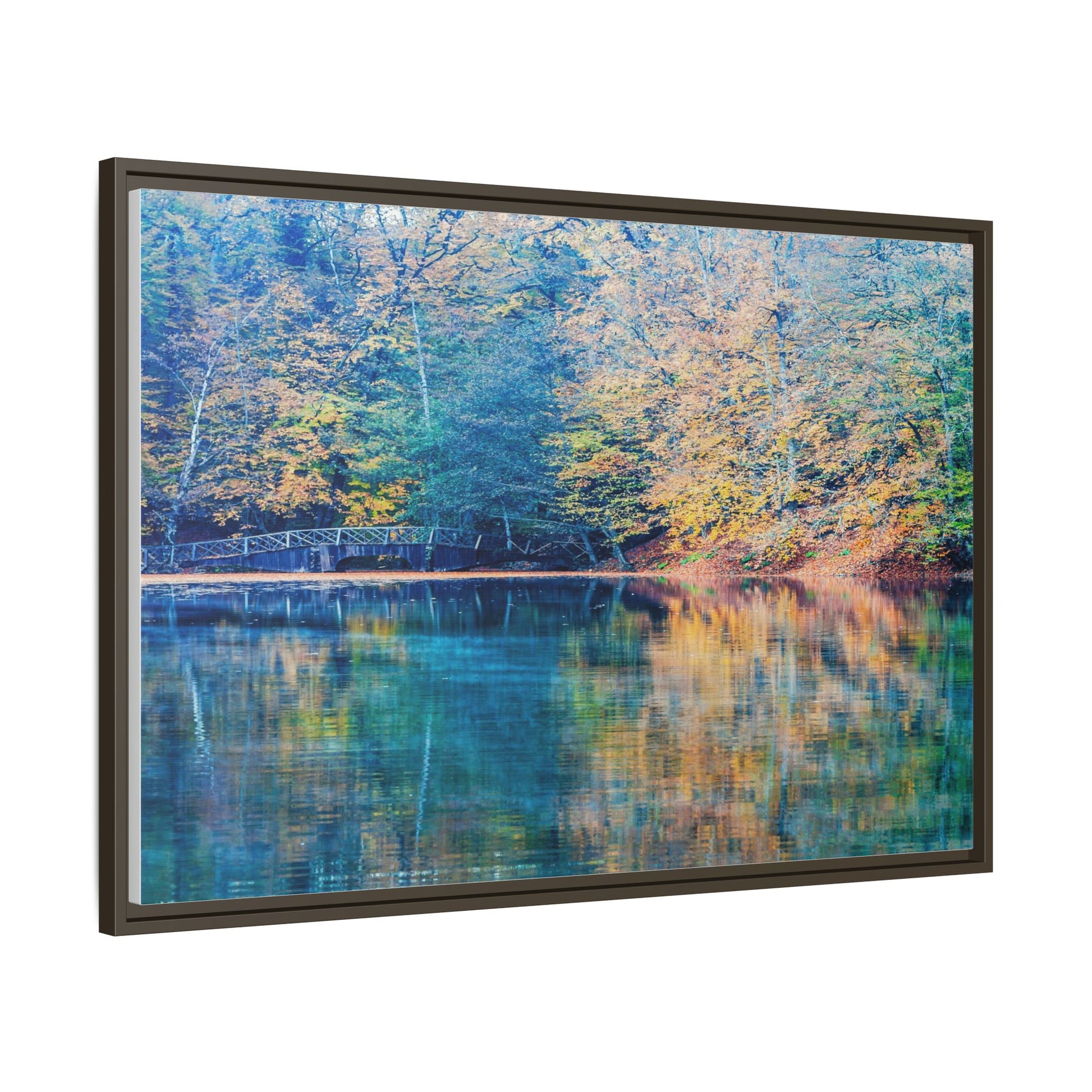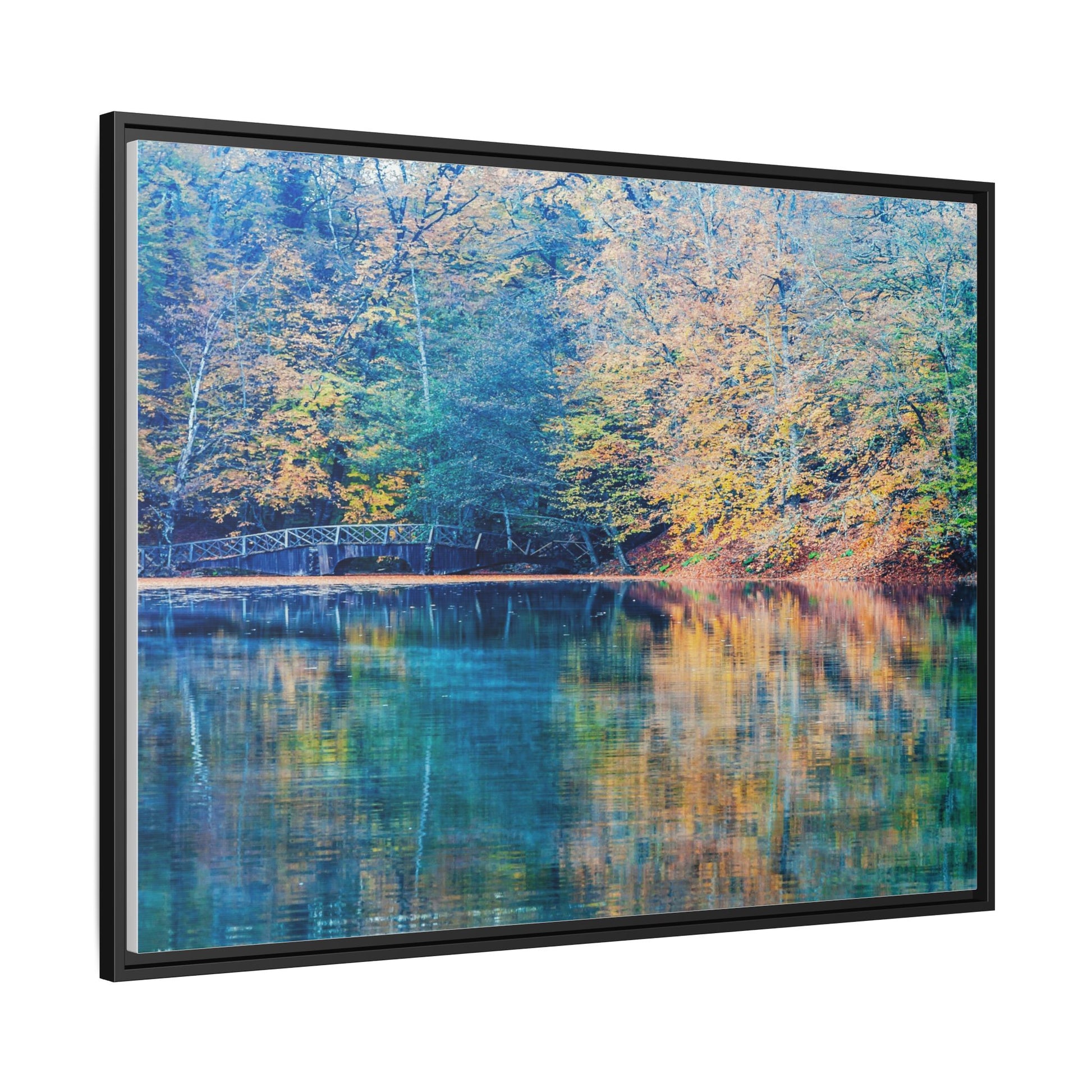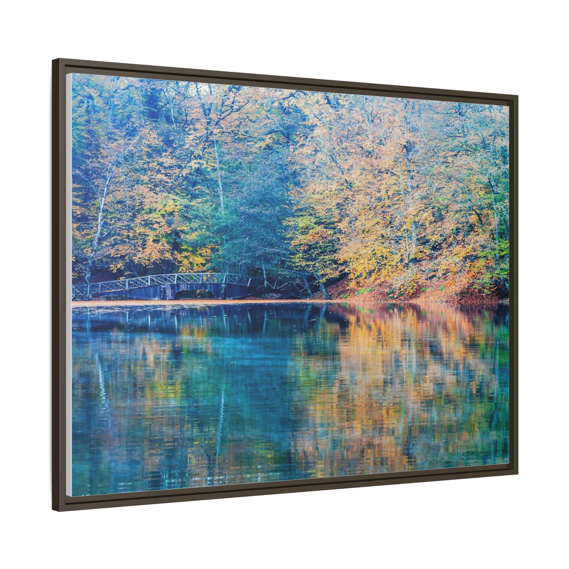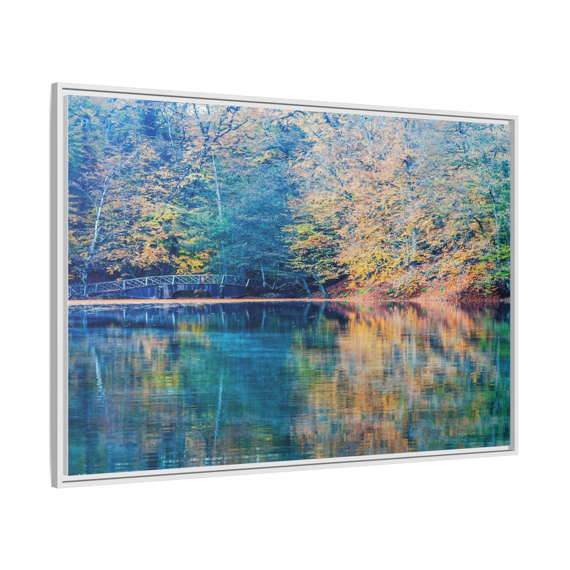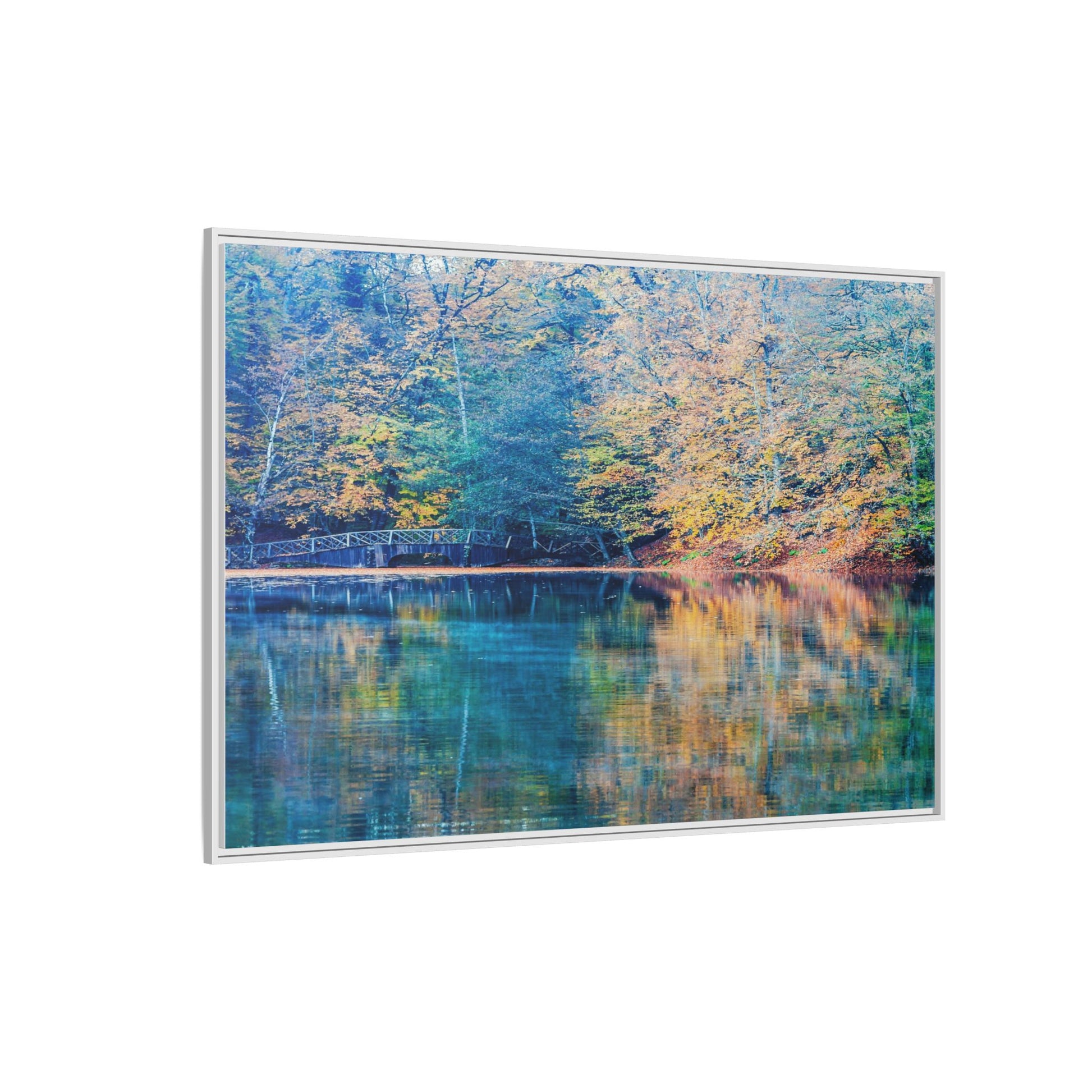 Immerse yourself in this breathtaking autumn landscape featuring a serene lake reflecting the vibrant fall foliage with stunning clarity. The image captures a picturesque wooden bridge nestled among trees adorned in golden, green, and amber hues, creating a mesmerizing color palette that shifts between cool blue and warm orange tones. The water's surface acts like a perfect mirror, doubling the scenic beauty and creating a symmetrical composition that blends the forest's natural textures with ethereal color reflections. Intricate tree branches frame the scene, while the delicate bridge provides a subtle human-made element that enhances the natural landscape's tranquil atmosphere. The photograph's high-definition quality and carefully balanced color spectrum transform this woodland scene into a dreamlike visual experience that captures the magical essence of autumn.