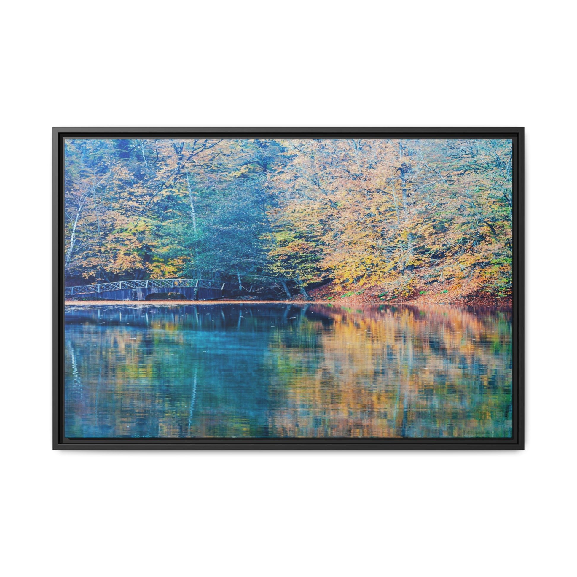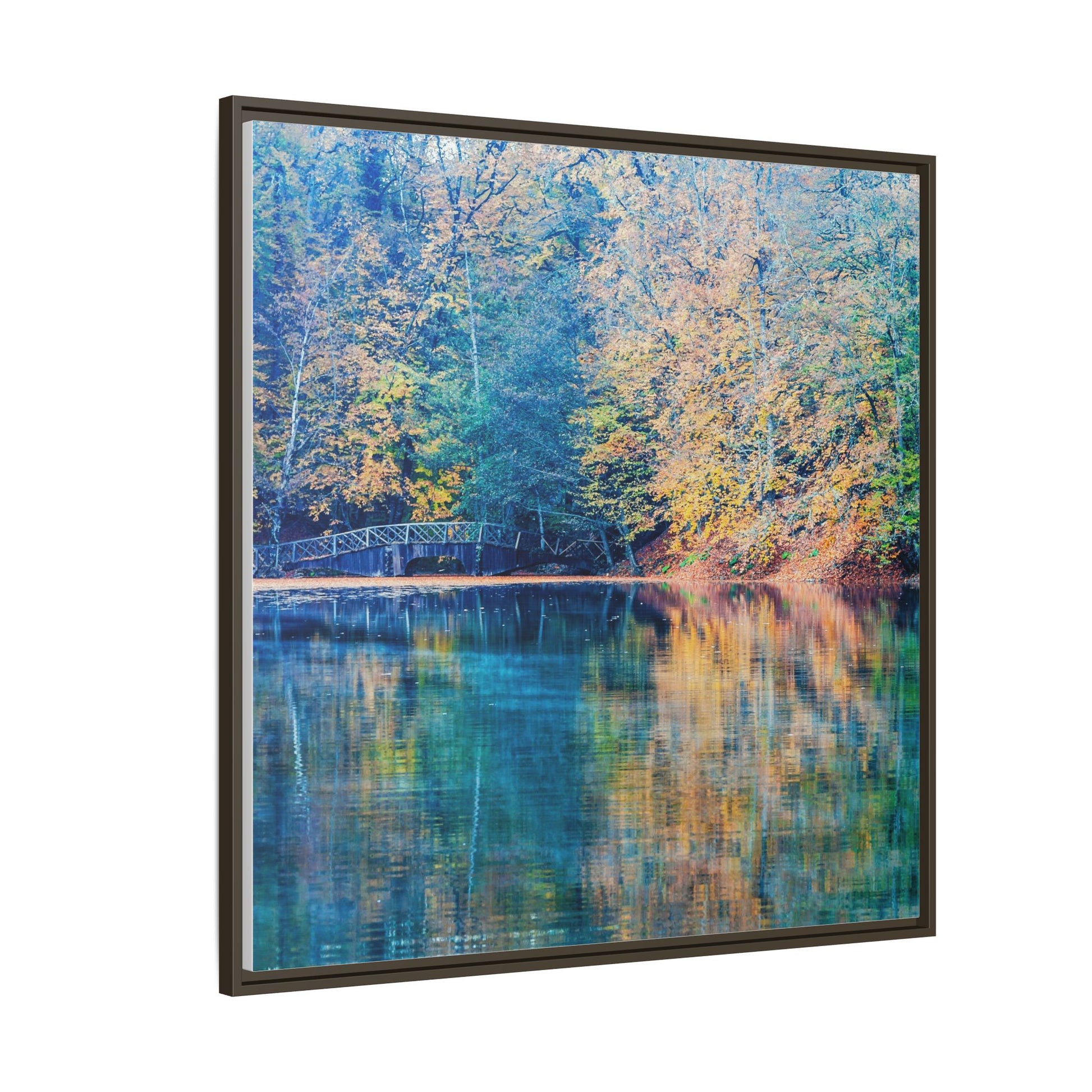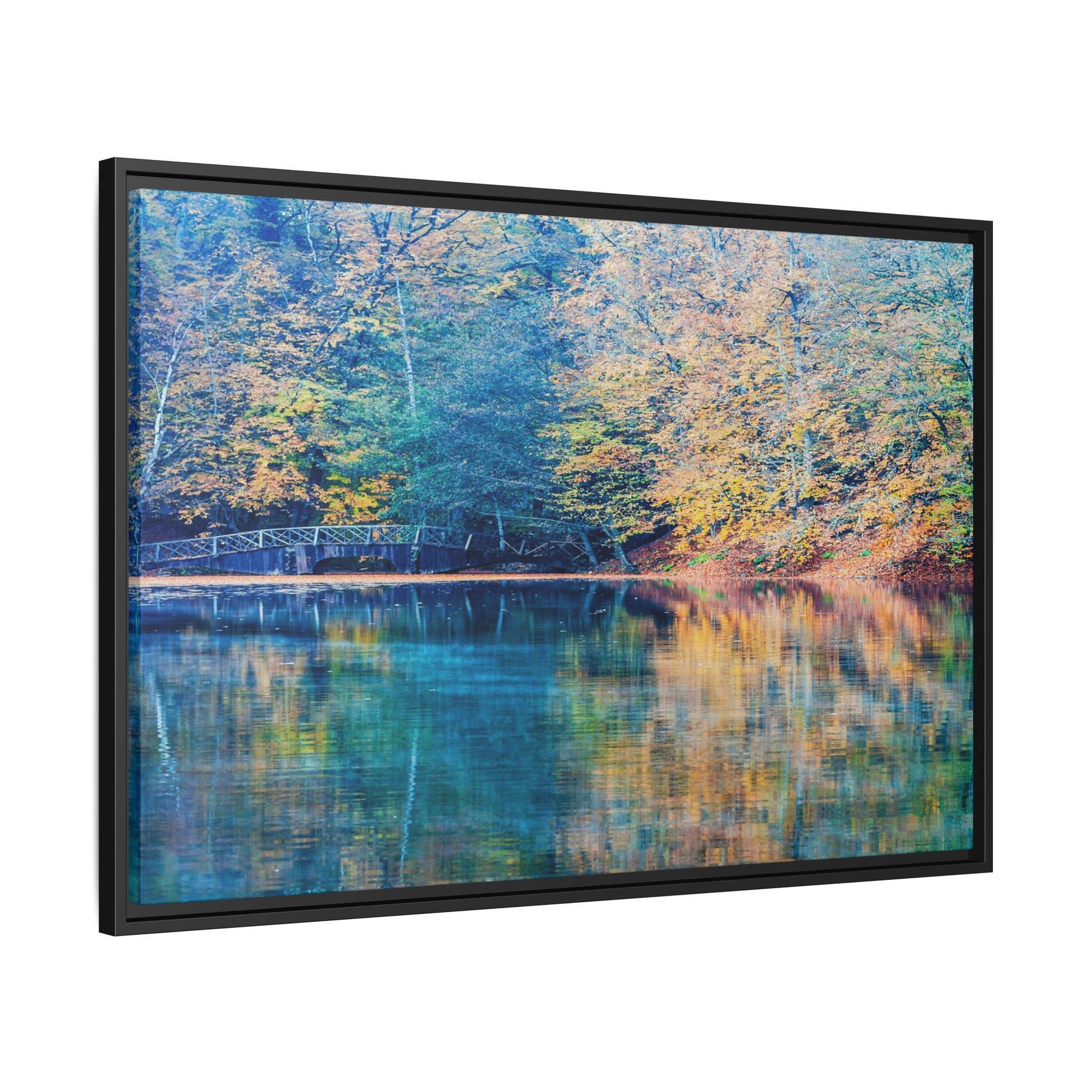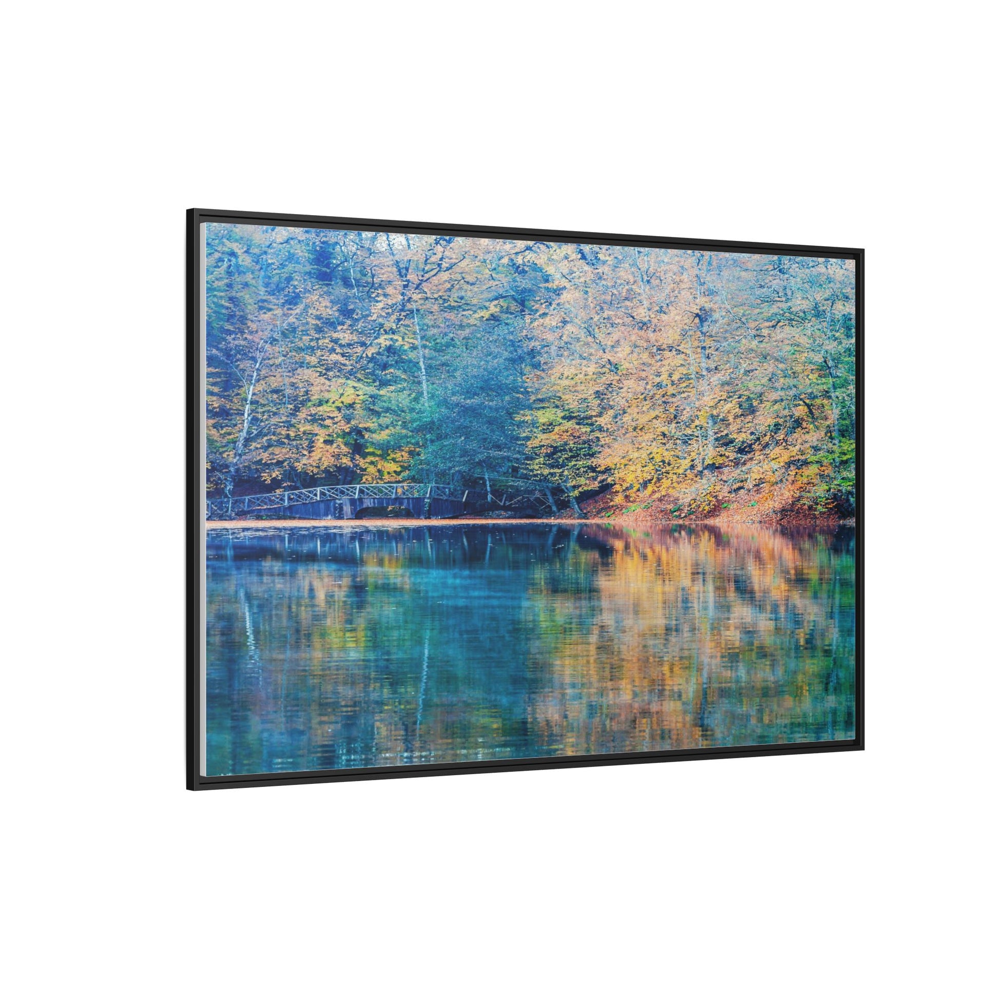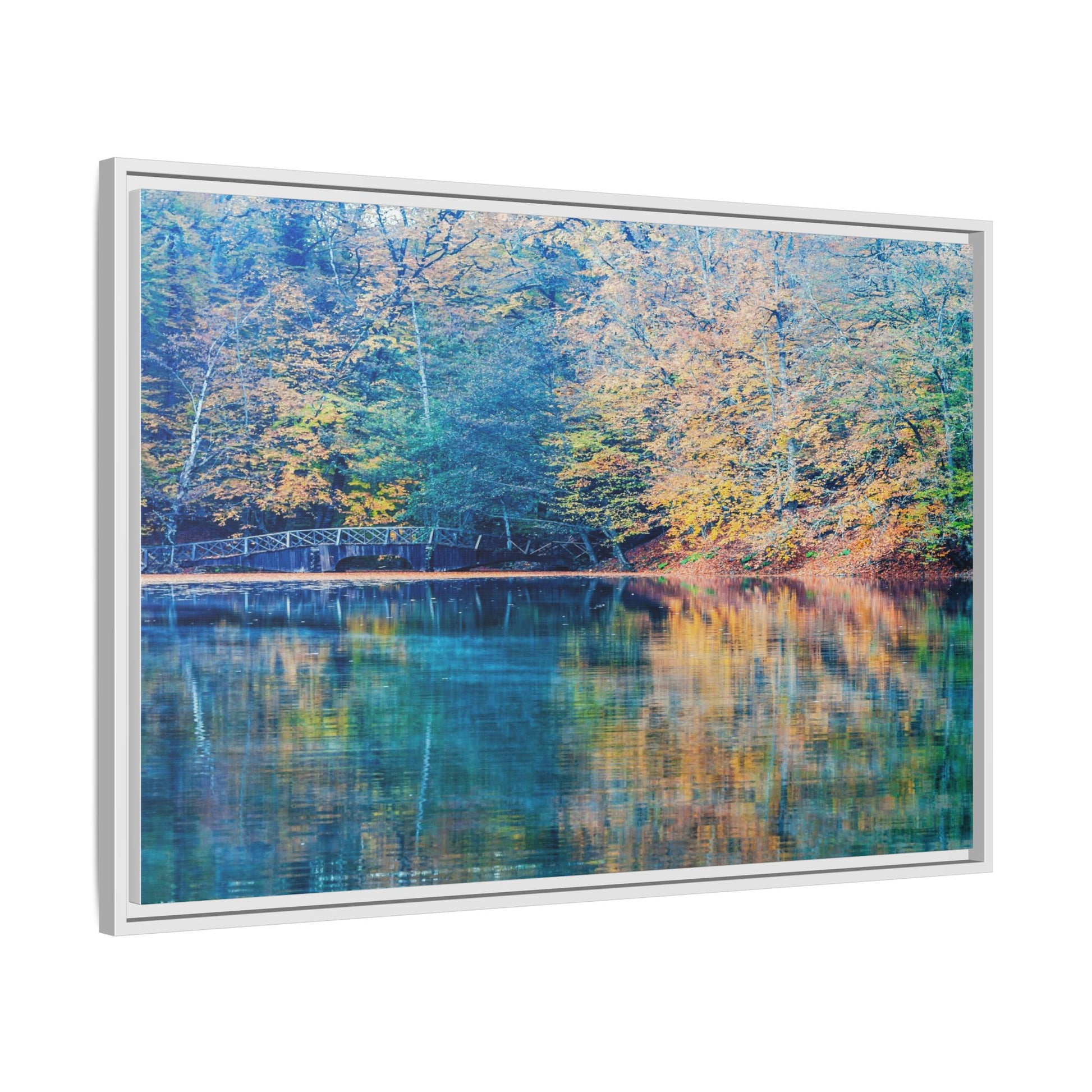Immerse yourself in this breathtaking autumn landscape featuring a serene lake reflecting the vibrant fall foliage with stunning clarity. The image captures a picturesque wooden bridge nestled among trees adorned in golden, green, and amber hues, creating a mesmerizing color palette that shifts between cool blue and warm orange tones. The water's surface acts like a perfect mirror, doubling the scenic beauty and creating a symmetrical composition that blends the forest's natural textures with ethereal color reflections. Intricate tree branches frame the scene, while the delicate bridge provides a subtle human-made element that enhances the natural landscape's tranquil atmosphere. The photograph's high-definition quality and carefully balanced color spectrum transform this woodland scene into a dreamlike visual experience that captures the magical essence of autumn.