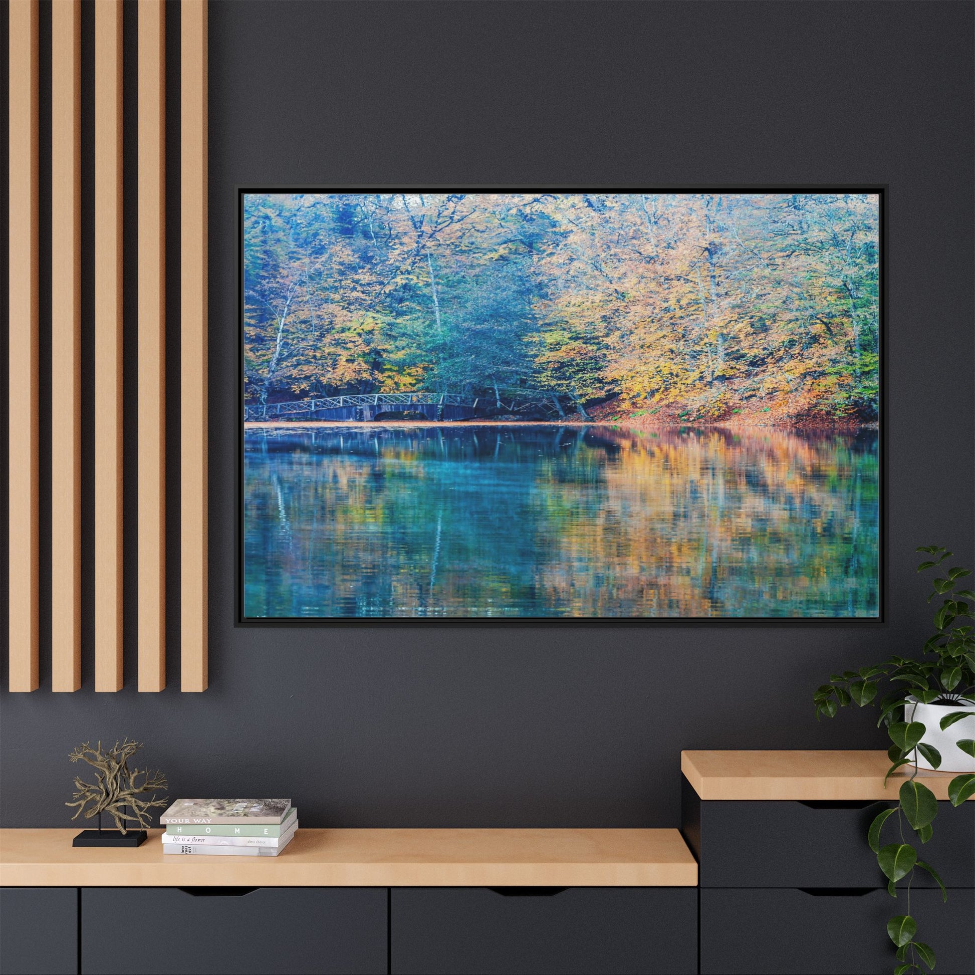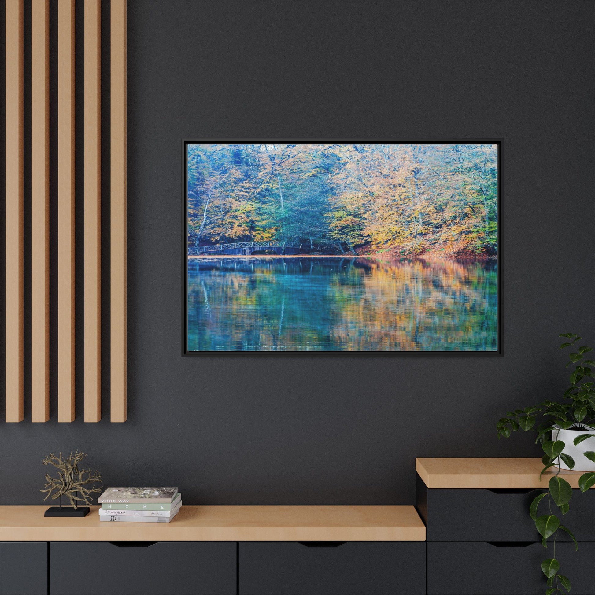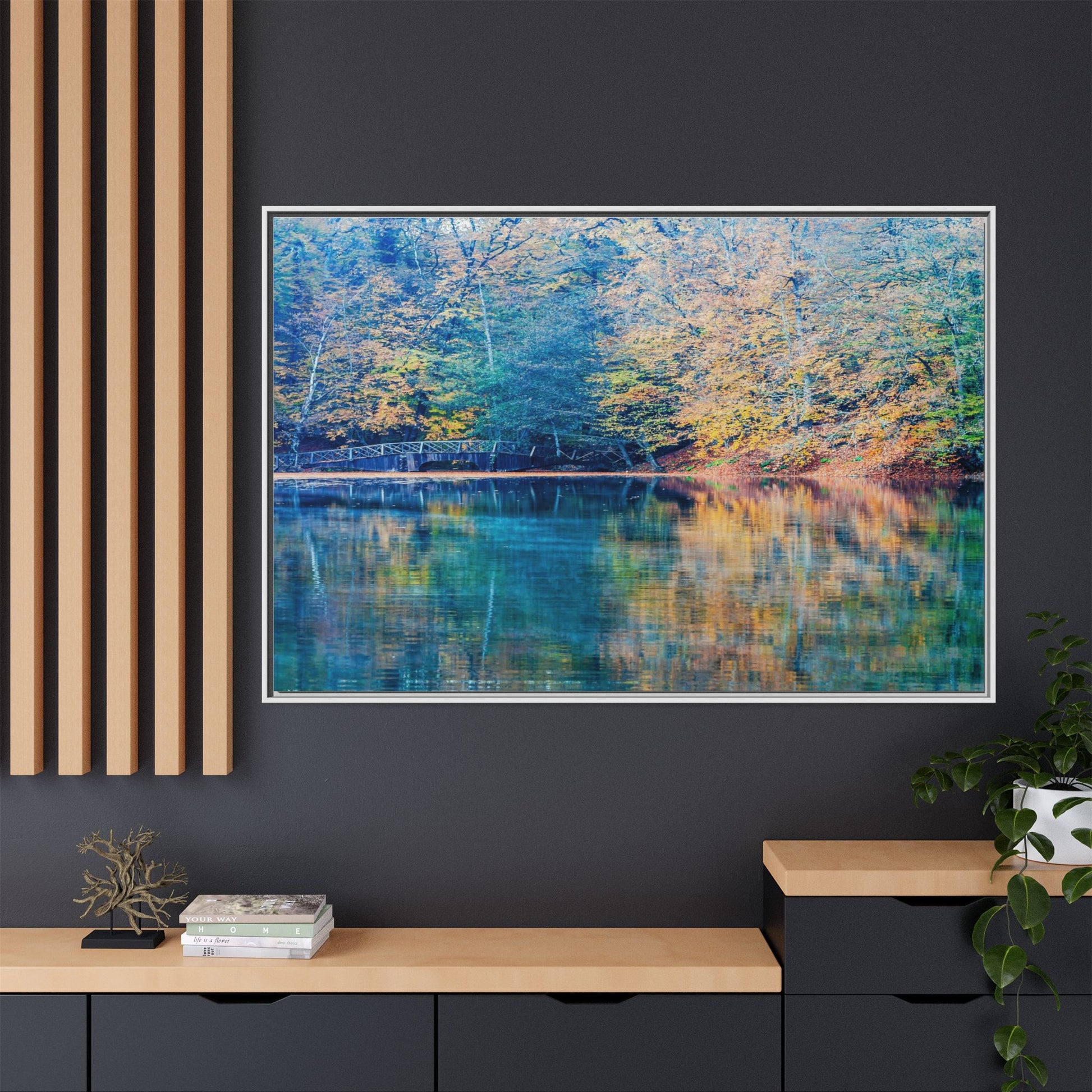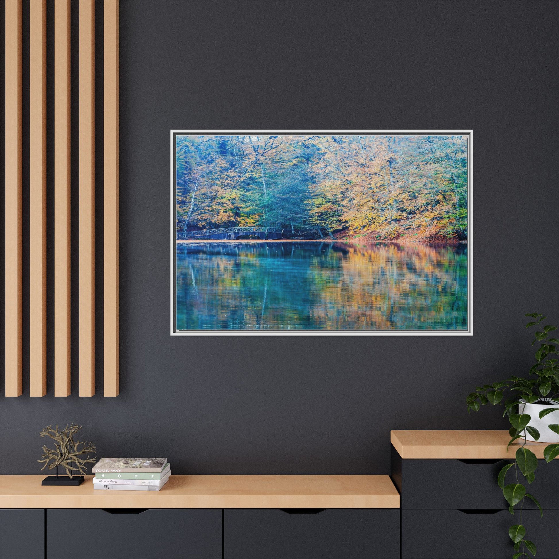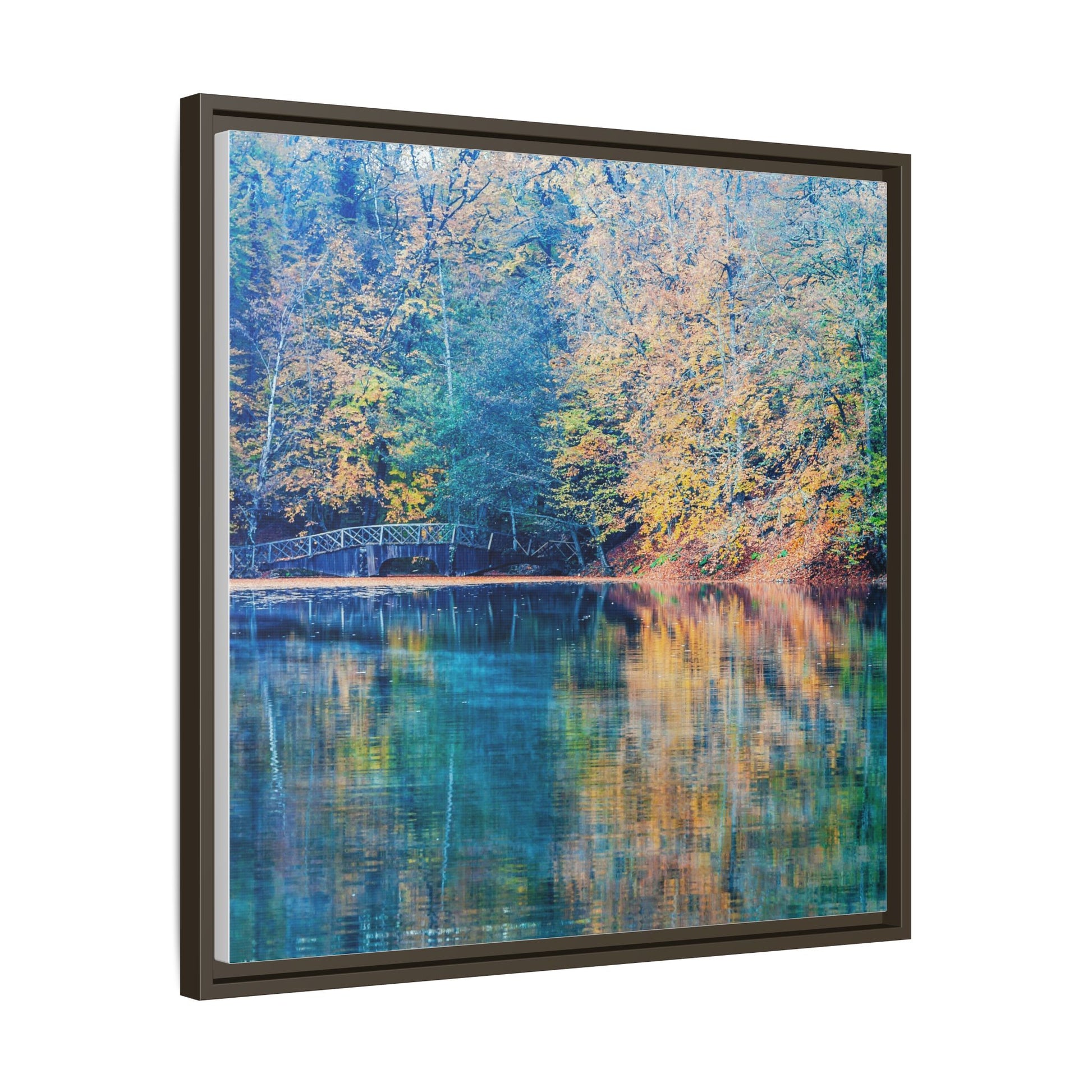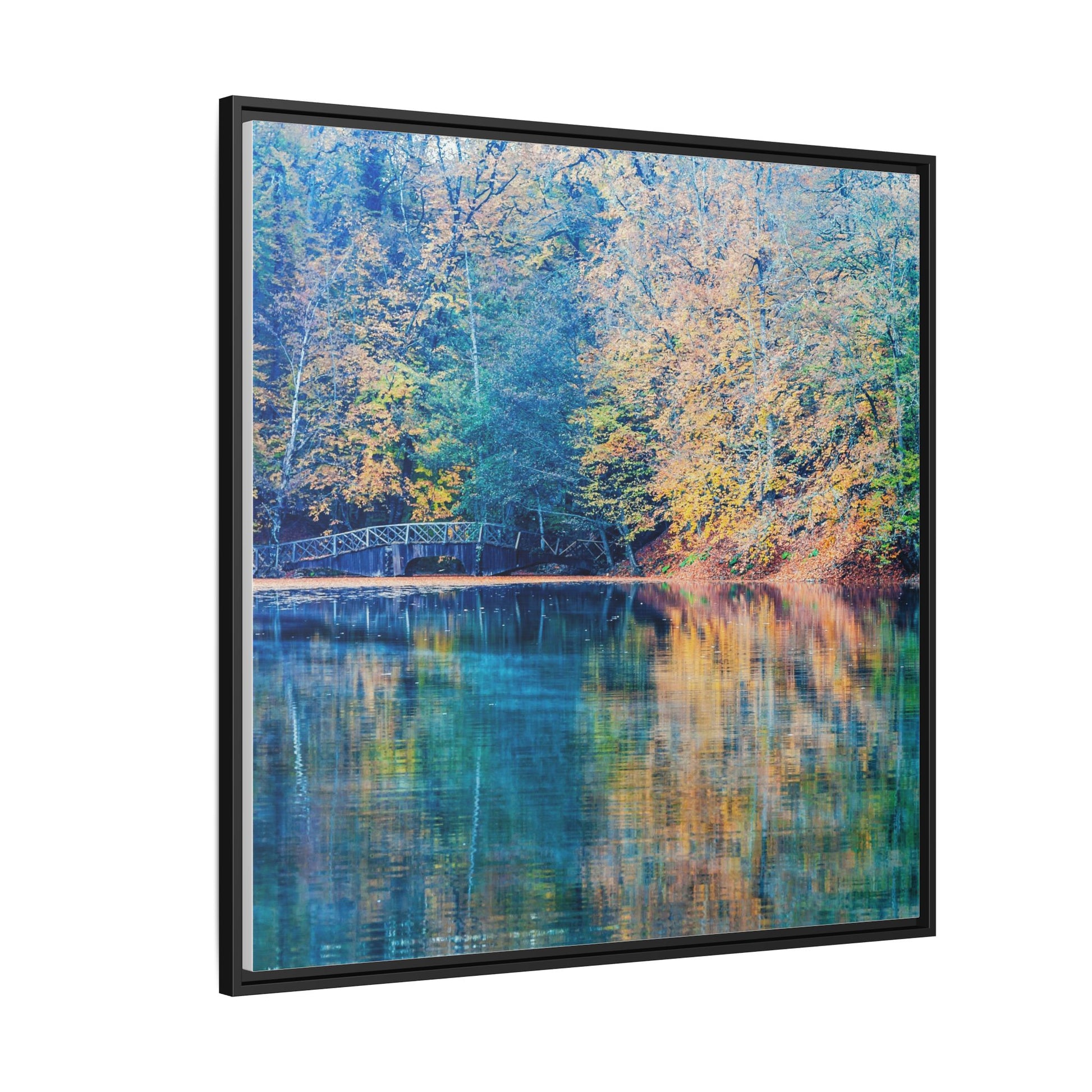 Immerse yourself in this breathtaking autumn landscape featuring a serene lake reflecting the vibrant fall foliage with stunning clarity. The image captures a picturesque wooden bridge nestled among trees adorned in golden, green, and amber hues, creating a mesmerizing color palette that shifts between cool blue and warm orange tones. The water's surface acts like a perfect mirror, doubling the scenic beauty and creating a symmetrical composition that blends the forest's natural textures with ethereal color reflections. Intricate tree branches frame the scene, while the delicate bridge provides a subtle human-made element that enhances the natural landscape's tranquil atmosphere. The photograph's high-definition quality and carefully balanced color spectrum transform this woodland scene into a dreamlike visual experience that captures the magical essence of autumn.