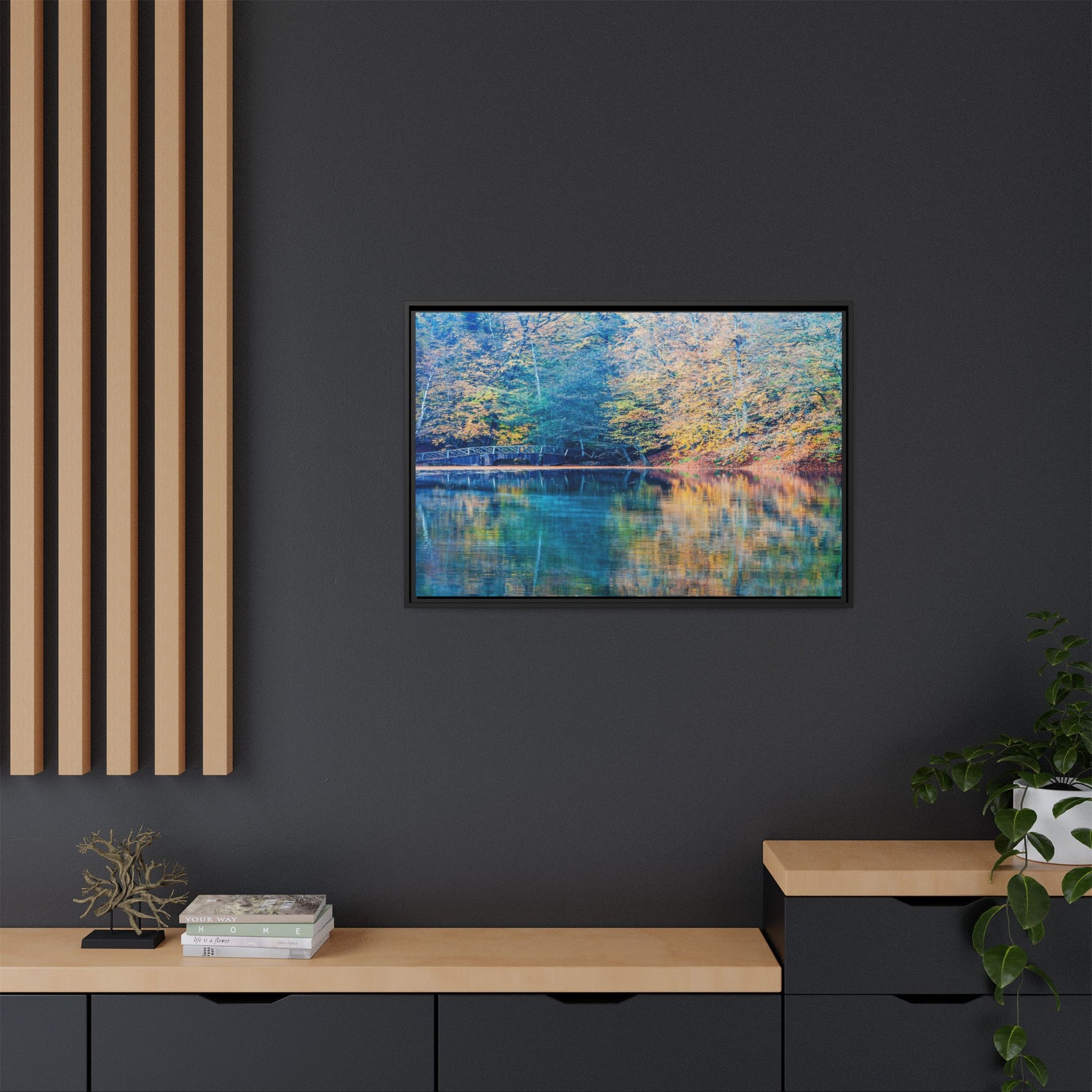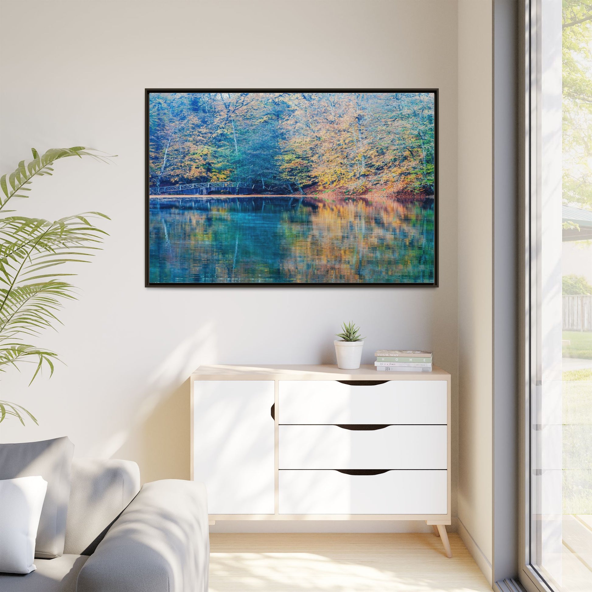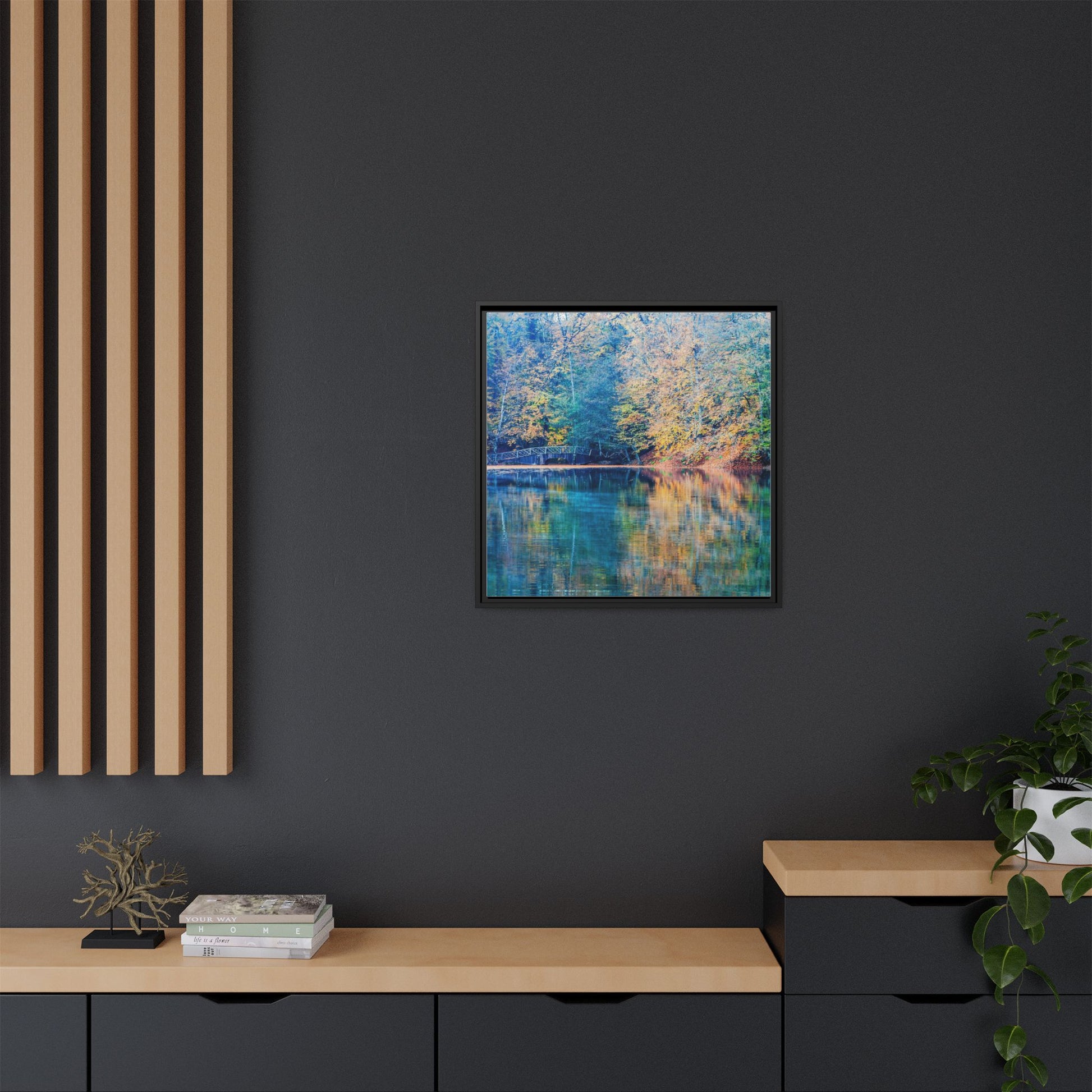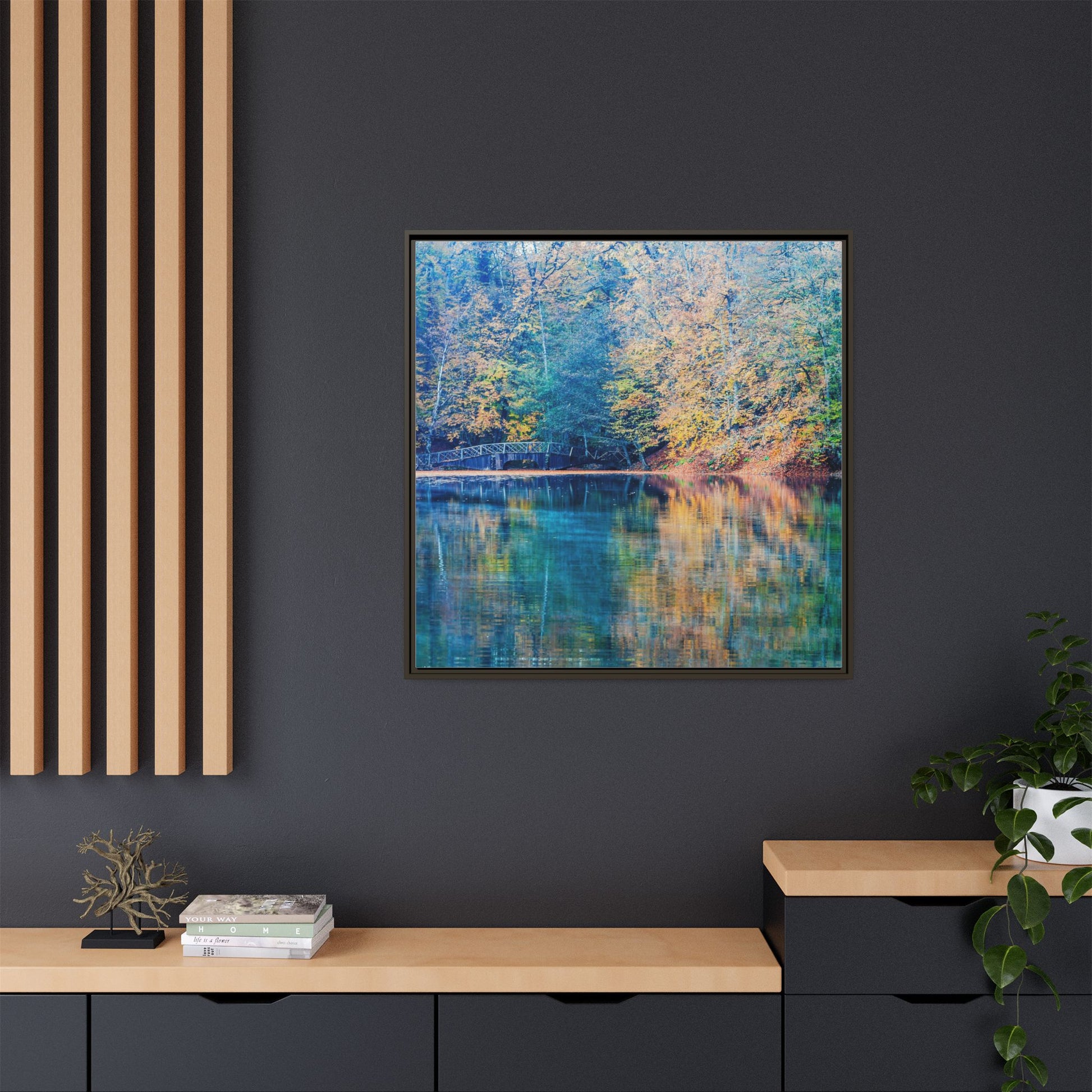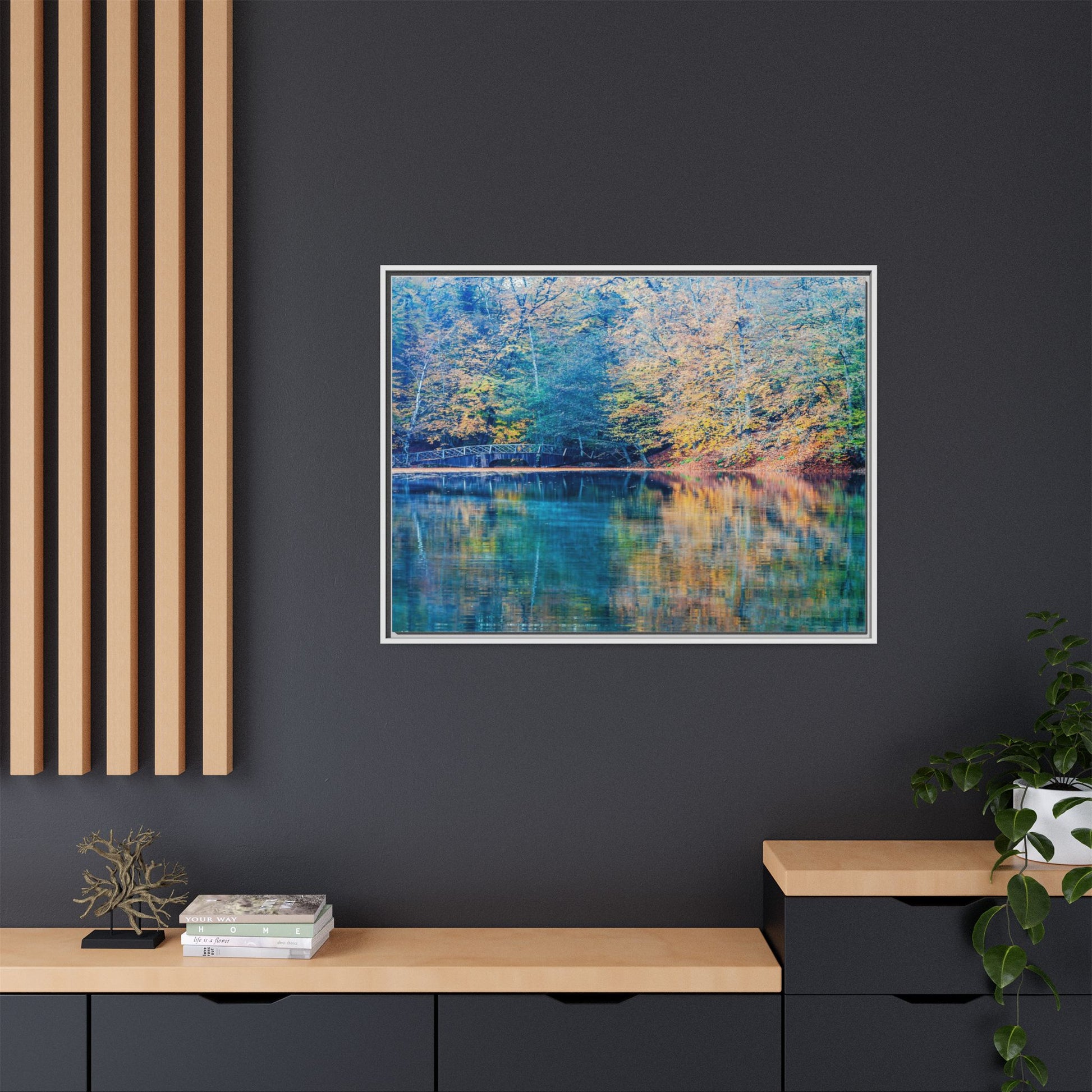 Immerse yourself in this breathtaking autumn landscape featuring a serene lake reflecting the vibrant fall foliage with stunning clarity. The image captures a picturesque wooden bridge nestled among trees adorned in golden, green, and amber hues, creating a mesmerizing color palette that shifts between cool blue and warm orange tones. The water's surface acts like a perfect mirror, doubling the scenic beauty and creating a symmetrical composition that blends the forest's natural textures with ethereal color reflections. Intricate tree branches frame the scene, while the delicate bridge provides a subtle human-made element that enhances the natural landscape's tranquil atmosphere. The photograph's high-definition quality and carefully balanced color spectrum transform this woodland scene into a dreamlike visual experience that captures the magical essence of autumn.