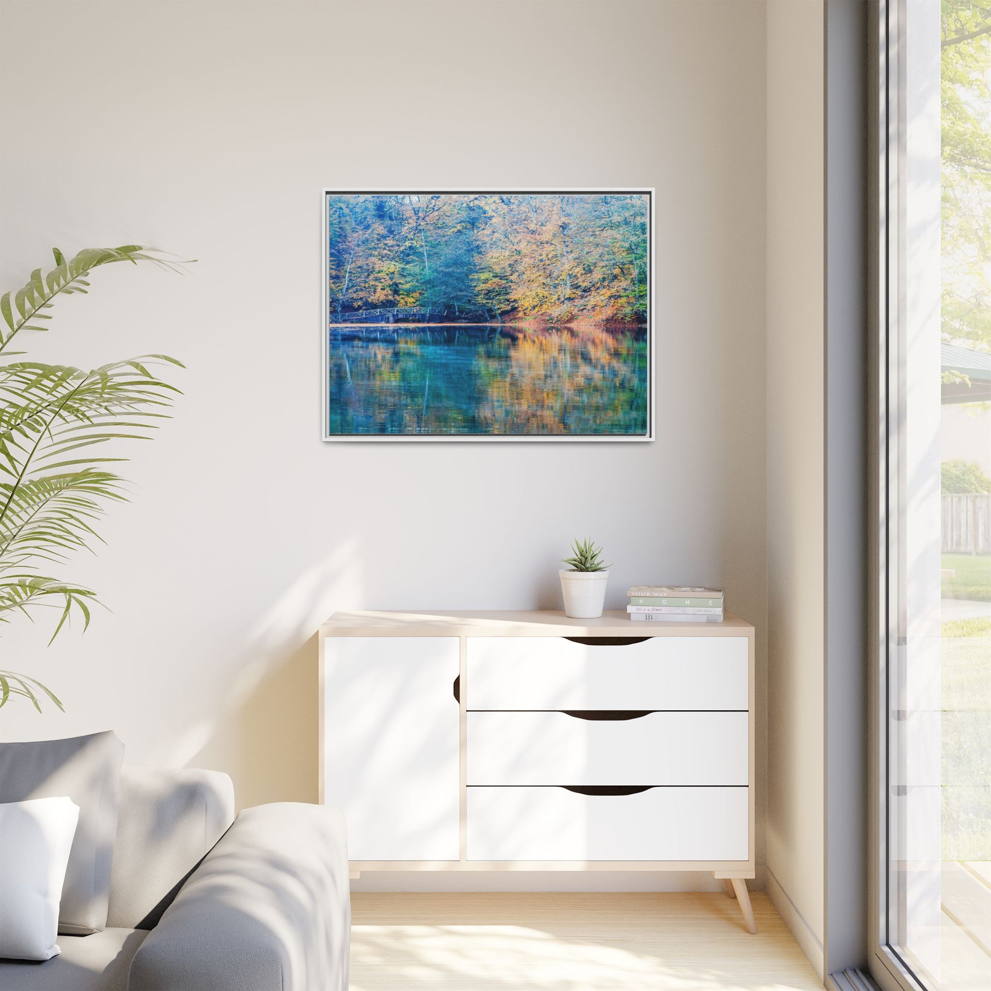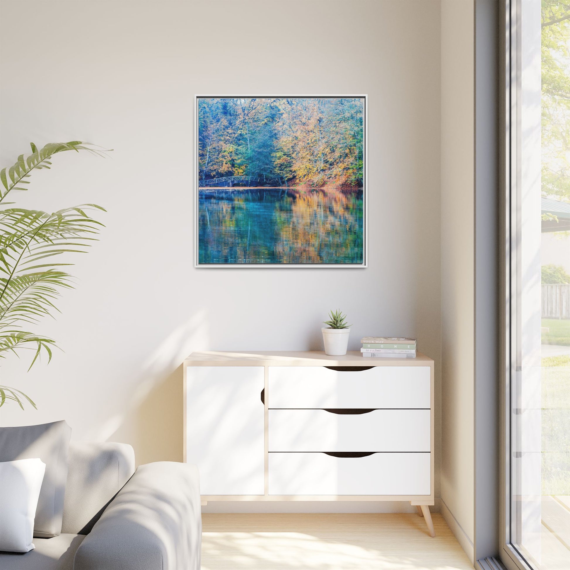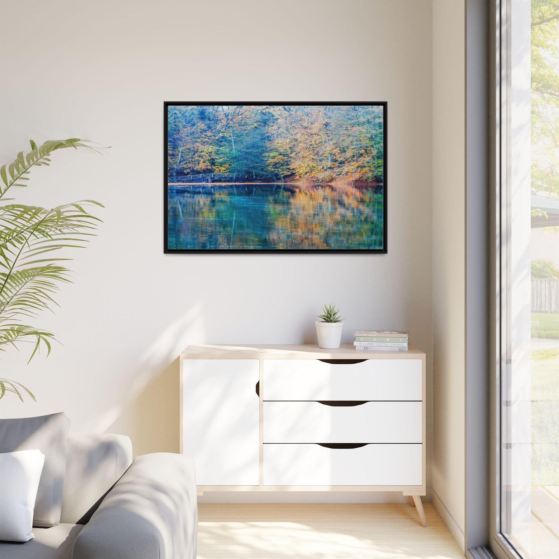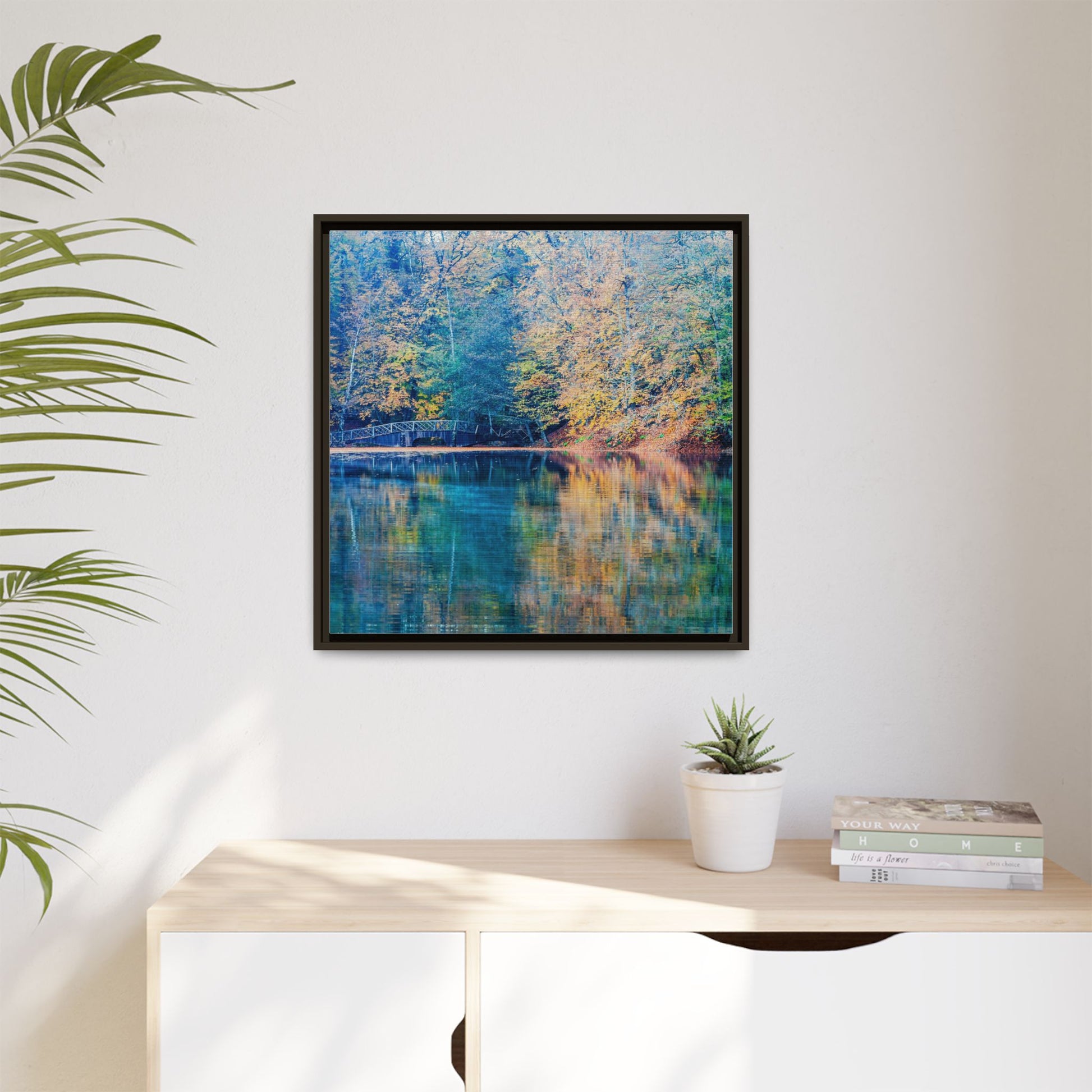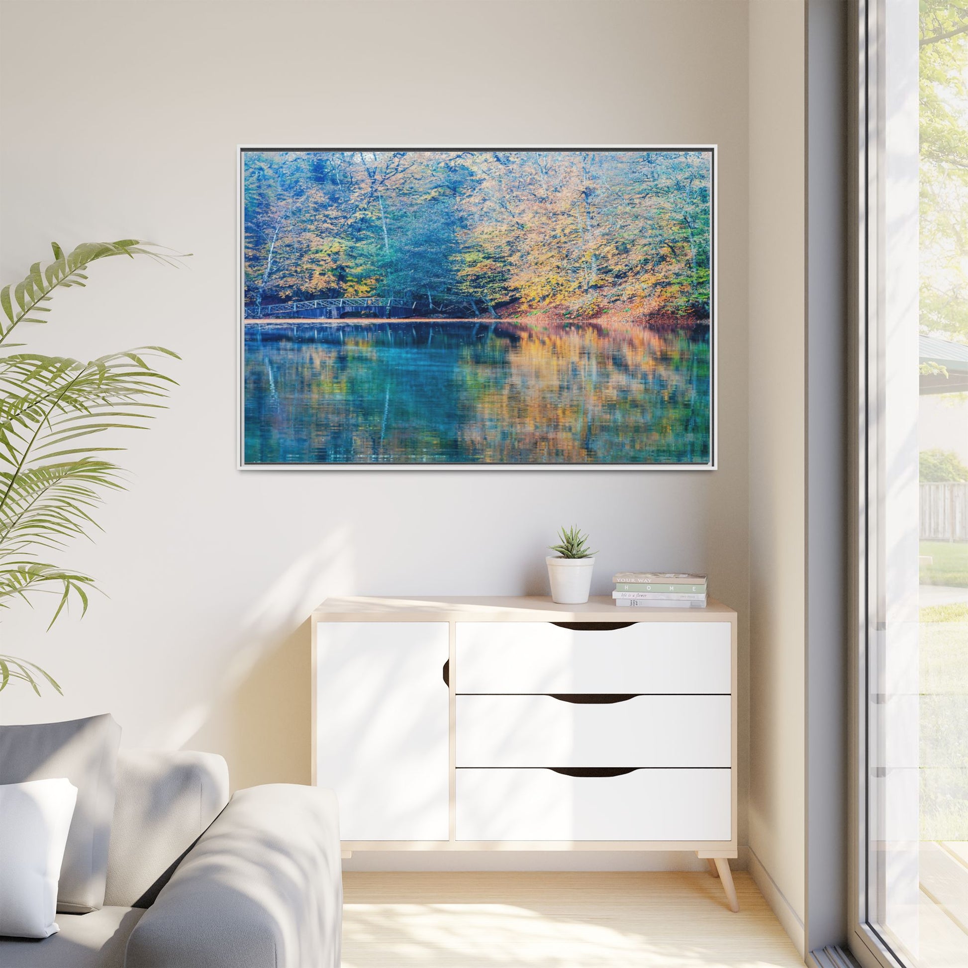 Immerse yourself in this breathtaking autumn landscape featuring a serene lake reflecting the vibrant fall foliage with stunning clarity. The image captures a picturesque wooden bridge nestled among trees adorned in golden, green, and amber hues, creating a mesmerizing color palette that shifts between cool blue and warm orange tones. The water's surface acts like a perfect mirror, doubling the scenic beauty and creating a symmetrical composition that blends the forest's natural textures with ethereal color reflections. Intricate tree branches frame the scene, while the delicate bridge provides a subtle human-made element that enhances the natural landscape's tranquil atmosphere. The photograph's high-definition quality and carefully balanced color spectrum transform this woodland scene into a dreamlike visual experience that captures the magical essence of autumn.