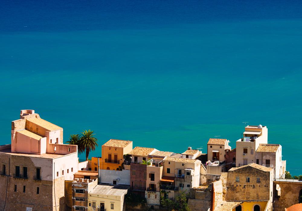 A coastal village basks under a luminous sky, where terracotta rooftops and pastel walls blend into the tranquil blue sea, painting a serene portrait of harmonious existence.