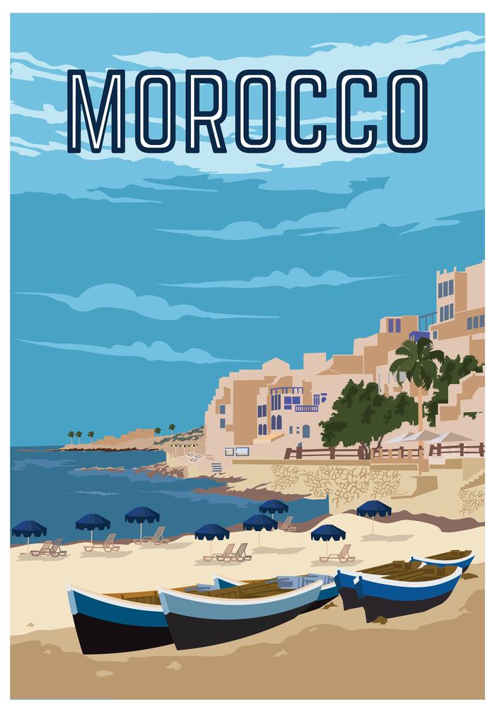 This artwork captures the tranquil essence of a coastal Moroccan scene, where sunlit sands meet the embracing blue of the sea. Gentle waves kiss the shore as boats rest in anticipation.