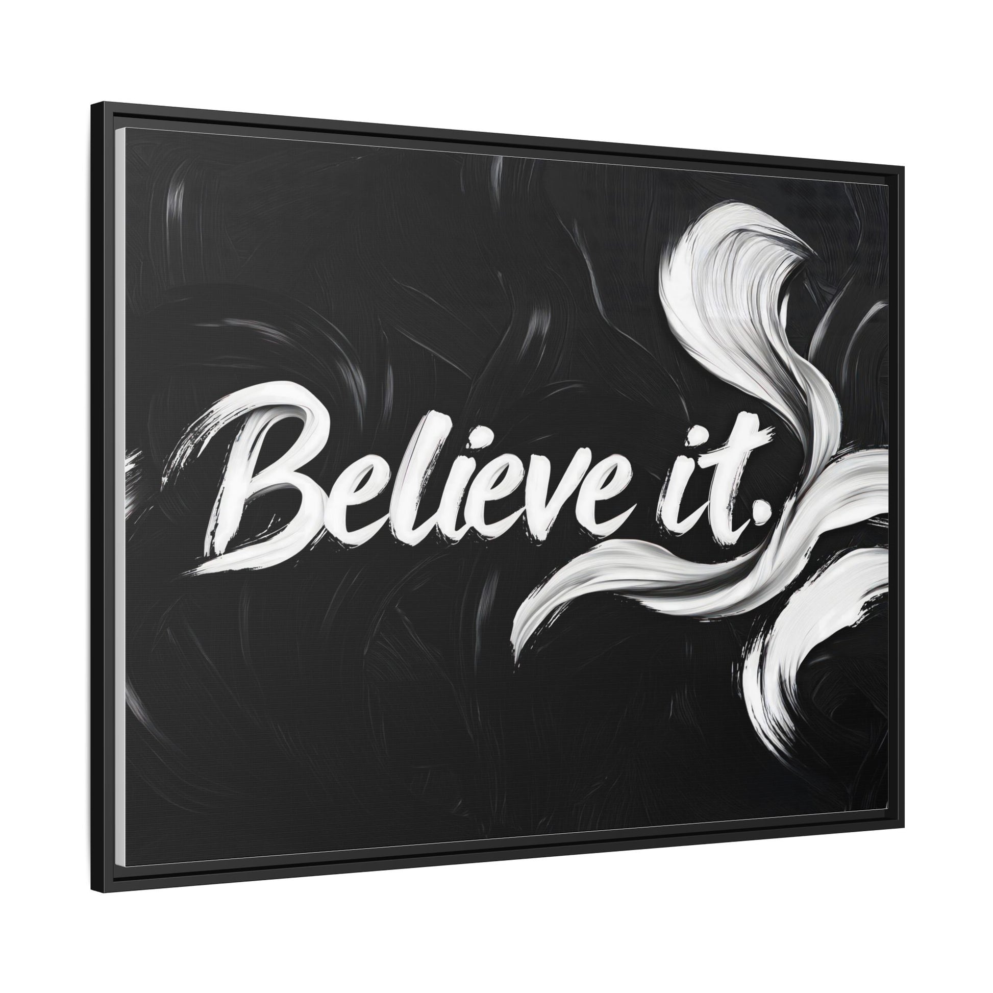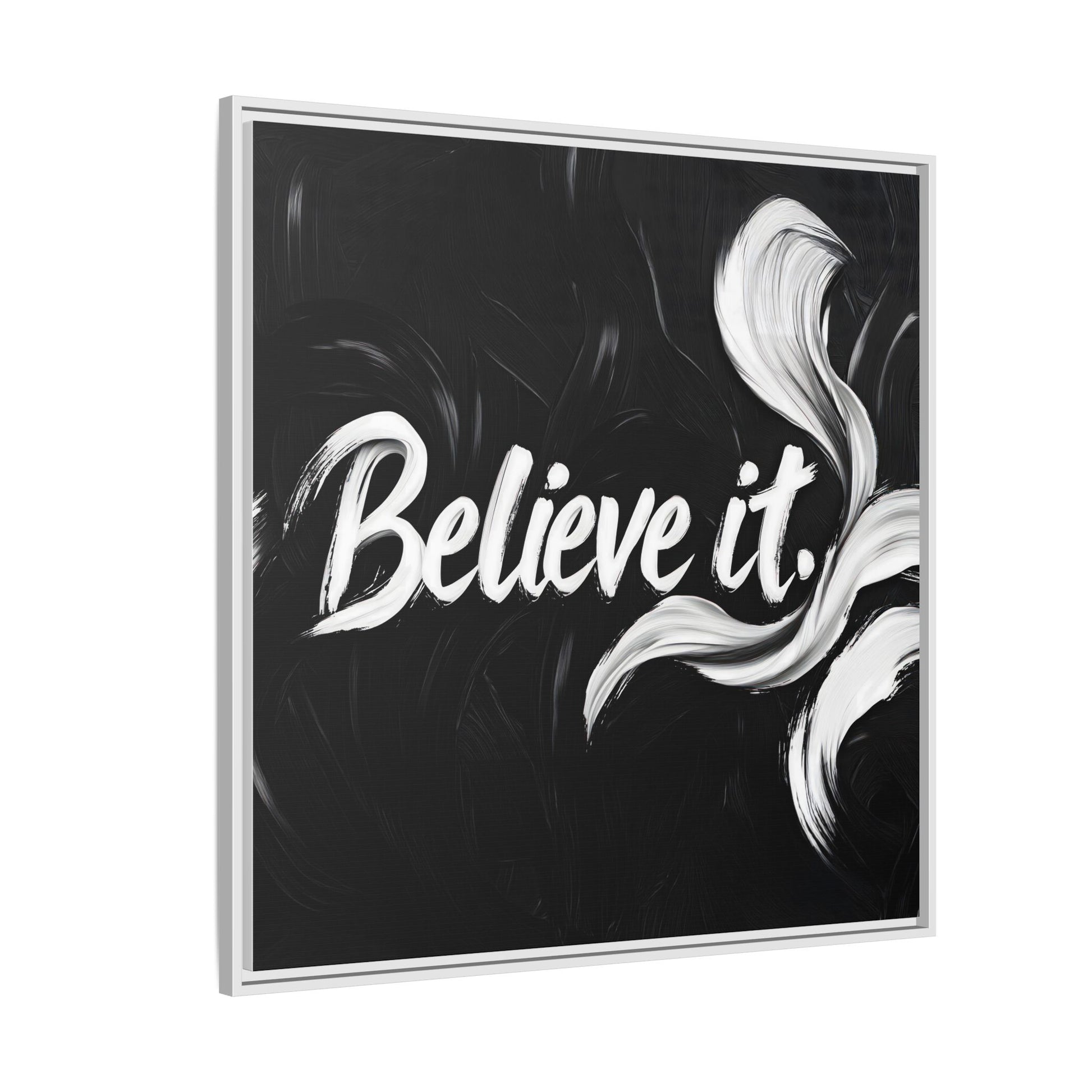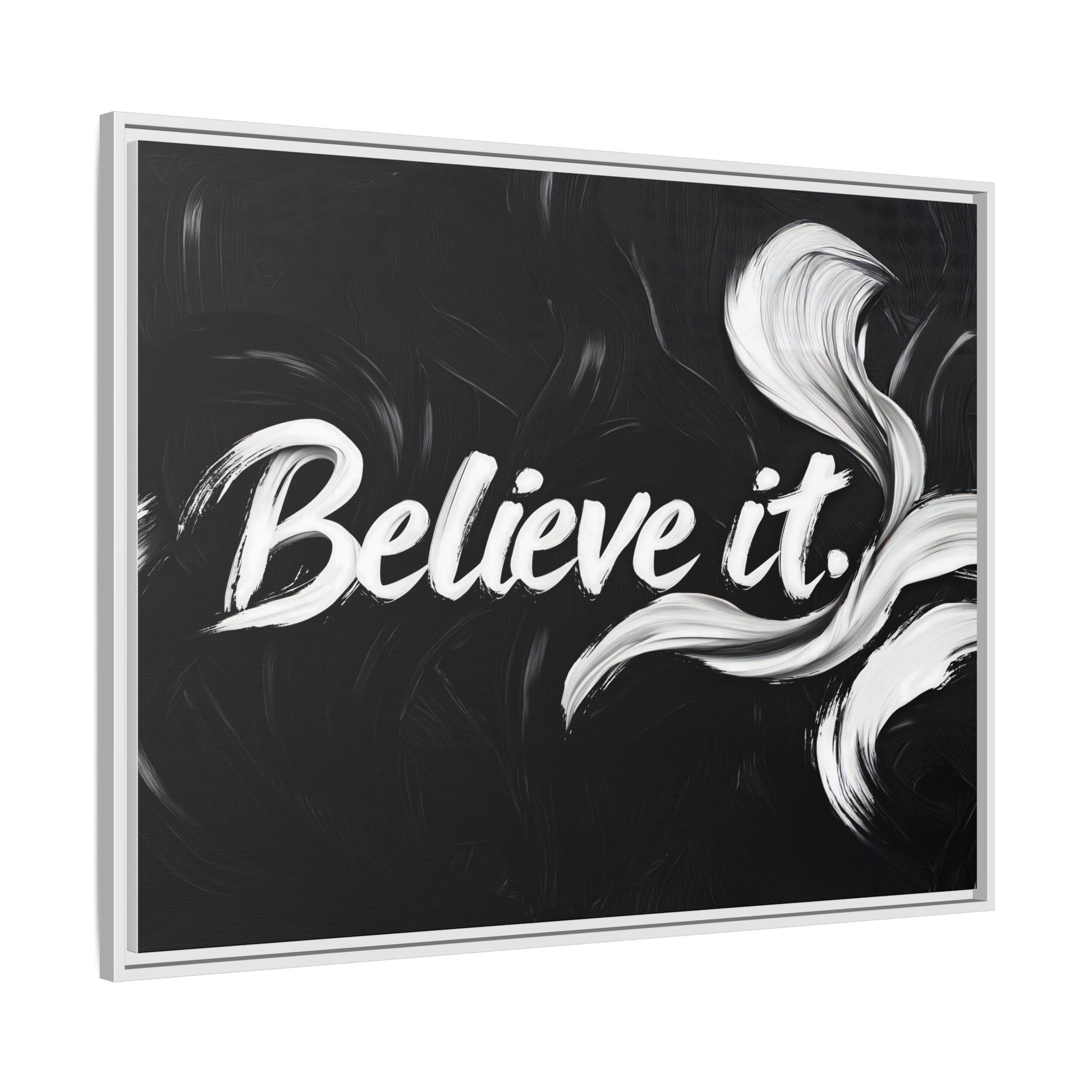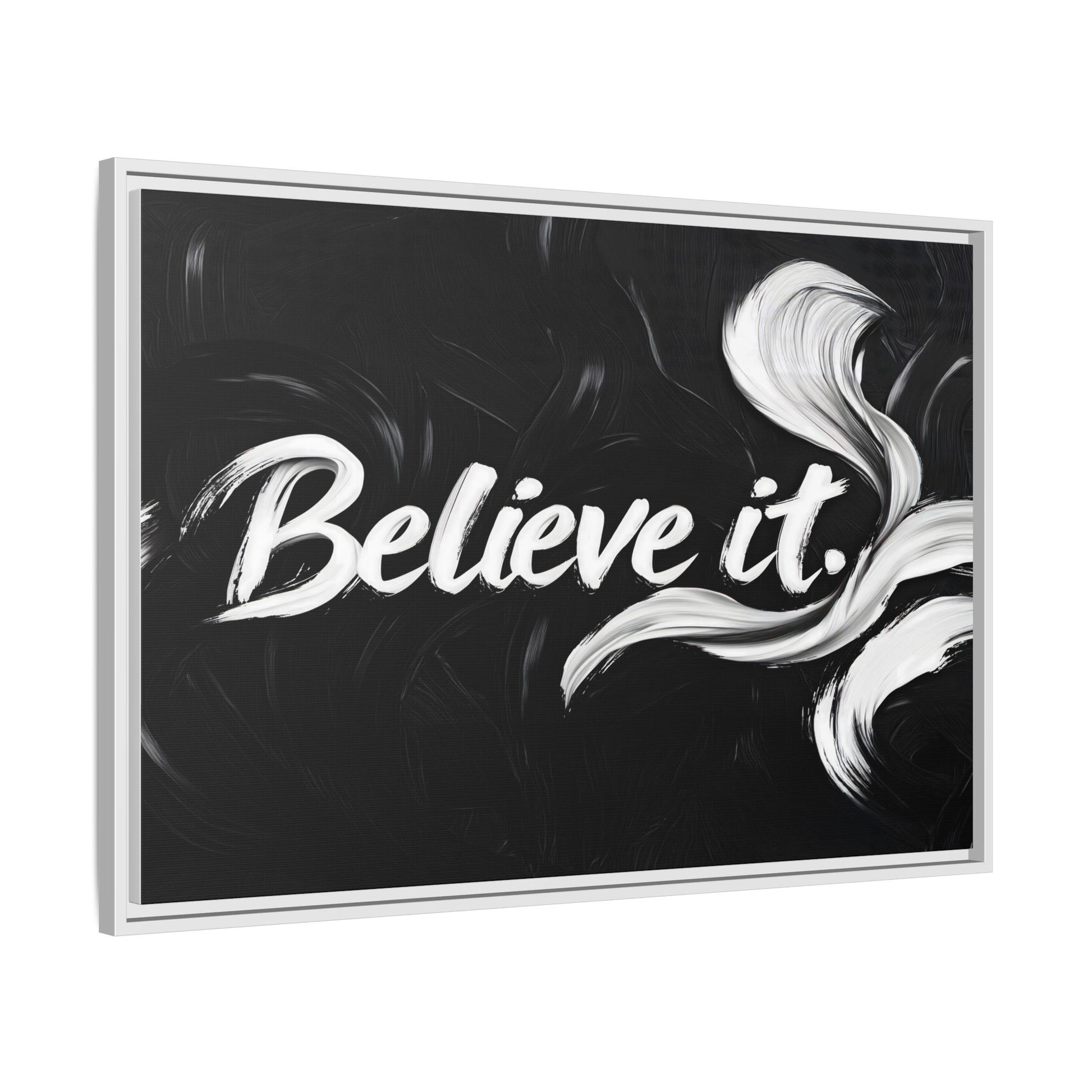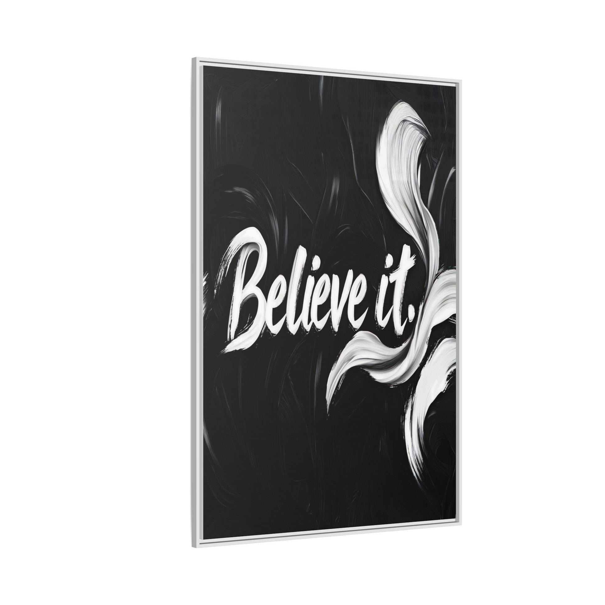 This striking black and white graphic design features the motivational phrase "Believe it" in bold, fluid lettering. The text is rendered in white, standing out dramatically against a deep black background with swirling, painterly textures. Elegant, curved brush strokes in shades of white and gray frame the text, creating a sense of movement and dynamism. The image style appears to be a digital artwork with an abstract, expressive quality that emphasizes the emotional weight of the message. The high-contrast color palette and fluid design elements combine to create a powerful visual statement about belief and potential.