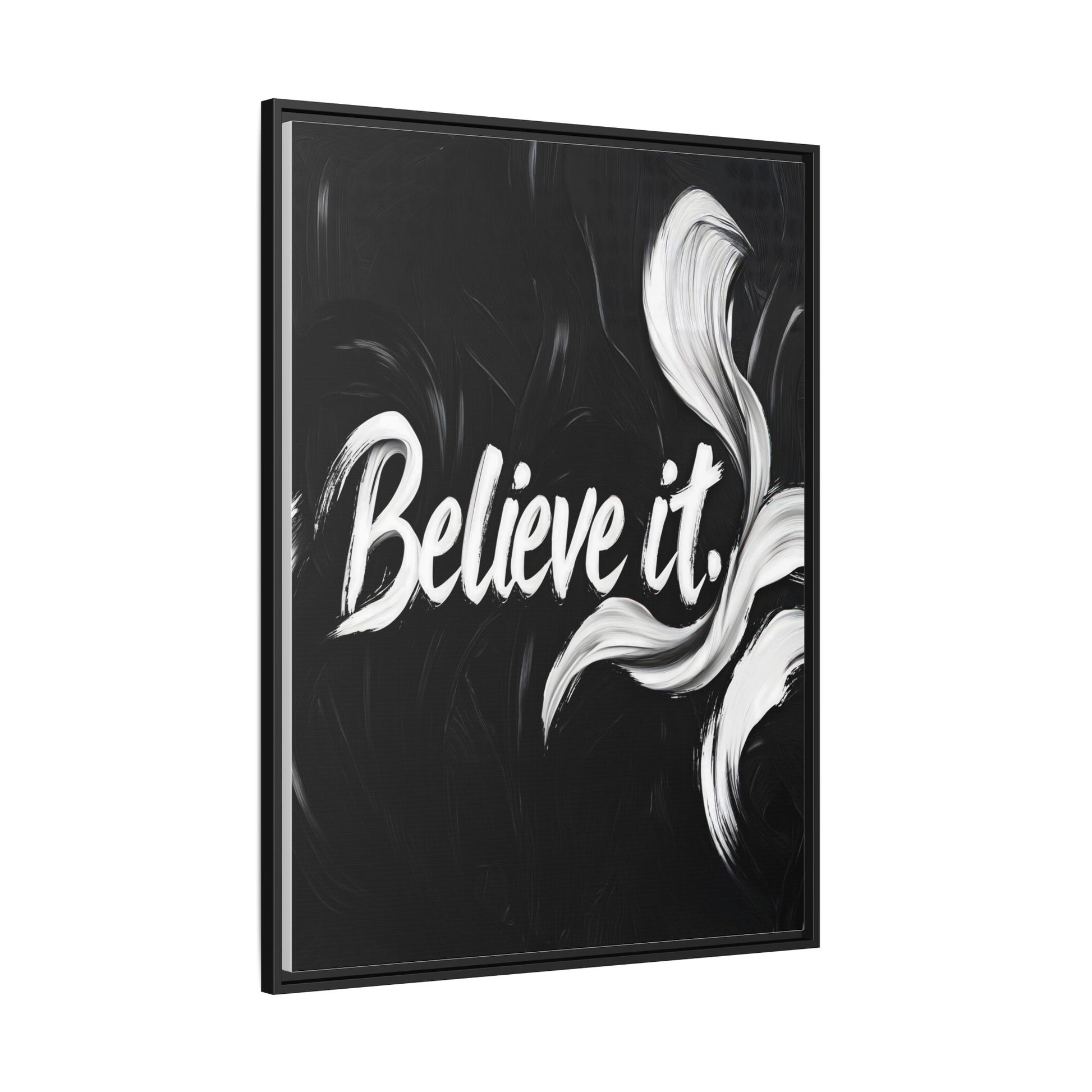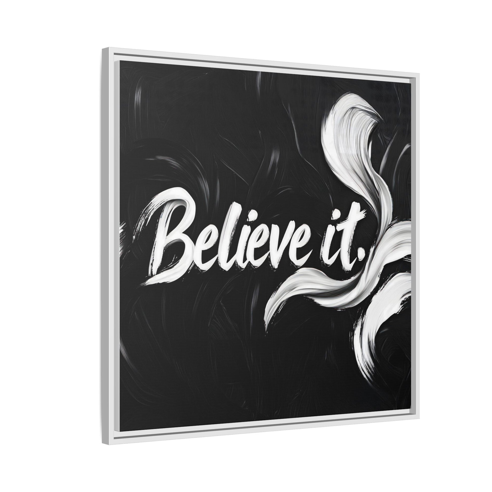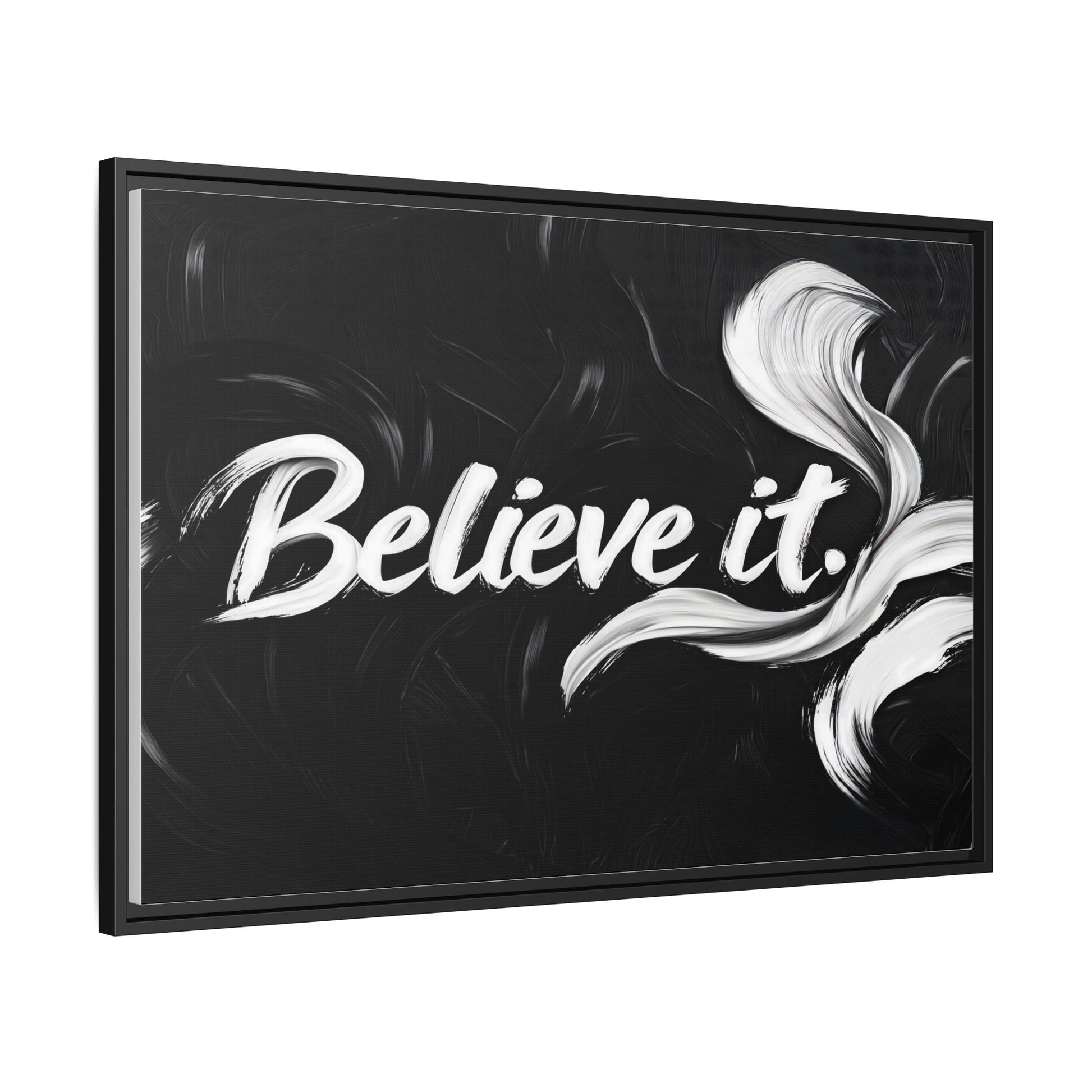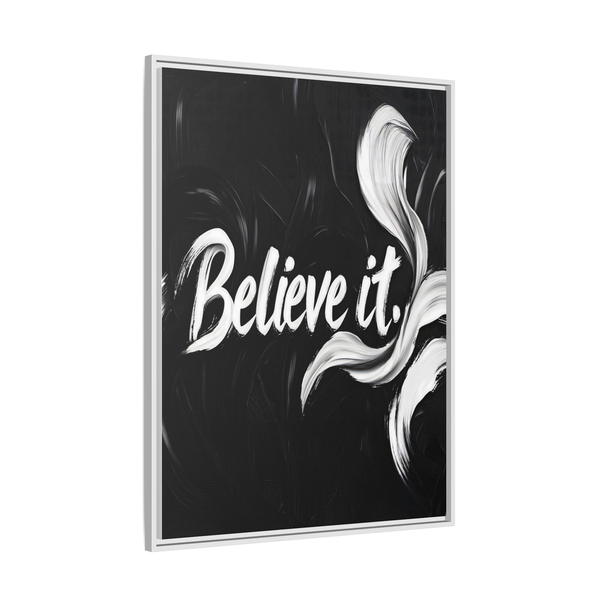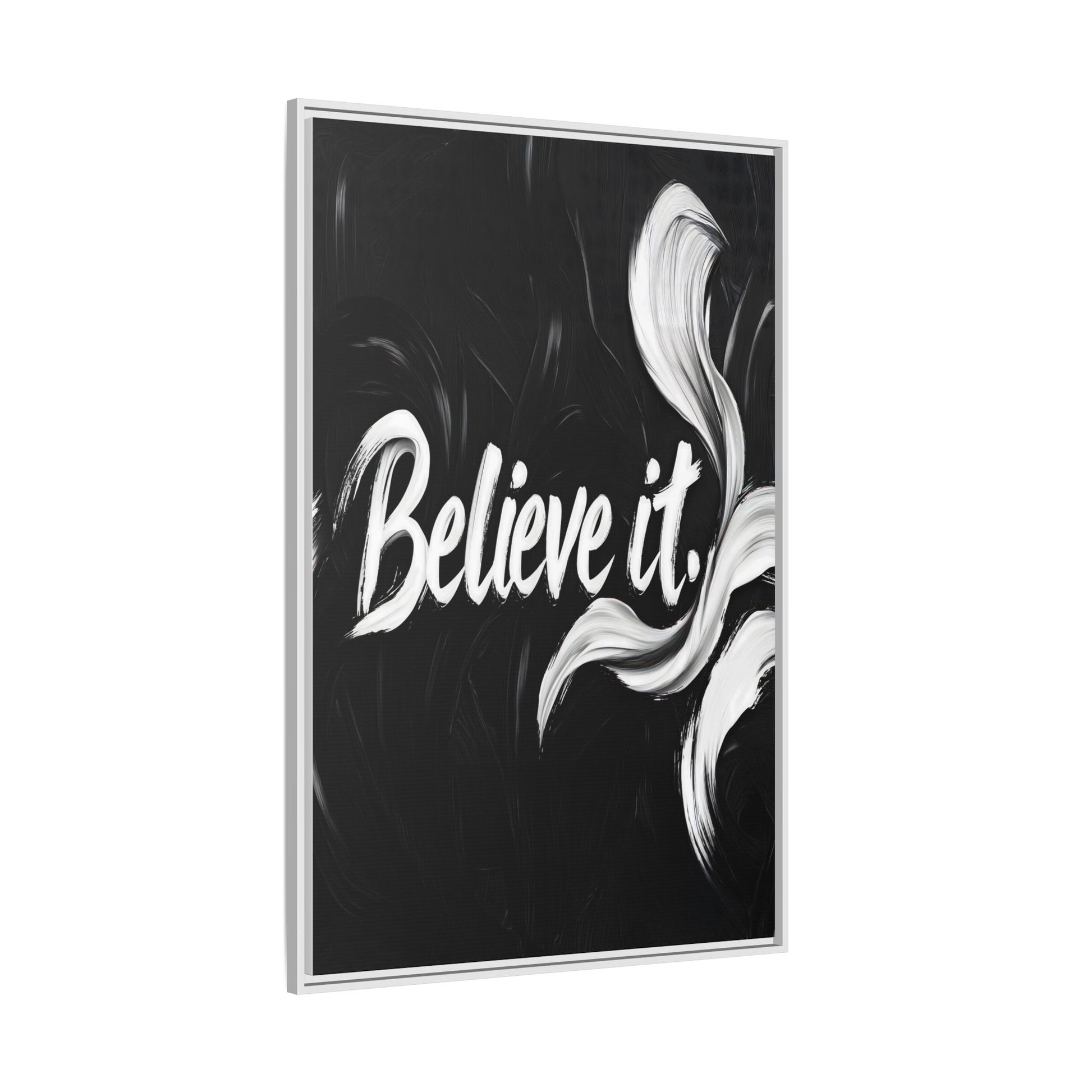 This striking black and white graphic design features the motivational phrase "Believe it" in bold, fluid lettering. The text is rendered in white, standing out dramatically against a deep black background with swirling, painterly textures. Elegant, curved brush strokes in shades of white and gray frame the text, creating a sense of movement and dynamism. The image style appears to be a digital artwork with an abstract, expressive quality that emphasizes the emotional weight of the message. The high-contrast color palette and fluid design elements combine to create a powerful visual statement about belief and potential.
