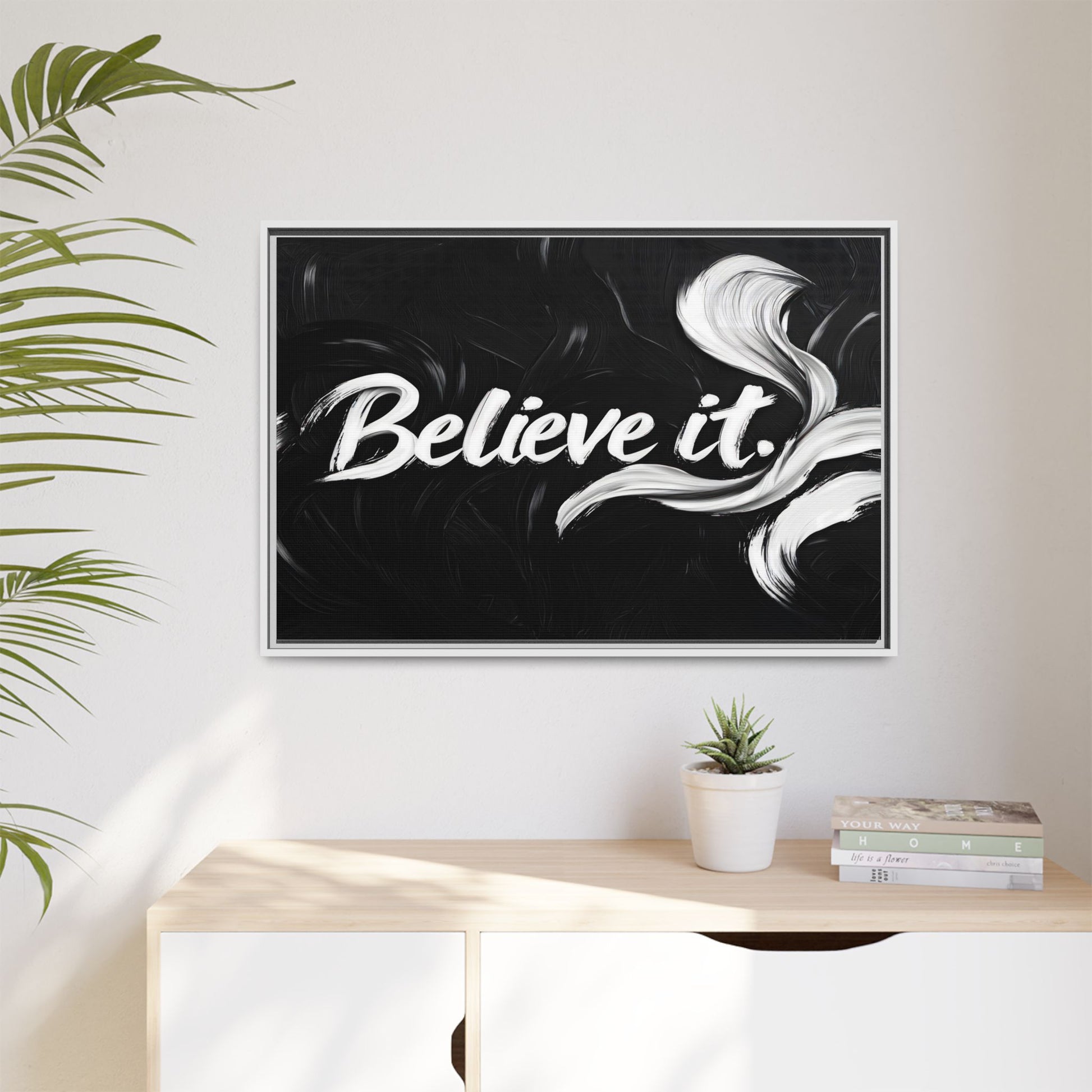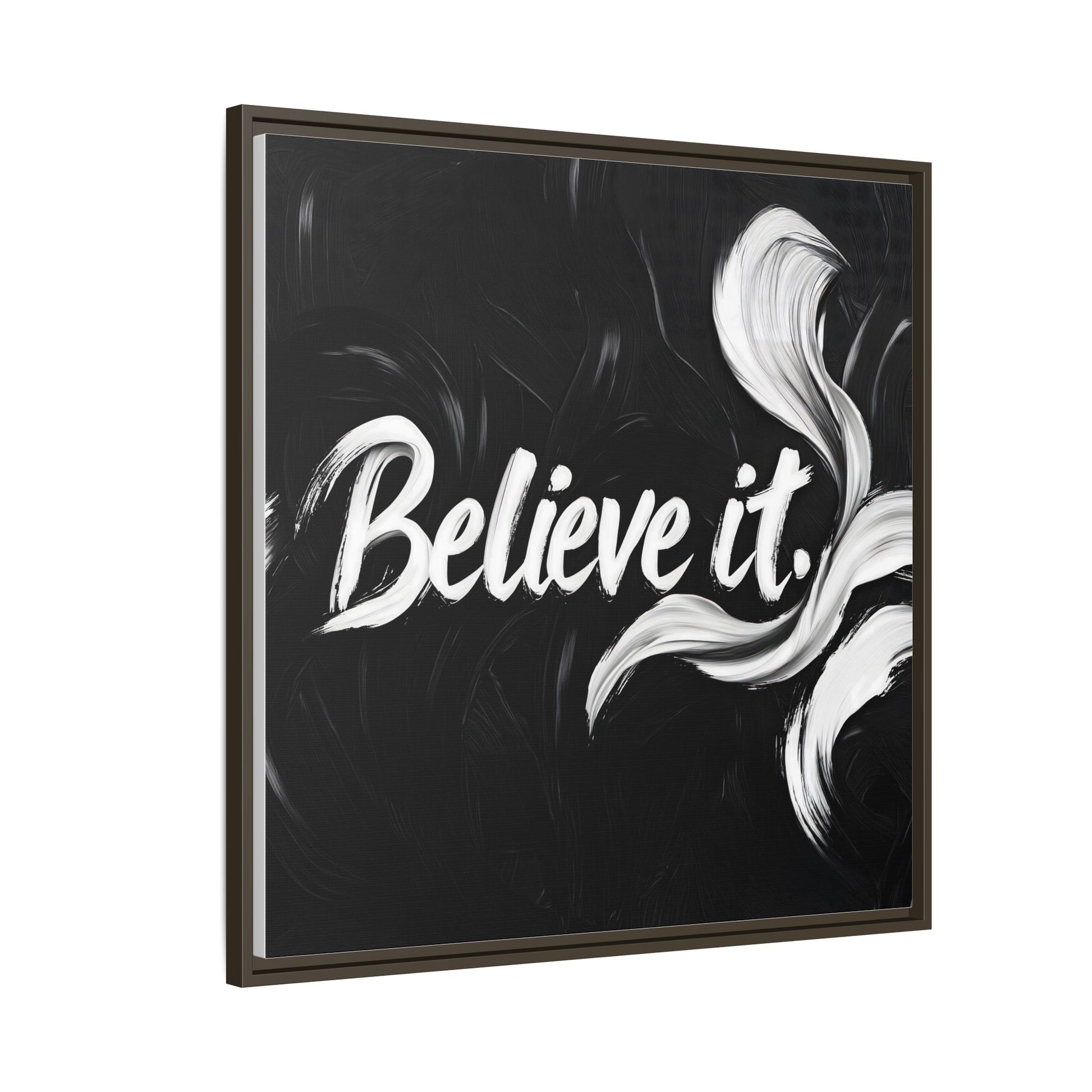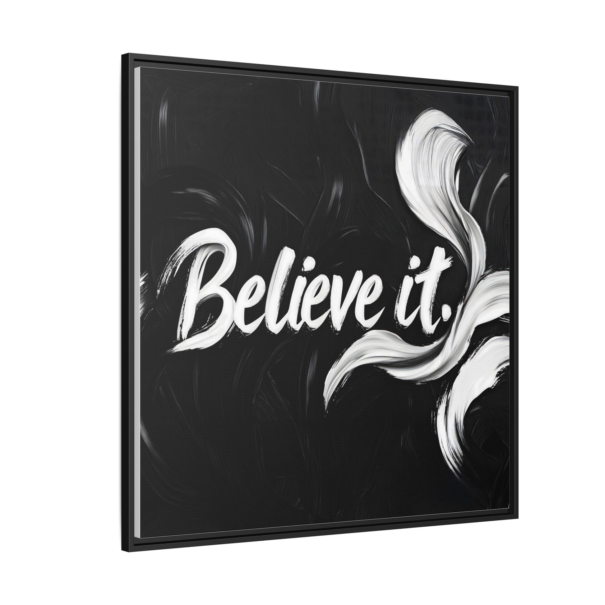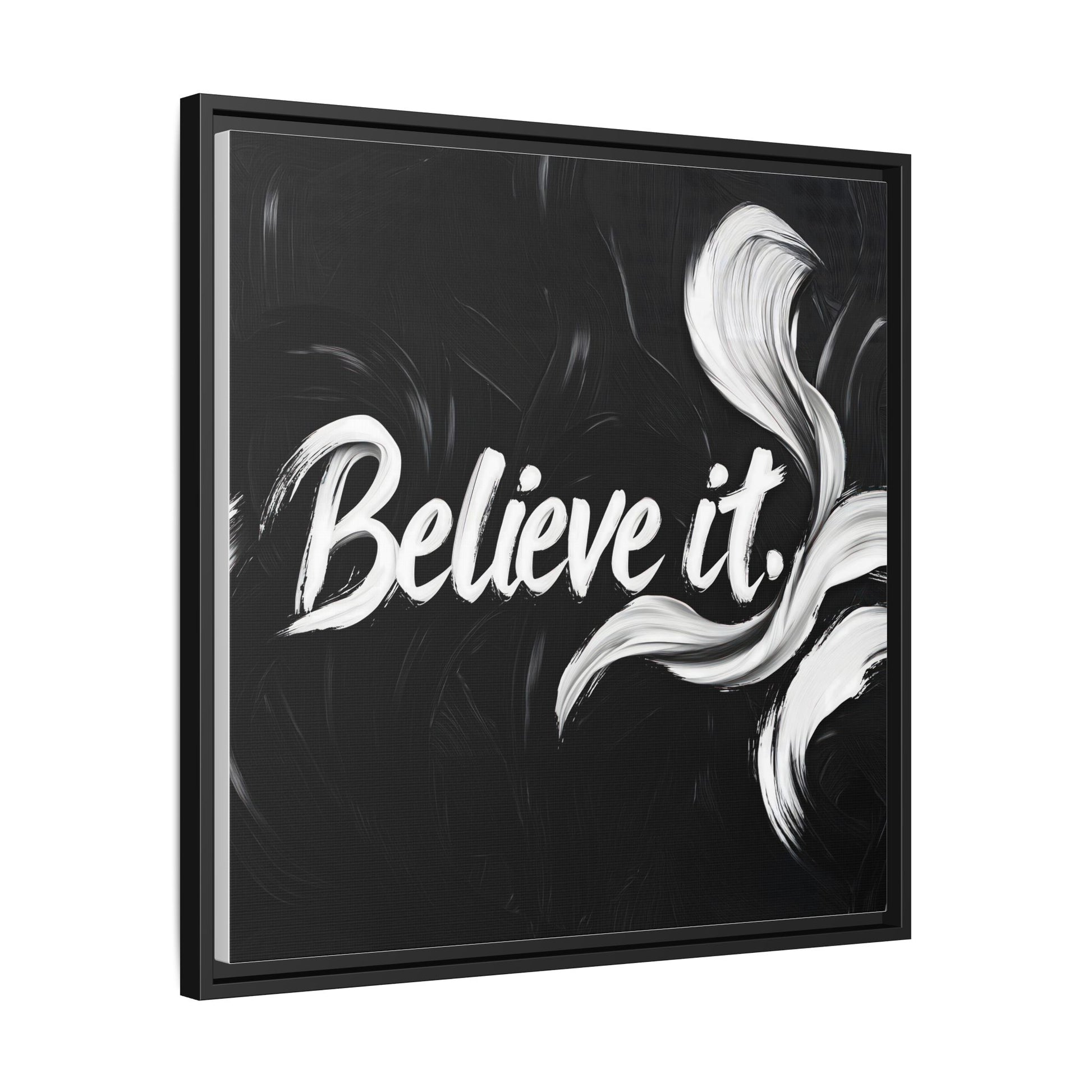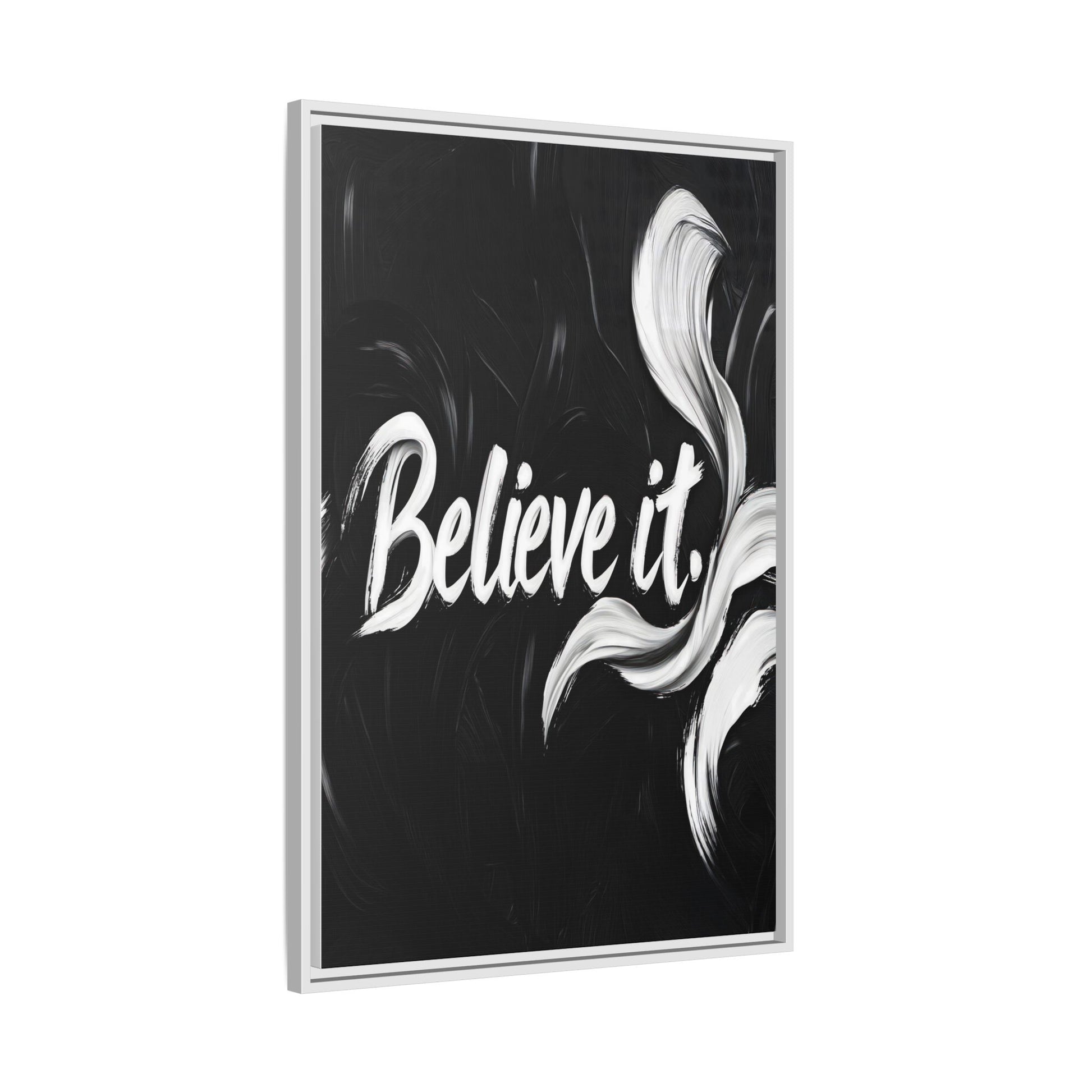 This striking black and white graphic design features the motivational phrase "Believe it" in bold, fluid lettering. The text is rendered in white, standing out dramatically against a deep black background with swirling, painterly textures. Elegant, curved brush strokes in shades of white and gray frame the text, creating a sense of movement and dynamism. The image style appears to be a digital artwork with an abstract, expressive quality that emphasizes the emotional weight of the message. The high-contrast color palette and fluid design elements combine to create a powerful visual statement about belief and potential.