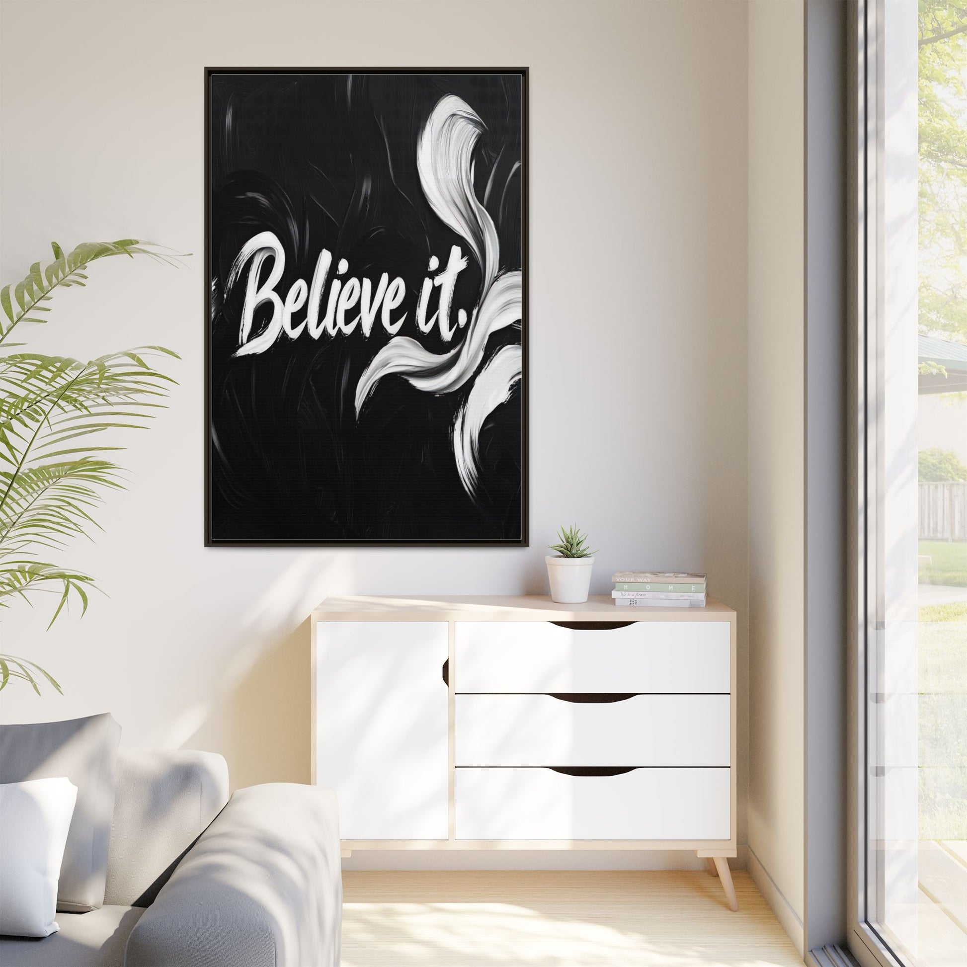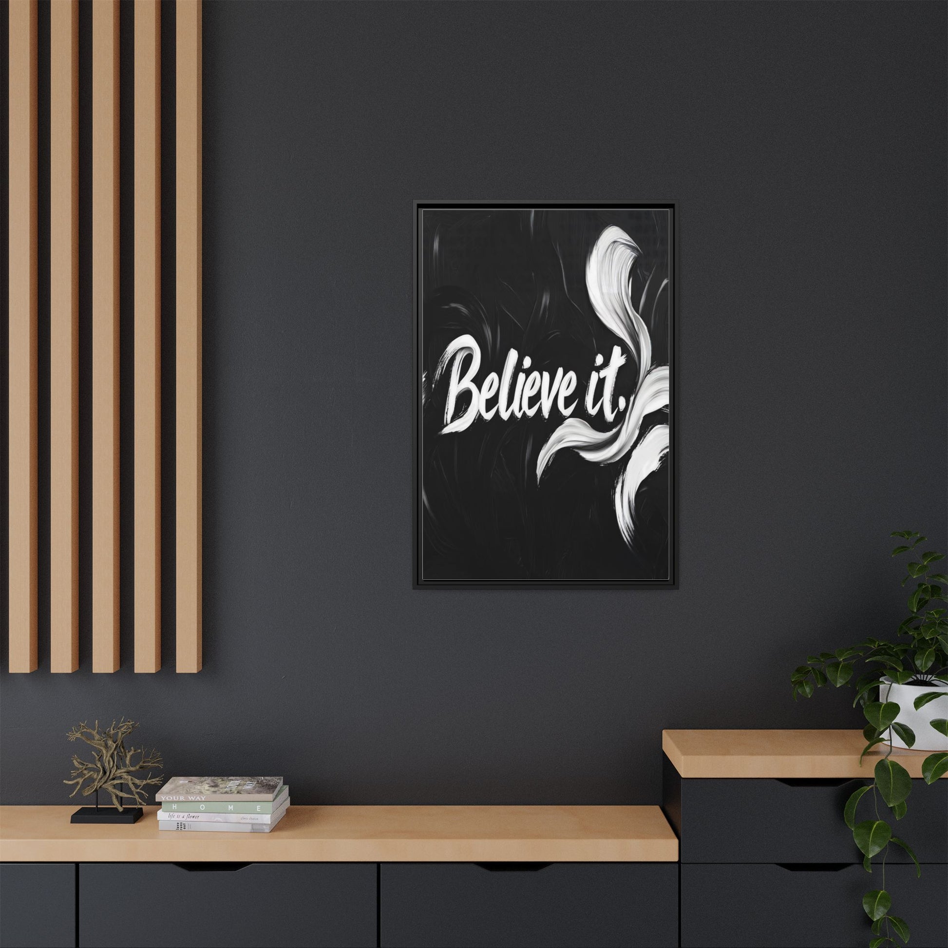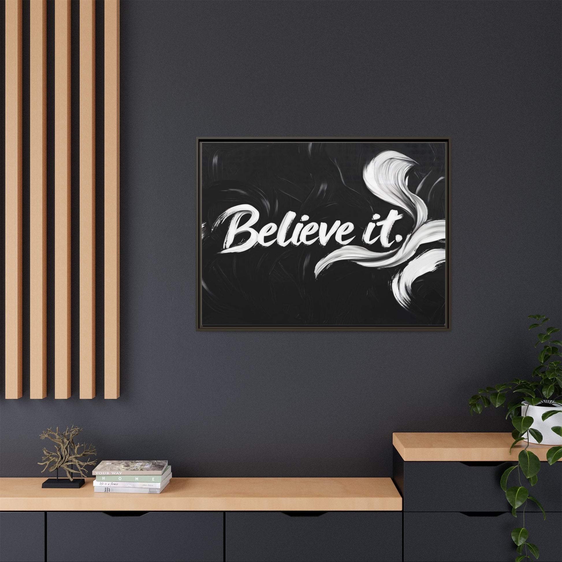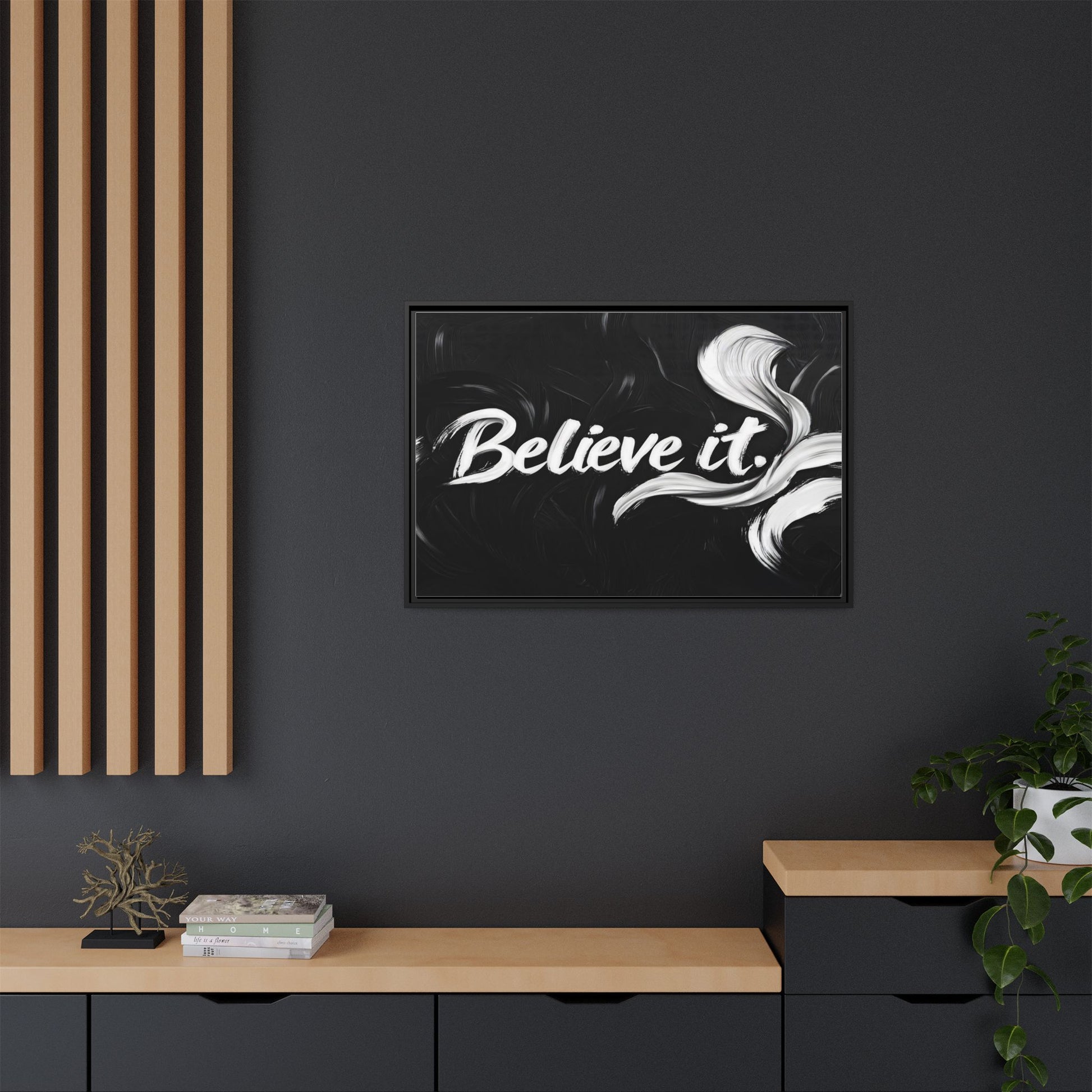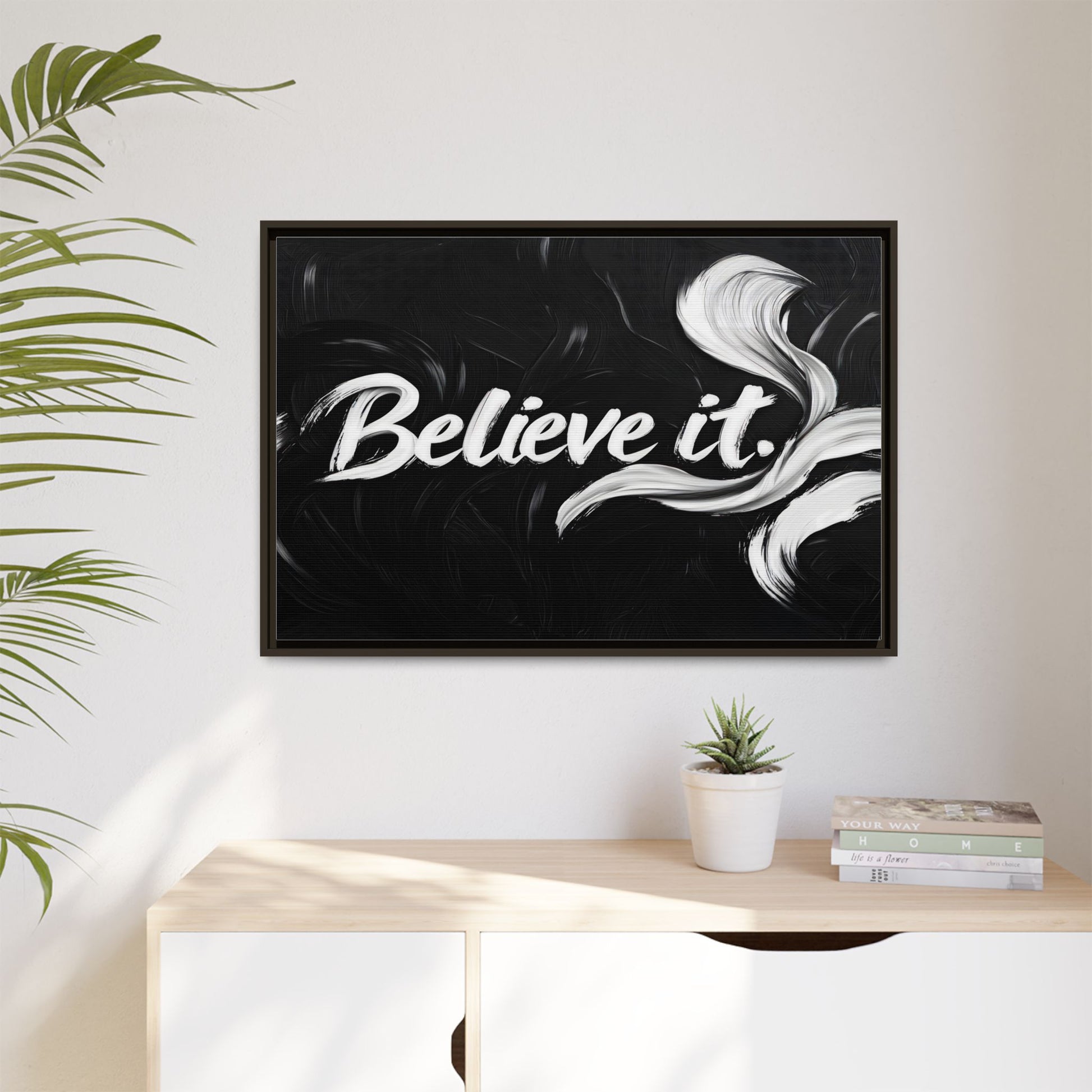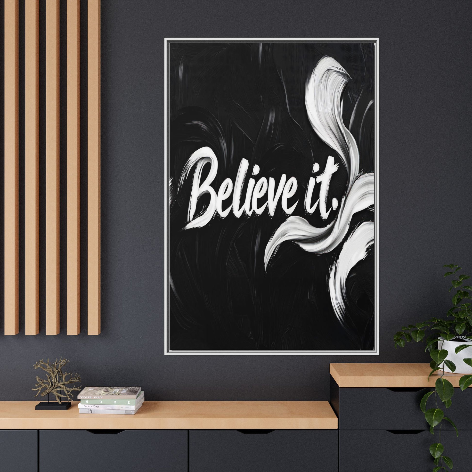 This striking black and white graphic design features the motivational phrase "Believe it" in bold, fluid lettering. The text is rendered in white, standing out dramatically against a deep black background with swirling, painterly textures. Elegant, curved brush strokes in shades of white and gray frame the text, creating a sense of movement and dynamism. The image style appears to be a digital artwork with an abstract, expressive quality that emphasizes the emotional weight of the message. The high-contrast color palette and fluid design elements combine to create a powerful visual statement about belief and potential.