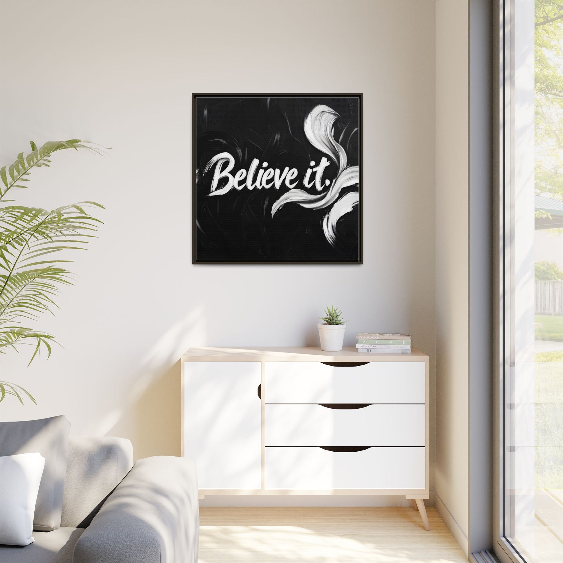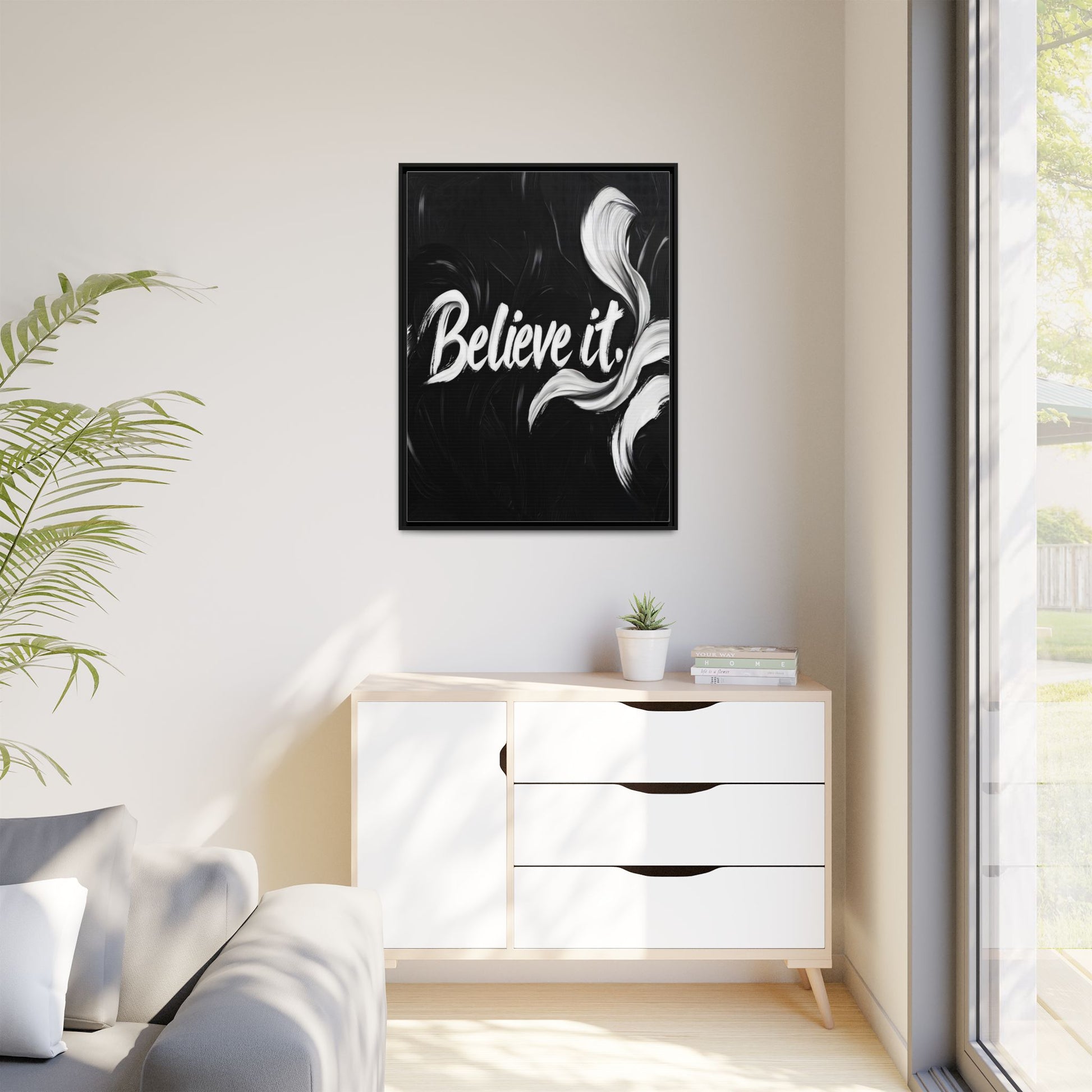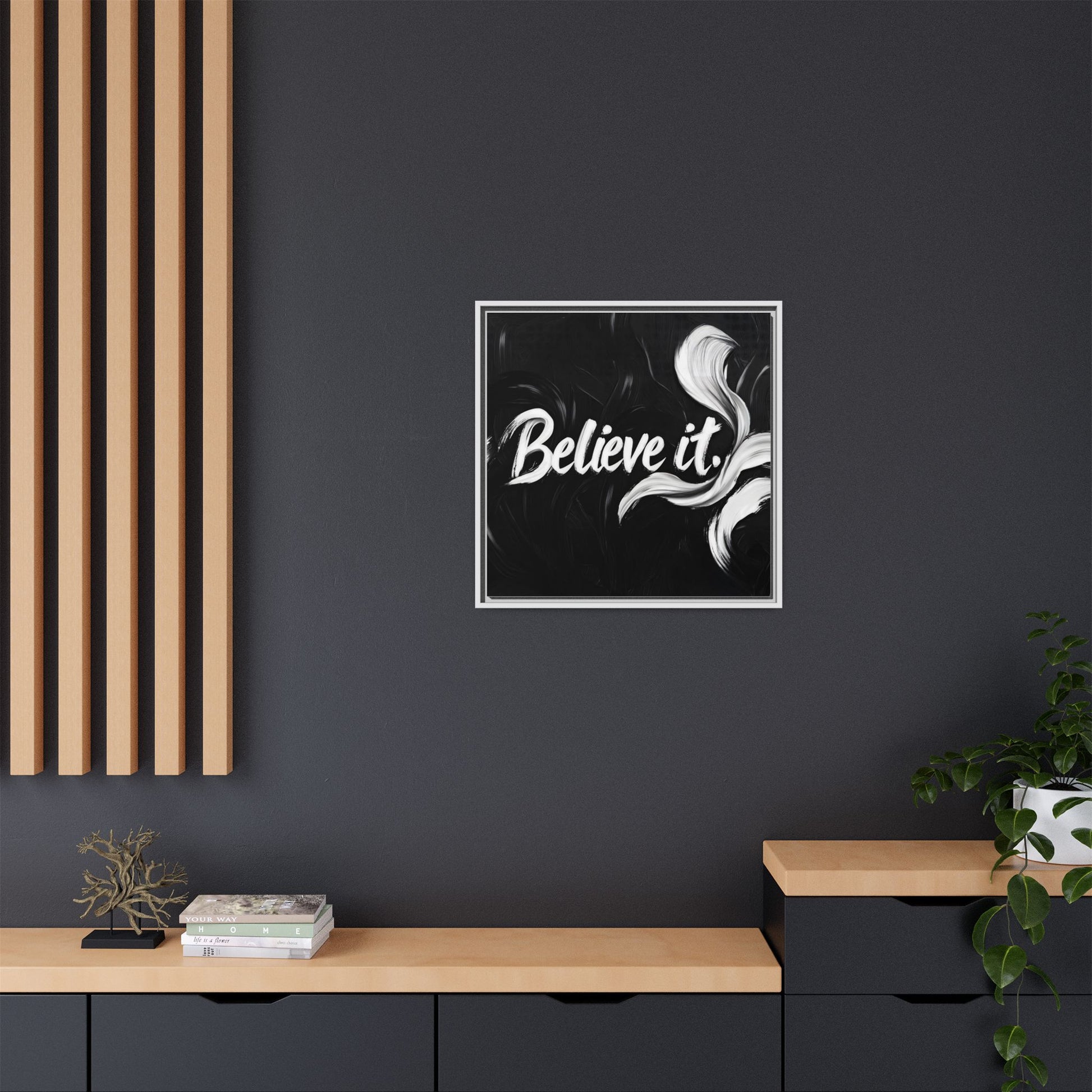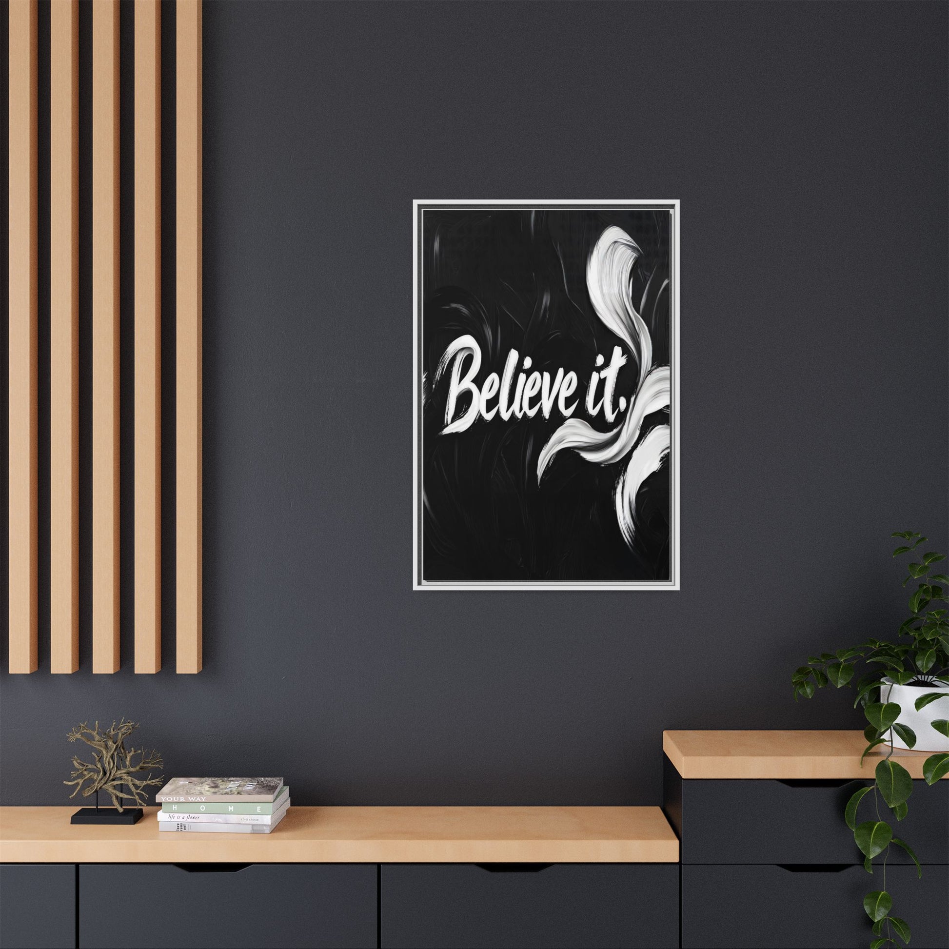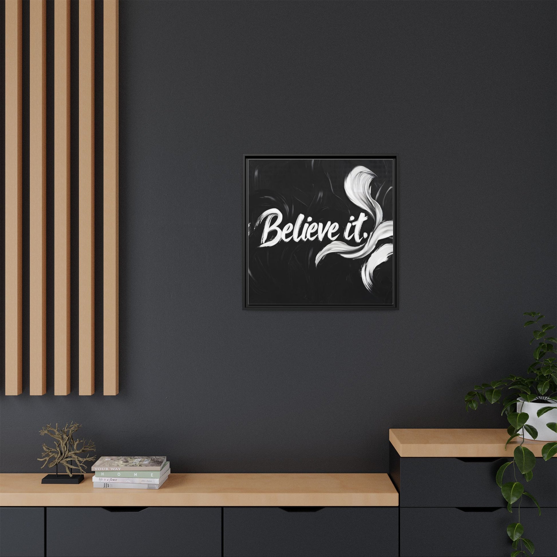 This striking black and white graphic design features the motivational phrase "Believe it" in bold, fluid lettering. The text is rendered in white, standing out dramatically against a deep black background with swirling, painterly textures. Elegant, curved brush strokes in shades of white and gray frame the text, creating a sense of movement and dynamism. The image style appears to be a digital artwork with an abstract, expressive quality that emphasizes the emotional weight of the message. The high-contrast color palette and fluid design elements combine to create a powerful visual statement about belief and potential.