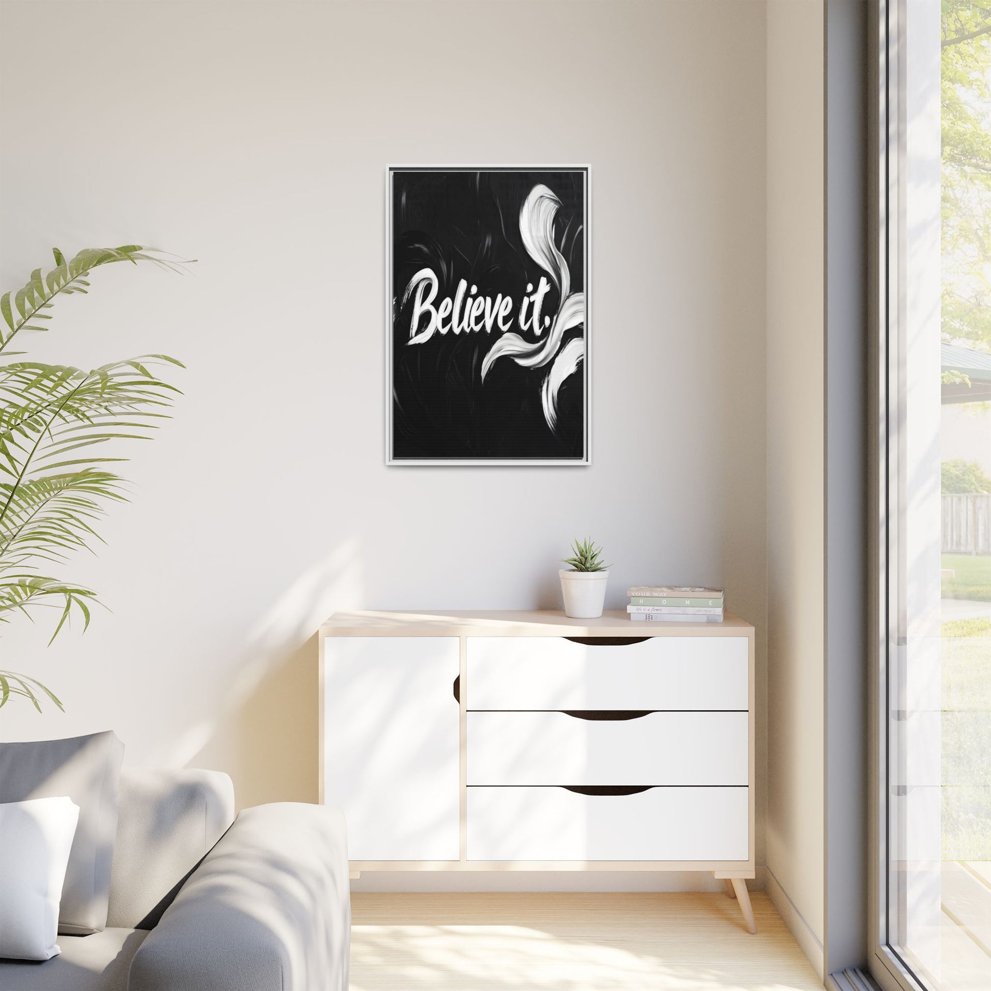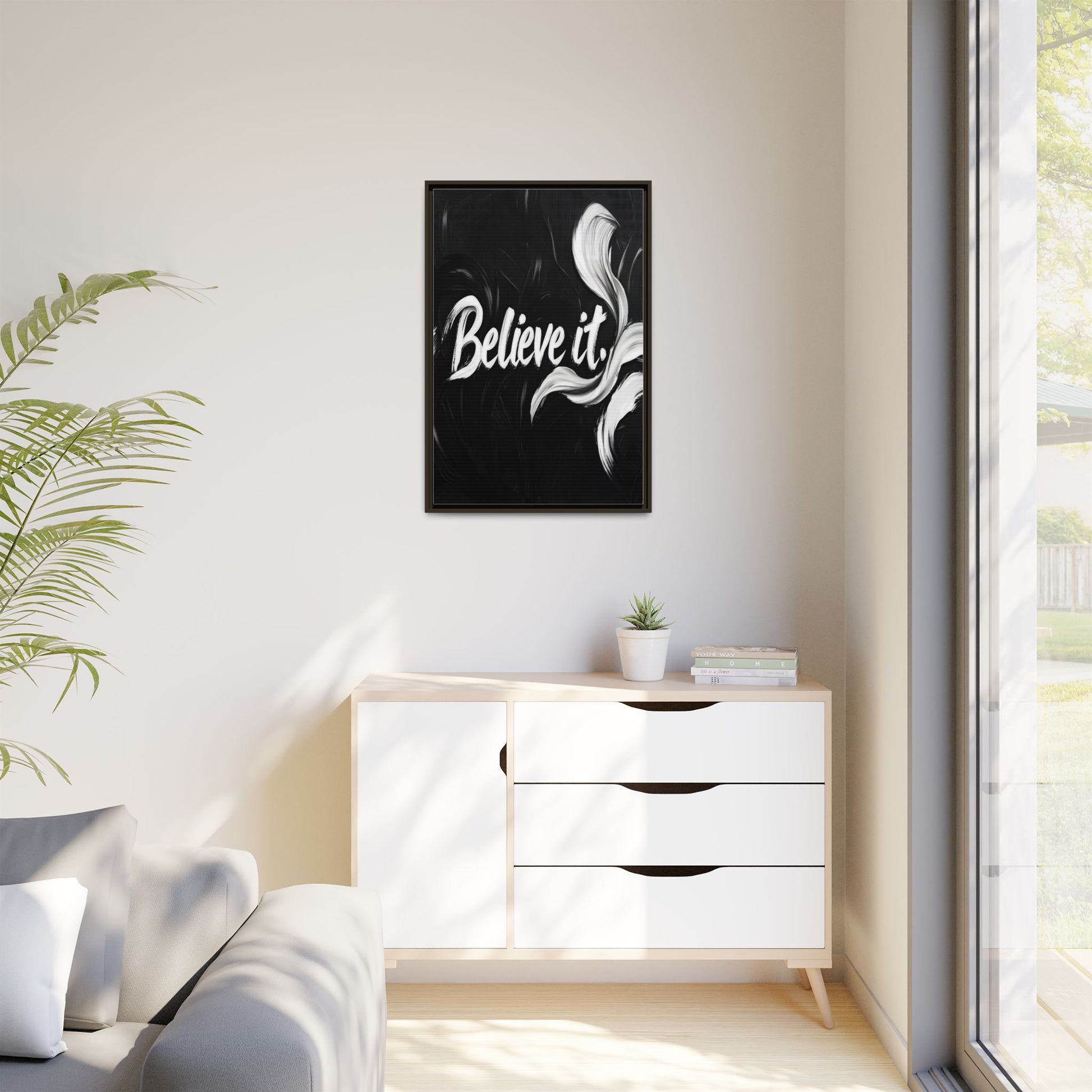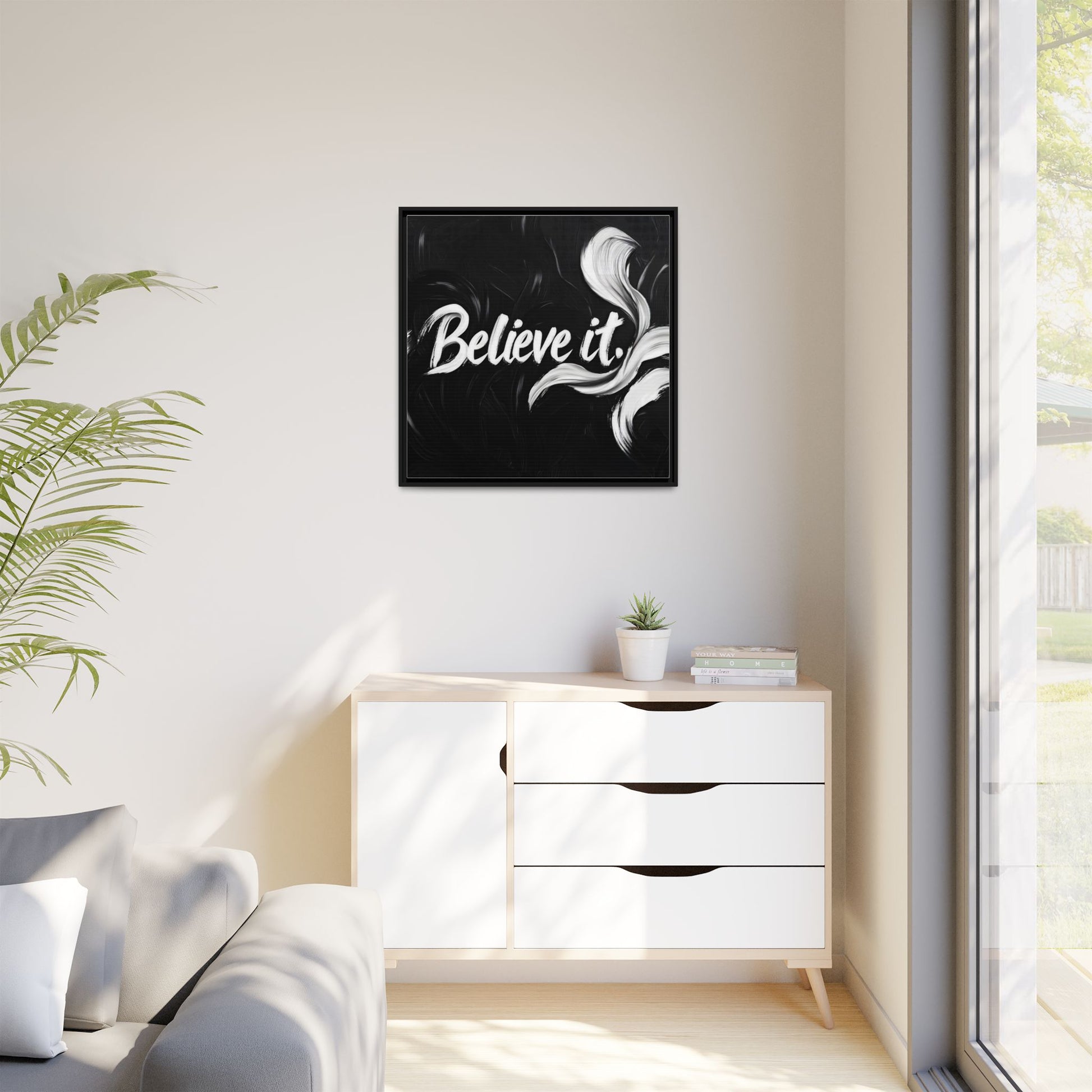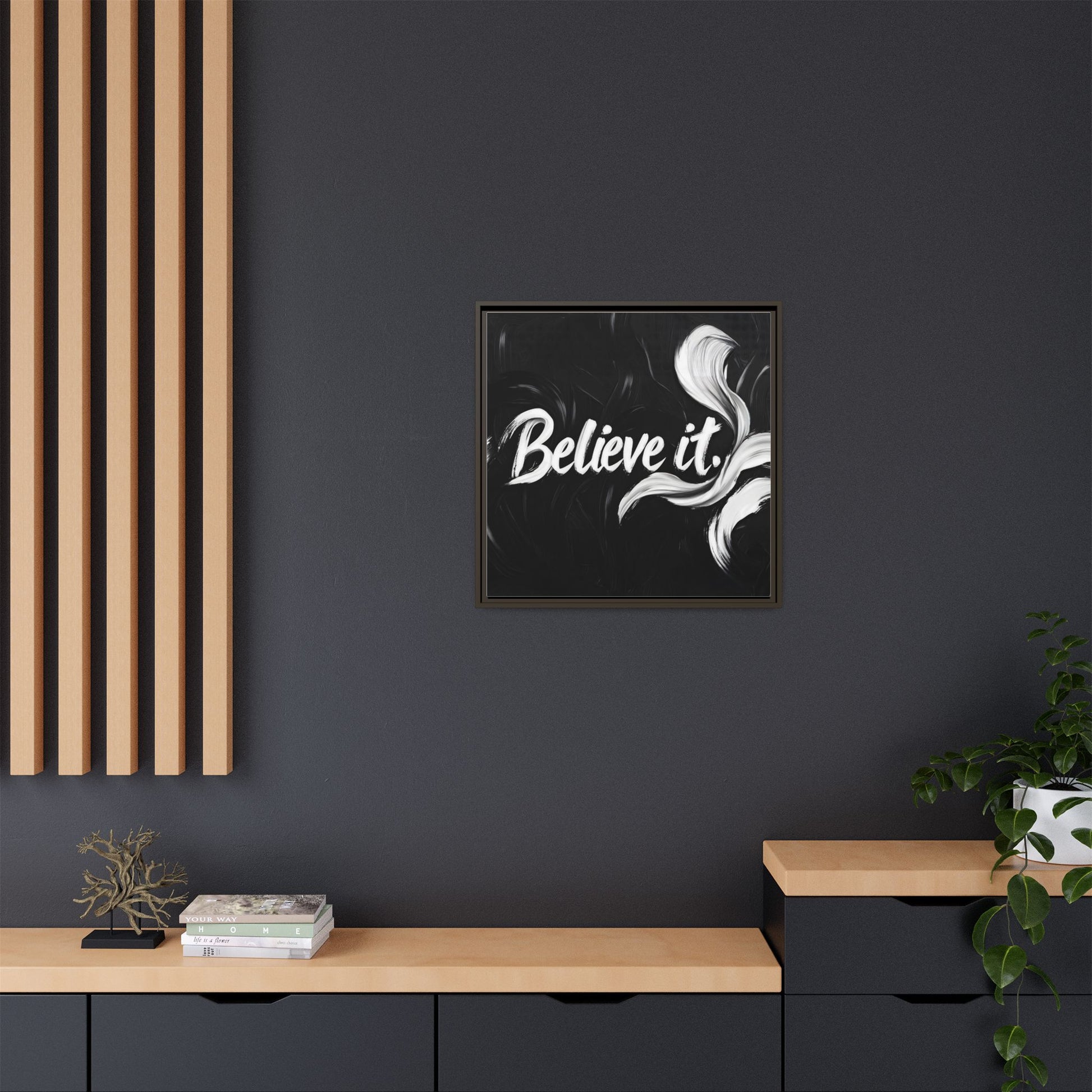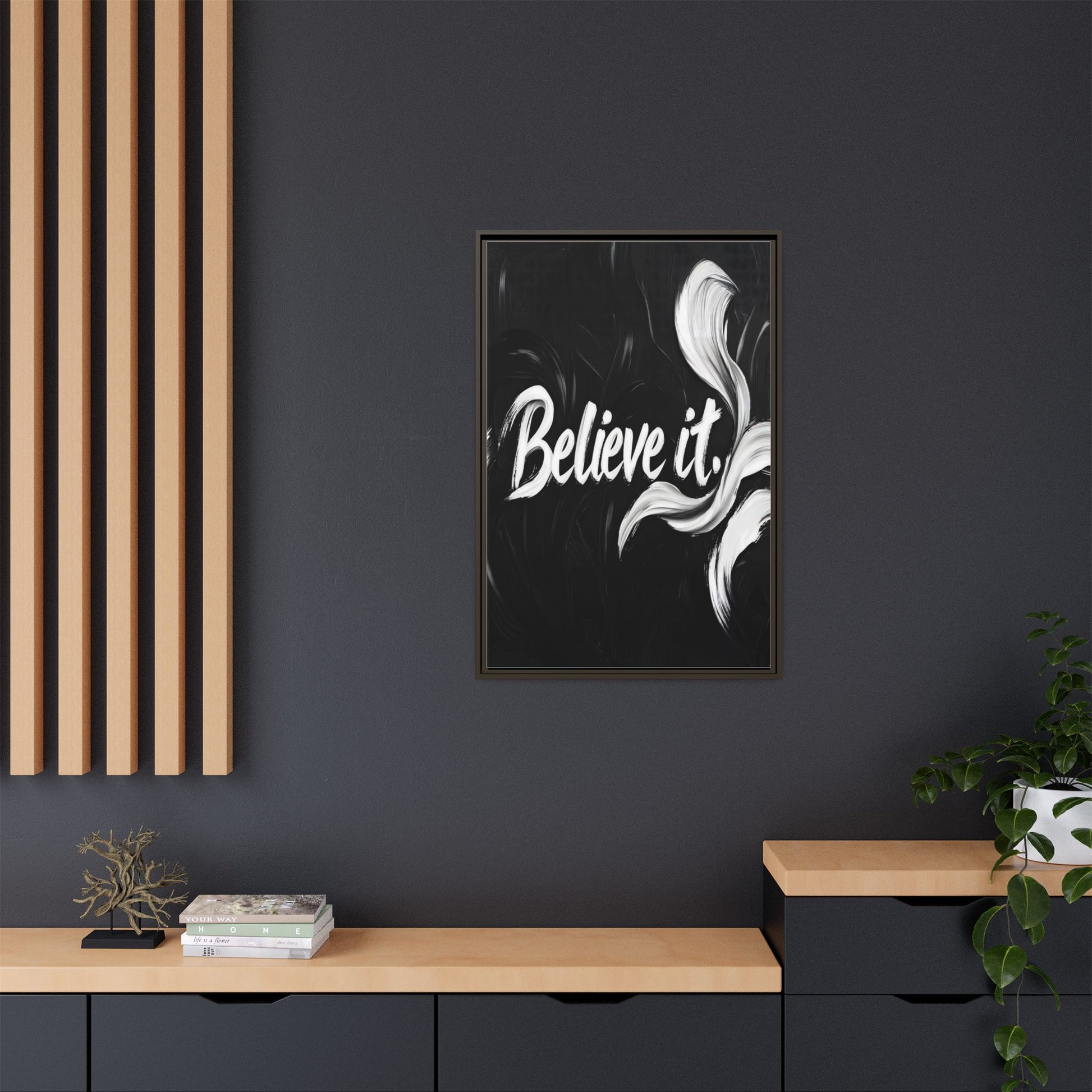 This striking black and white graphic design features the motivational phrase "Believe it" in bold, fluid lettering. The text is rendered in white, standing out dramatically against a deep black background with swirling, painterly textures. Elegant, curved brush strokes in shades of white and gray frame the text, creating a sense of movement and dynamism. The image style appears to be a digital artwork with an abstract, expressive quality that emphasizes the emotional weight of the message. The high-contrast color palette and fluid design elements combine to create a powerful visual statement about belief and potential.
