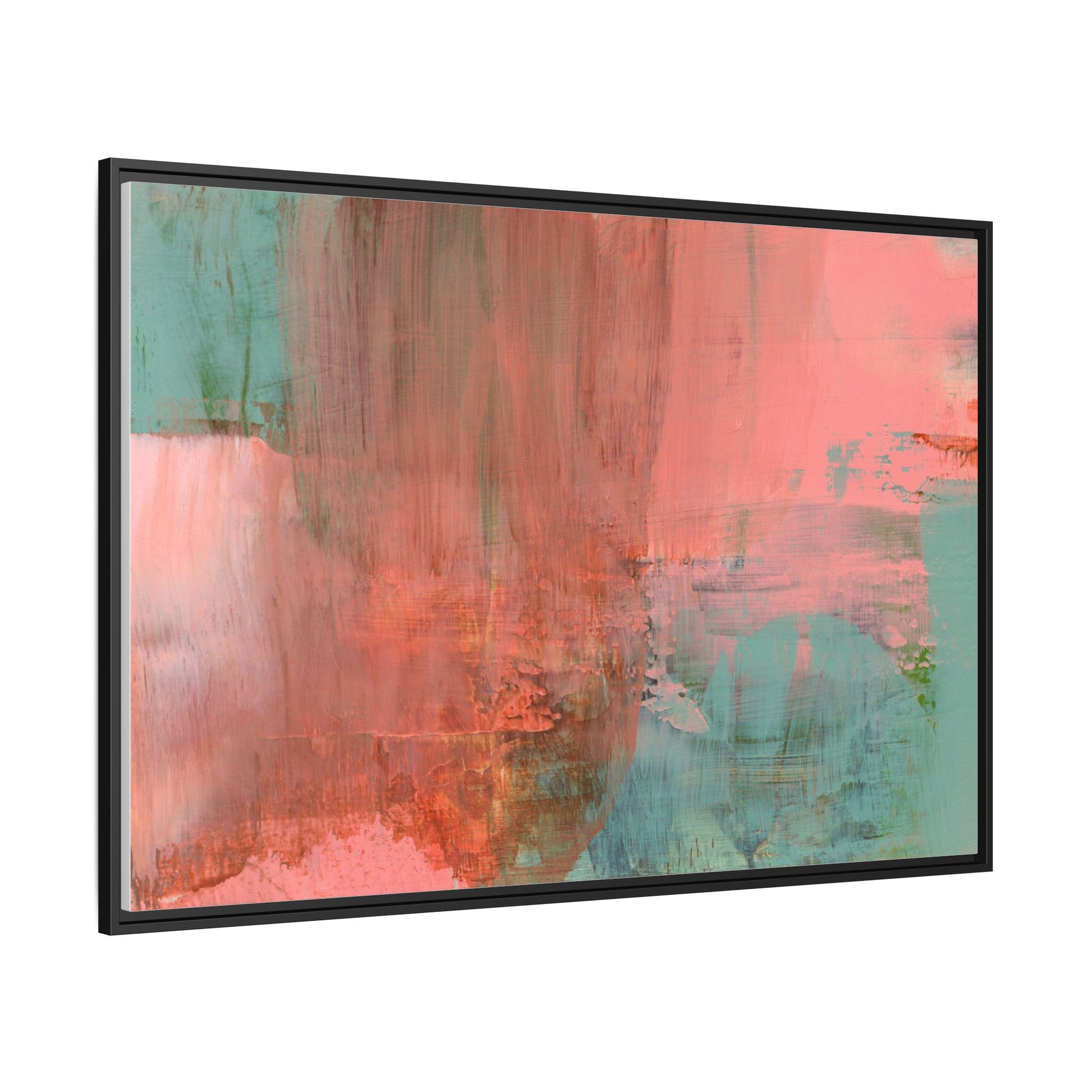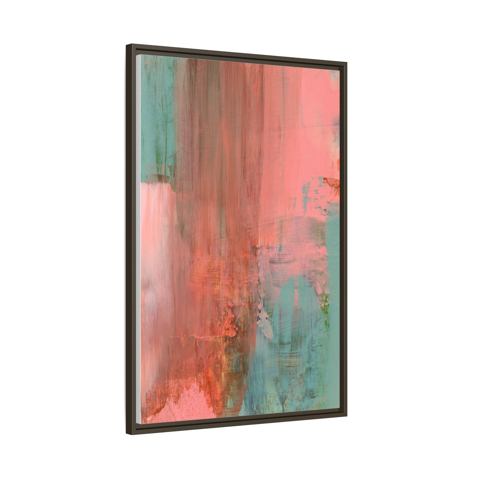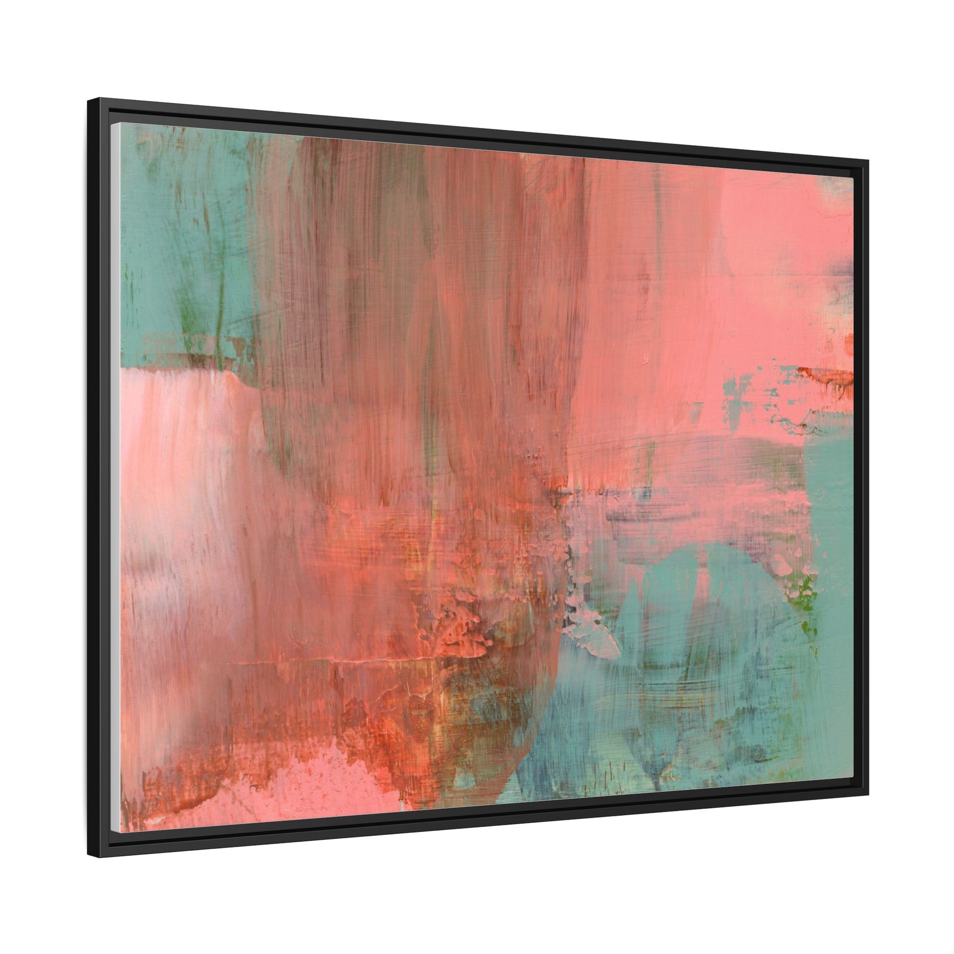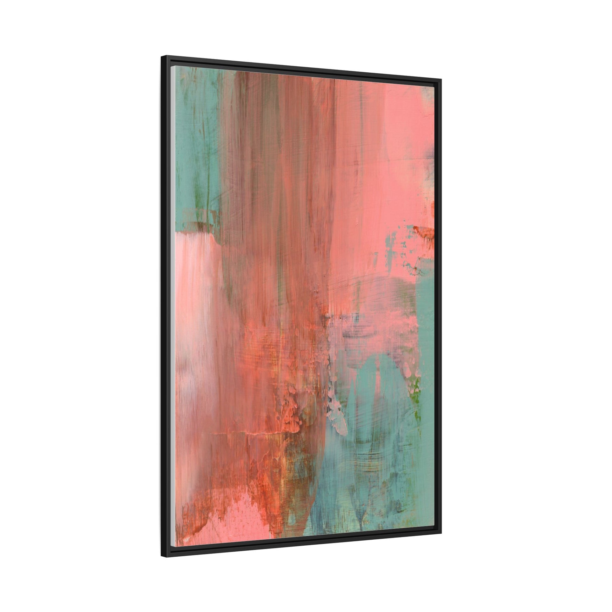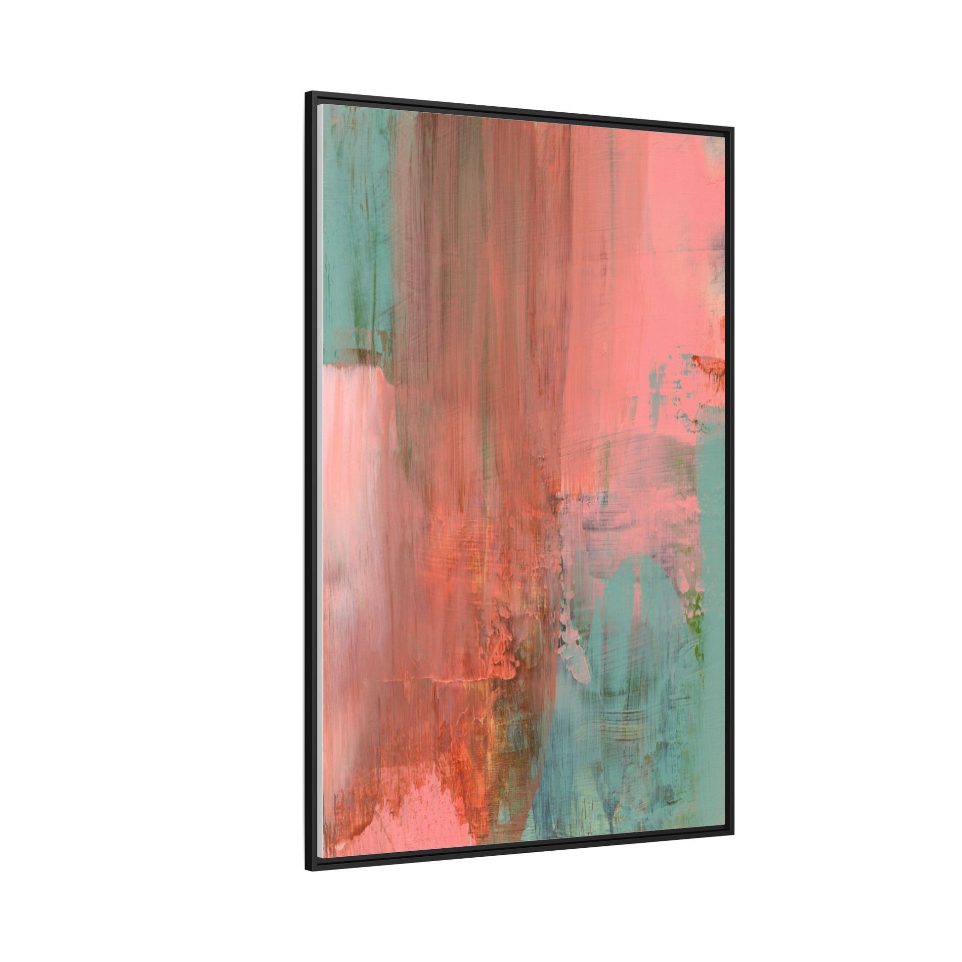 This captivating abstract painting is a harmonious blend of soft coral pink and muted teal blue tones, creating a dreamlike and ethereal visual composition. The artwork features fluid, vertical brushstrokes that seem to blend and bleed into each other, generating a sense of movement and organic transition between colors. Textural elements are prominent, with visible paint strokes and layered techniques that add depth and complexity to the image, revealing subtle variations in hue and intensity. The painting evokes a sense of atmospheric landscape or a meditative seascape, with the colors suggesting a sunset or dawn-like quality that blurs the boundaries between sky, water, and horizon. The overall effect is both calming and dynamic, inviting viewers to interpret the abstract forms and colors through their own emotional and visual perspective.