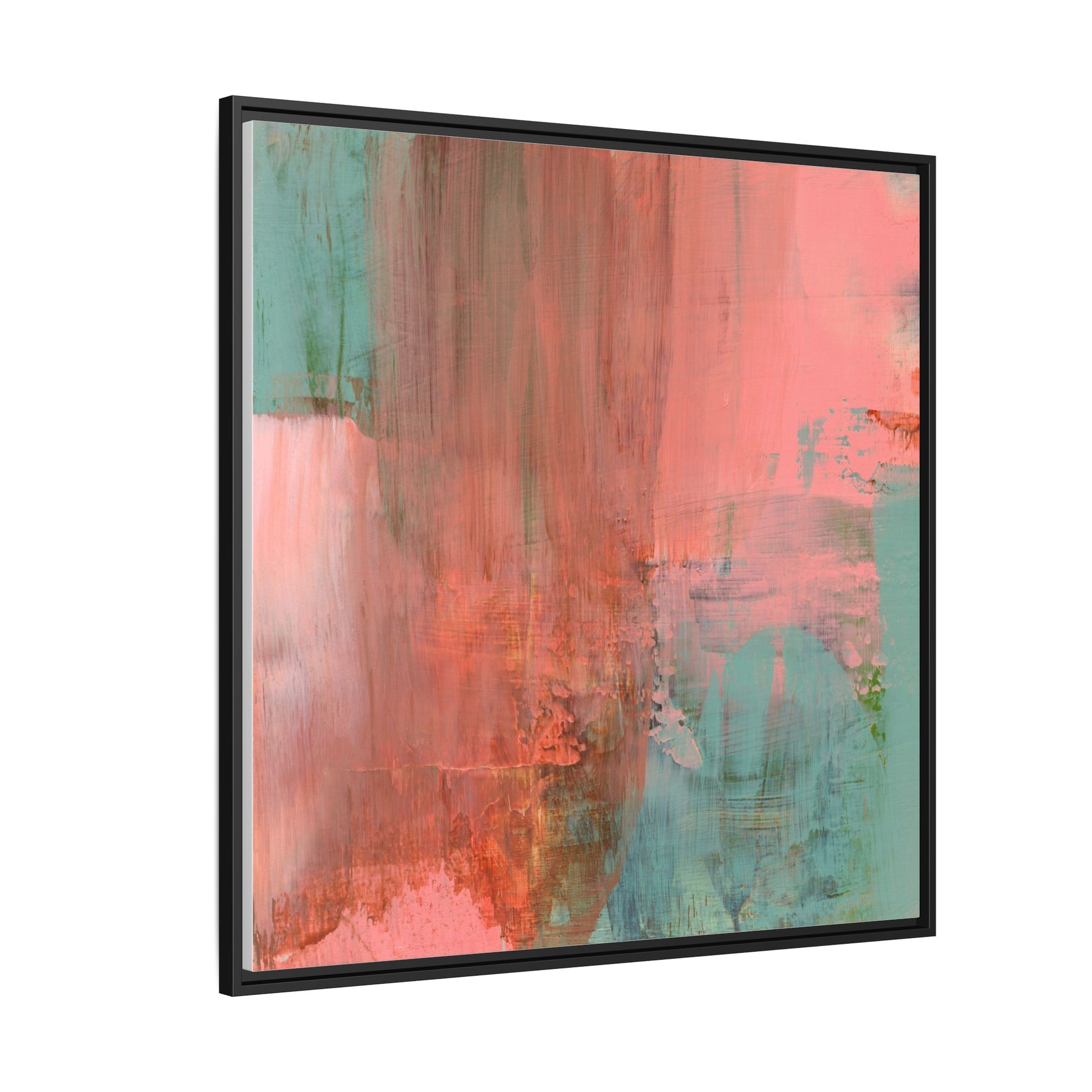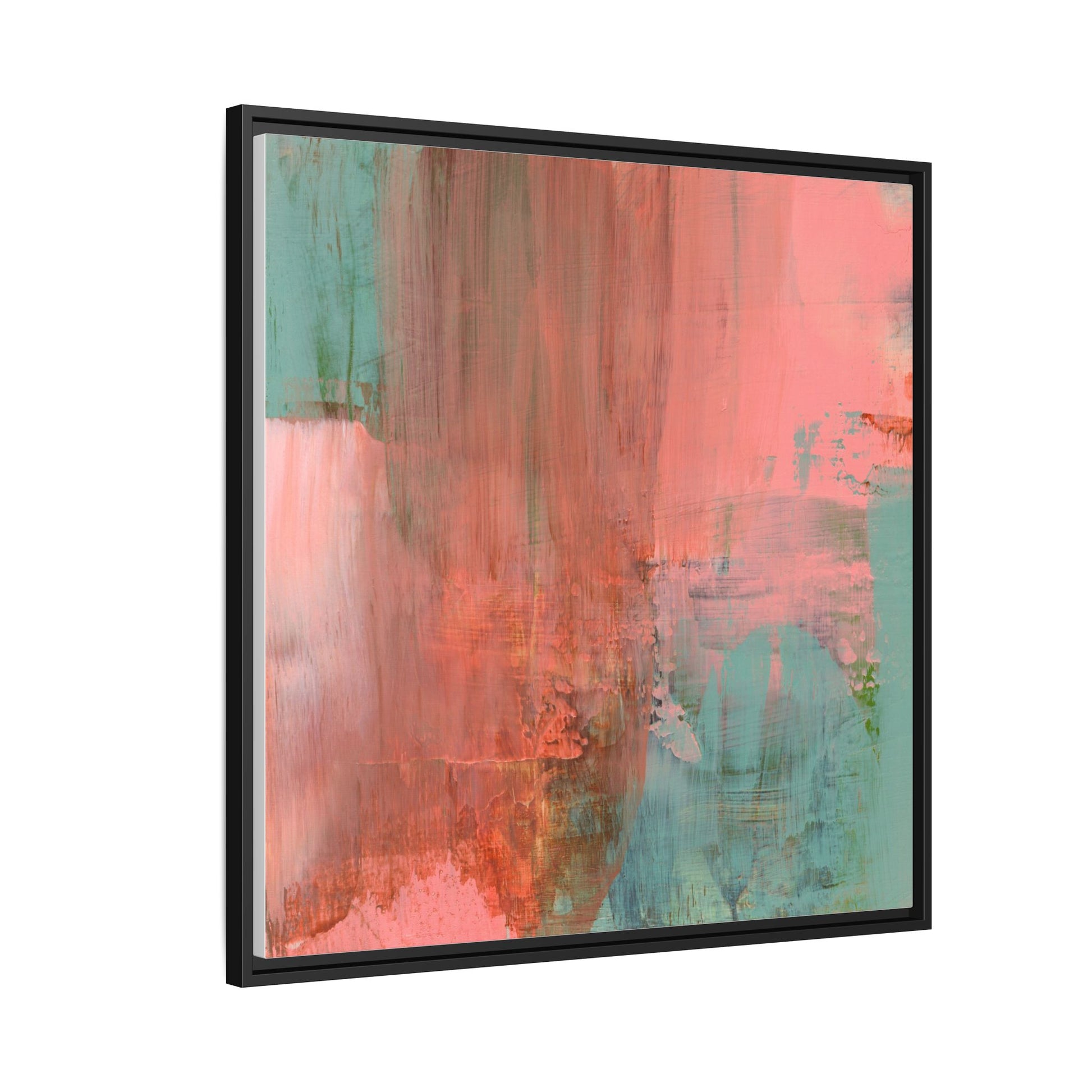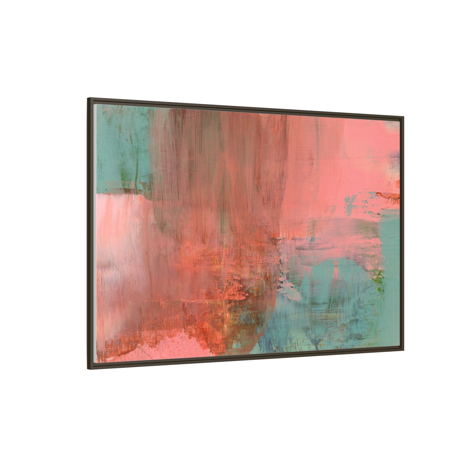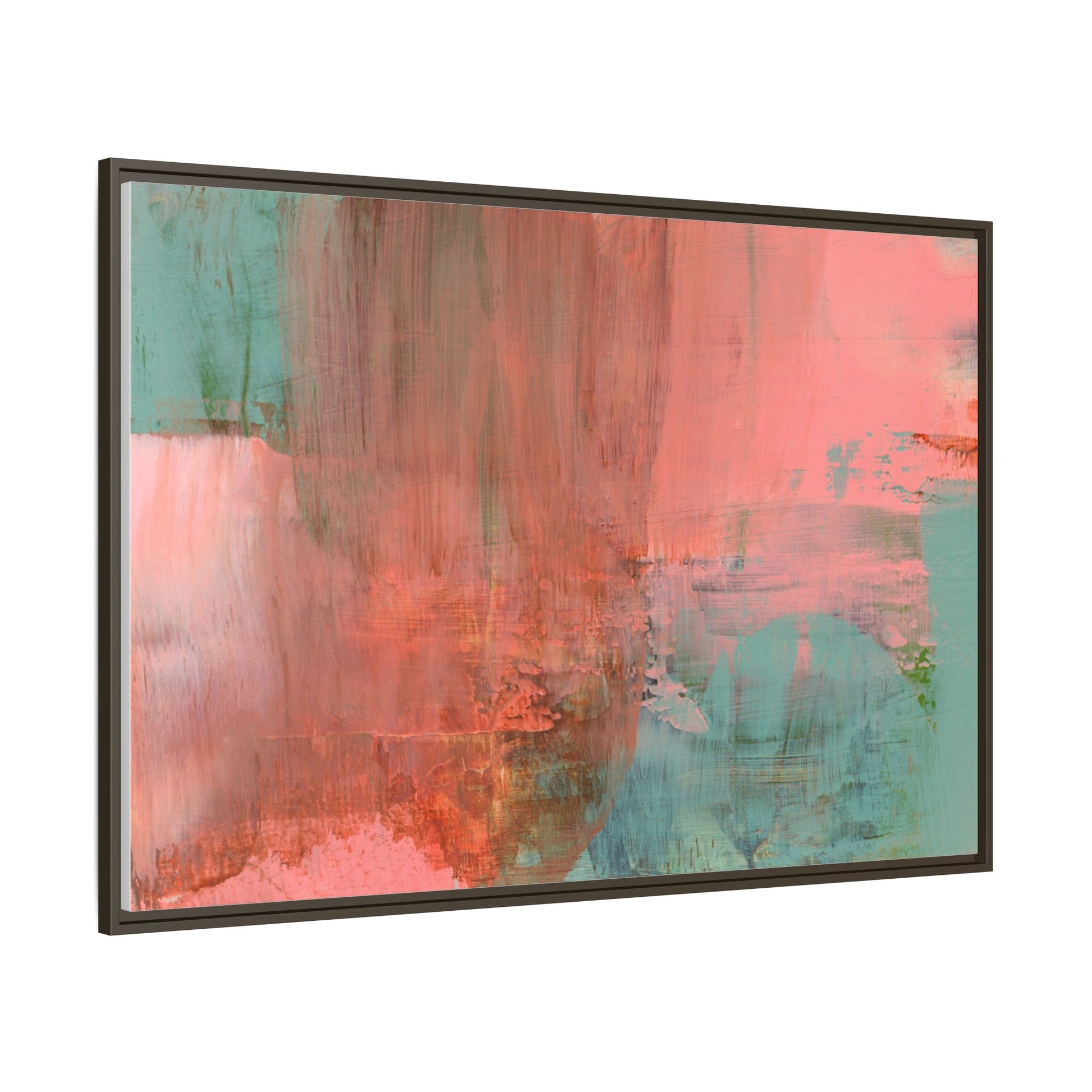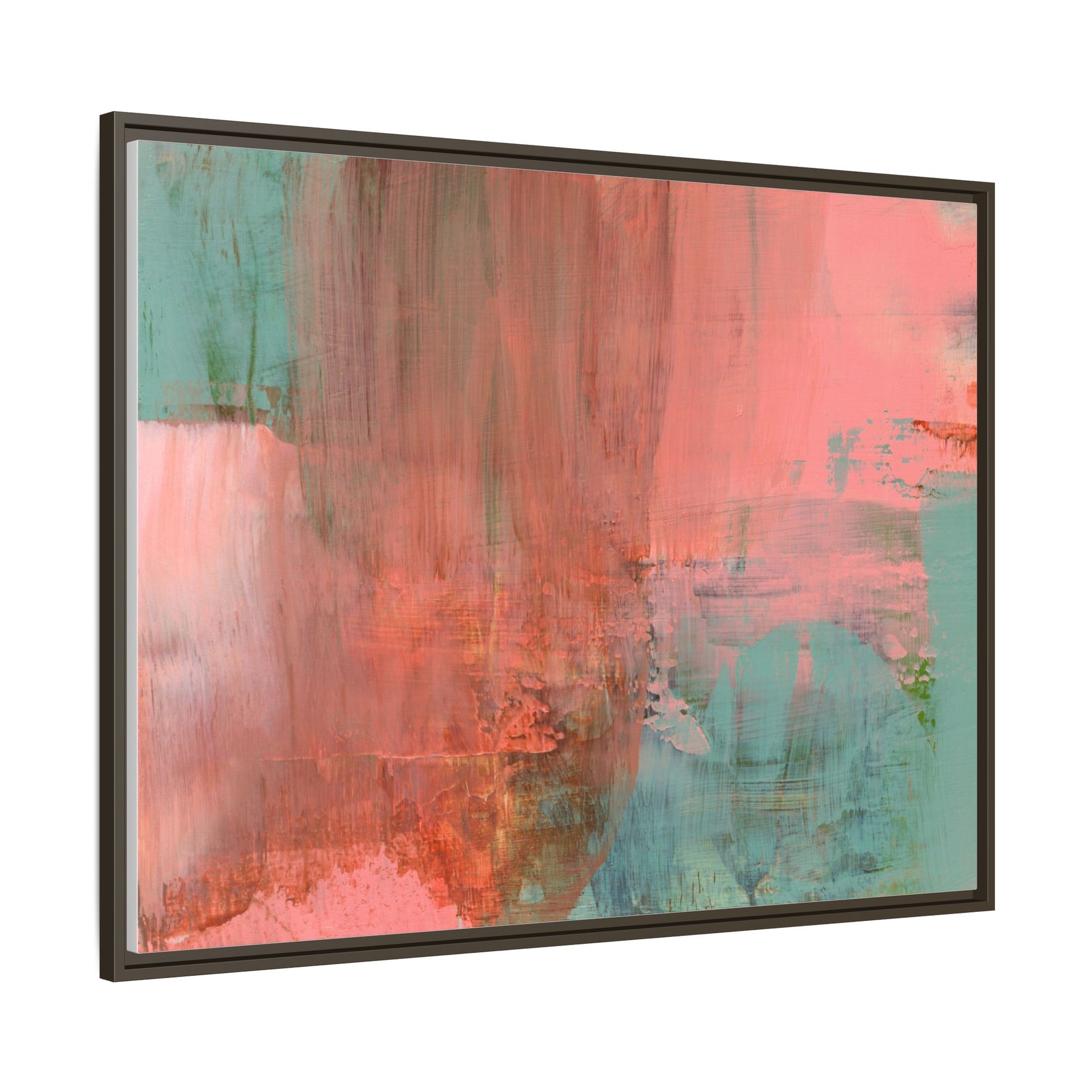 This captivating abstract painting is a harmonious blend of soft coral pink and muted teal blue tones, creating a dreamlike and ethereal visual composition. The artwork features fluid, vertical brushstrokes that seem to blend and bleed into each other, generating a sense of movement and organic transition between colors. Textural elements are prominent, with visible paint strokes and layered techniques that add depth and complexity to the image, revealing subtle variations in hue and intensity. The painting evokes a sense of atmospheric landscape or a meditative seascape, with the colors suggesting a sunset or dawn-like quality that blurs the boundaries between sky, water, and horizon. The overall effect is both calming and dynamic, inviting viewers to interpret the abstract forms and colors through their own emotional and visual perspective.