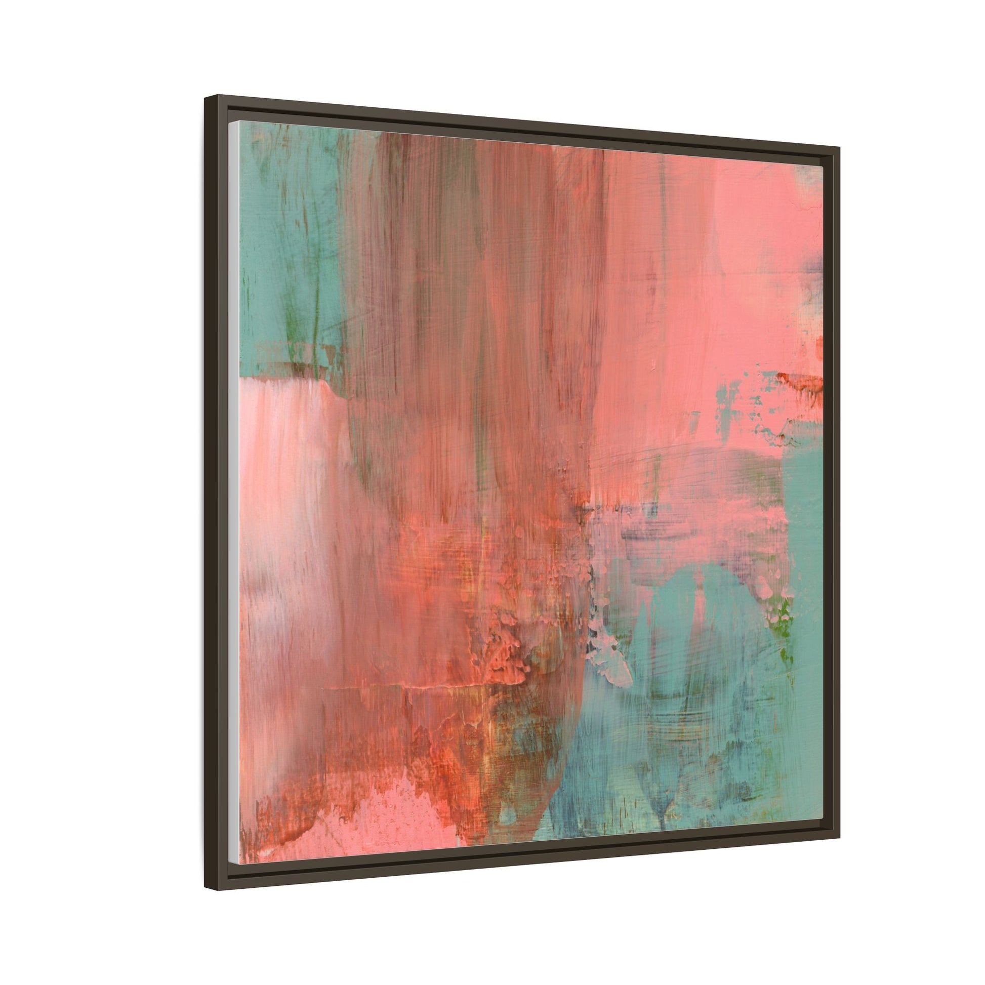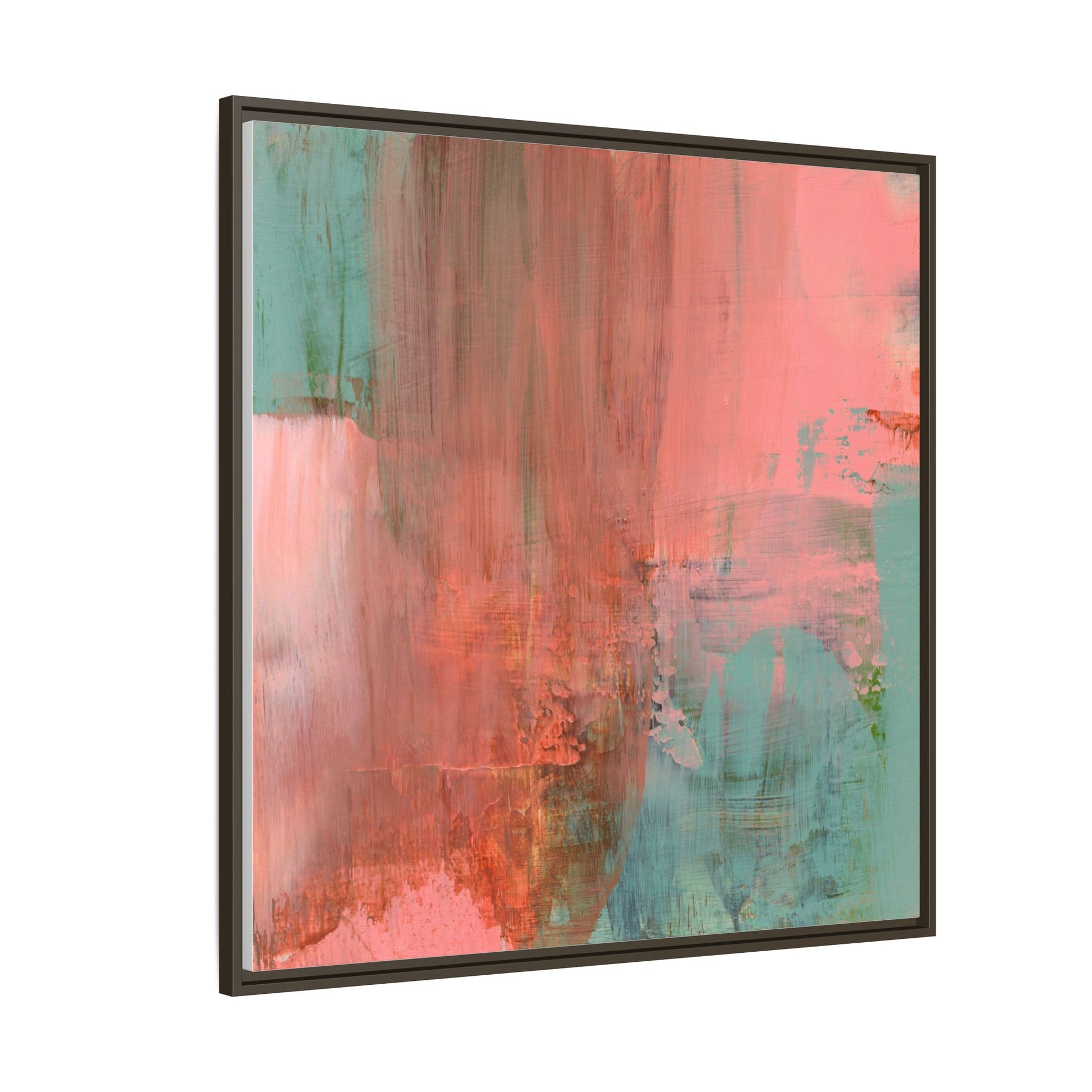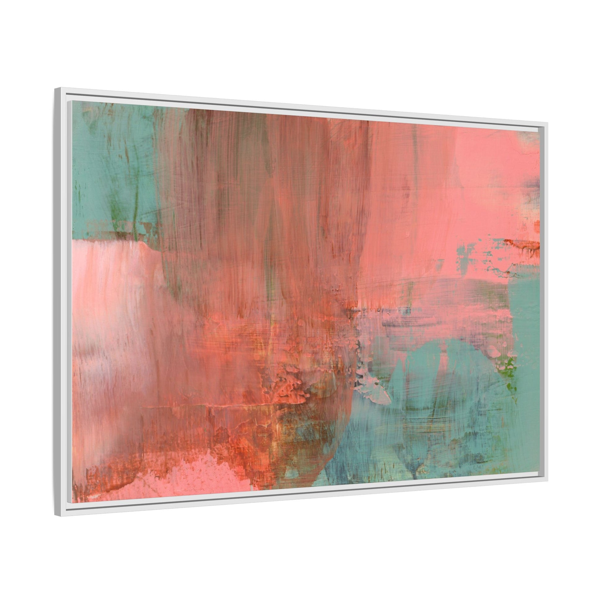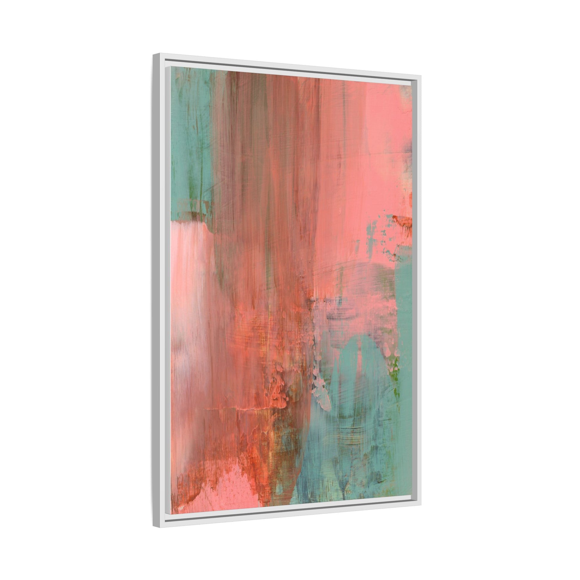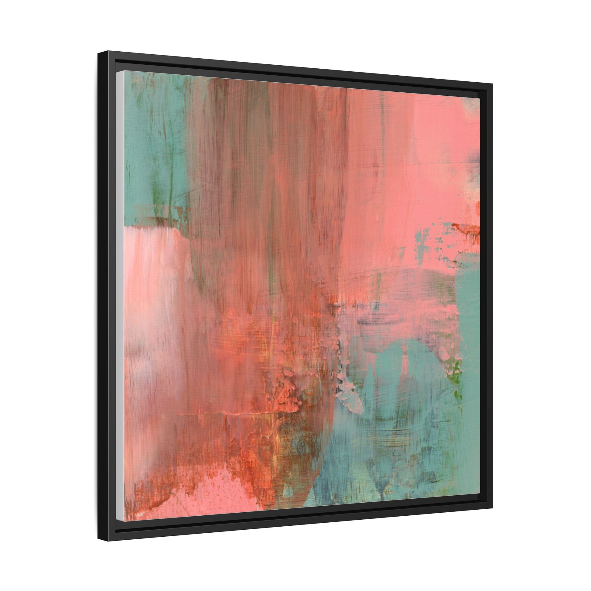 This captivating abstract painting is a harmonious blend of soft coral pink and muted teal blue tones, creating a dreamlike and ethereal visual composition. The artwork features fluid, vertical brushstrokes that seem to blend and bleed into each other, generating a sense of movement and organic transition between colors. Textural elements are prominent, with visible paint strokes and layered techniques that add depth and complexity to the image, revealing subtle variations in hue and intensity. The painting evokes a sense of atmospheric landscape or a meditative seascape, with the colors suggesting a sunset or dawn-like quality that blurs the boundaries between sky, water, and horizon. The overall effect is both calming and dynamic, inviting viewers to interpret the abstract forms and colors through their own emotional and visual perspective.