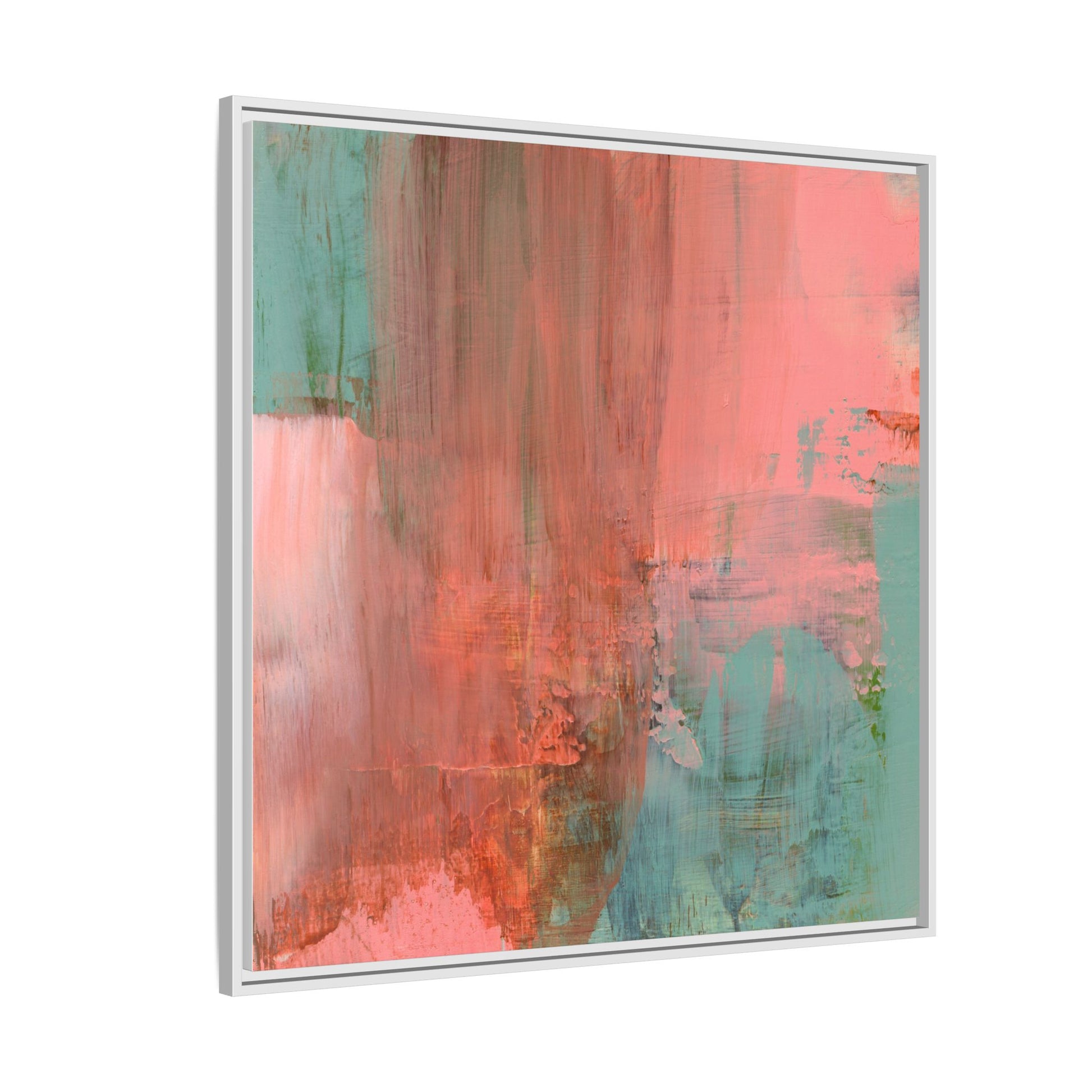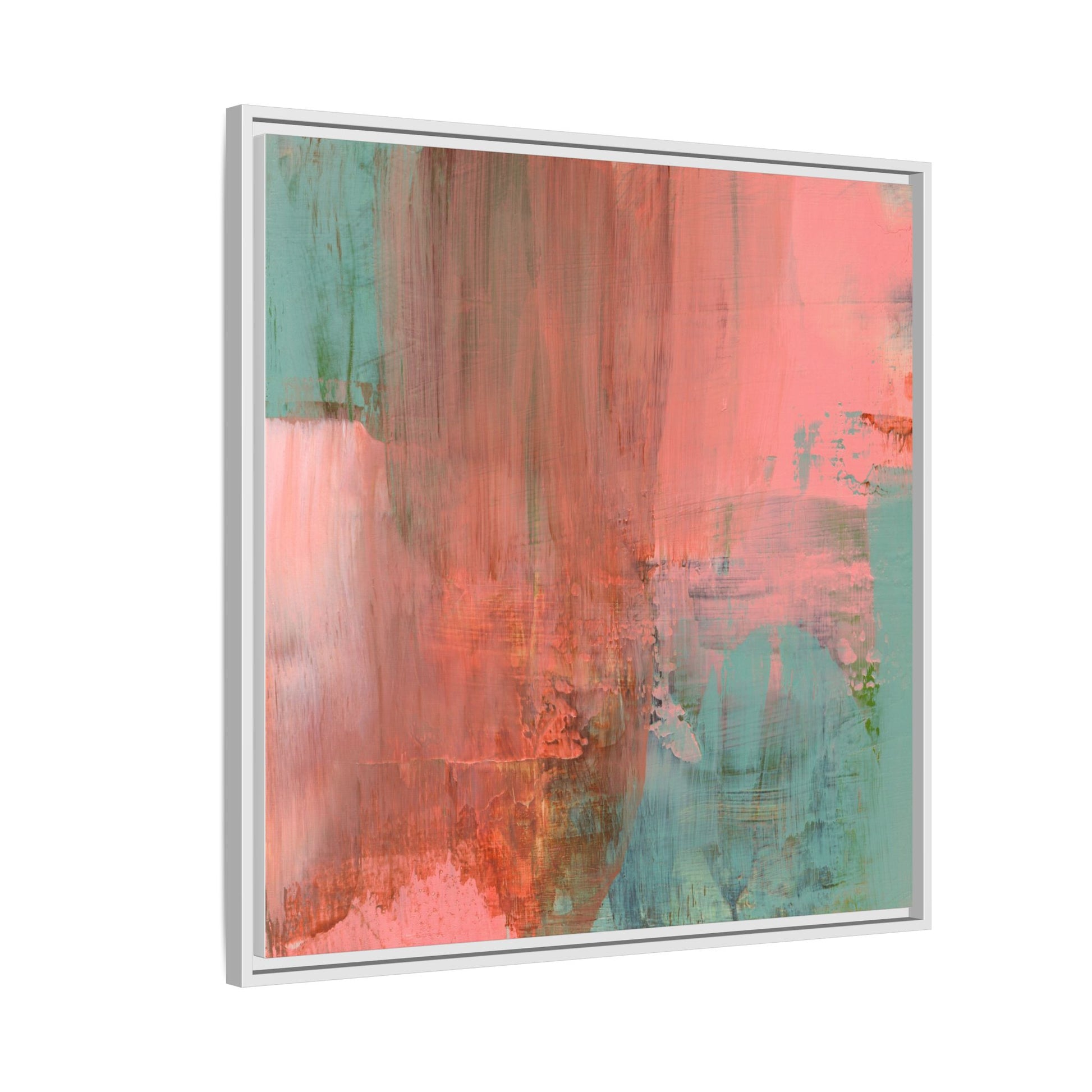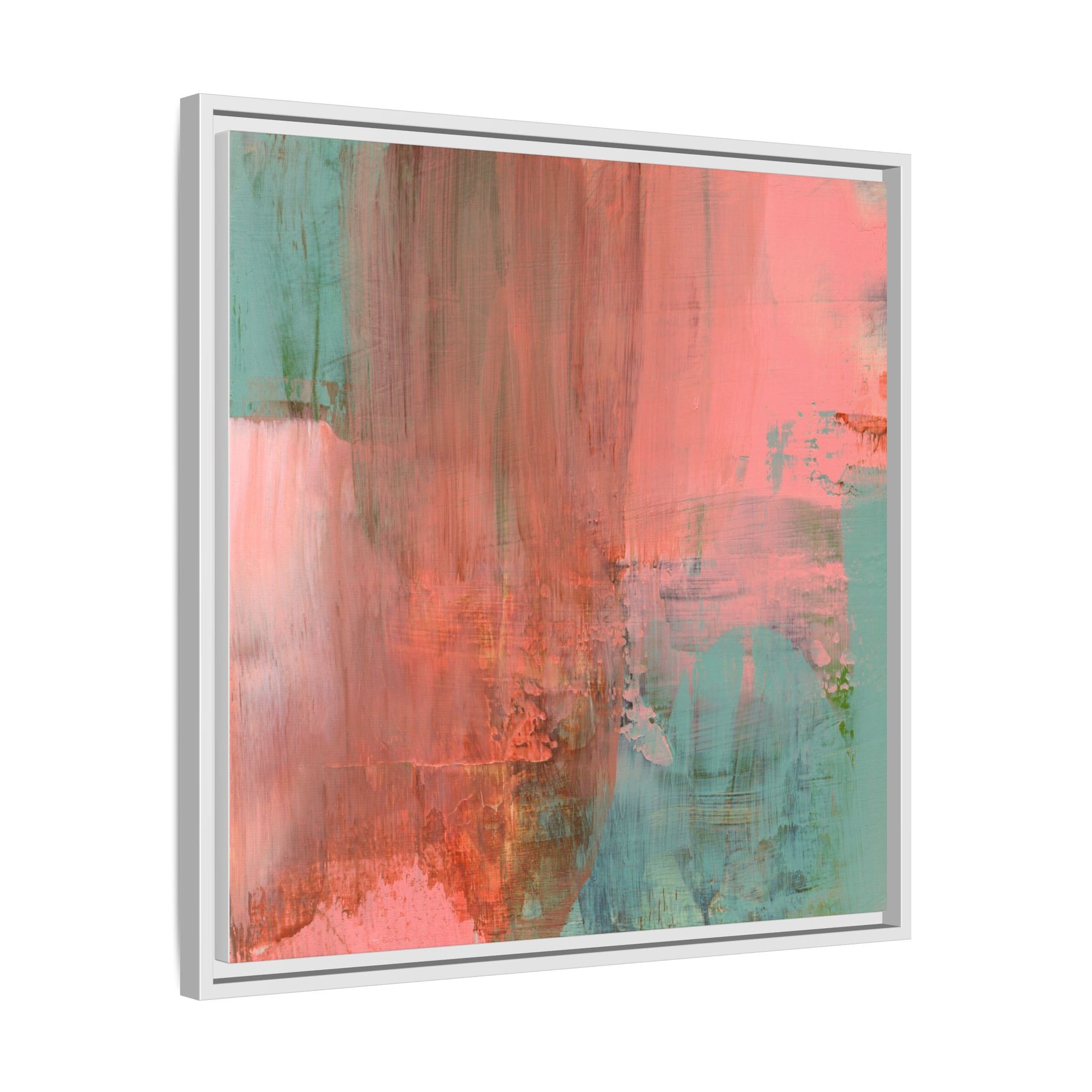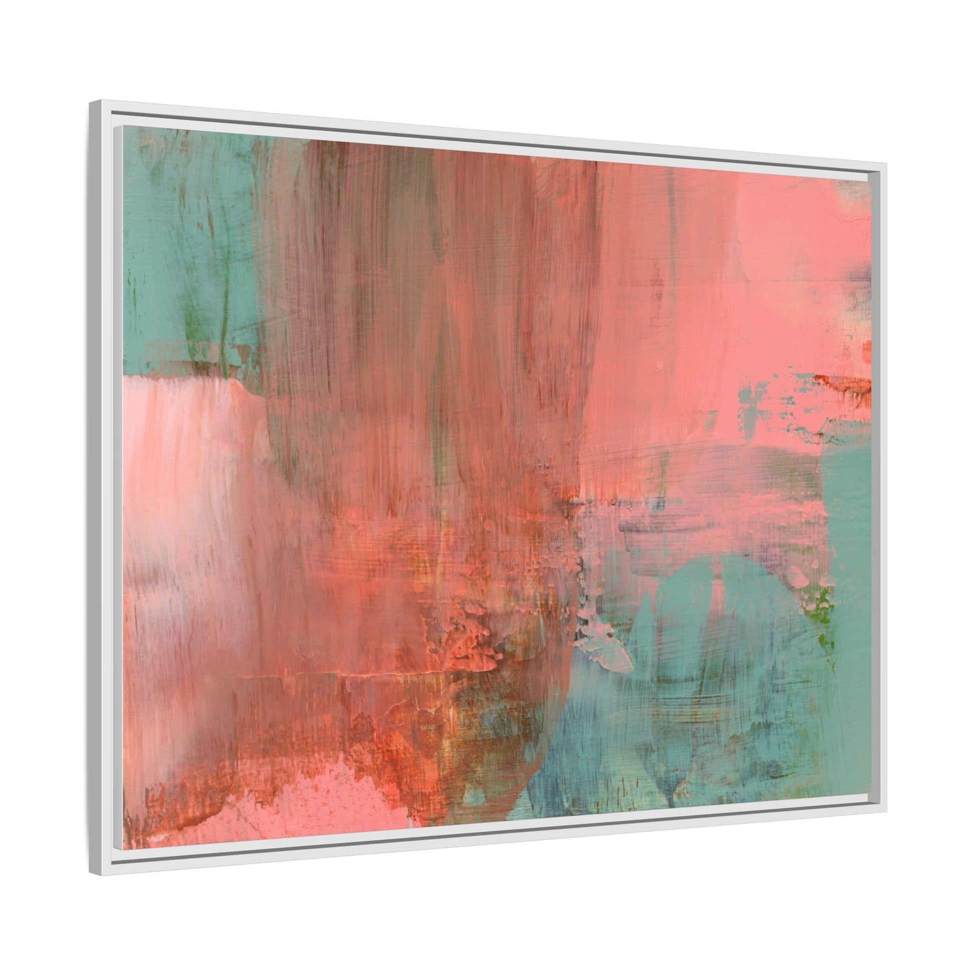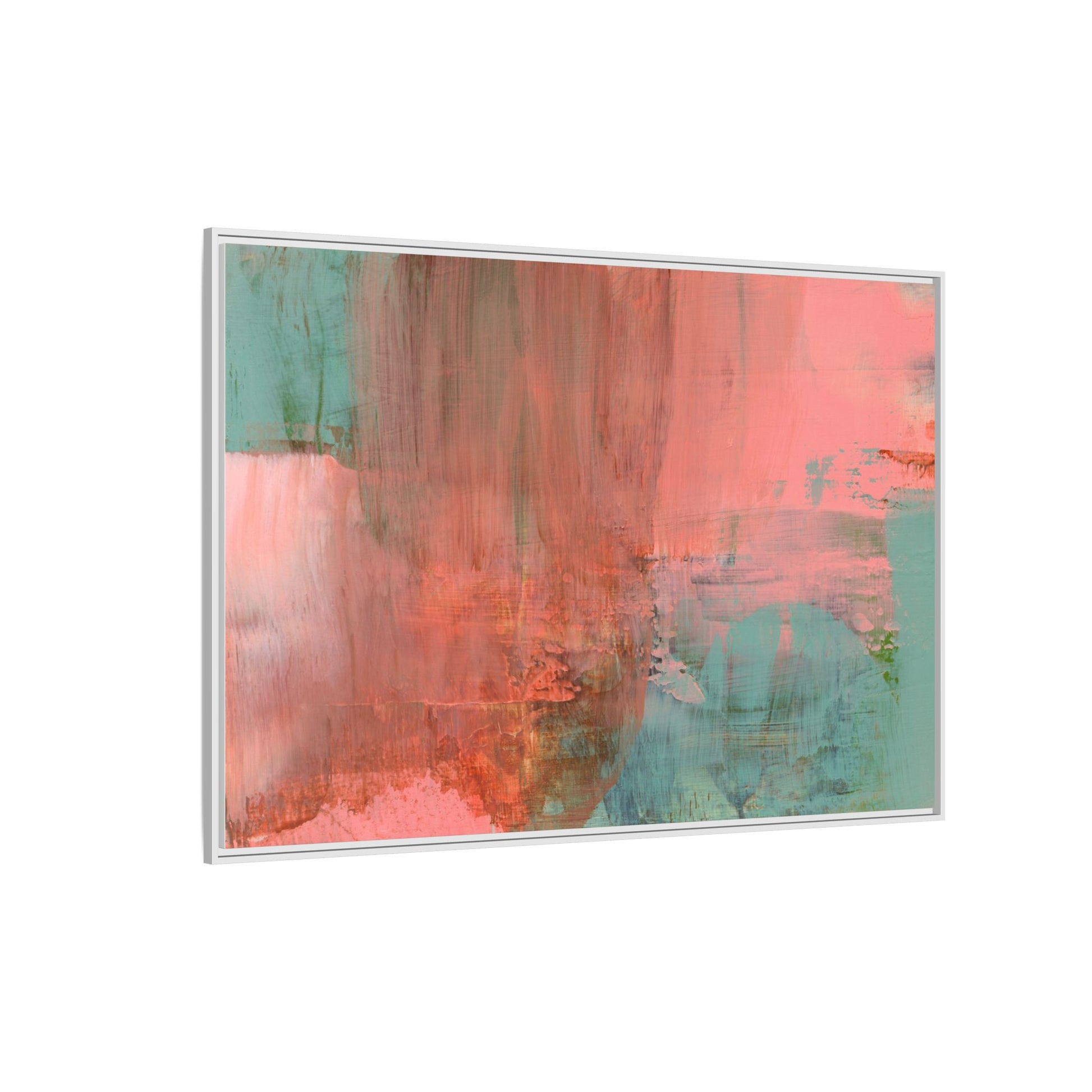 This captivating abstract painting is a harmonious blend of soft coral pink and muted teal blue tones, creating a dreamlike and ethereal visual composition. The artwork features fluid, vertical brushstrokes that seem to blend and bleed into each other, generating a sense of movement and organic transition between colors. Textural elements are prominent, with visible paint strokes and layered techniques that add depth and complexity to the image, revealing subtle variations in hue and intensity. The painting evokes a sense of atmospheric landscape or a meditative seascape, with the colors suggesting a sunset or dawn-like quality that blurs the boundaries between sky, water, and horizon. The overall effect is both calming and dynamic, inviting viewers to interpret the abstract forms and colors through their own emotional and visual perspective.