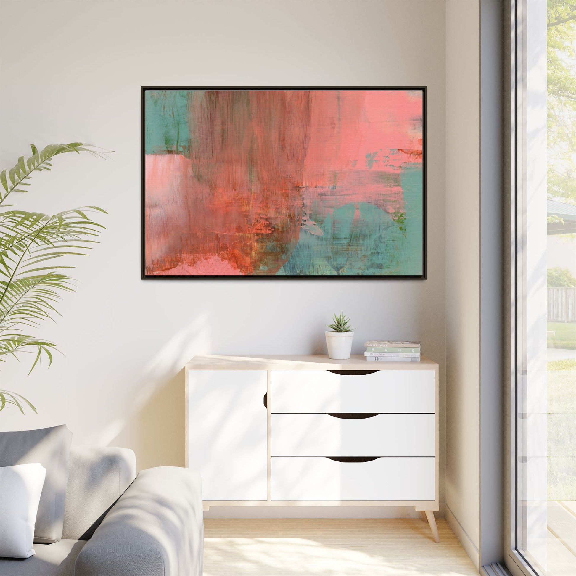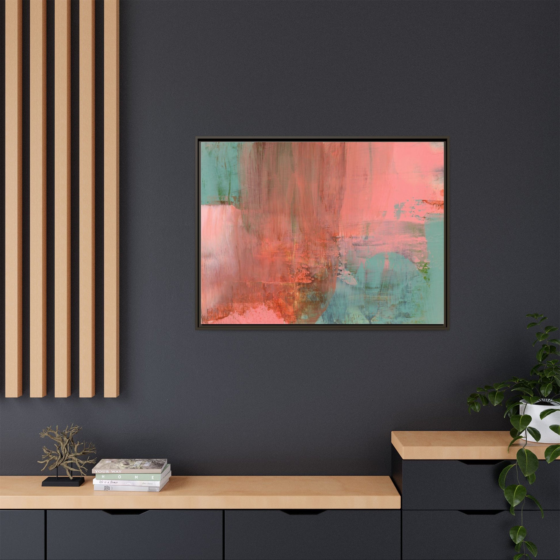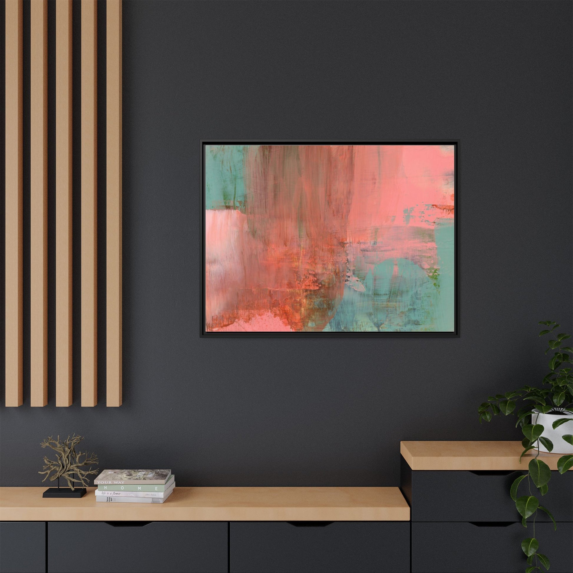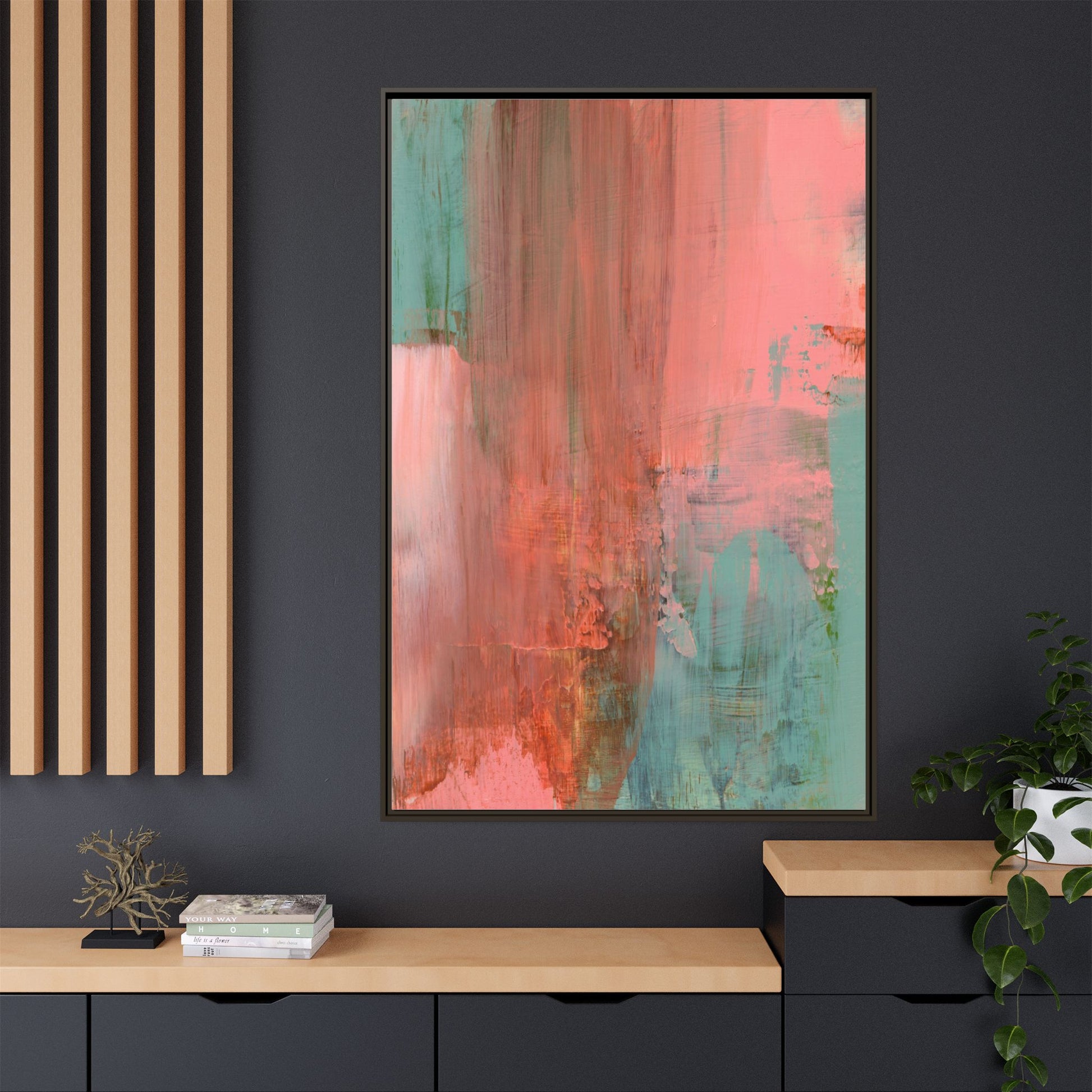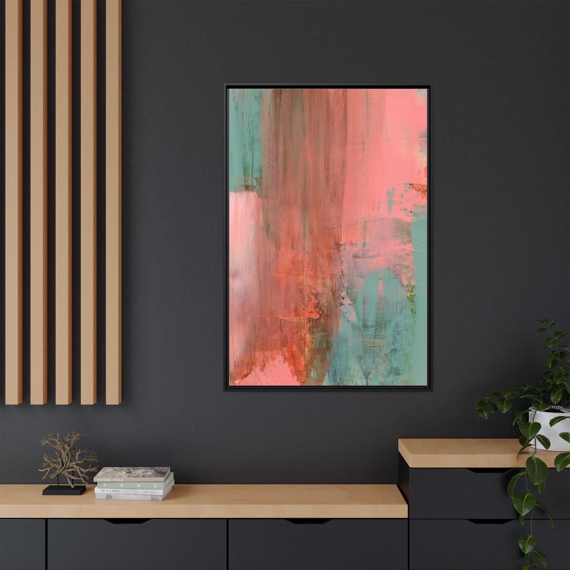 This captivating abstract painting is a harmonious blend of soft coral pink and muted teal blue tones, creating a dreamlike and ethereal visual composition. The artwork features fluid, vertical brushstrokes that seem to blend and bleed into each other, generating a sense of movement and organic transition between colors. Textural elements are prominent, with visible paint strokes and layered techniques that add depth and complexity to the image, revealing subtle variations in hue and intensity. The painting evokes a sense of atmospheric landscape or a meditative seascape, with the colors suggesting a sunset or dawn-like quality that blurs the boundaries between sky, water, and horizon. The overall effect is both calming and dynamic, inviting viewers to interpret the abstract forms and colors through their own emotional and visual perspective.