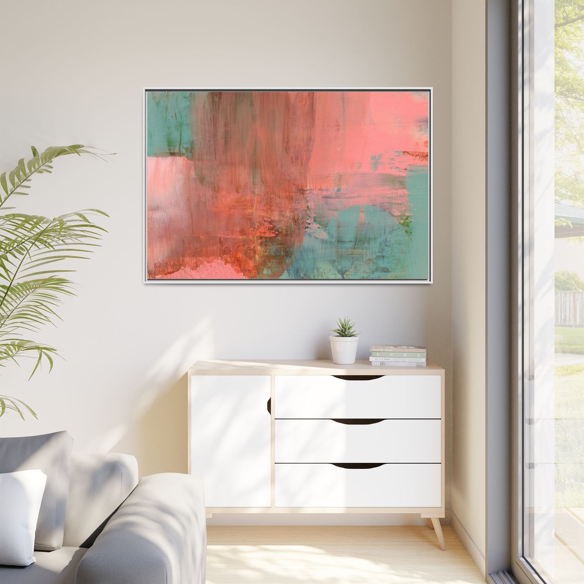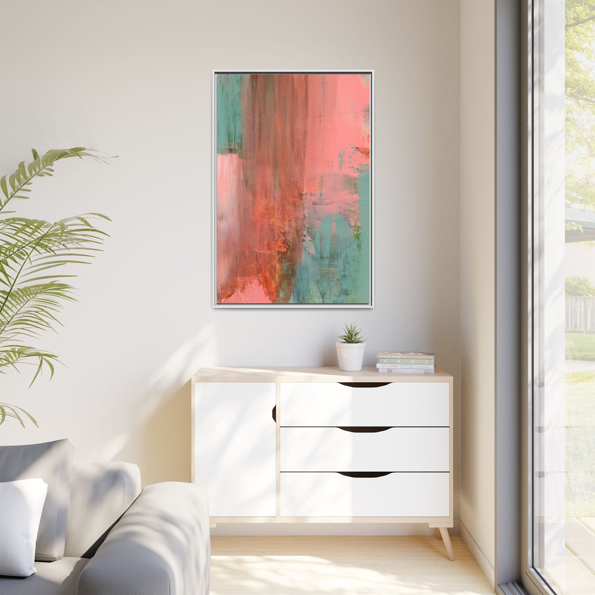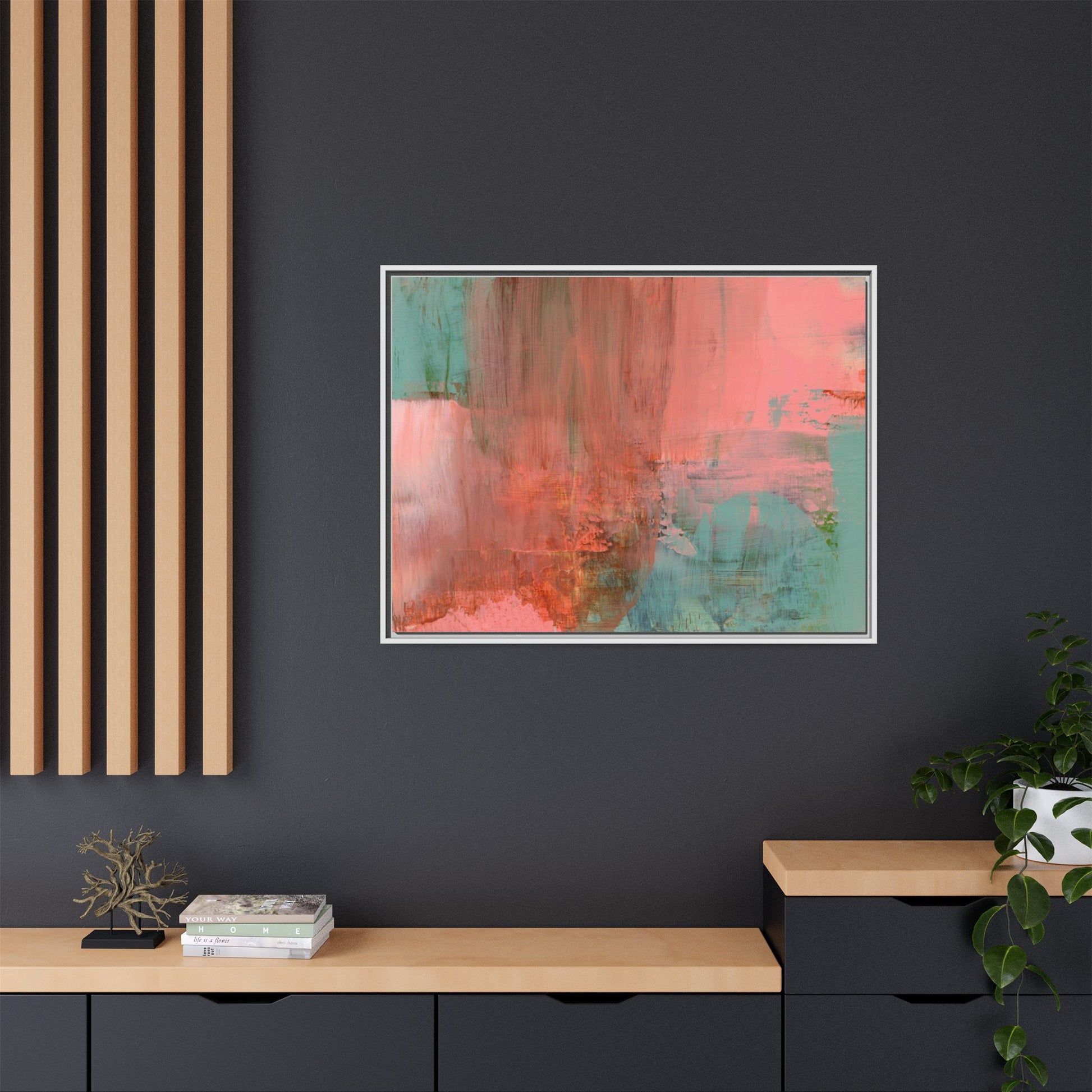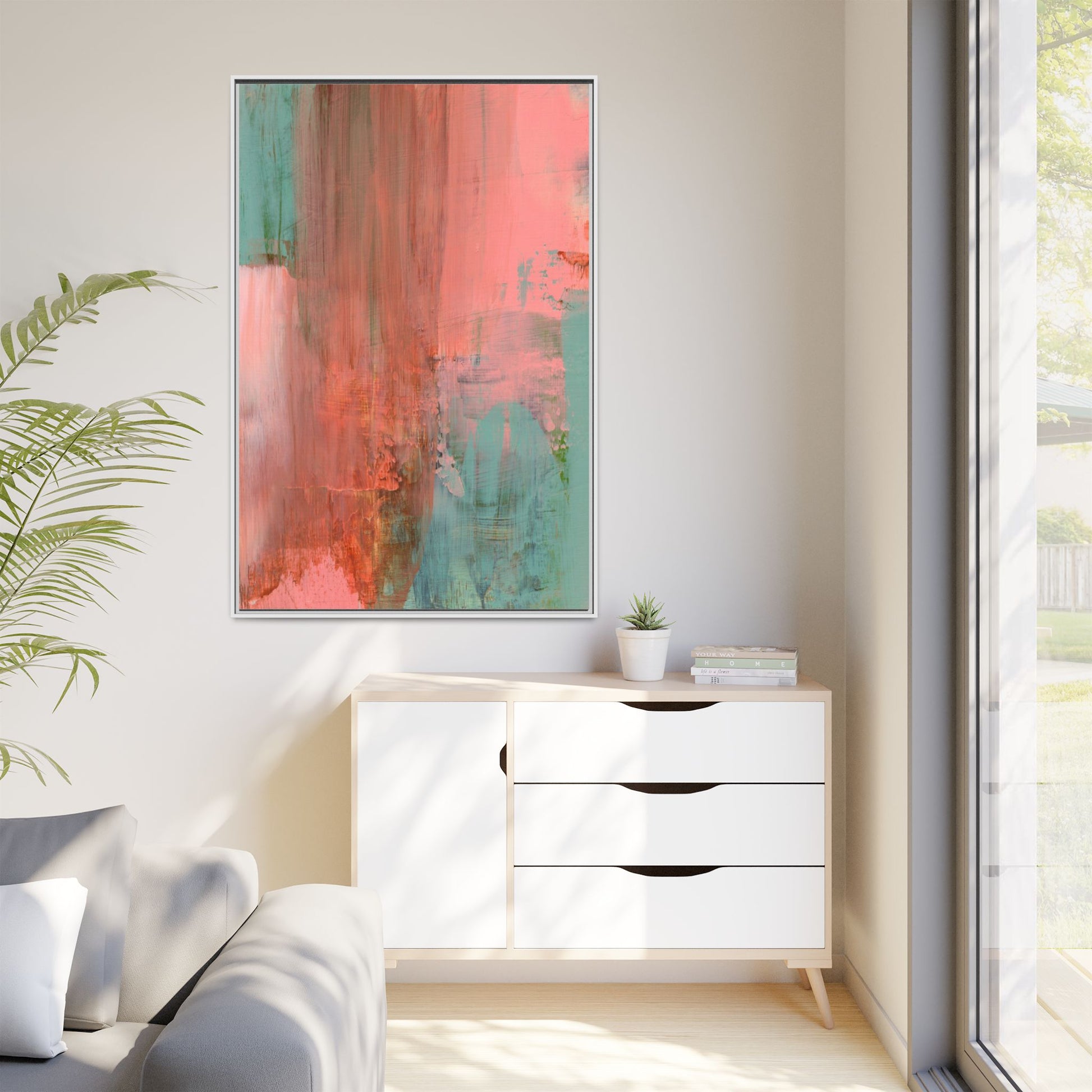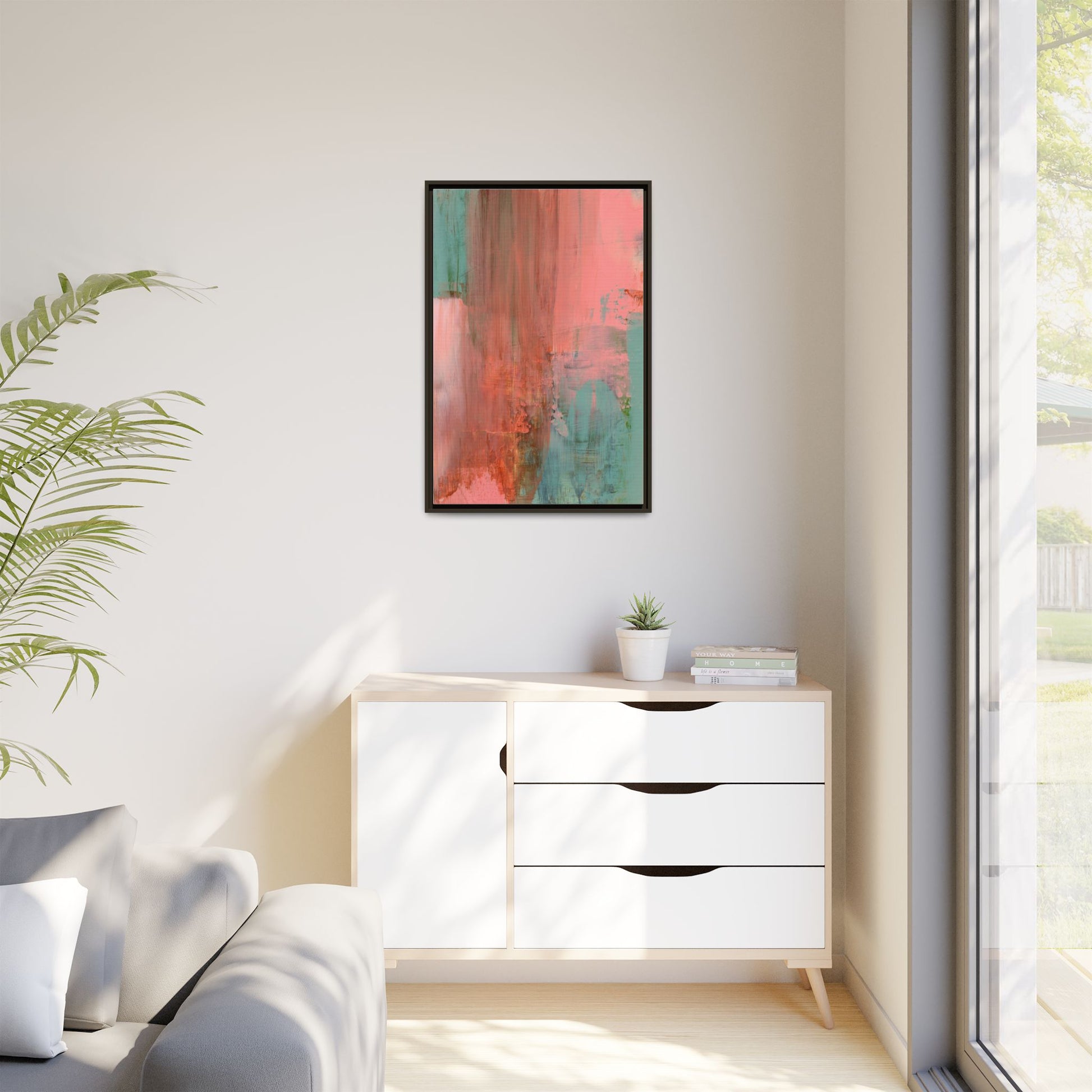 This captivating abstract painting is a harmonious blend of soft coral pink and muted teal blue tones, creating a dreamlike and ethereal visual composition. The artwork features fluid, vertical brushstrokes that seem to blend and bleed into each other, generating a sense of movement and organic transition between colors. Textural elements are prominent, with visible paint strokes and layered techniques that add depth and complexity to the image, revealing subtle variations in hue and intensity. The painting evokes a sense of atmospheric landscape or a meditative seascape, with the colors suggesting a sunset or dawn-like quality that blurs the boundaries between sky, water, and horizon. The overall effect is both calming and dynamic, inviting viewers to interpret the abstract forms and colors through their own emotional and visual perspective.