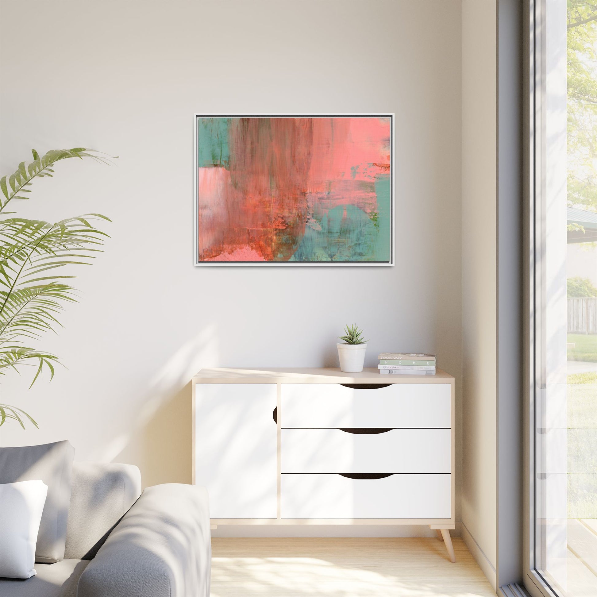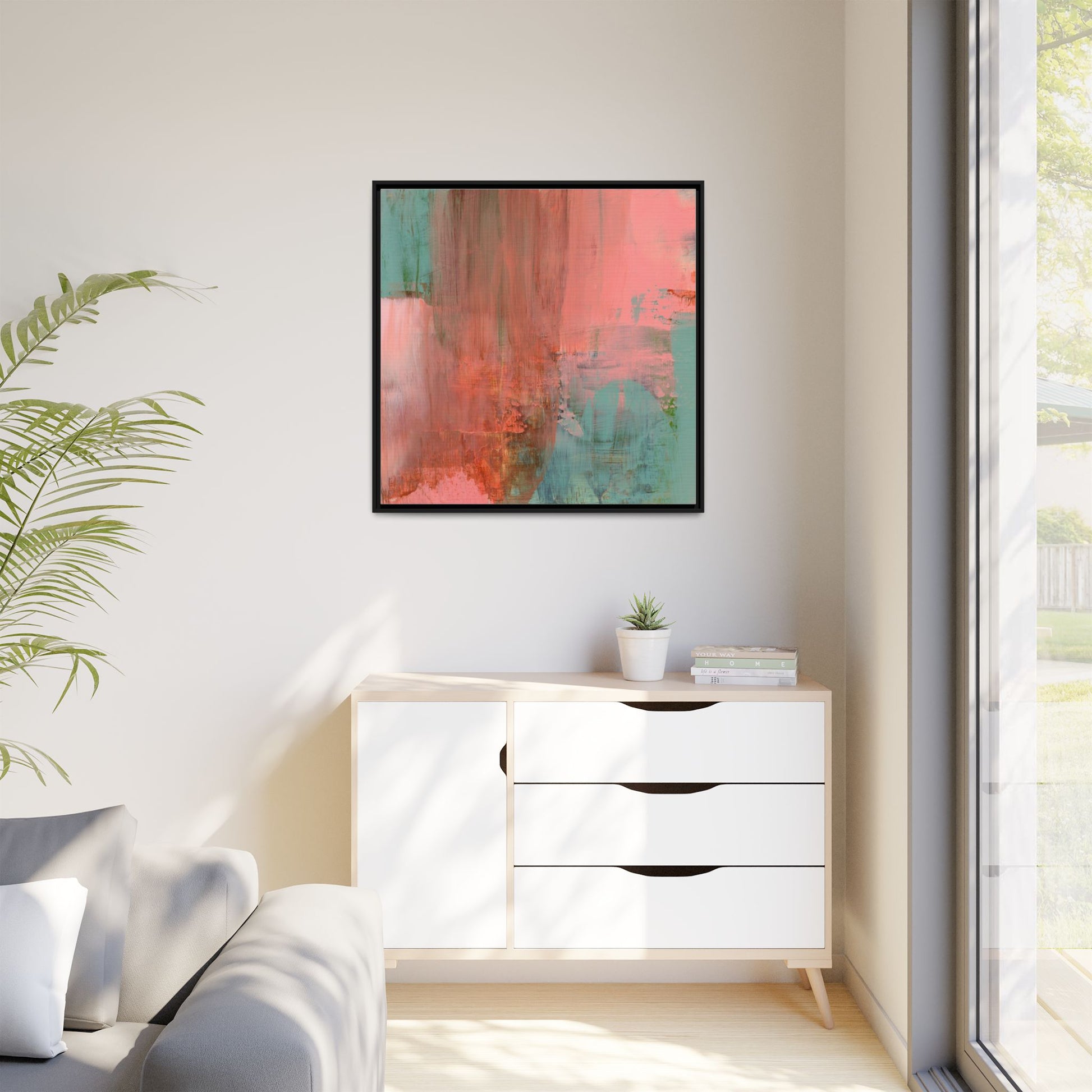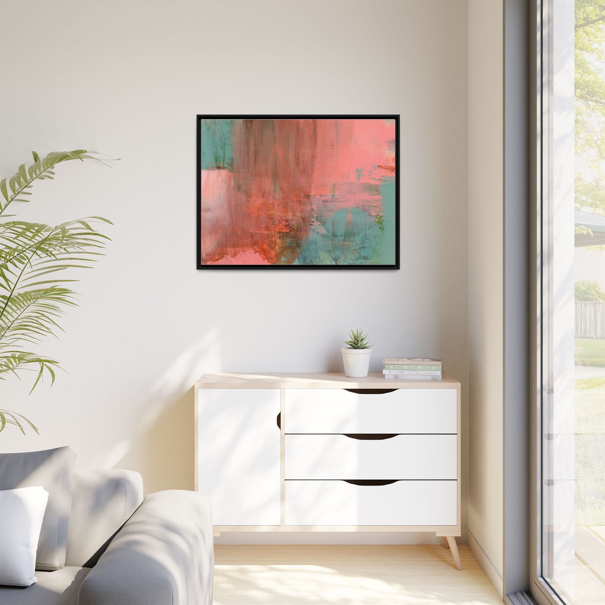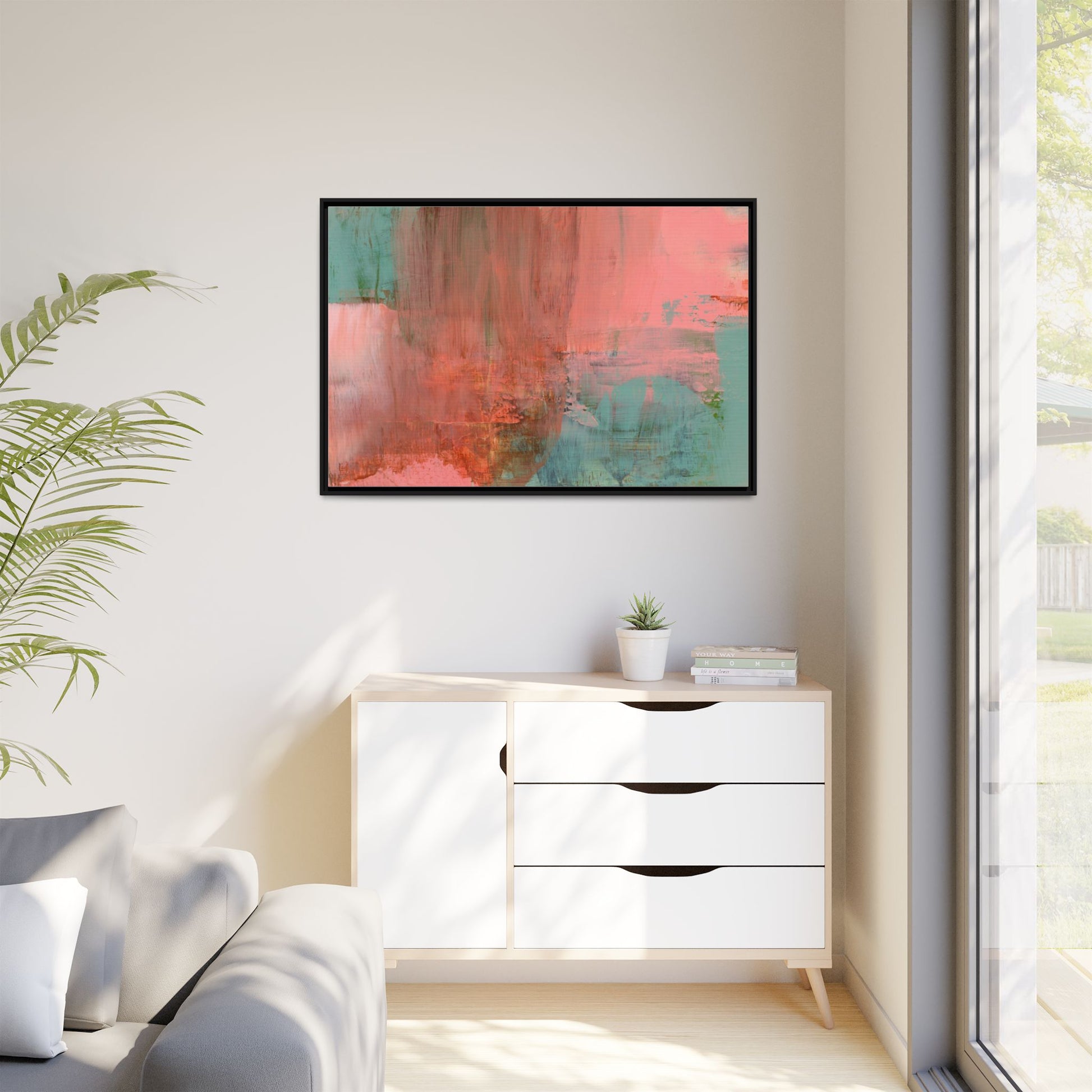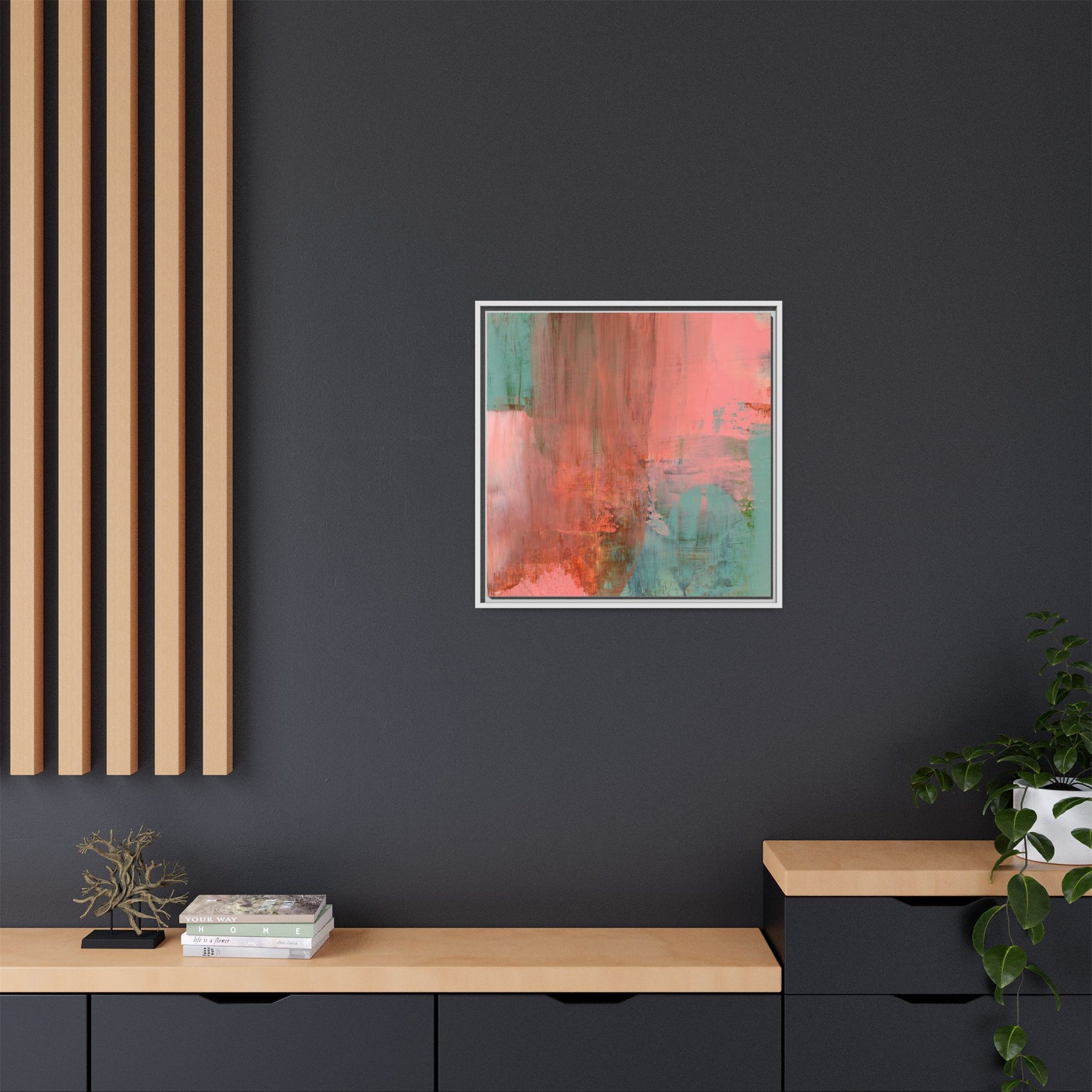 This captivating abstract painting is a harmonious blend of soft coral pink and muted teal blue tones, creating a dreamlike and ethereal visual composition. The artwork features fluid, vertical brushstrokes that seem to blend and bleed into each other, generating a sense of movement and organic transition between colors. Textural elements are prominent, with visible paint strokes and layered techniques that add depth and complexity to the image, revealing subtle variations in hue and intensity. The painting evokes a sense of atmospheric landscape or a meditative seascape, with the colors suggesting a sunset or dawn-like quality that blurs the boundaries between sky, water, and horizon. The overall effect is both calming and dynamic, inviting viewers to interpret the abstract forms and colors through their own emotional and visual perspective.