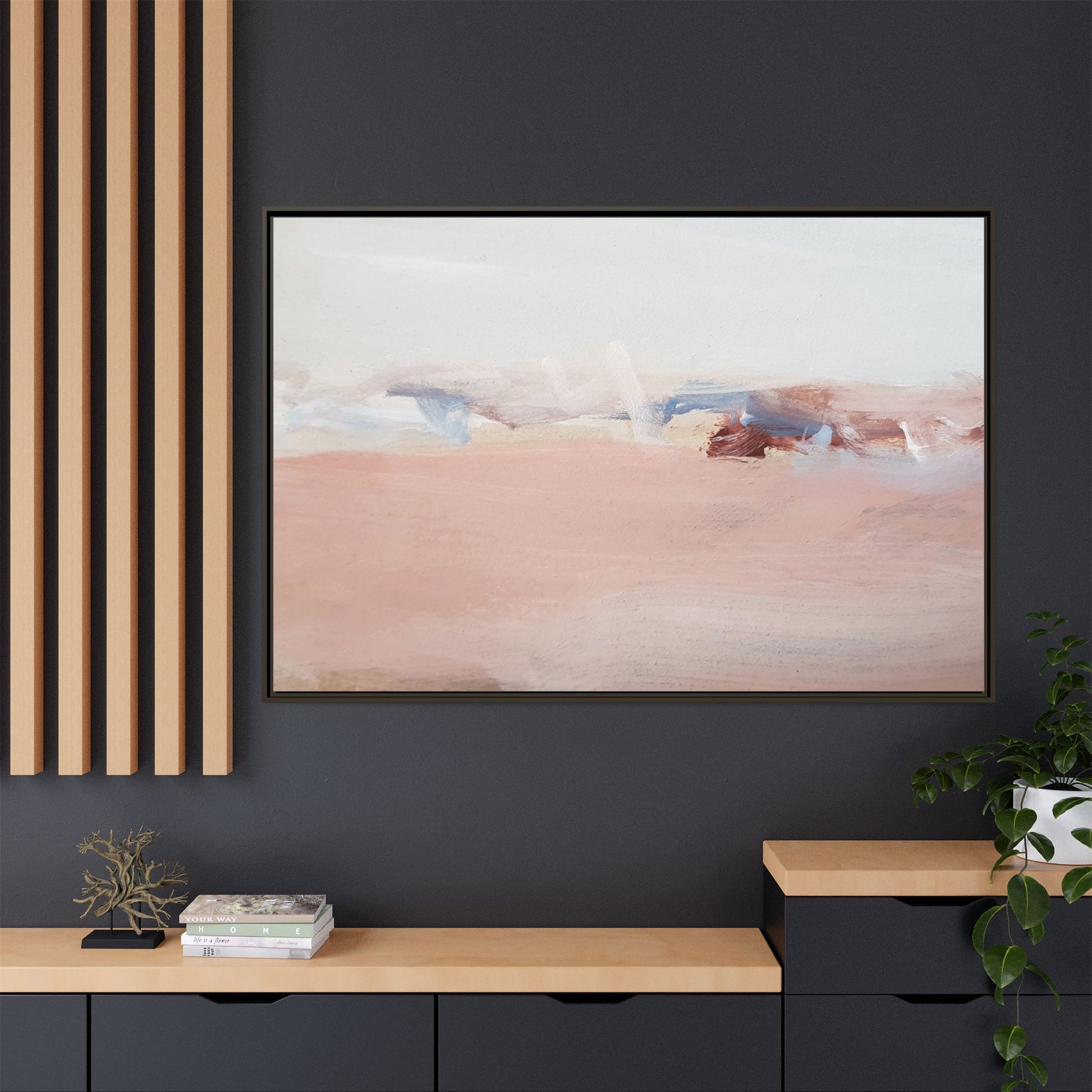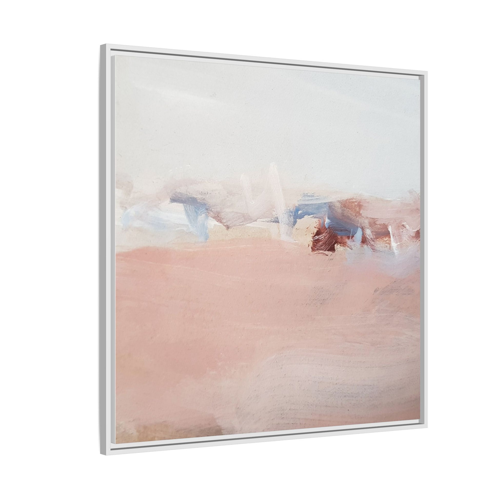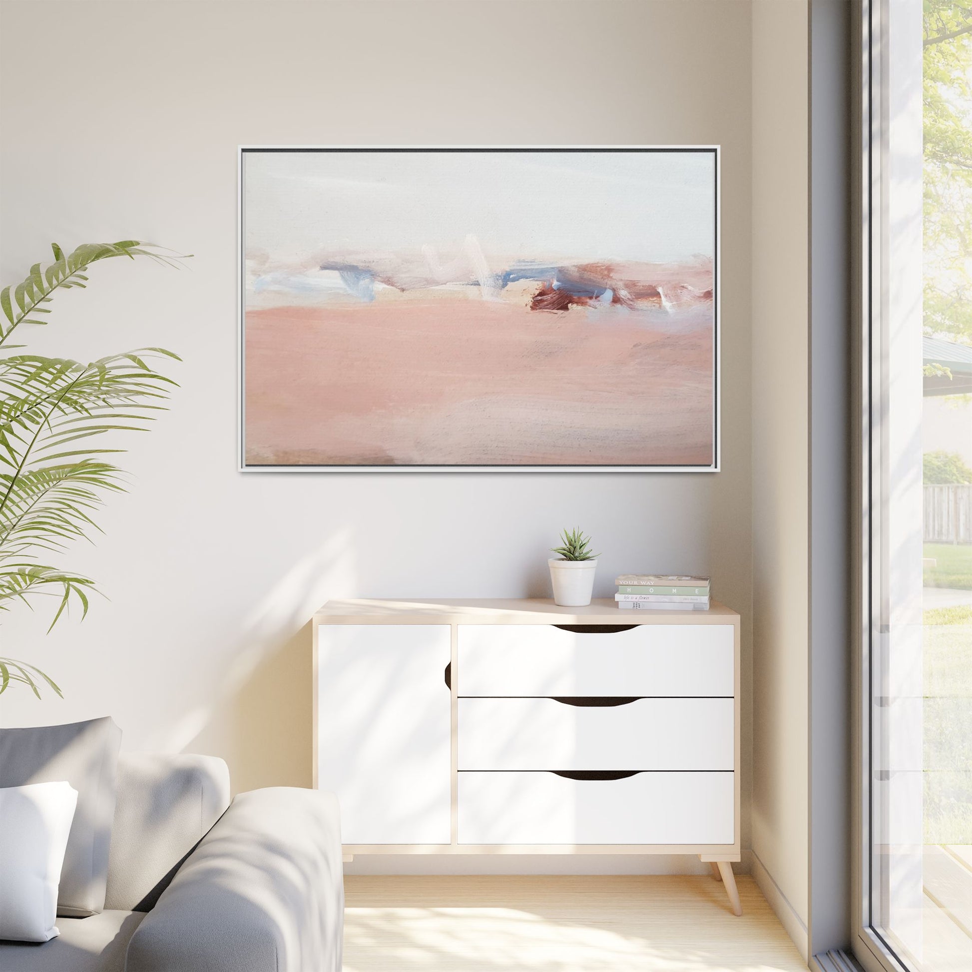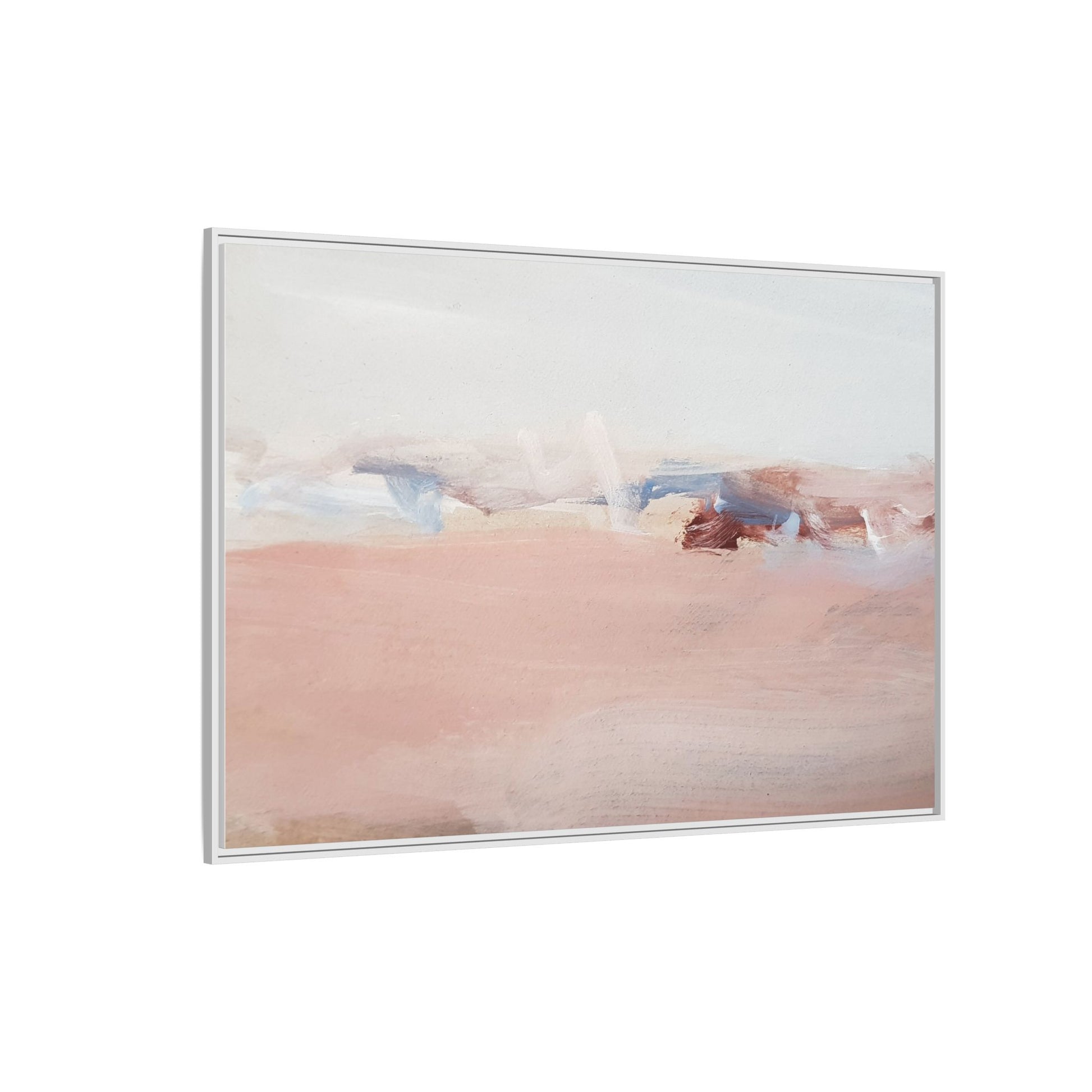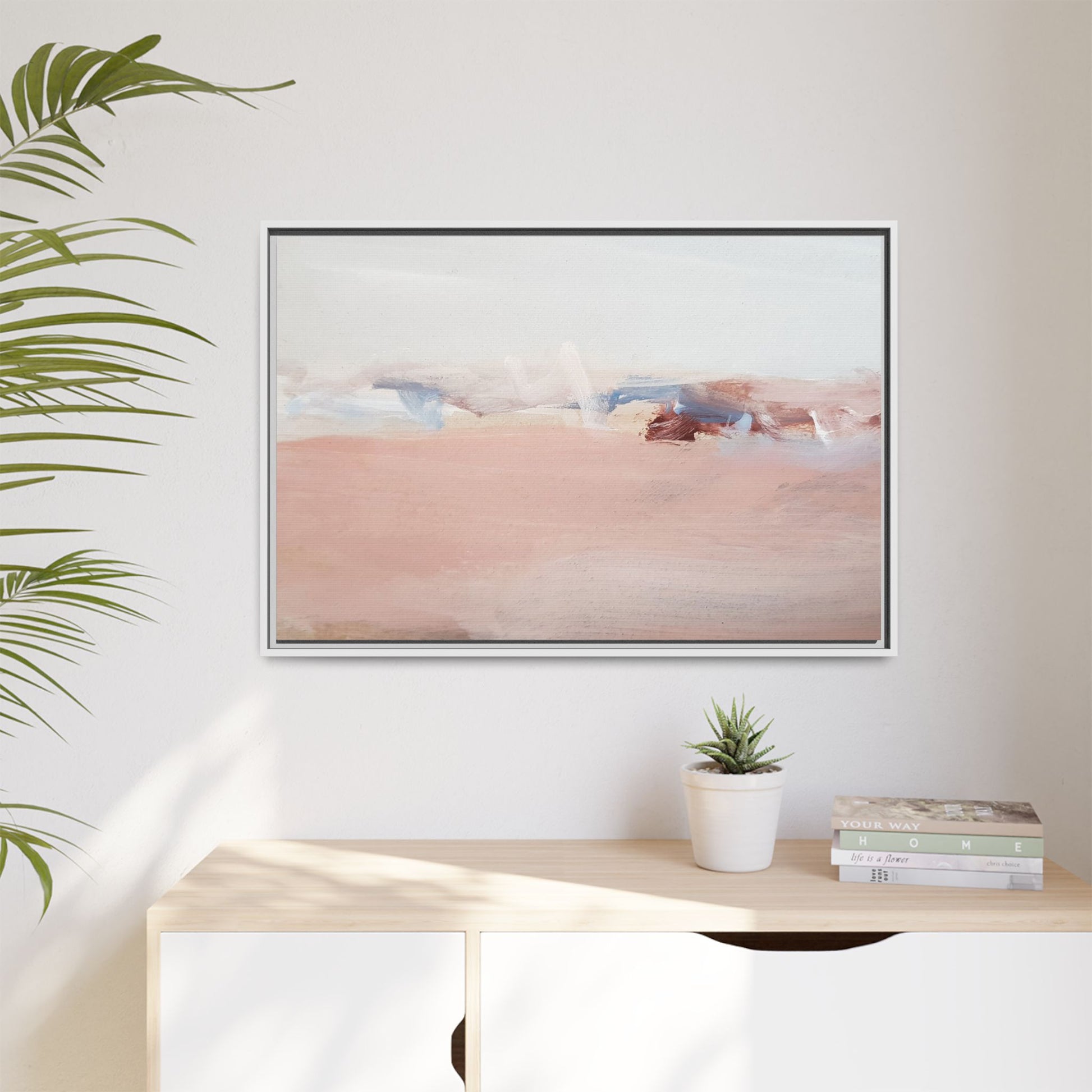 This abstract painting features a soft, ethereal landscape composed of delicate pastel hues. The color palette is predominantly blush pink and muted blue-gray, creating a serene and dreamy atmosphere. Horizontal layers of color blend seamlessly, suggesting a distant horizon or misty landscape. Subtle brushstrokes and gentle color variations add depth and texture to the composition, creating a sense of movement and tranquility. The artwork appears to be a minimalist, contemporary piece that evokes a sense of calm and emotional introspection.