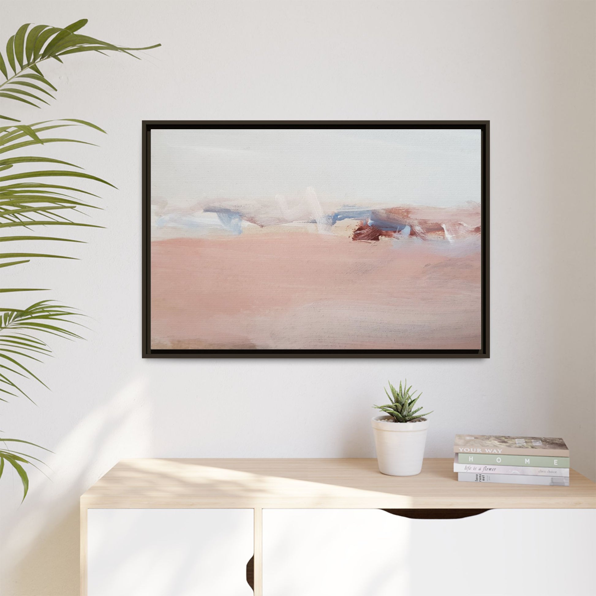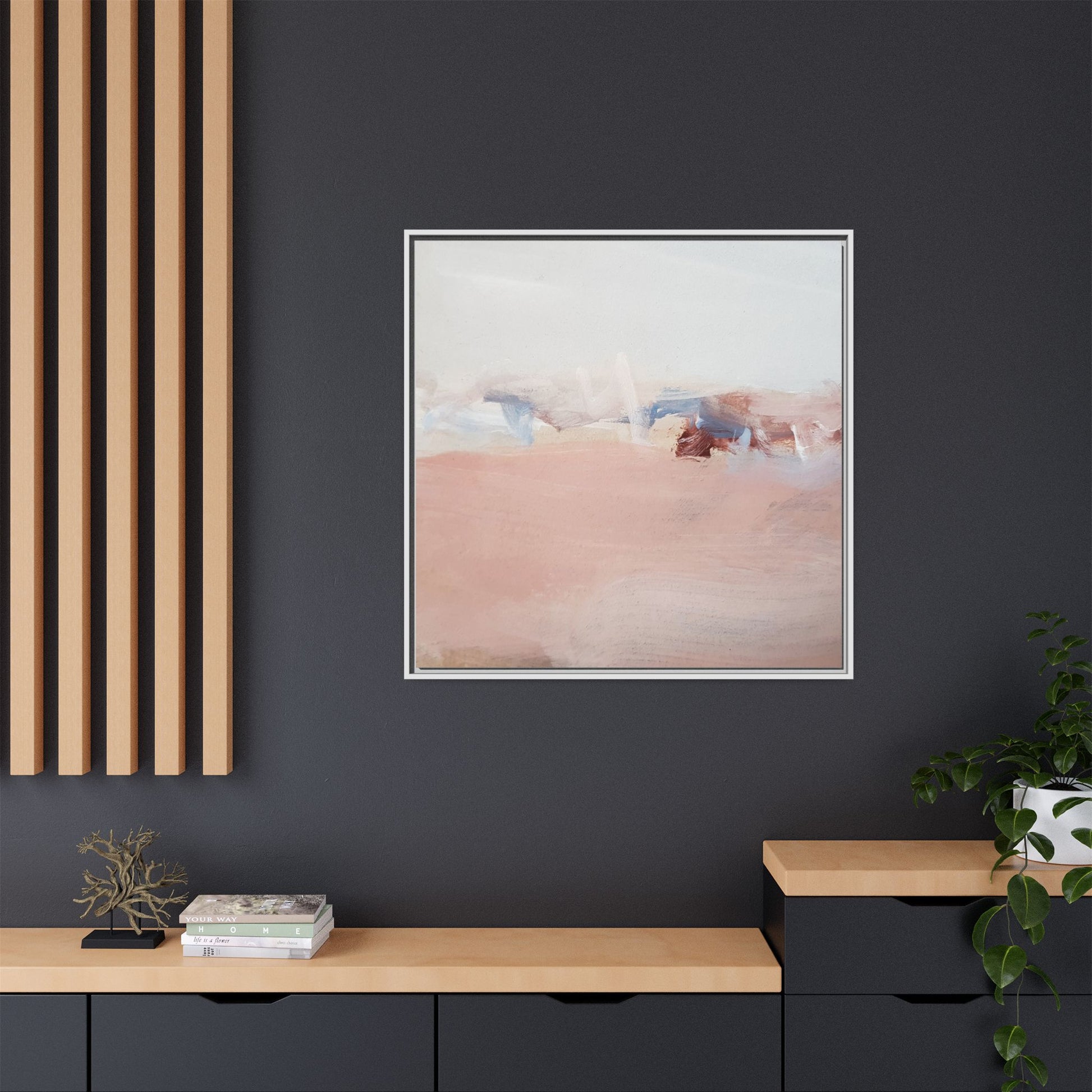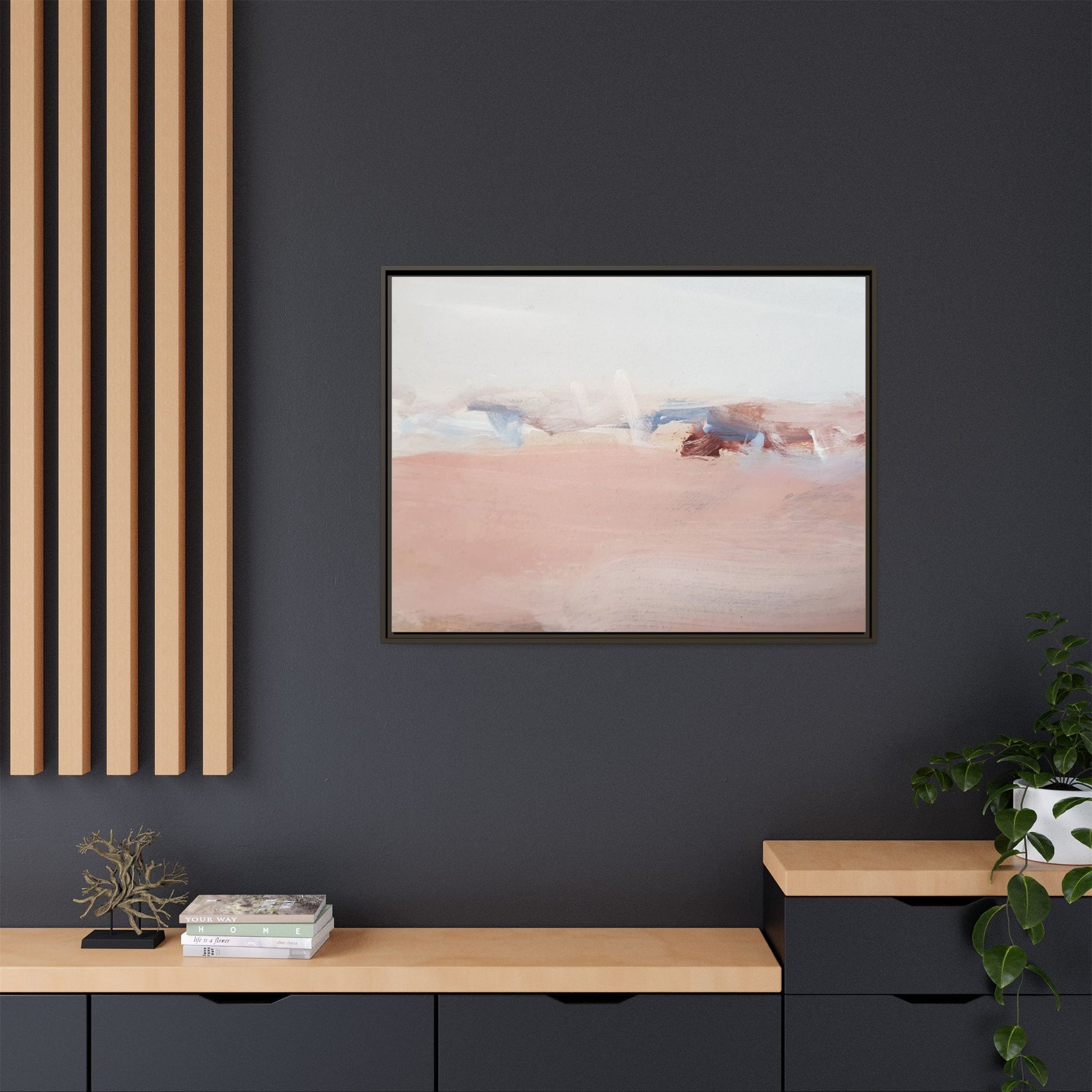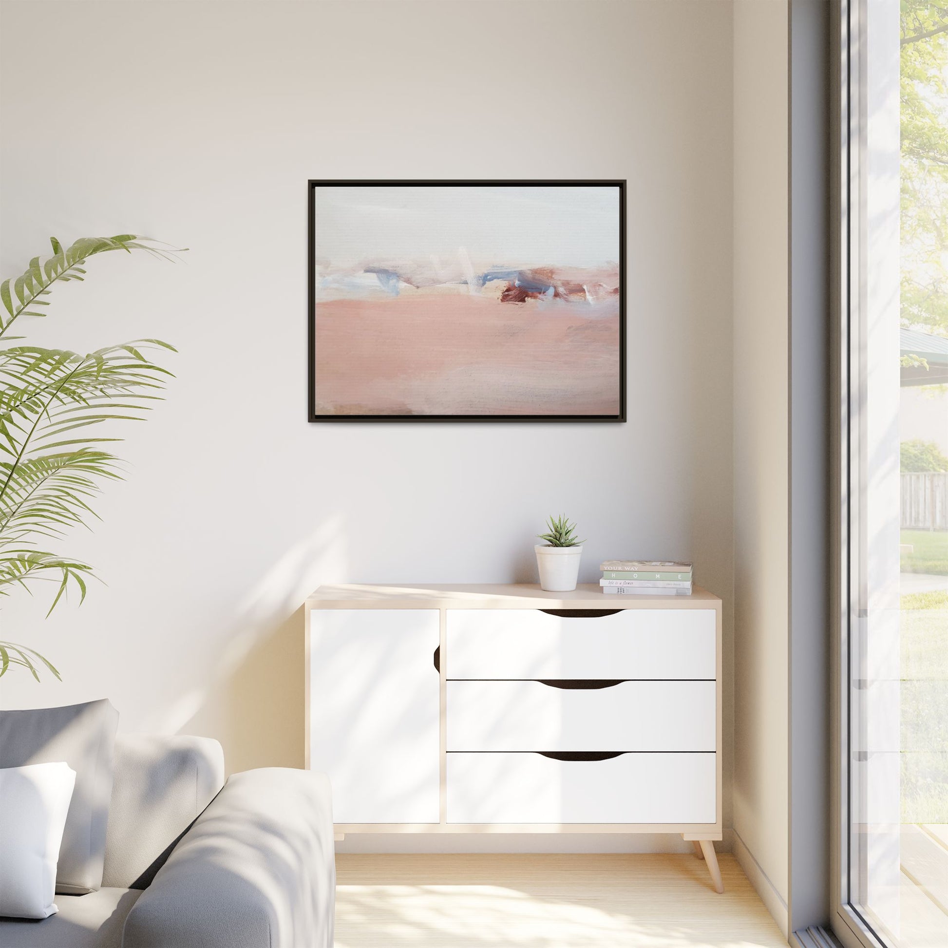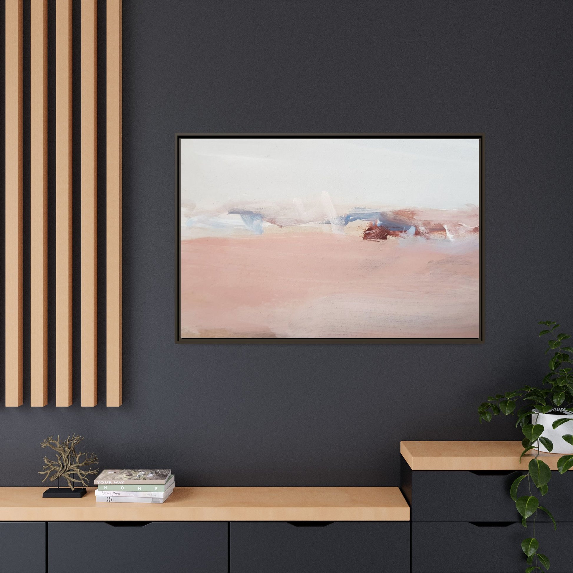 This abstract painting features a soft, ethereal landscape composed of delicate pastel hues. The color palette is predominantly blush pink and muted blue-gray, creating a serene and dreamy atmosphere. Horizontal layers of color blend seamlessly, suggesting a distant horizon or misty landscape. Subtle brushstrokes and gentle color variations add depth and texture to the composition, creating a sense of movement and tranquility. The artwork appears to be a minimalist, contemporary piece that evokes a sense of calm and emotional introspection.