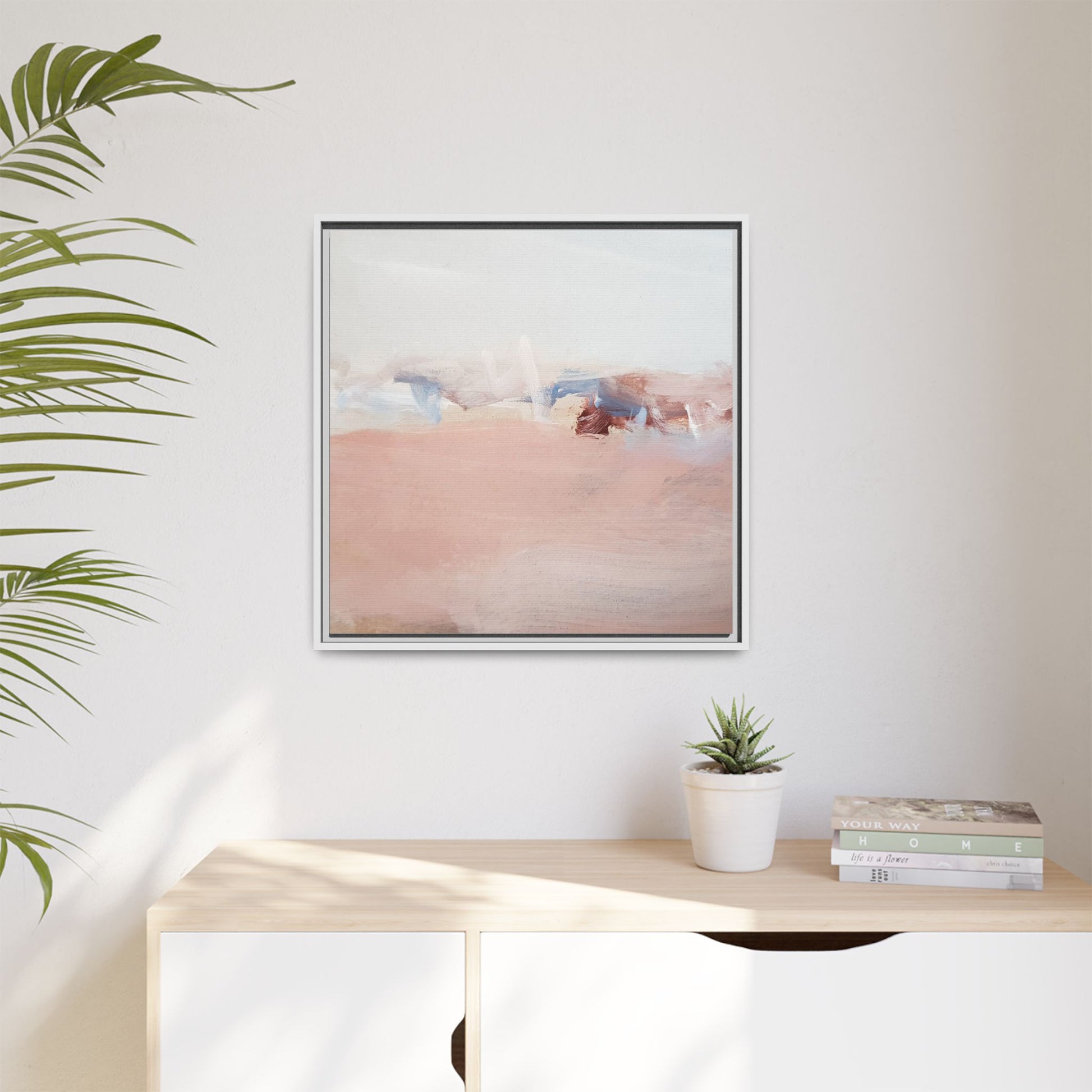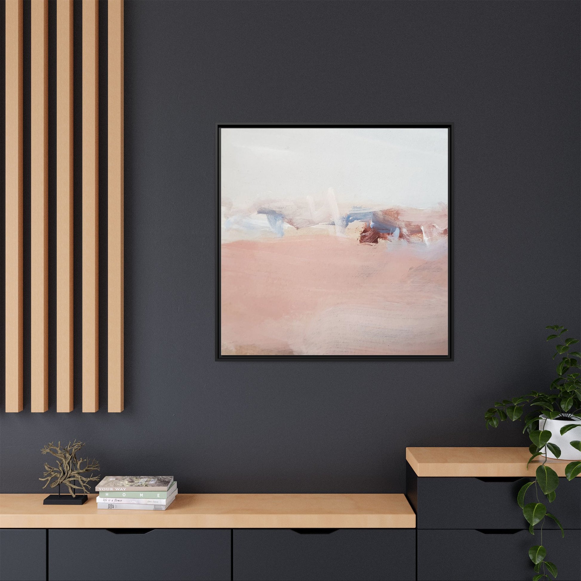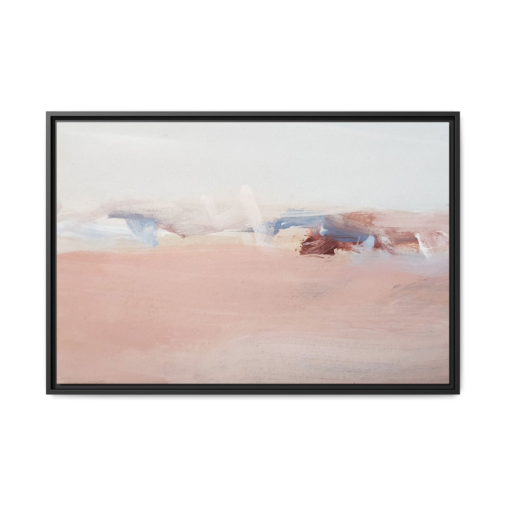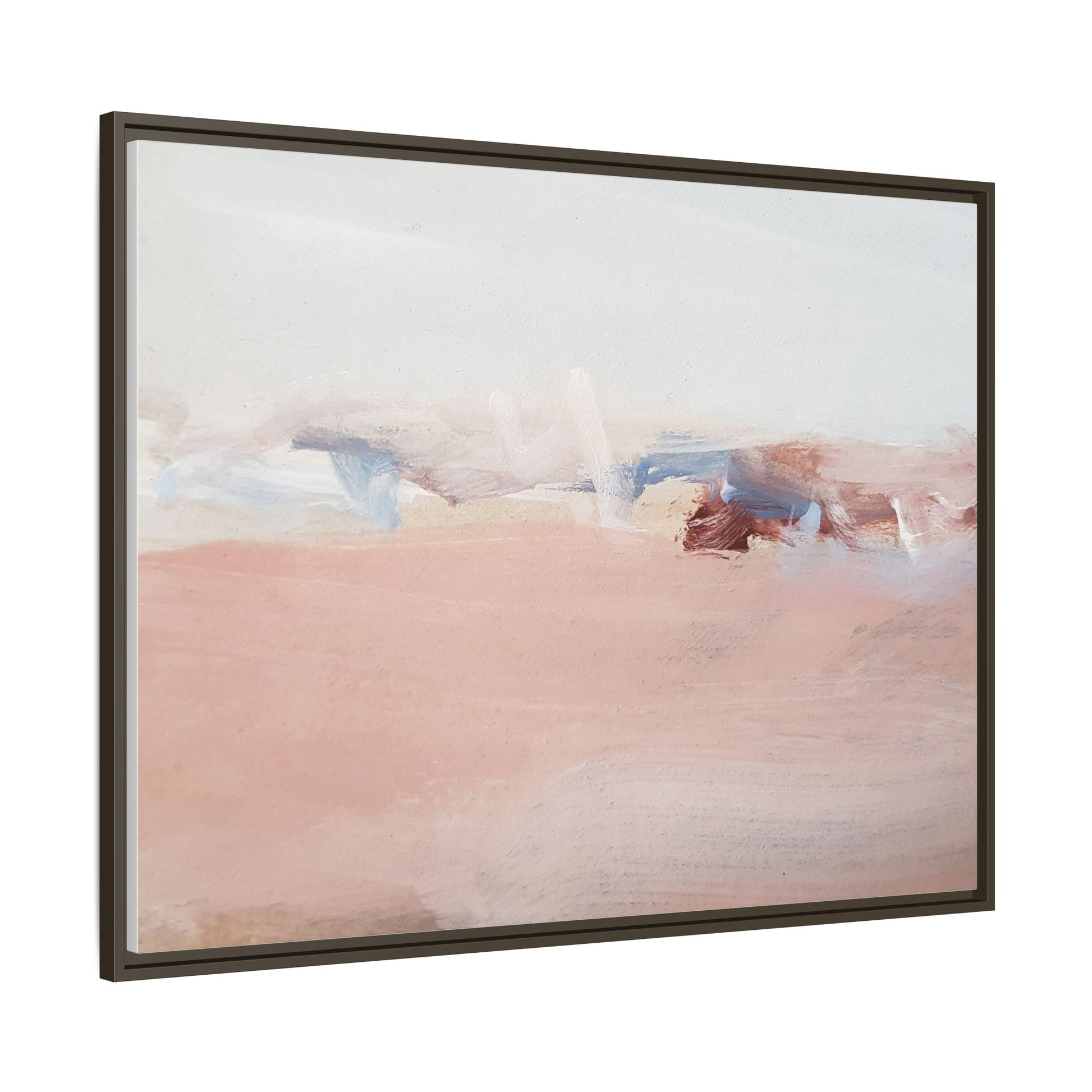 This abstract painting features a soft, ethereal landscape composed of delicate pastel hues. The color palette is predominantly blush pink and muted blue-gray, creating a serene and dreamy atmosphere. Horizontal layers of color blend seamlessly, suggesting a distant horizon or misty landscape. Subtle brushstrokes and gentle color variations add depth and texture to the composition, creating a sense of movement and tranquility. The artwork appears to be a minimalist, contemporary piece that evokes a sense of calm and emotional introspection.