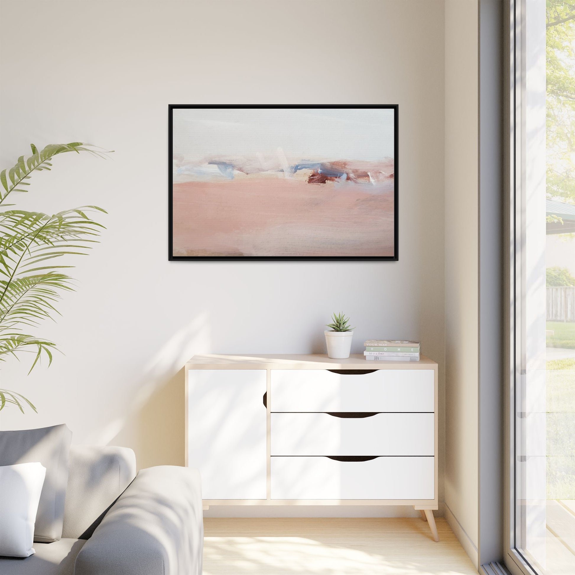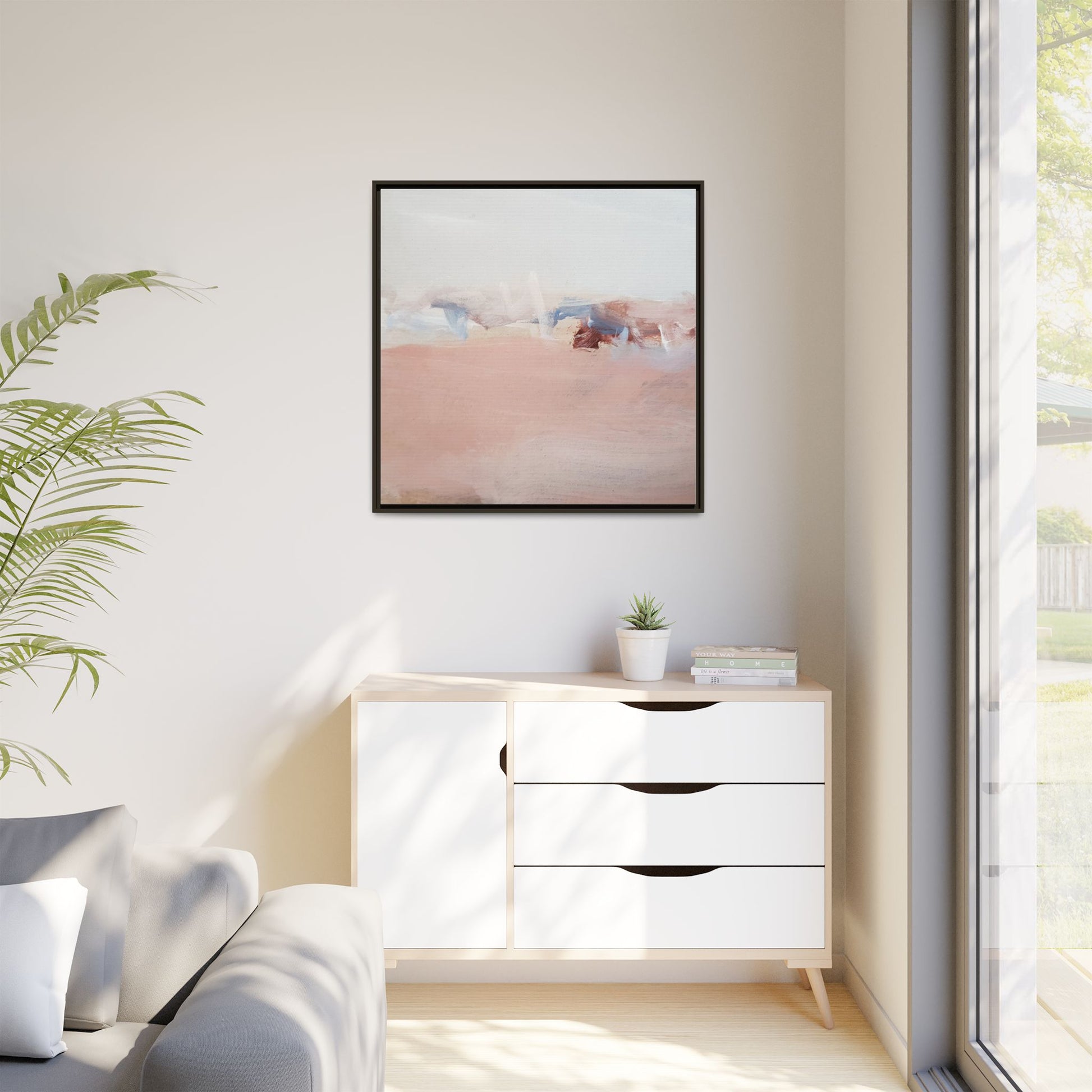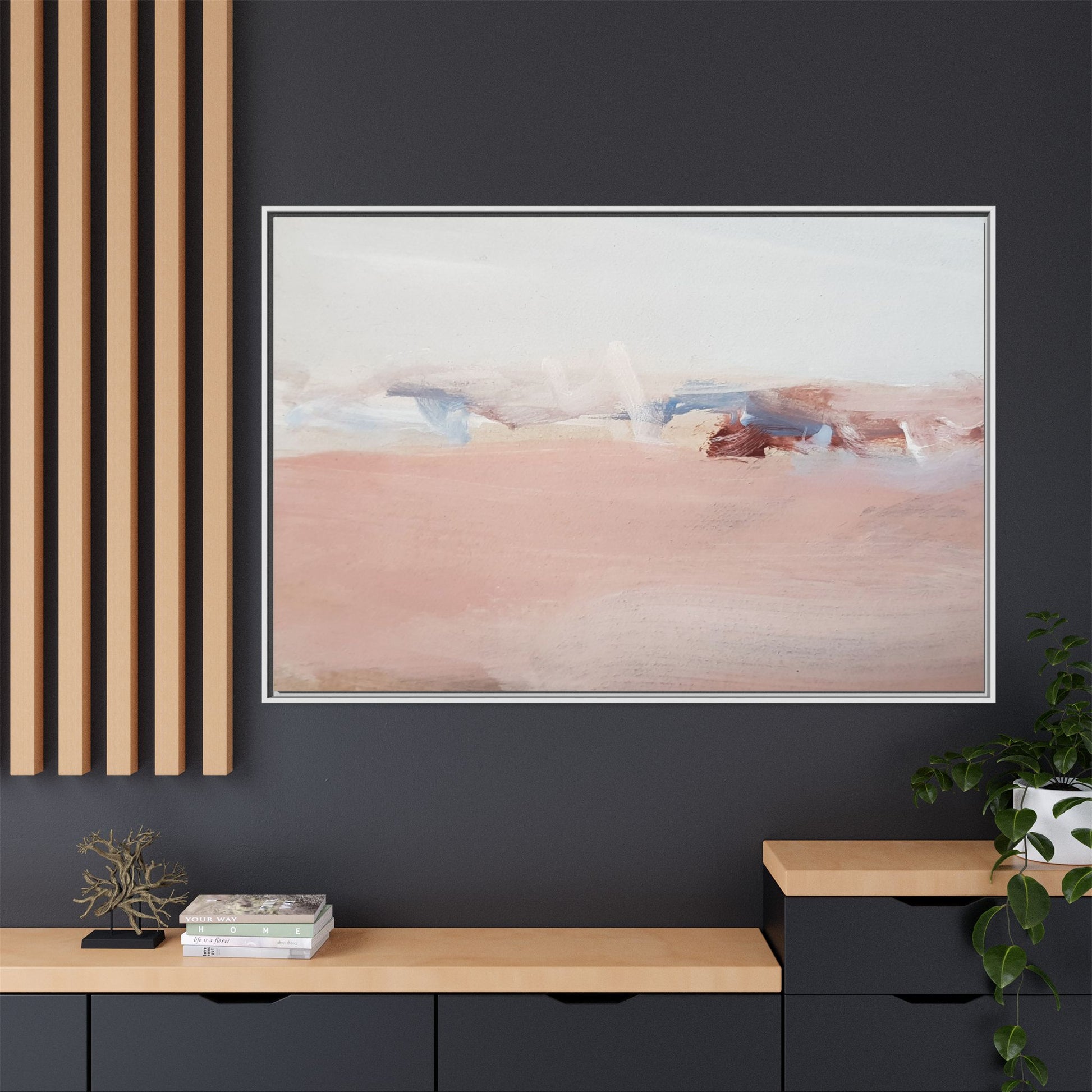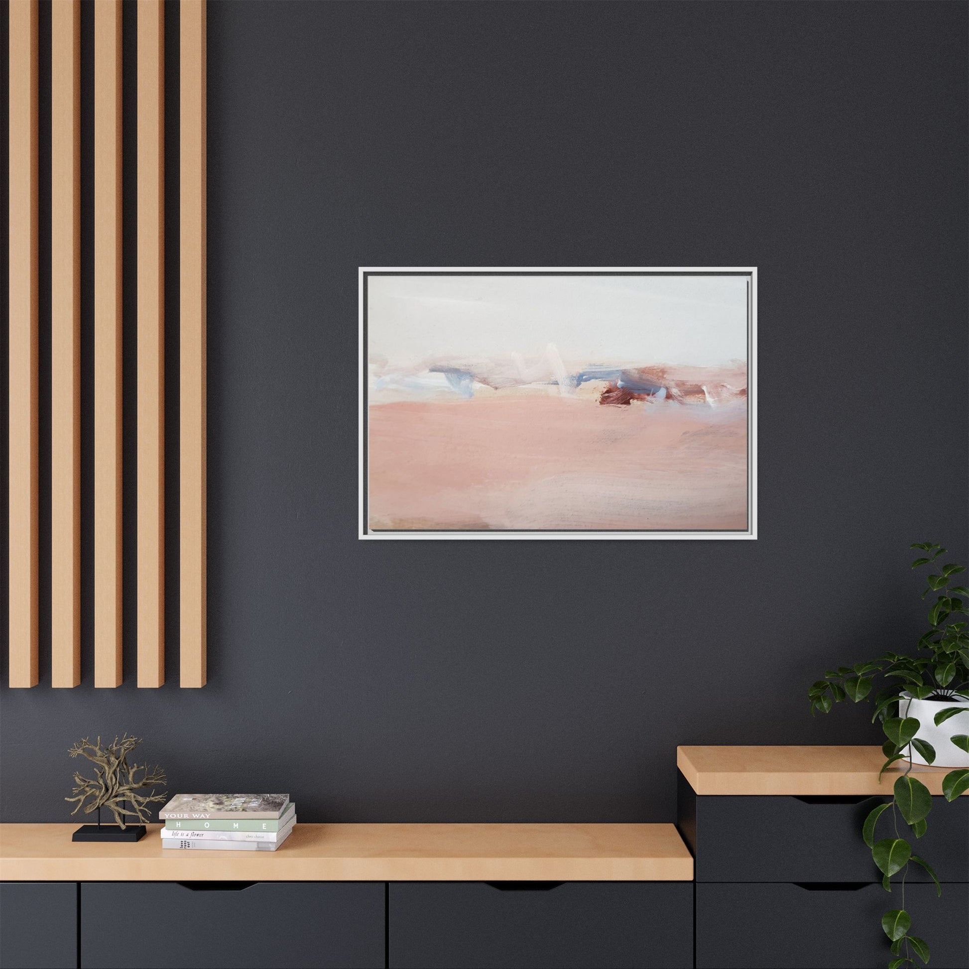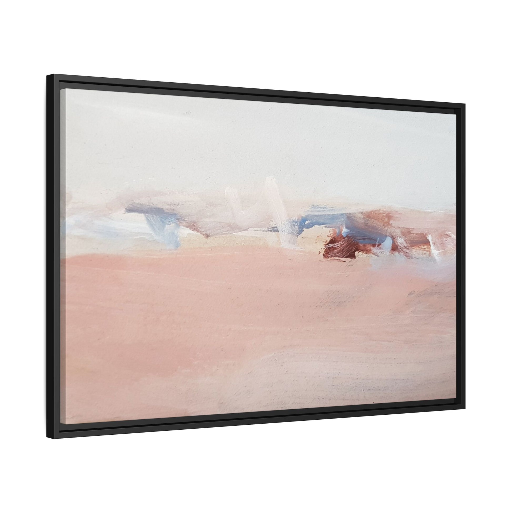 This abstract painting features a soft, ethereal landscape composed of delicate pastel hues. The color palette is predominantly blush pink and muted blue-gray, creating a serene and dreamy atmosphere. Horizontal layers of color blend seamlessly, suggesting a distant horizon or misty landscape. Subtle brushstrokes and gentle color variations add depth and texture to the composition, creating a sense of movement and tranquility. The artwork appears to be a minimalist, contemporary piece that evokes a sense of calm and emotional introspection.