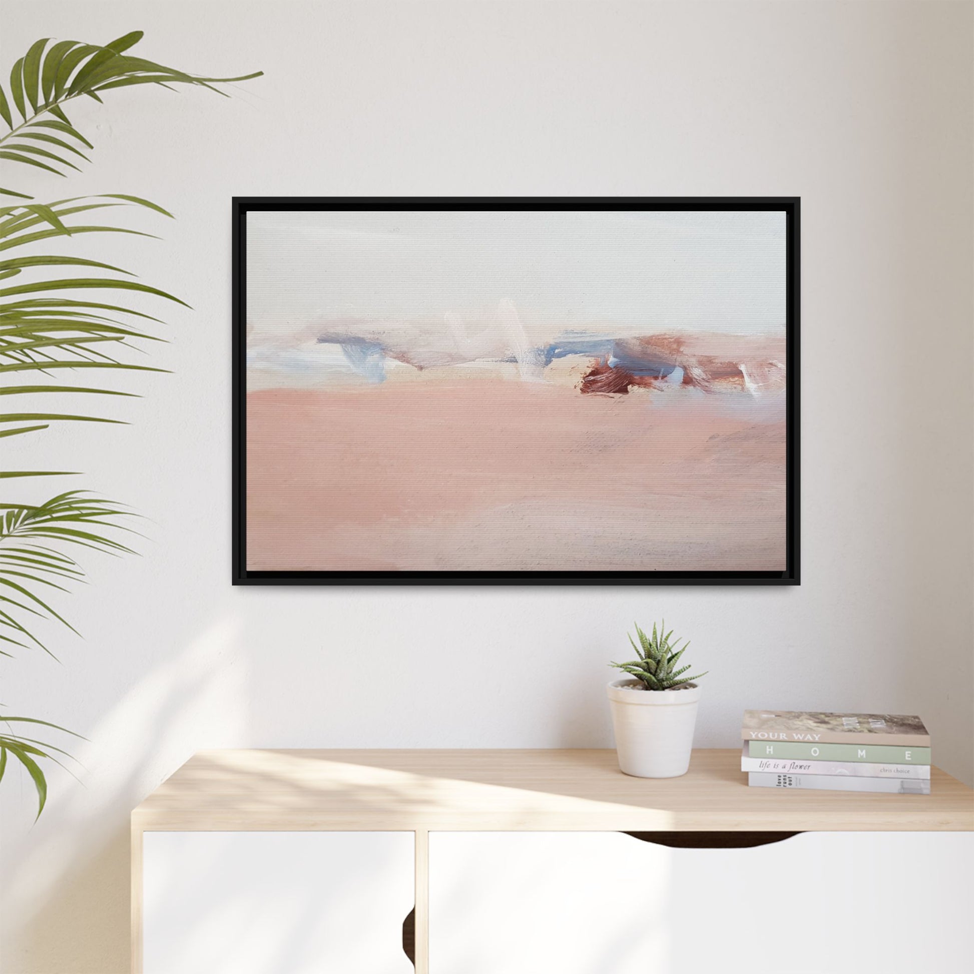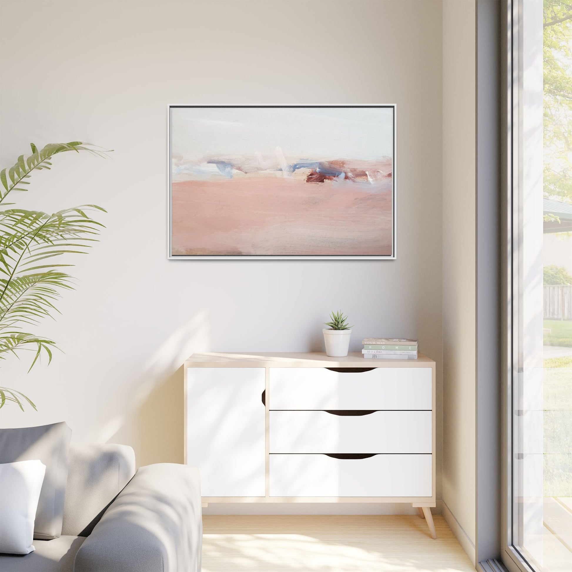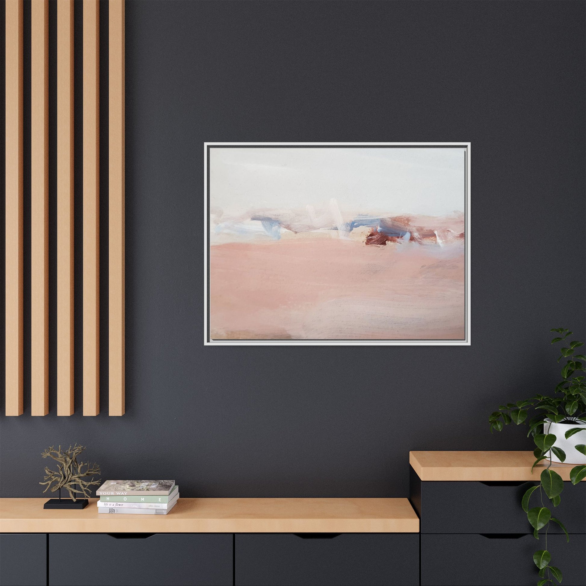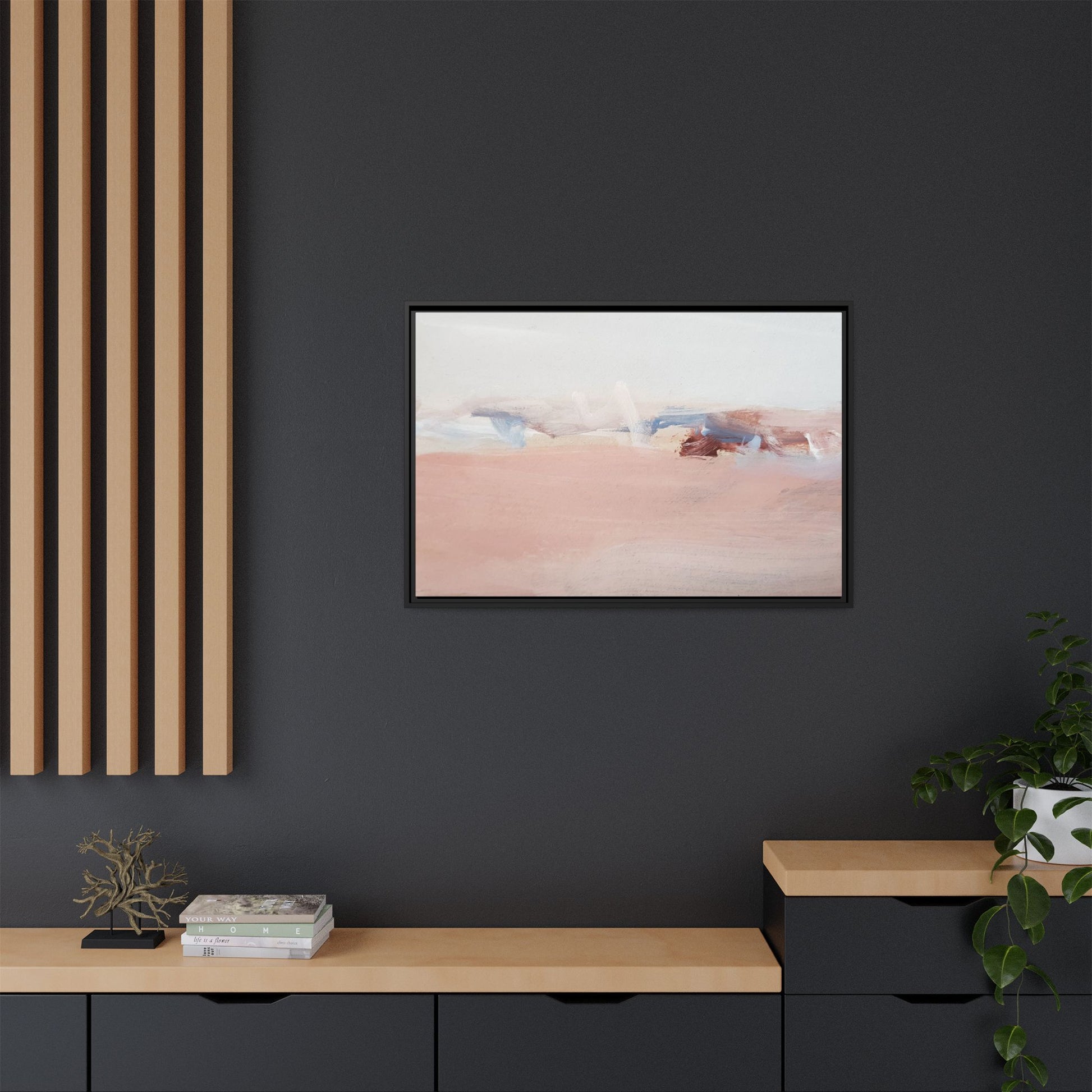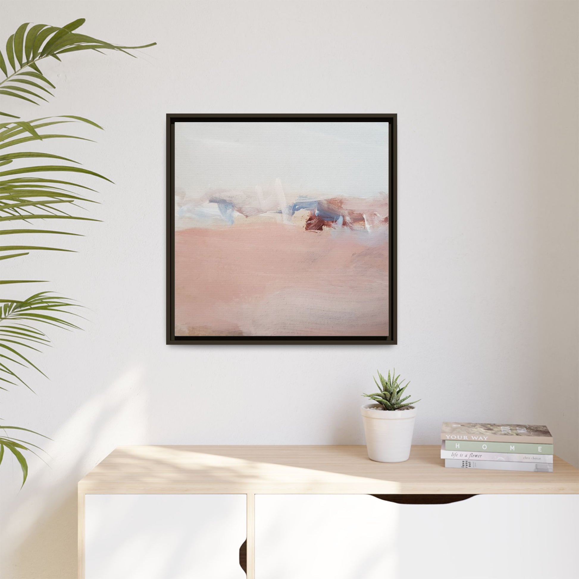 This abstract painting features a soft, ethereal landscape composed of delicate pastel hues. The color palette is predominantly blush pink and muted blue-gray, creating a serene and dreamy atmosphere. Horizontal layers of color blend seamlessly, suggesting a distant horizon or misty landscape. Subtle brushstrokes and gentle color variations add depth and texture to the composition, creating a sense of movement and tranquility. The artwork appears to be a minimalist, contemporary piece that evokes a sense of calm and emotional introspection.