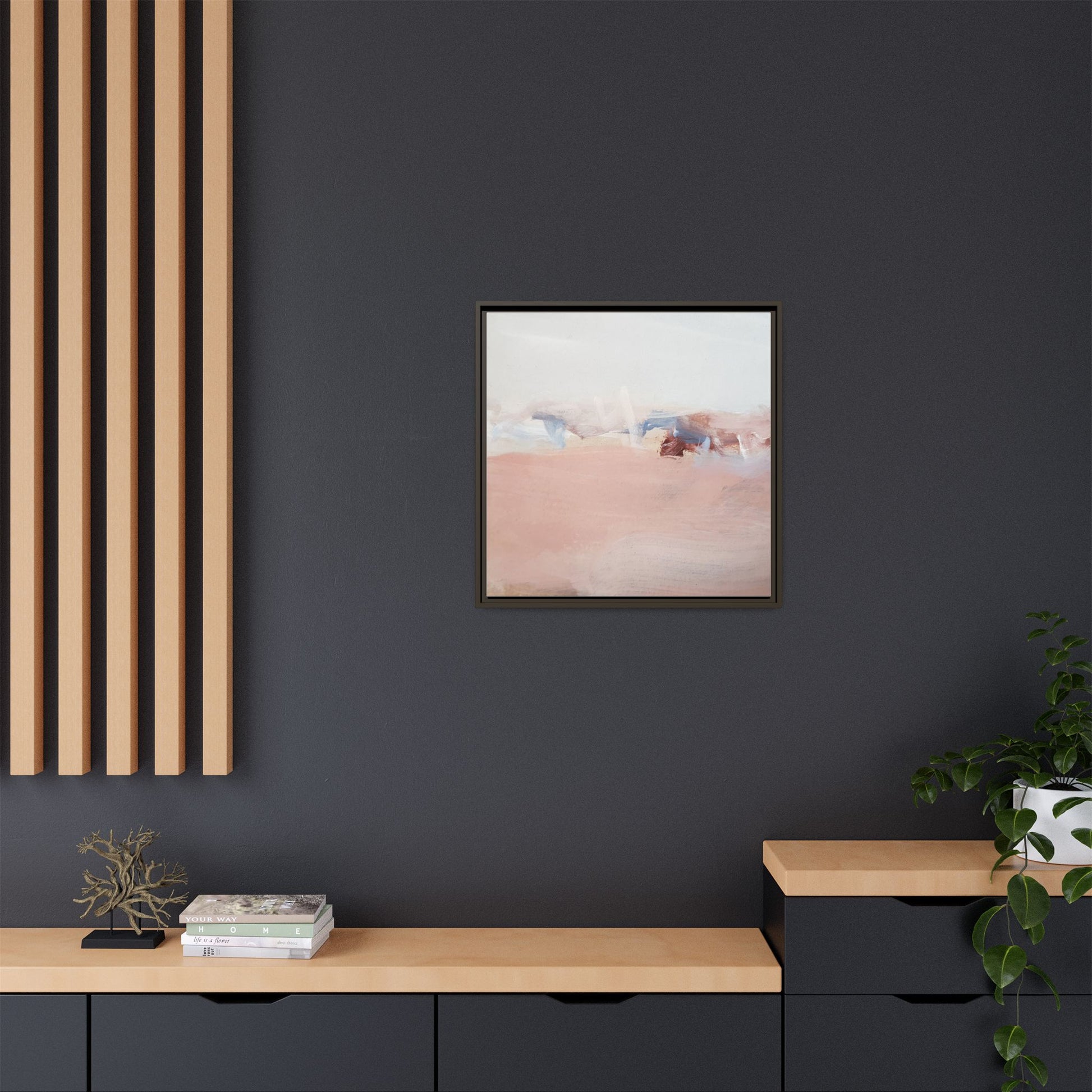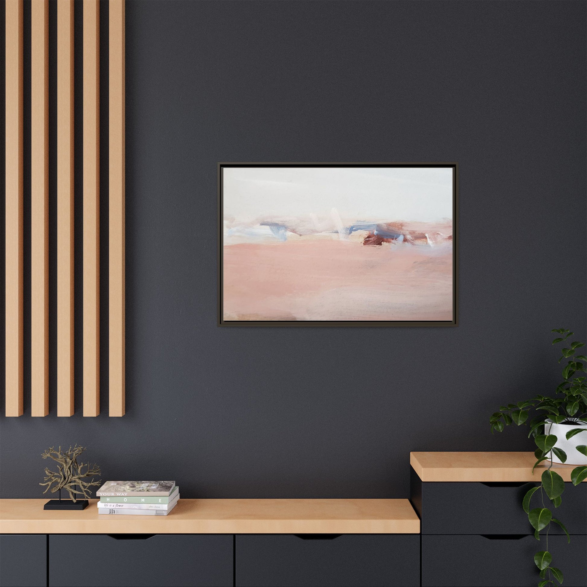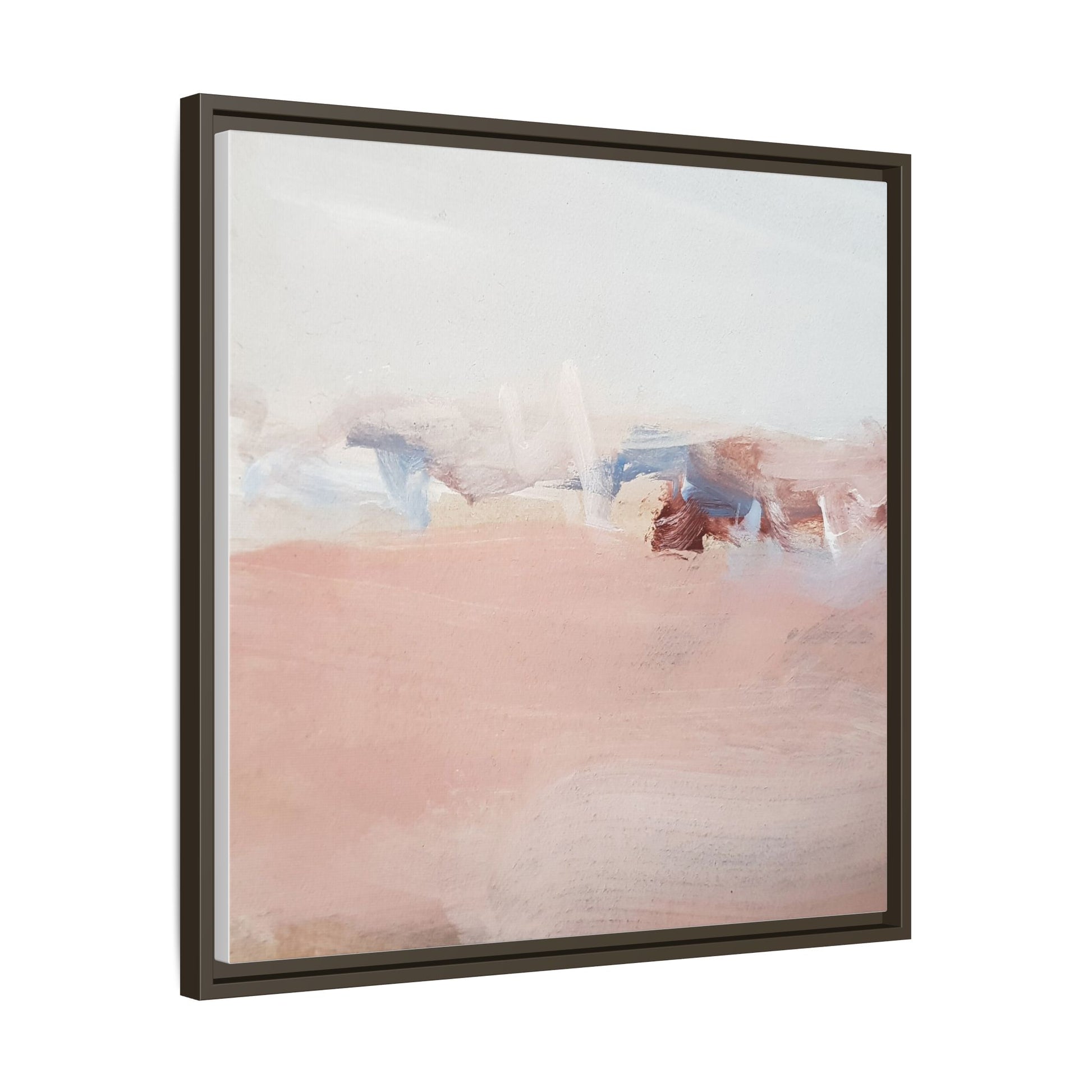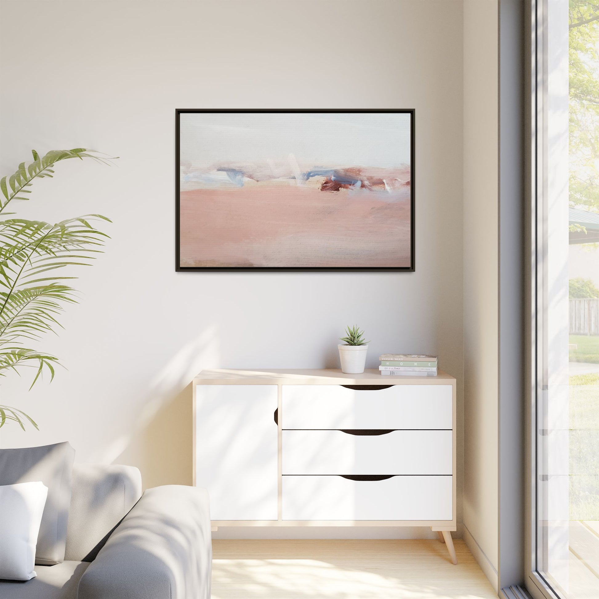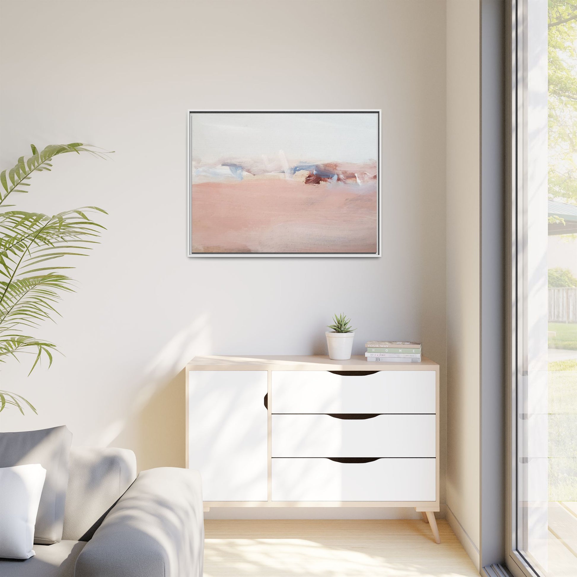 This abstract painting features a soft, ethereal landscape composed of delicate pastel hues. The color palette is predominantly blush pink and muted blue-gray, creating a serene and dreamy atmosphere. Horizontal layers of color blend seamlessly, suggesting a distant horizon or misty landscape. Subtle brushstrokes and gentle color variations add depth and texture to the composition, creating a sense of movement and tranquility. The artwork appears to be a minimalist, contemporary piece that evokes a sense of calm and emotional introspection.