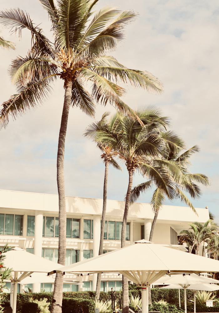 Tall palms sway gracefully against a nostalgic architectural backdrop, evoking serene coastal tranquility.