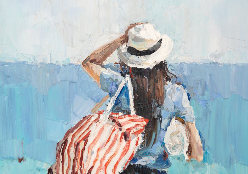 A figure stands before an expansive sea, holding a hat against the gentle winds. The strokes capture the fluidity of light and air, invoking a serene seaside escape.