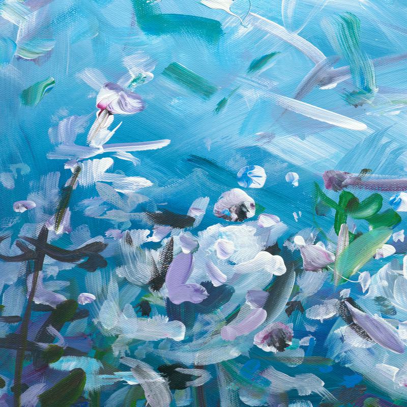 A swirling dance of abstract florals and ethereal light, capturing the essence of a dreamscape garden suspended in an azure sky.