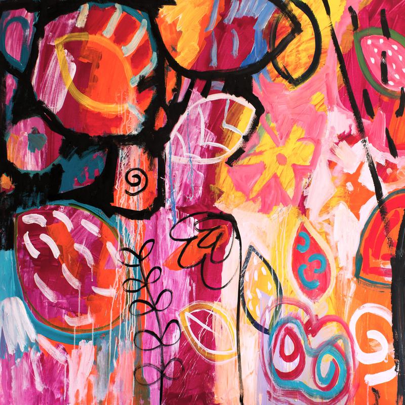 A vibrant explosion of colors and swirling shapes, capturing the essence of a whimsical garden in perpetual motion.
