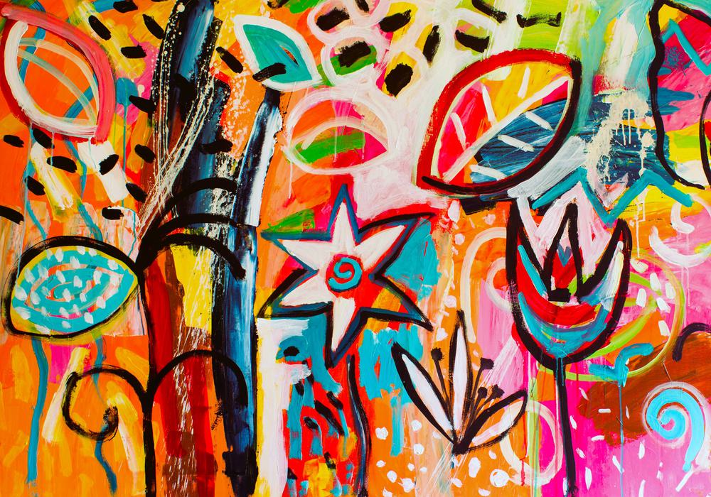 An explosion of vibrant blooms and abstract forms dance across the canvas, capturing the wild essence of a botanical garden in dreamlike hues.