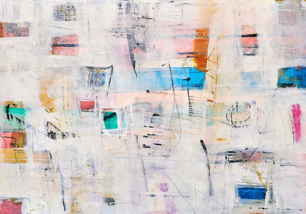 A dance of soft hues and abstract forms, this artwork embodies a serene blend of chaos and calm. Geometric shapes drift across a misty canvas, creating a harmonious symphony of color and texture.