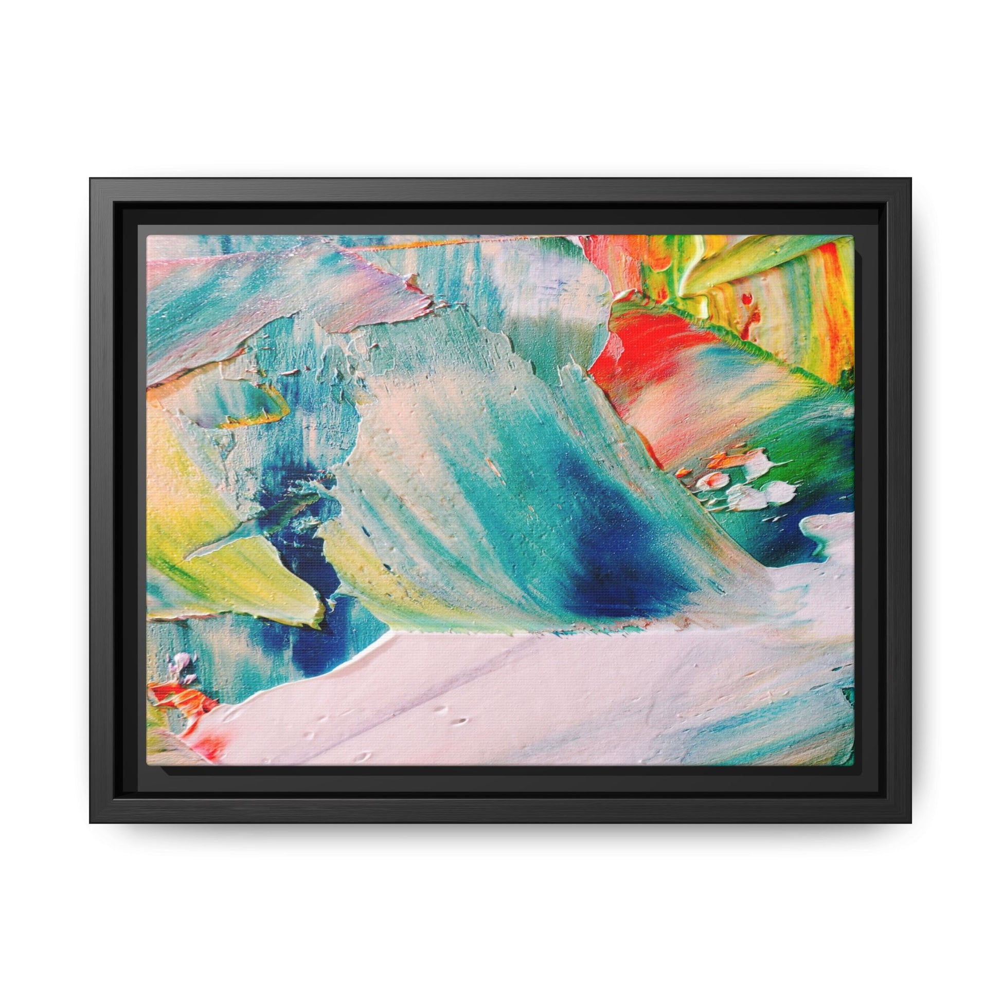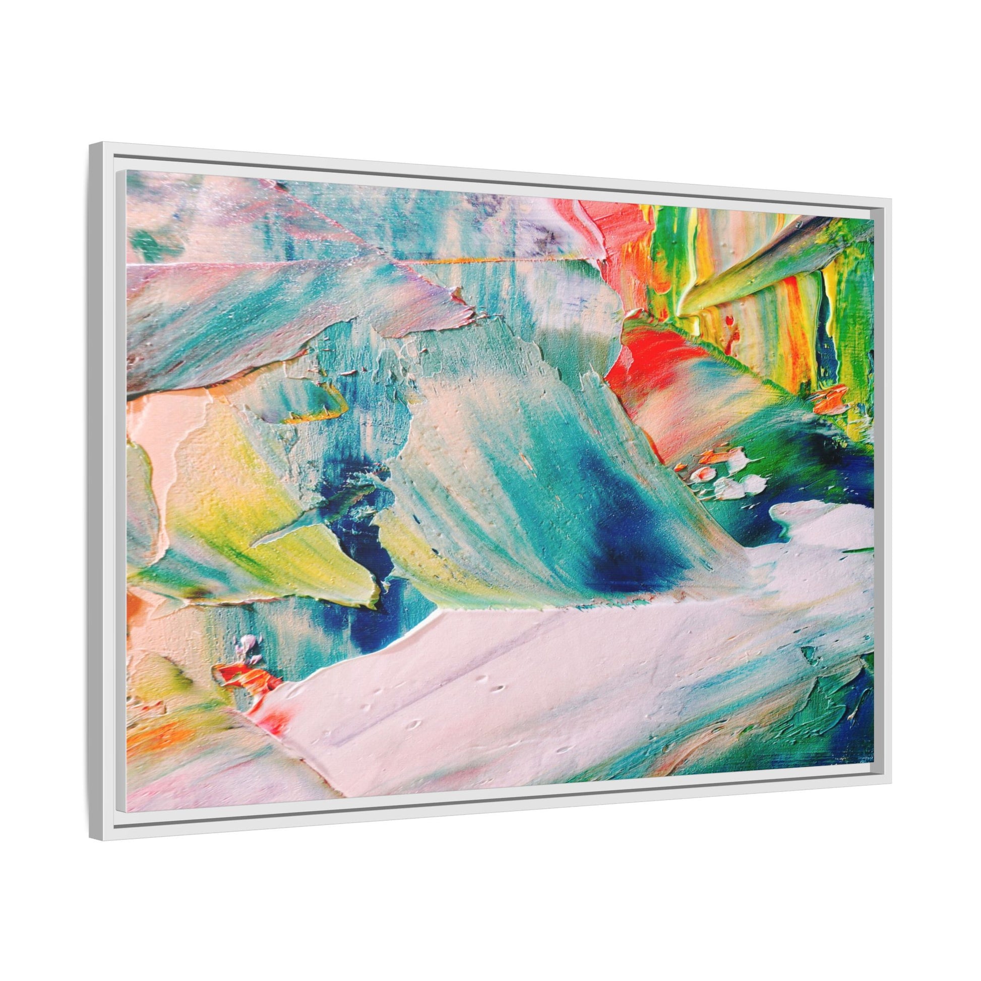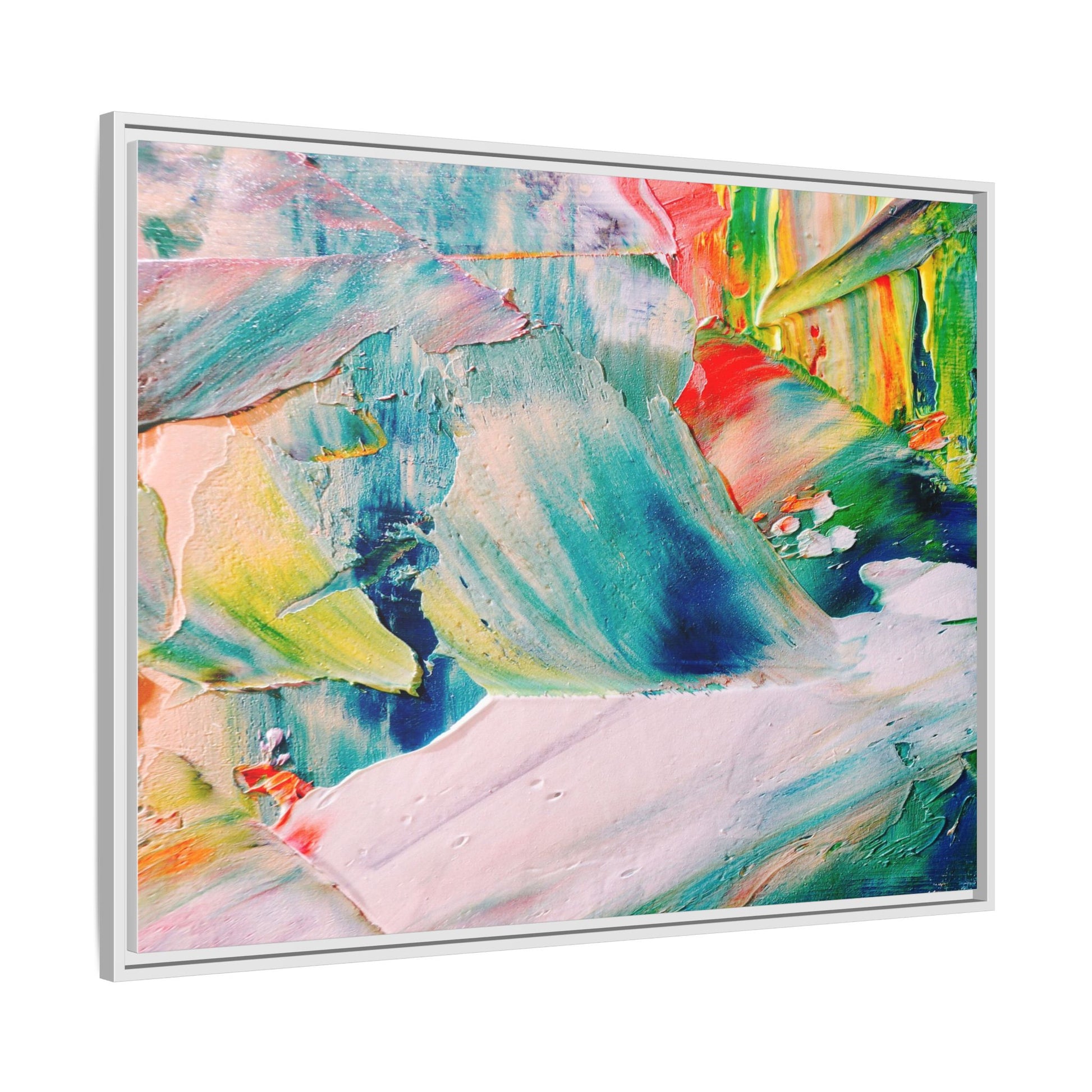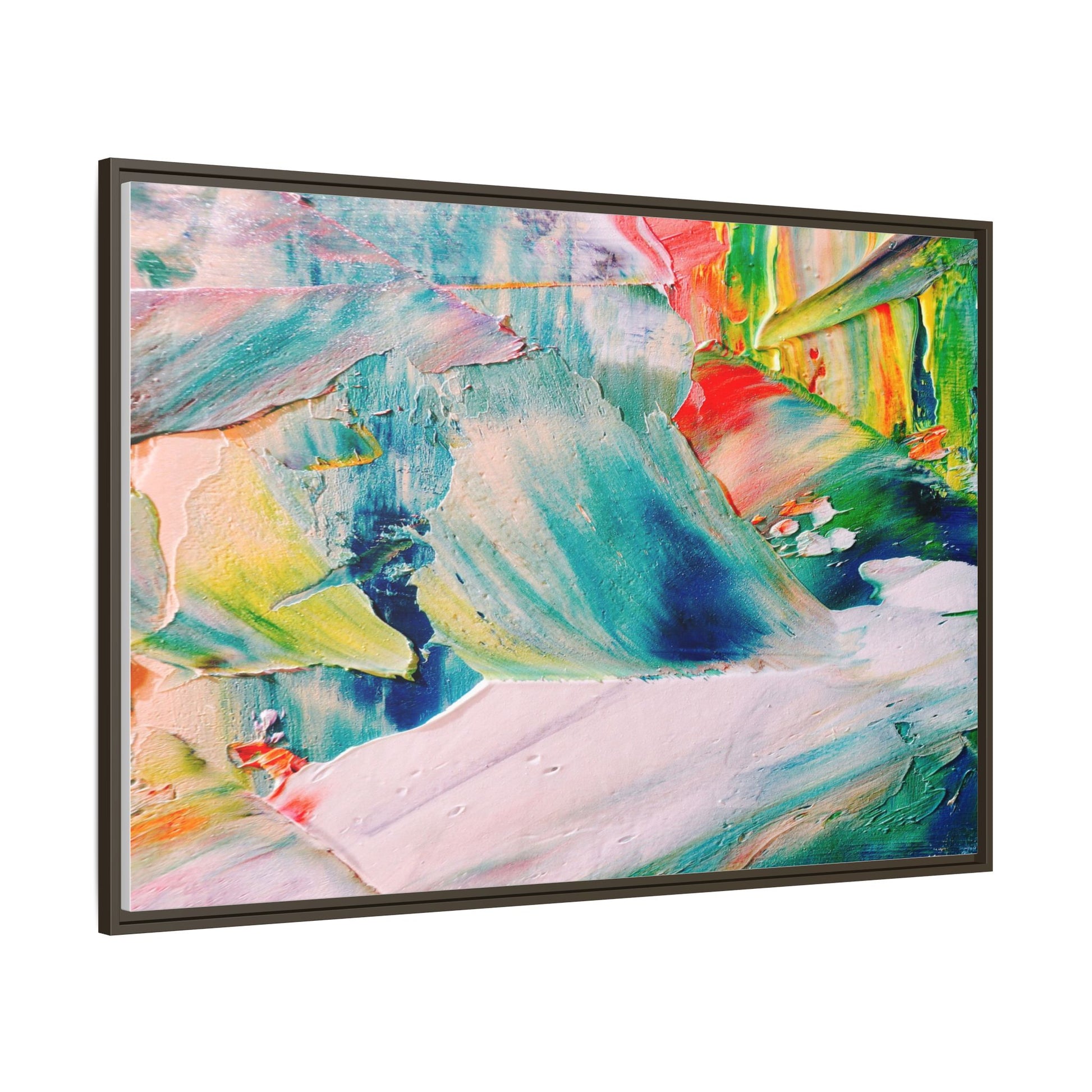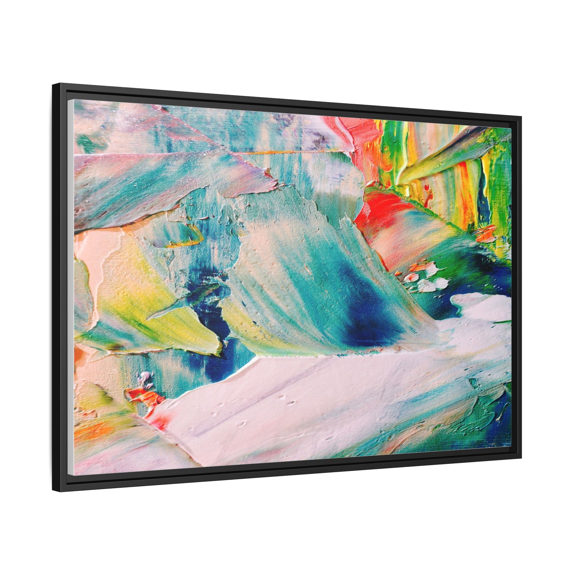 This vibrant abstract painting showcases a dynamic blend of colors and textures, creating a mesmerizing visual experience. The artwork features sweeping brushstrokes in a rich palette of blues, greens, reds, yellows, and soft pastels, with each color bleeding and blending into the next. Thick, layered paint creates a sense of depth and movement, with textured ridges and valleys that catch the light and add dimensionality to the piece. The composition appears fluid and organic, suggesting a sense of motion or a landscape viewed through a kaleidoscopic lens. The painting's impasto technique and bold color choices evoke an emotional, almost visceral response, inviting viewers to explore the intricate details and sweeping gestures of the artwork.